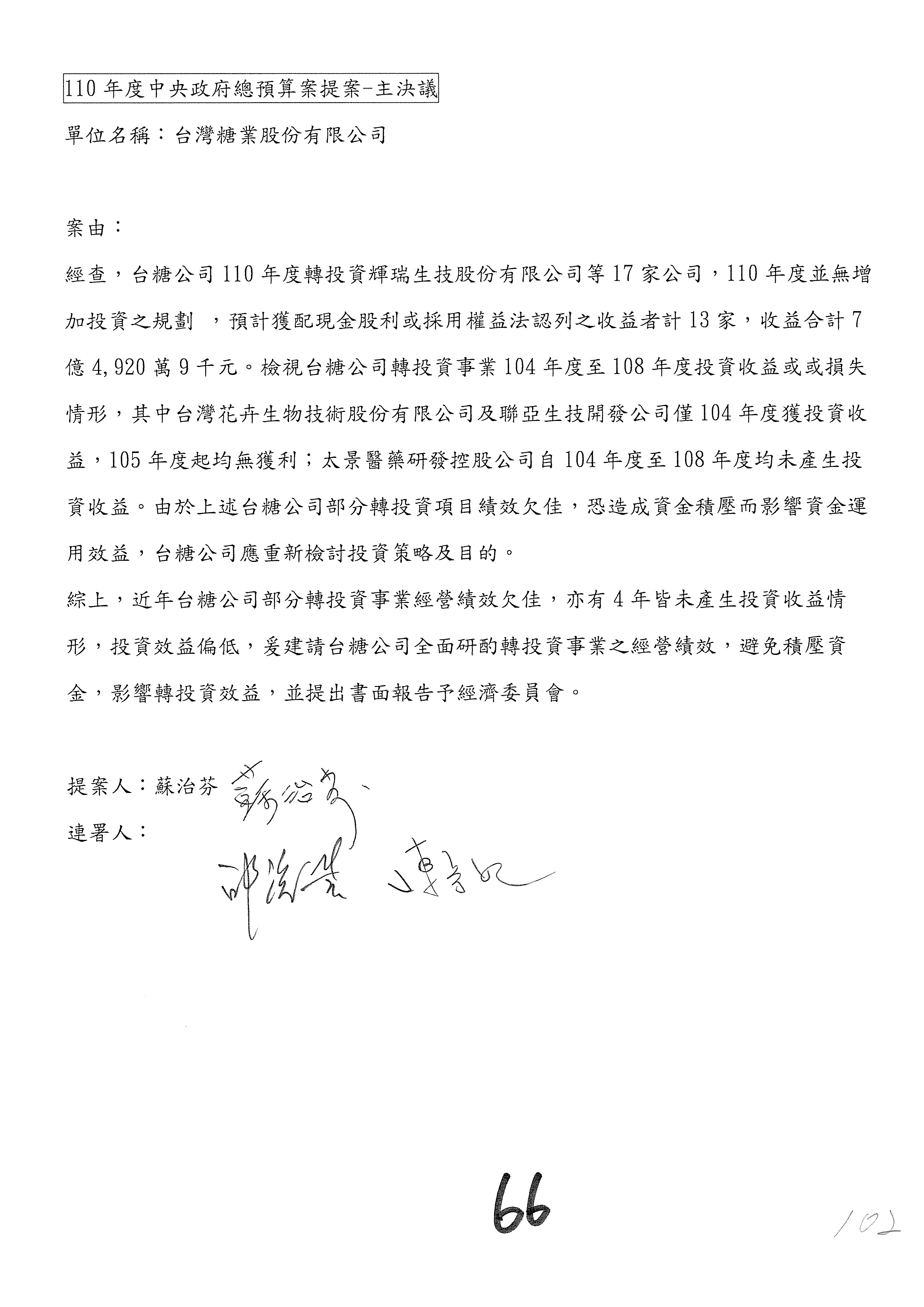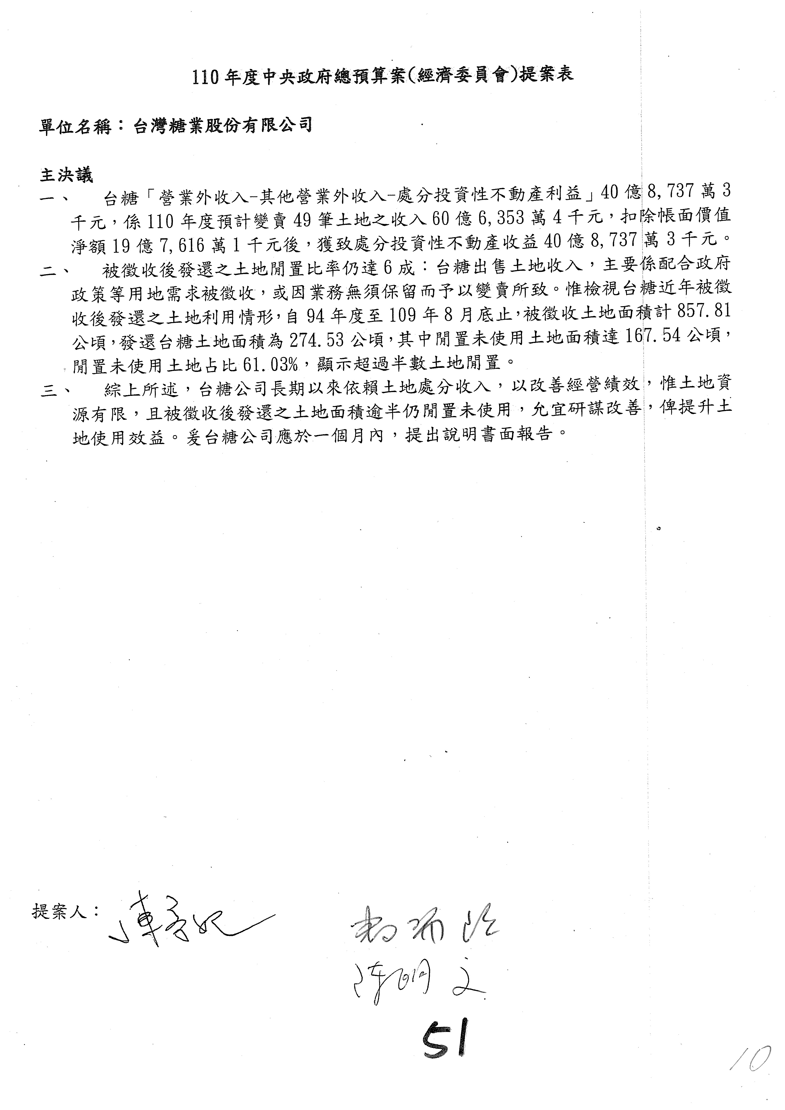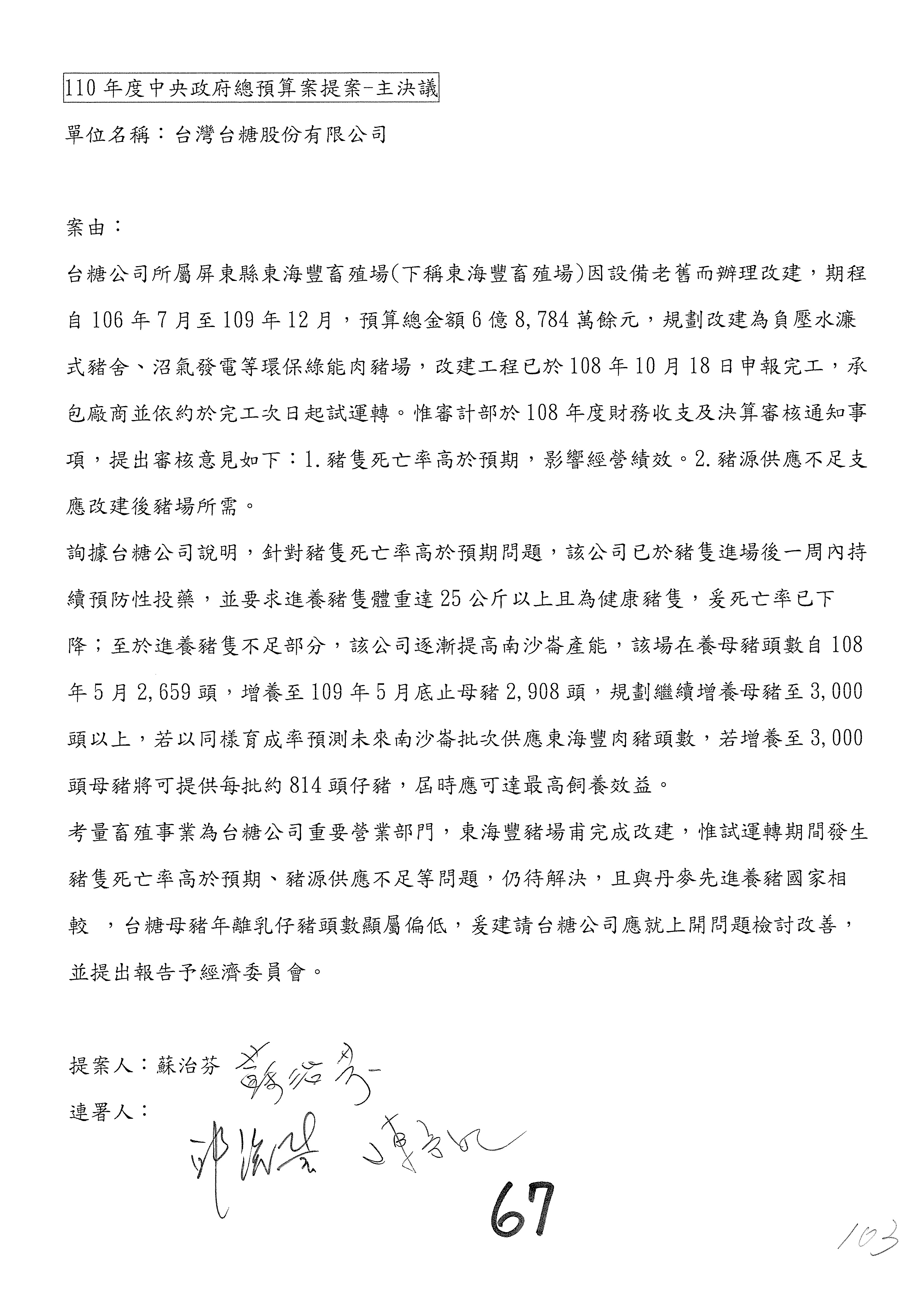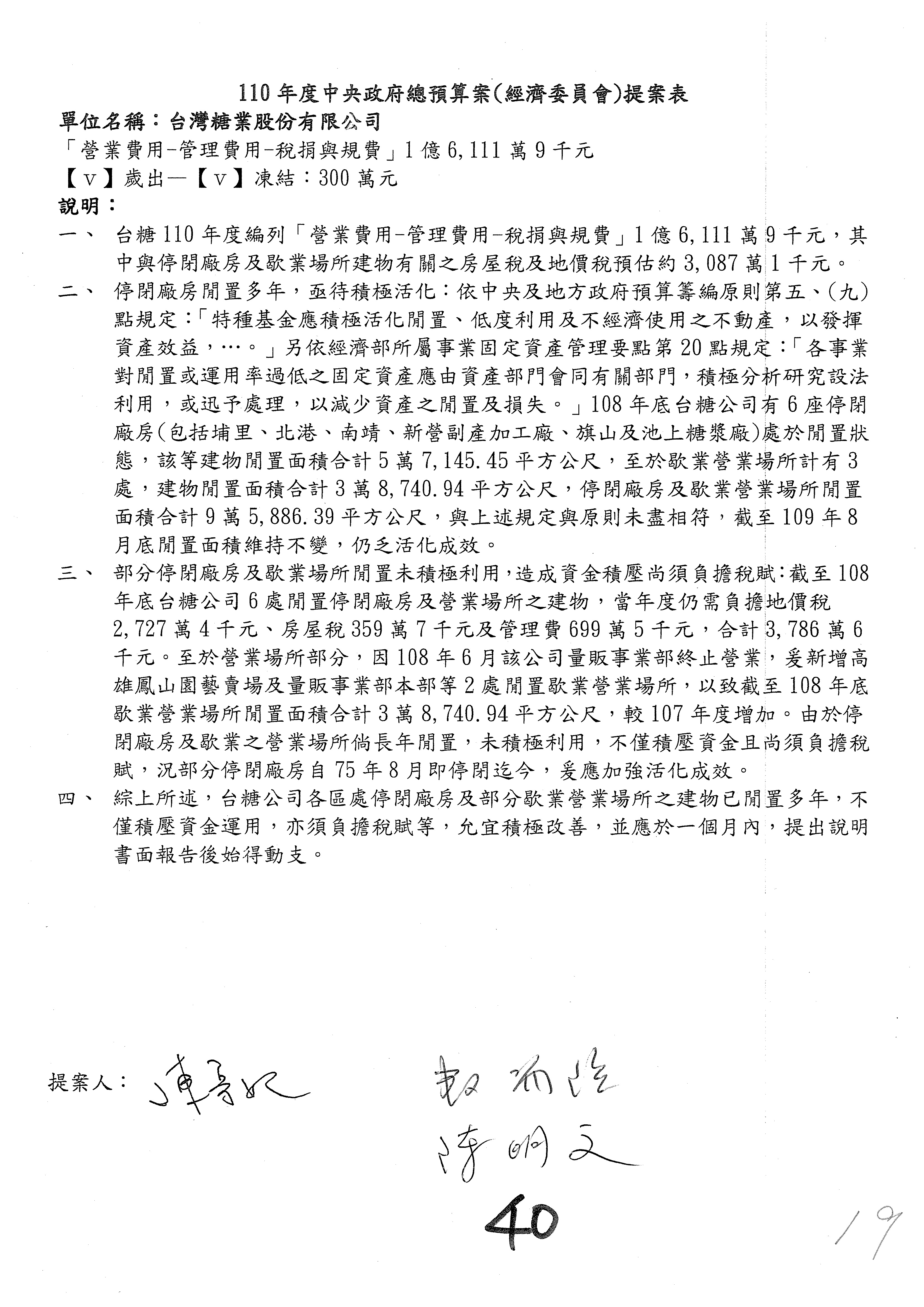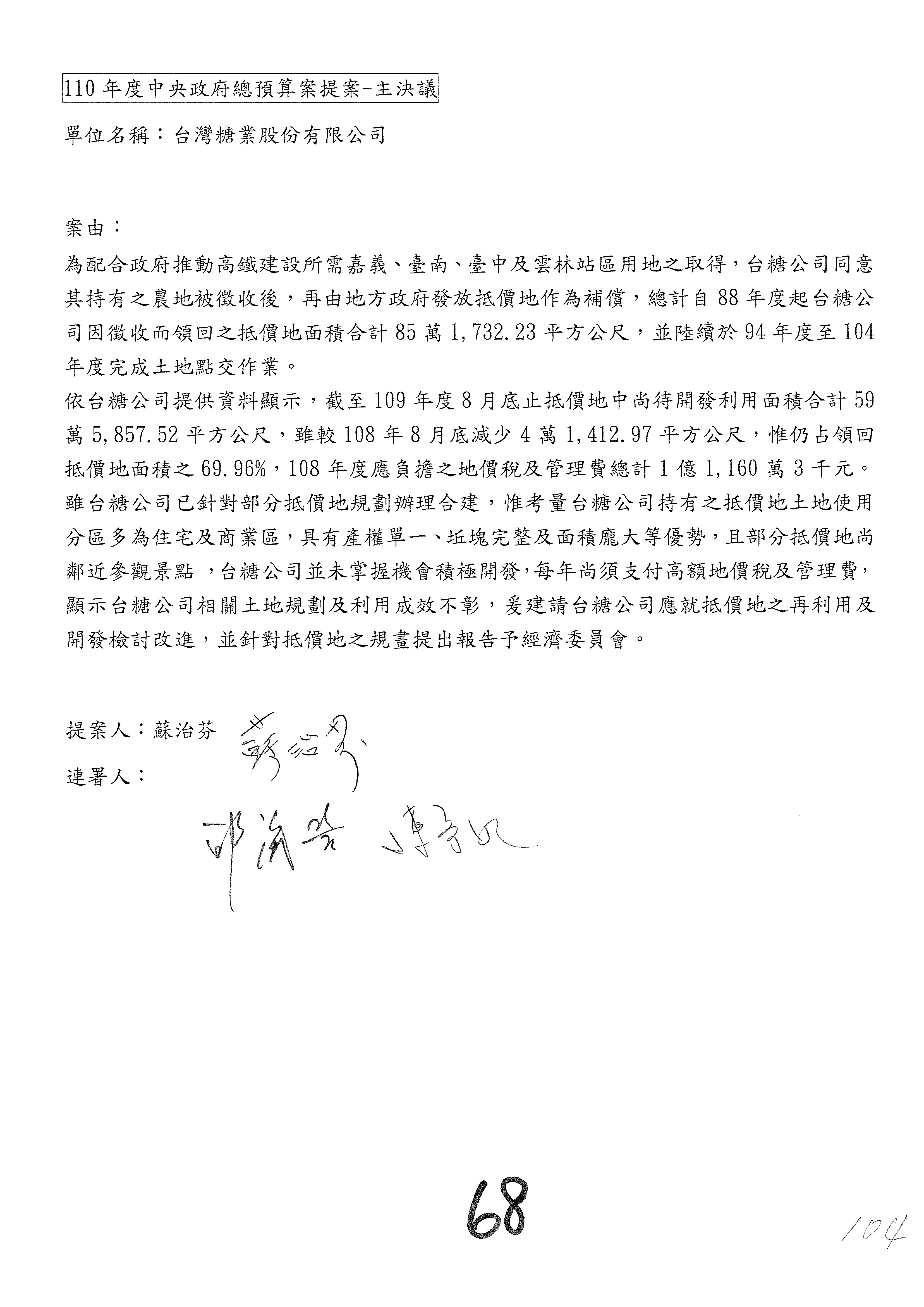 主席:台糖公司預算提案協商結論:第1案到第8案「營業收入」增列5,000萬元;第9案到第13案預算照列,其中第10案改主決議;第14案和第15案預算照列;第16案預算照列;第17案及第18案減列「水電費」1,000萬元,科目自行調整;第19案到第25案減列「旅運費」250萬元,科目自行調整;第26案預算照列;第27案至第33案預算照列;第34案到第40案預算照列;第41案到第50案「固定資產建設改良擴充」凍結5,000萬元,提出書面報告後始得動支;主決議第51案至第70案均照案通過;第71案倒數第三行「爰建請台糖公司」之後的「於符合農委會」5個字修正為「配合農委會政策於」,其餘均照案通過;第72案句中「總投資金額7,652萬元」之後修正為「計畫110年10月正式營運,為避免工程延宕影響當地觀光產業,台糖公司宜委託交通部鐵路局代為設計及施工,爰提案要求台糖公司應落實工程進度管理。」;第73案末句刪除「並提供……。」等文字;第74案、第75案與第75-1案均照案通過。