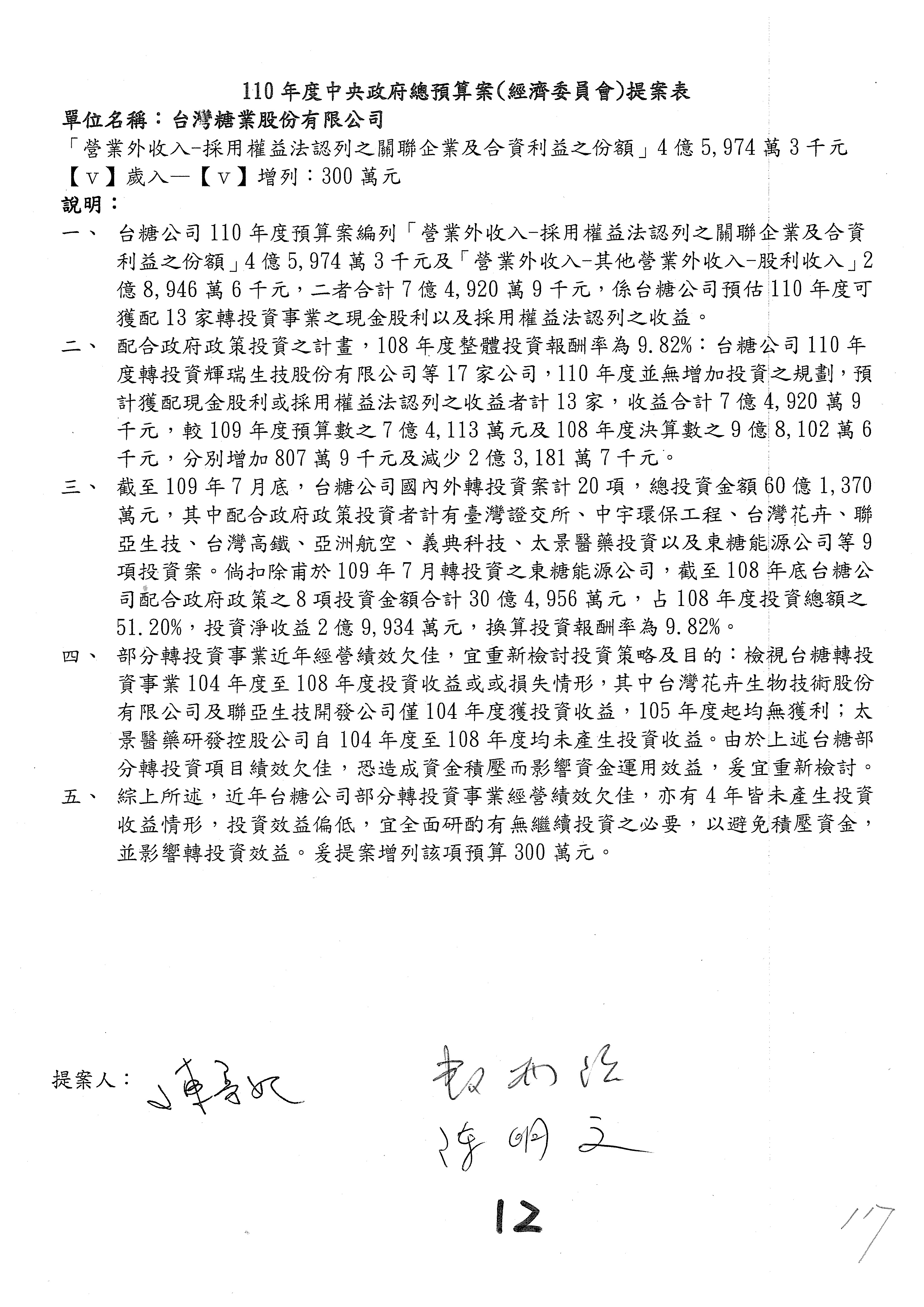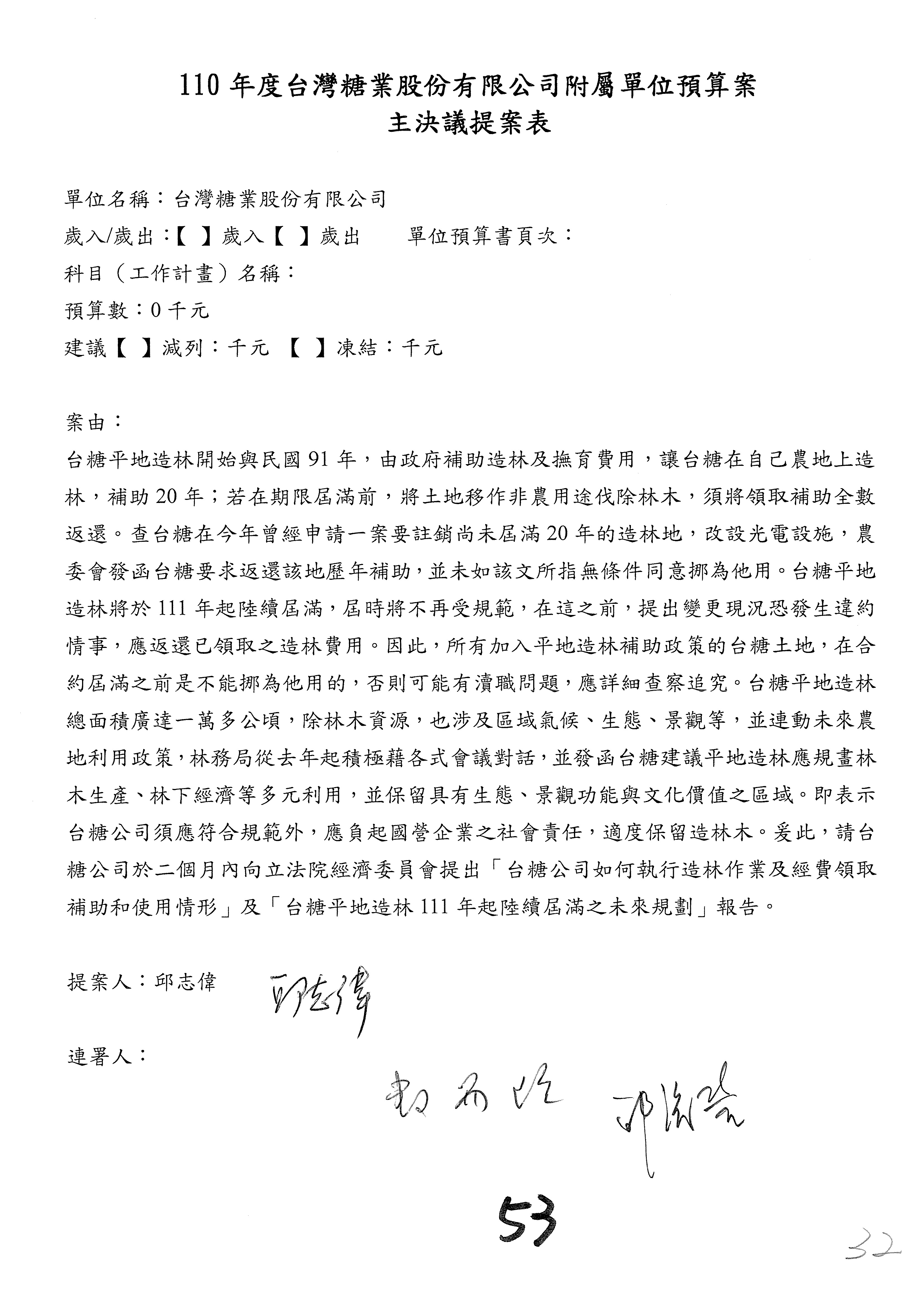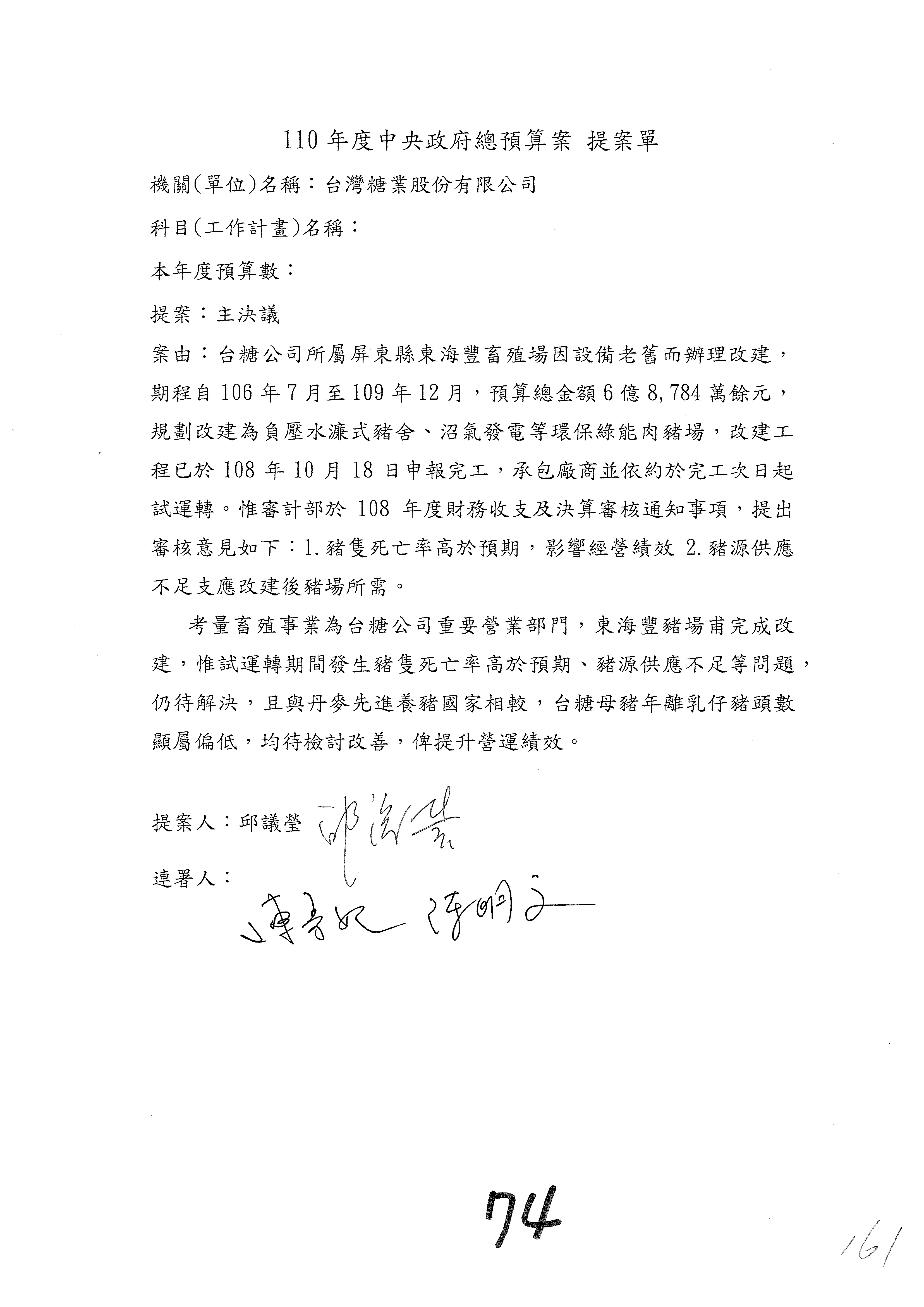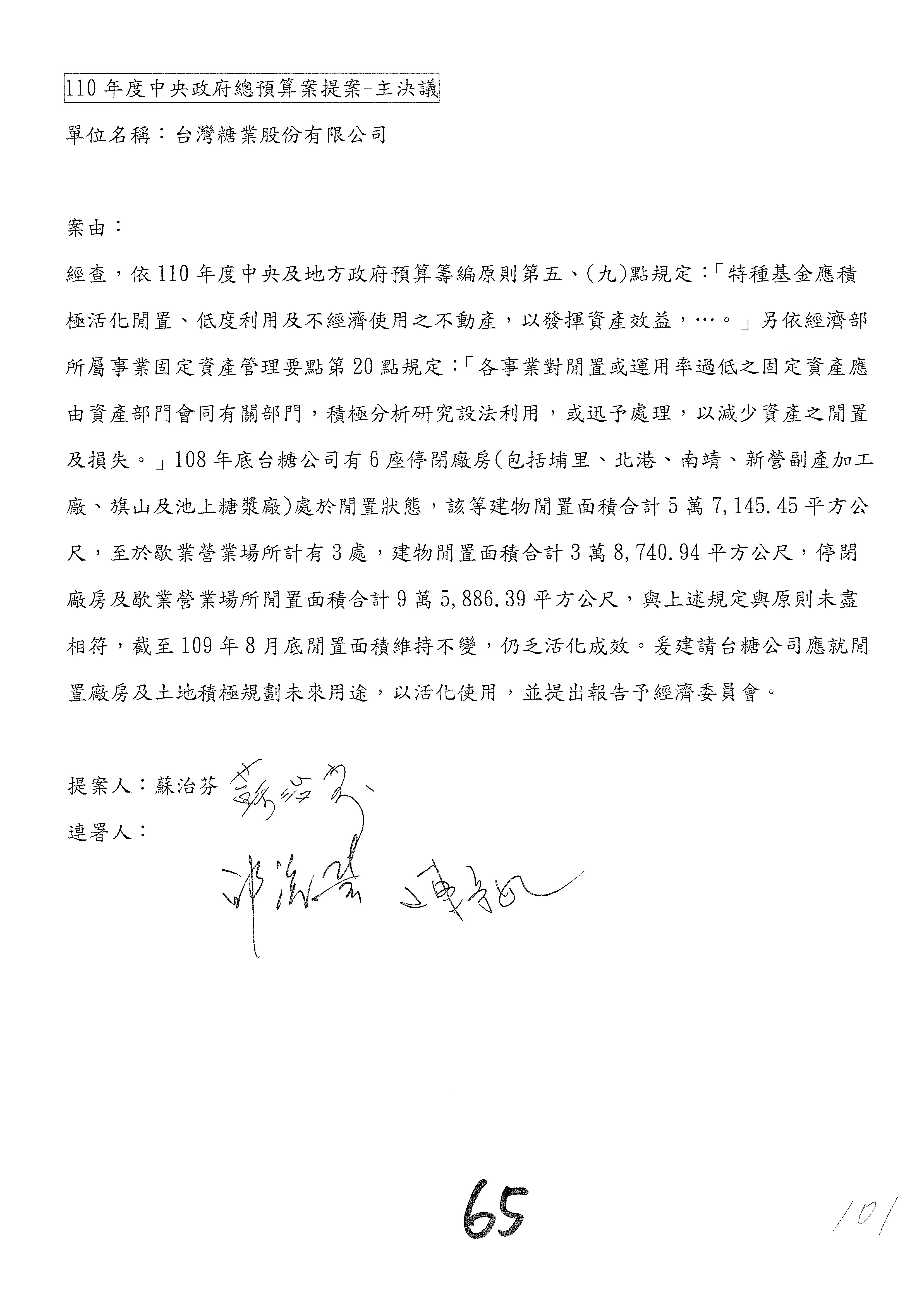 主席:台糖公司預算提案協商結論:第1案到第8案「營業收入」增列5,000萬元;第9案到第13案預算照列,其中第10案改主決議;第14案和第15案預算照列;第16案預算照列;第17案及第18案減列「水電費」1,000萬元,科目自行調整;第19案到第25案減列「旅運費」250萬元,科目自行調整;第26案預算照列;第27案至第33案預算照列;第34案到第40案預算照列;第41案到第50案「固定資產建設改良擴充」凍結5,000萬元,提出書面報告後始得動支;主決議第51案至第70案均照案通過;第71案倒數第三行「爰建請台糖公司」之後的「於符合農委會」5個字修正為「配合農委會政策於」,其餘均照案通過;第72案句中「總投資金額7,652萬元」之後修正為「計畫110年10月正式營運,為避免工程延宕影響當地觀光產業,台糖公司宜委託交通部鐵路局代為設計及施工,爰提案要求台糖公司應落實工程進度管理。」;第73案末句刪除「並提供……。」等文字;第74案、第75案與第75-1案均照案通過。
