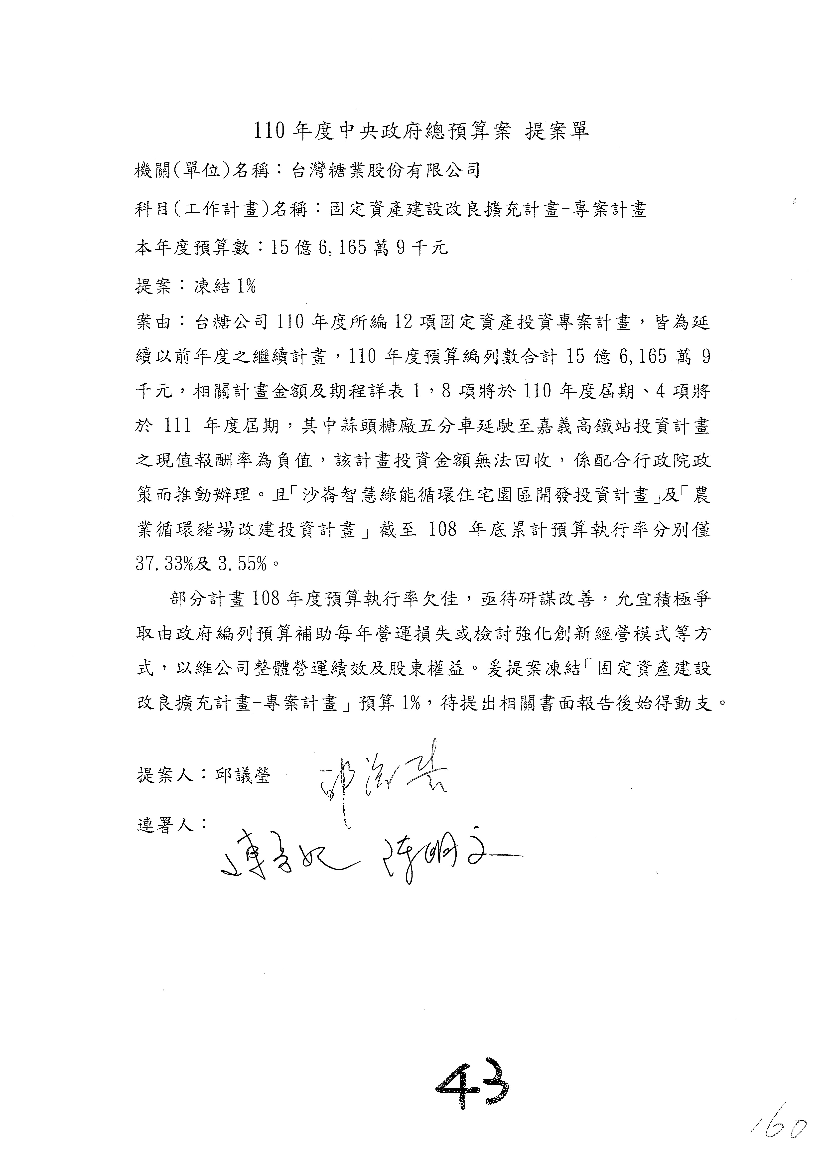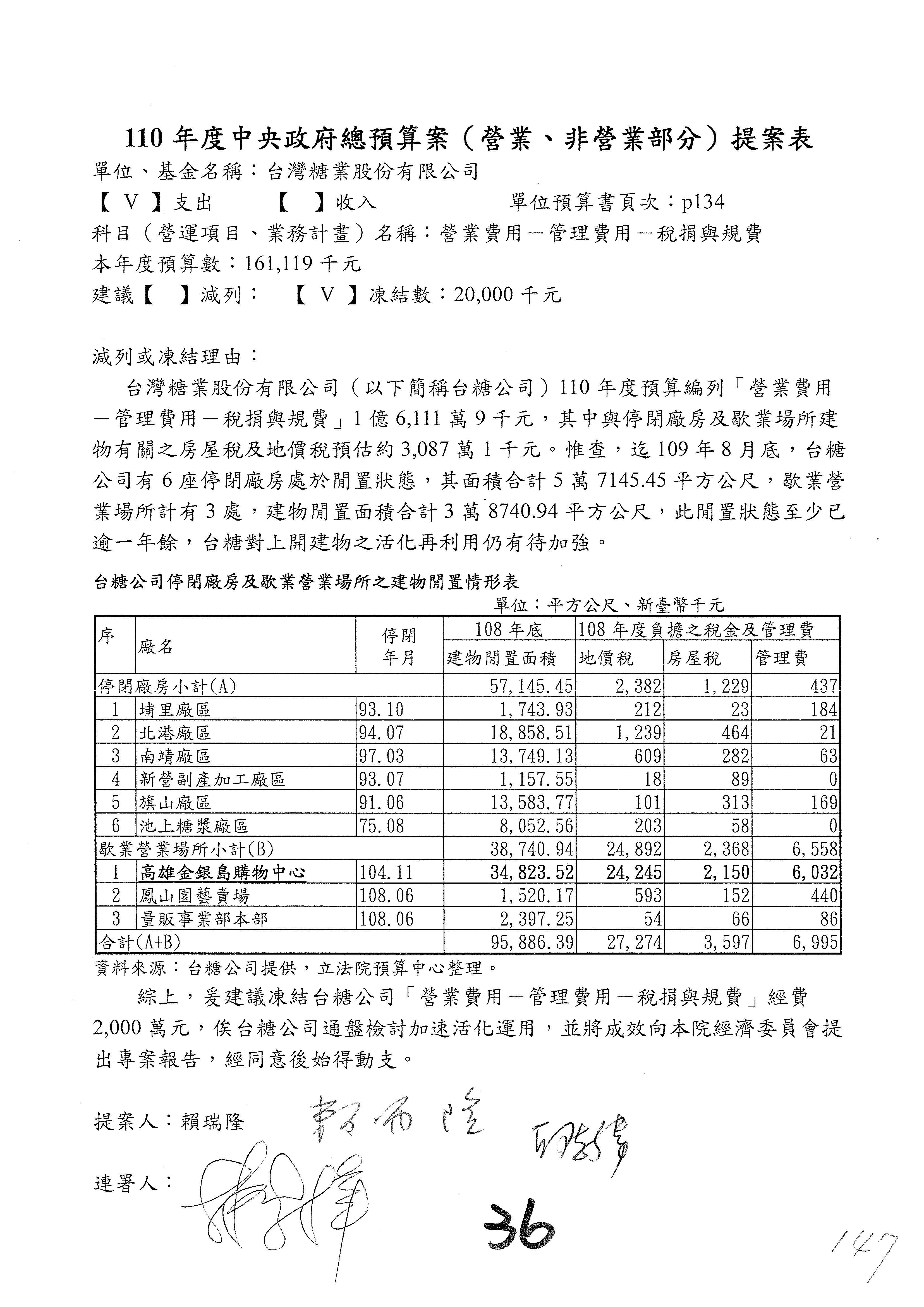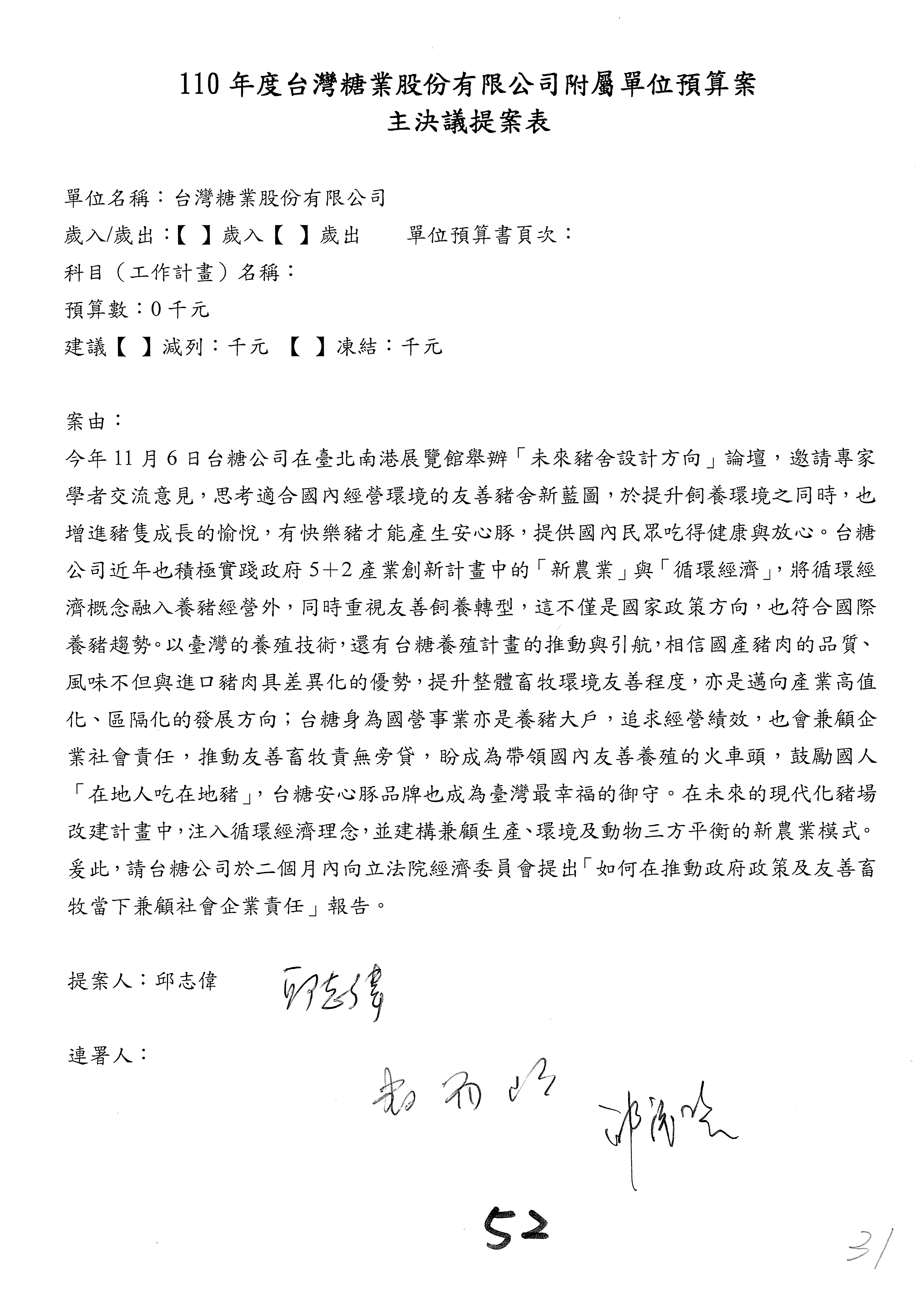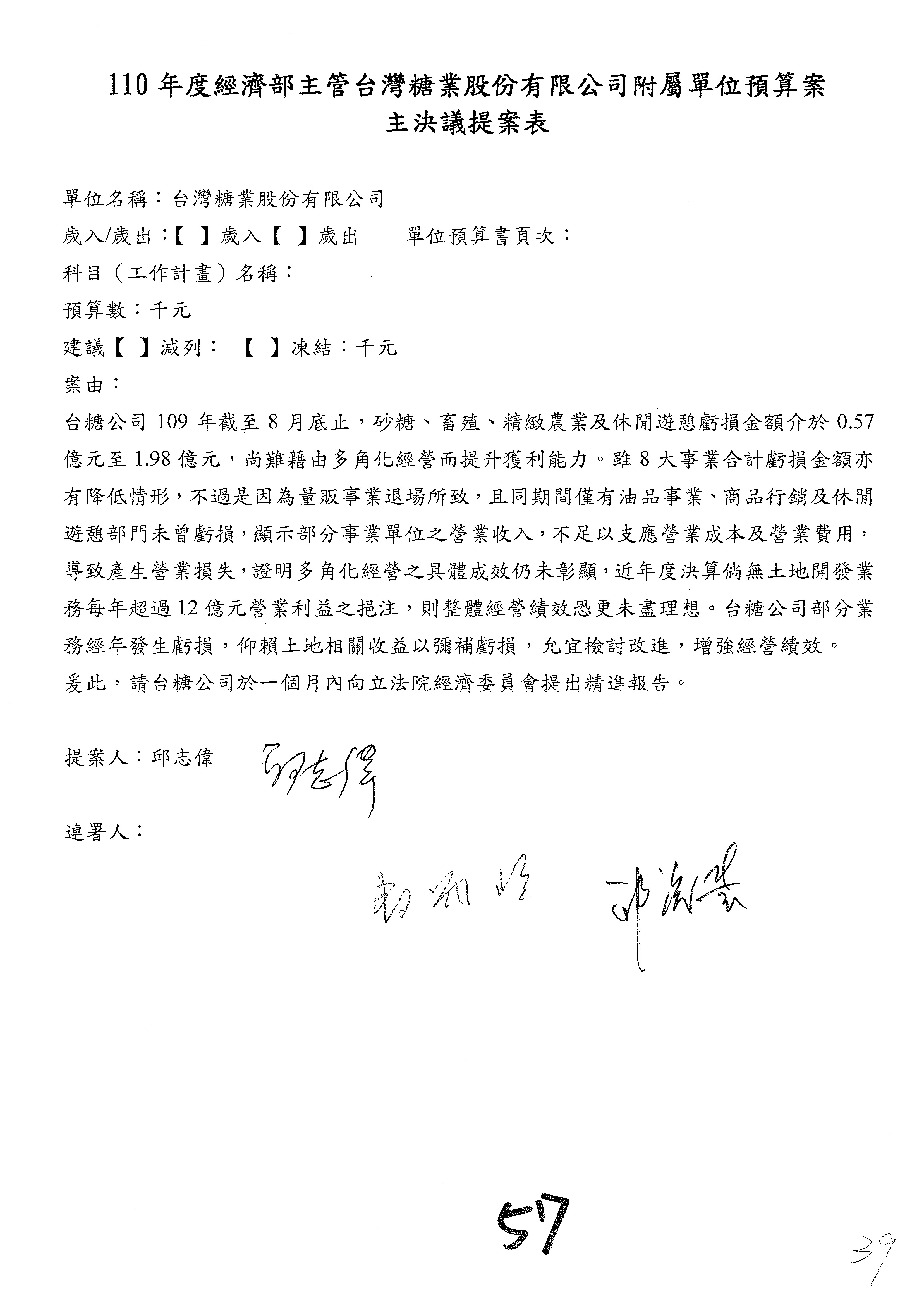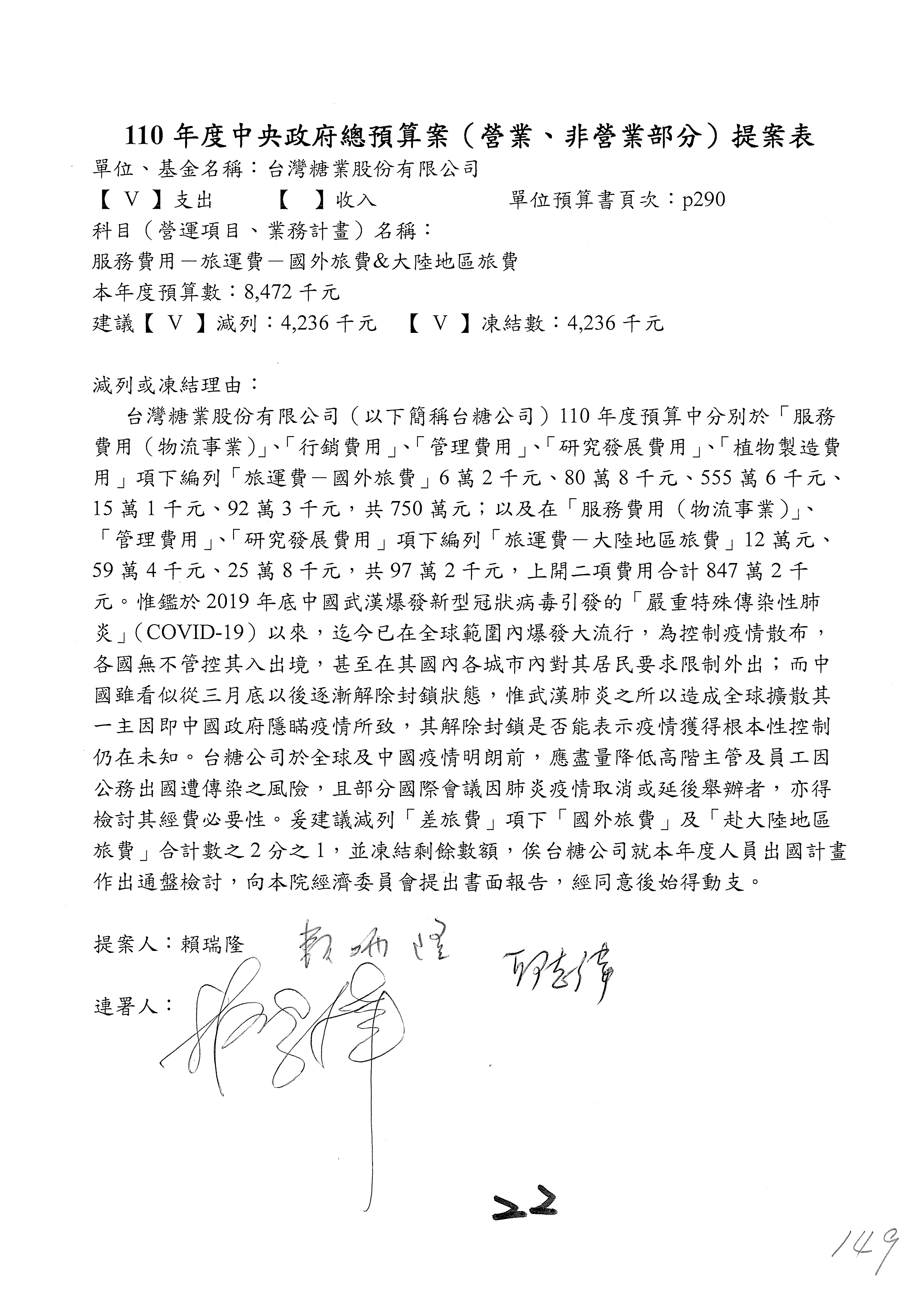 主席:台糖公司預算提案協商結論:第1案到第8案「營業收入」增列5,000萬元;第9案到第13案預算照列,其中第10案改主決議;第14案和第15案預算照列;第16案預算照列;第17案及第18案減列「水電費」1,000萬元,科目自行調整;第19案到第25案減列「旅運費」250萬元,科目自行調整;第26案預算照列;第27案至第33案預算照列;第34案到第40案預算照列;第41案到第50案「固定資產建設改良擴充」凍結5,000萬元,提出書面報告後始得動支;主決議第51案至第70案均照案通過;第71案倒數第三行「爰建請台糖公司」之後的「於符合農委會」5個字修正為「配合農委會政策於」,其餘均照案通過;第72案句中「總投資金額7,652萬元」之後修正為「計畫110年10月正式營運,為避免工程延宕影響當地觀光產業,台糖公司宜委託交通部鐵路局代為設計及施工,爰提案要求台糖公司應落實工程進度管理。」;第73案末句刪除「並提供……。」等文字;第74案、第75案與第75-1案均照案通過。