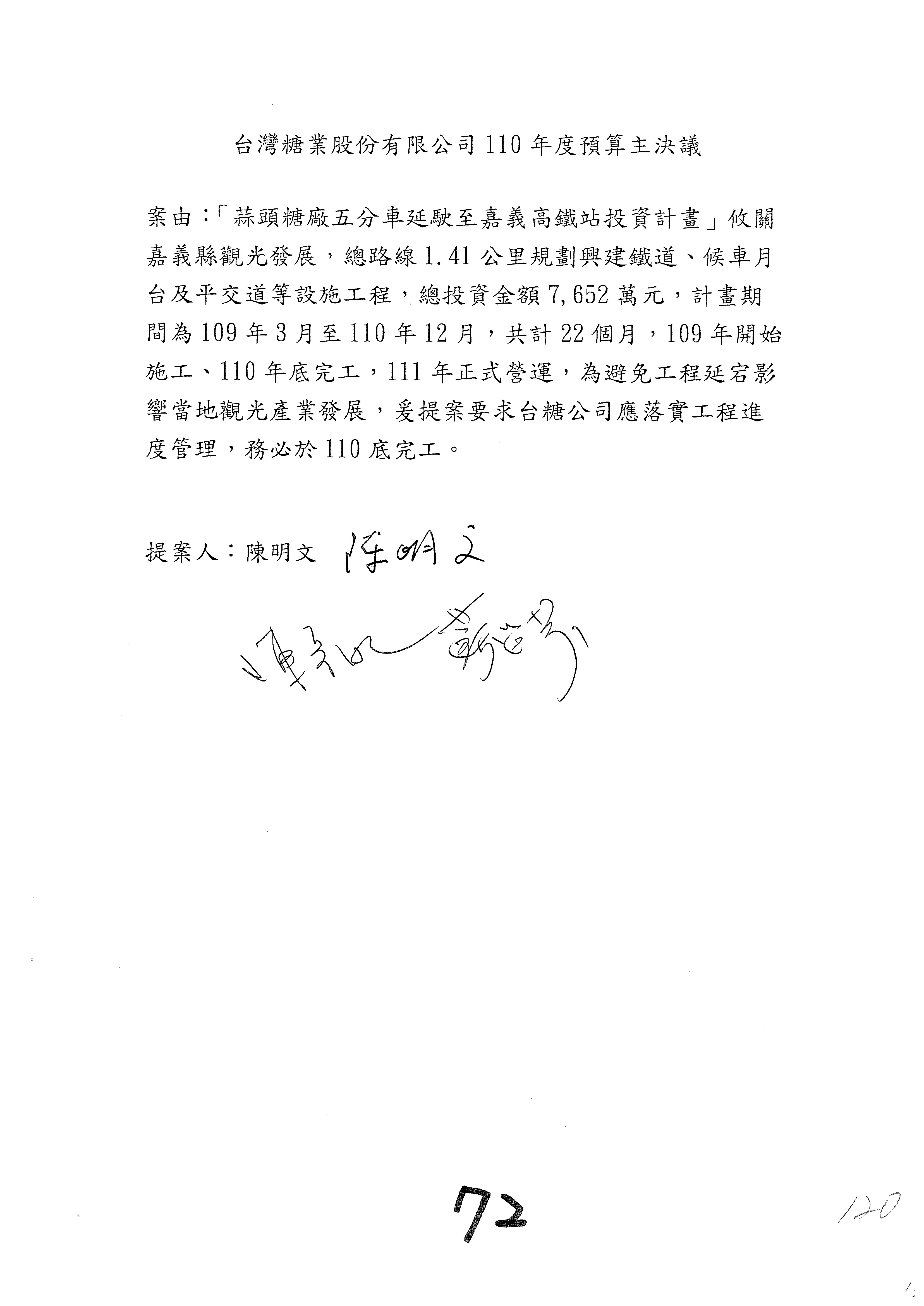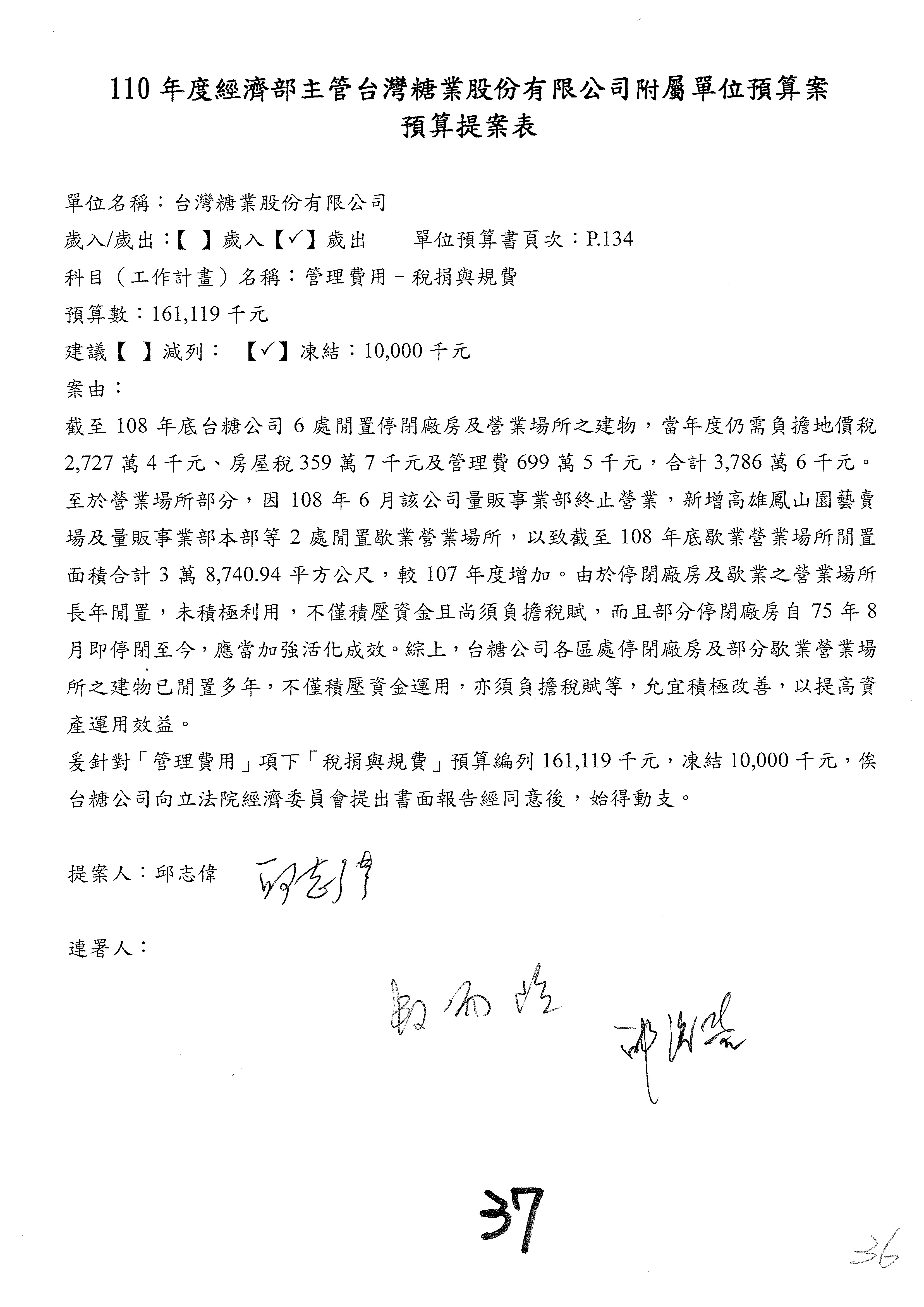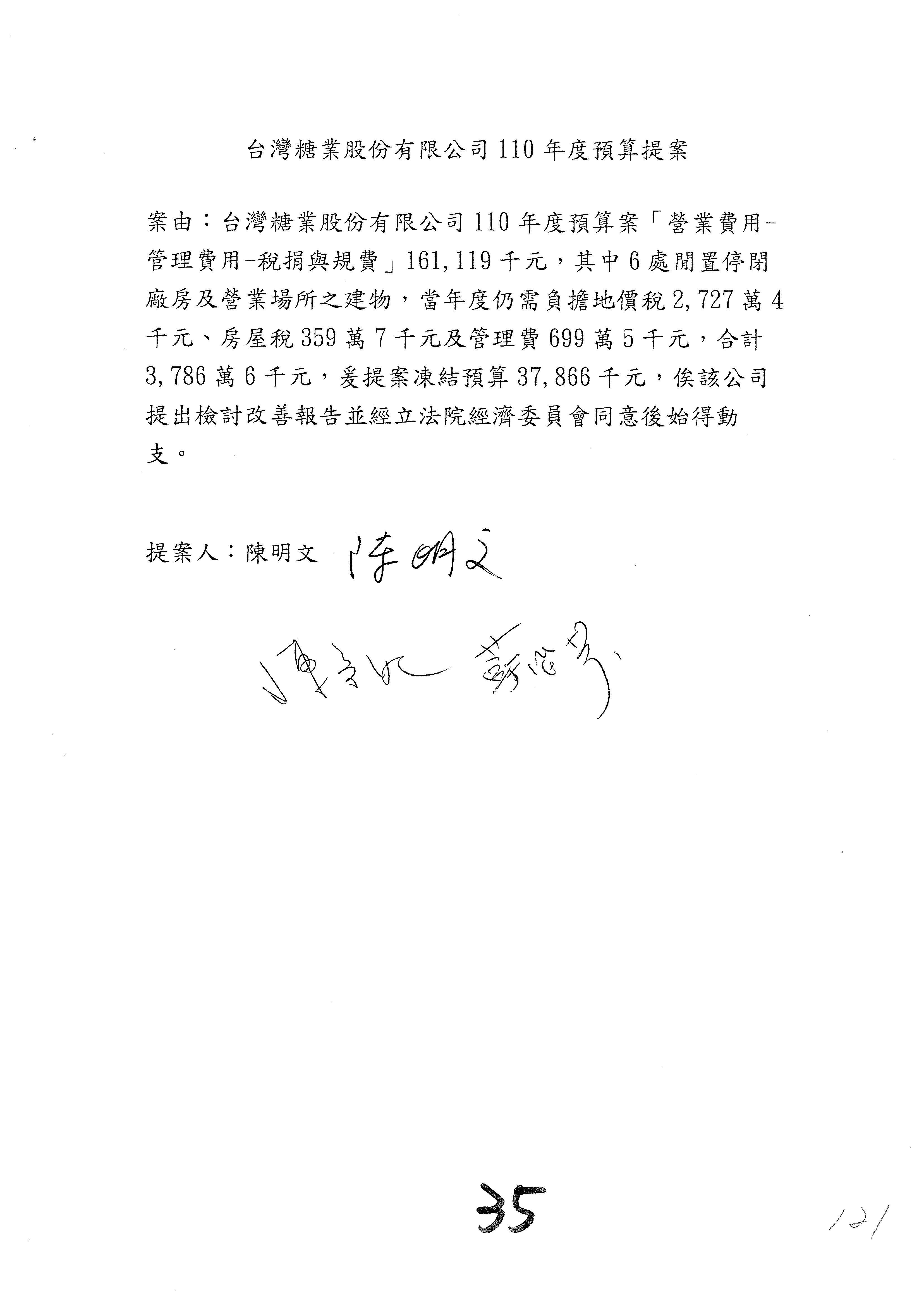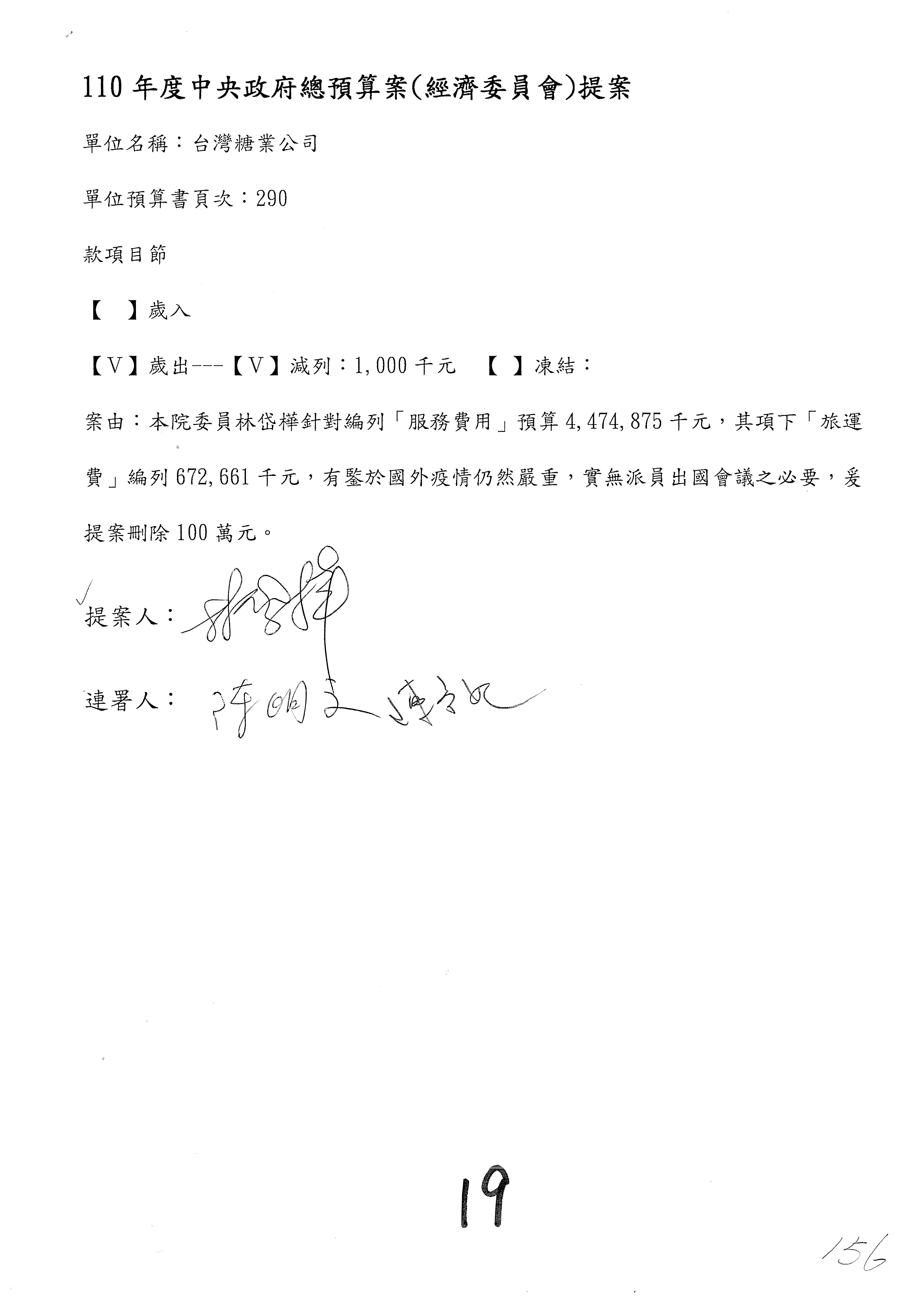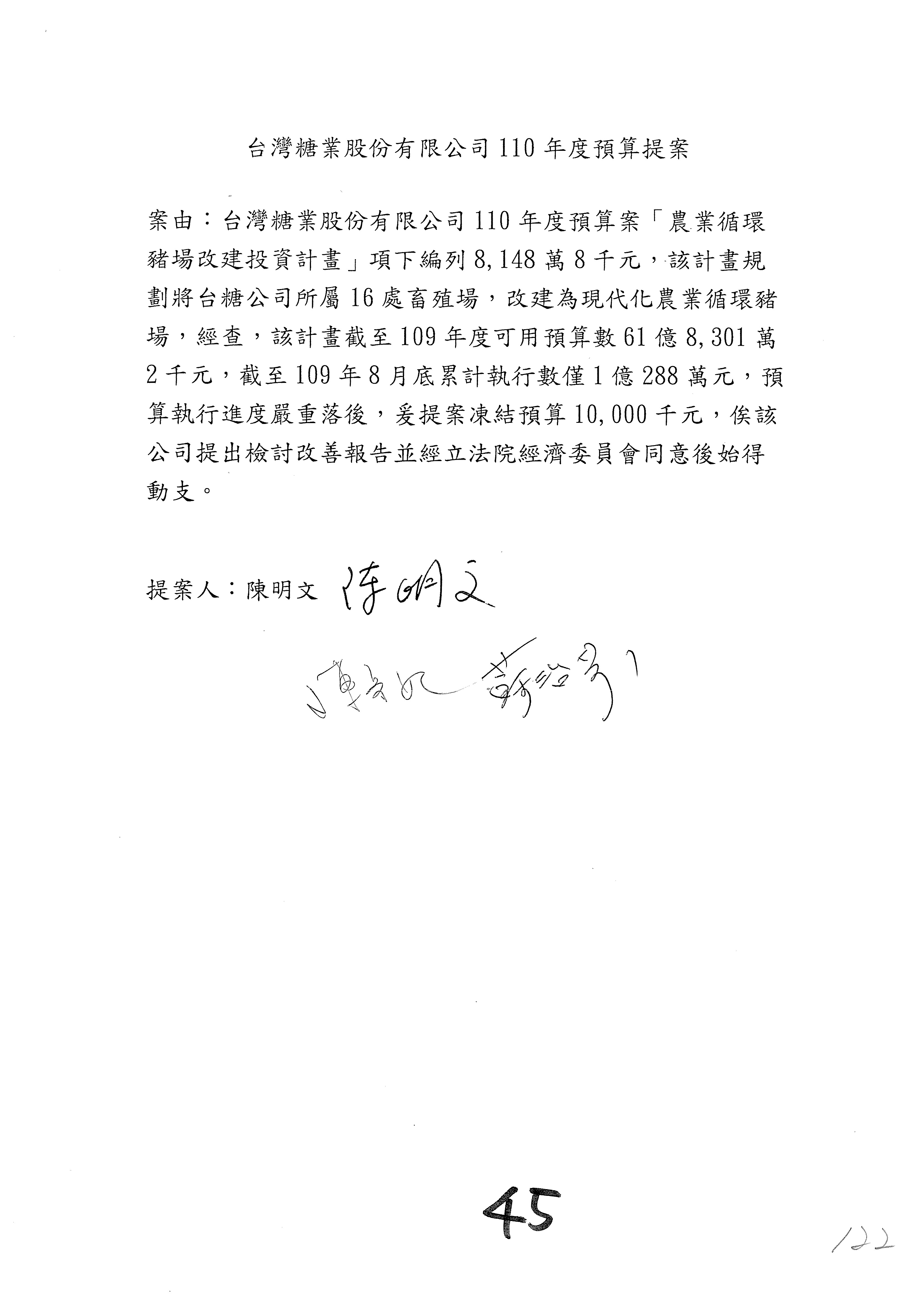 主席:台糖公司預算提案協商結論:第1案到第8案「營業收入」增列5,000萬元;第9案到第13案預算照列,其中第10案改主決議;第14案和第15案預算照列;第16案預算照列;第17案及第18案減列「水電費」1,000萬元,科目自行調整;第19案到第25案減列「旅運費」250萬元,科目自行調整;第26案預算照列;第27案至第33案預算照列;第34案到第40案預算照列;第41案到第50案「固定資產建設改良擴充」凍結5,000萬元,提出書面報告後始得動支;主決議第51案至第70案均照案通過;第71案倒數第三行「爰建請台糖公司」之後的「於符合農委會」5個字修正為「配合農委會政策於」,其餘均照案通過;第72案句中「總投資金額7,652萬元」之後修正為「計畫110年10月正式營運,為避免工程延宕影響當地觀光產業,台糖公司宜委託交通部鐵路局代為設計及施工,爰提案要求台糖公司應落實工程進度管理。」;第73案末句刪除「並提供……。」等文字;第74案、第75案與第75-1案均照案通過。