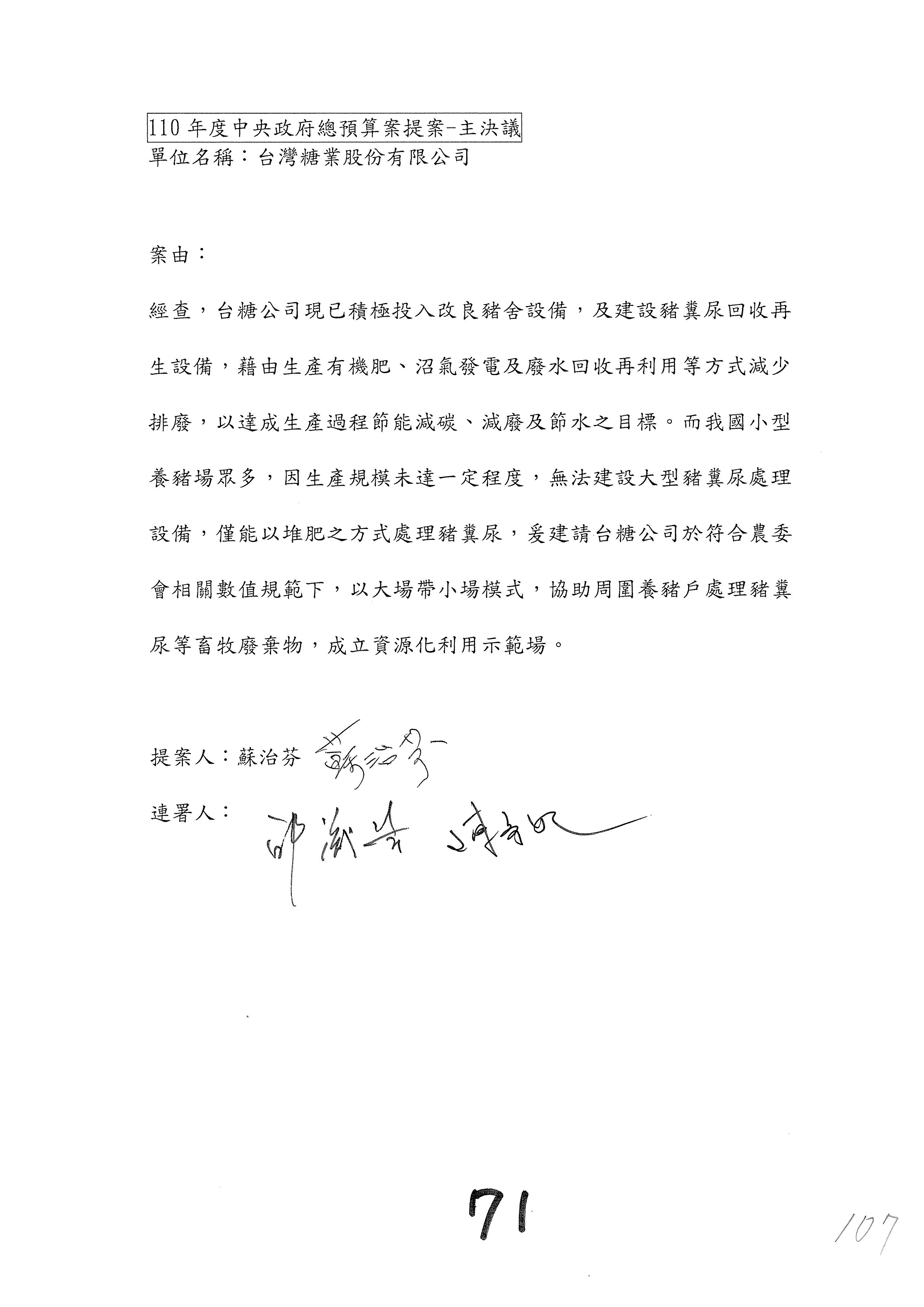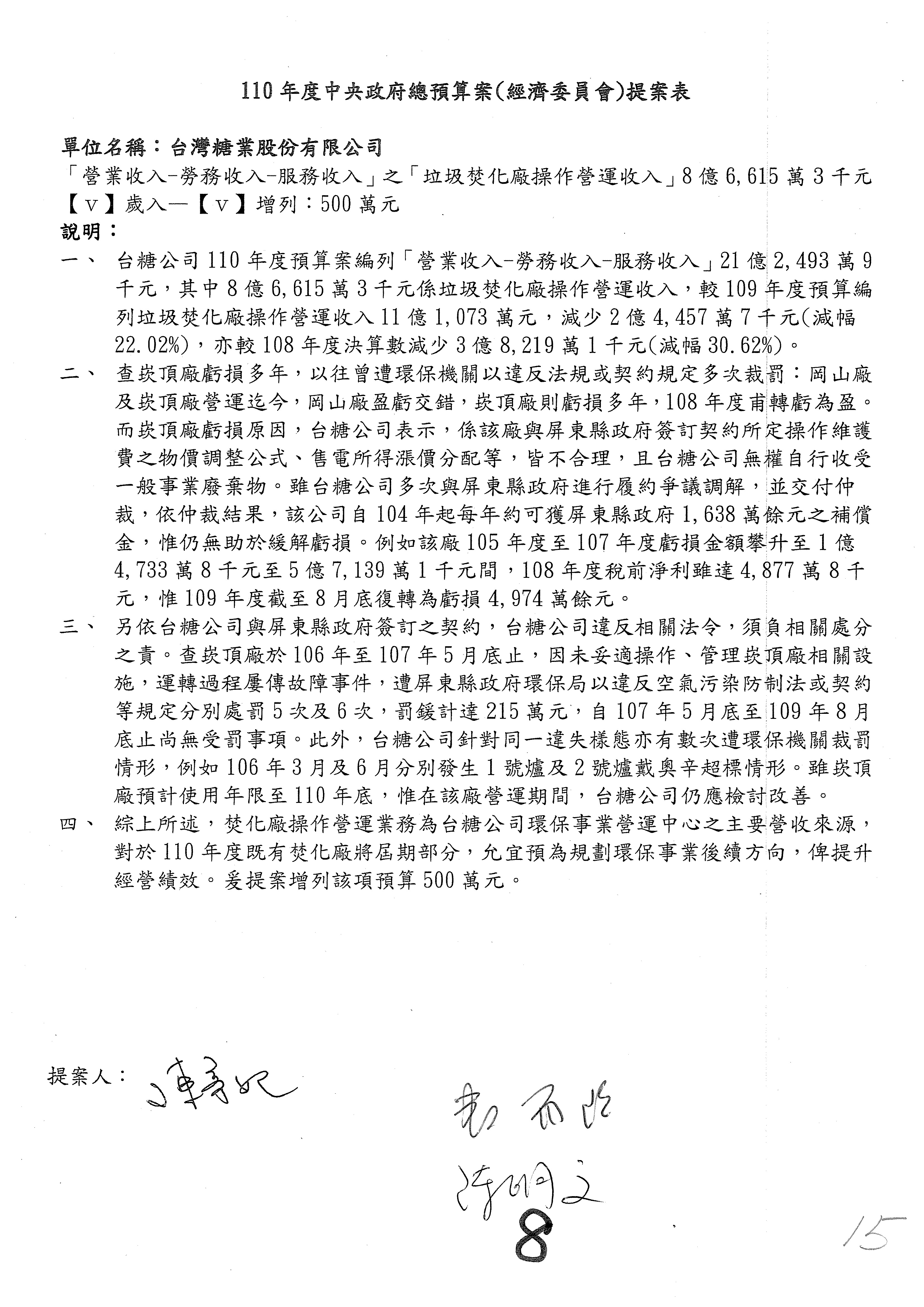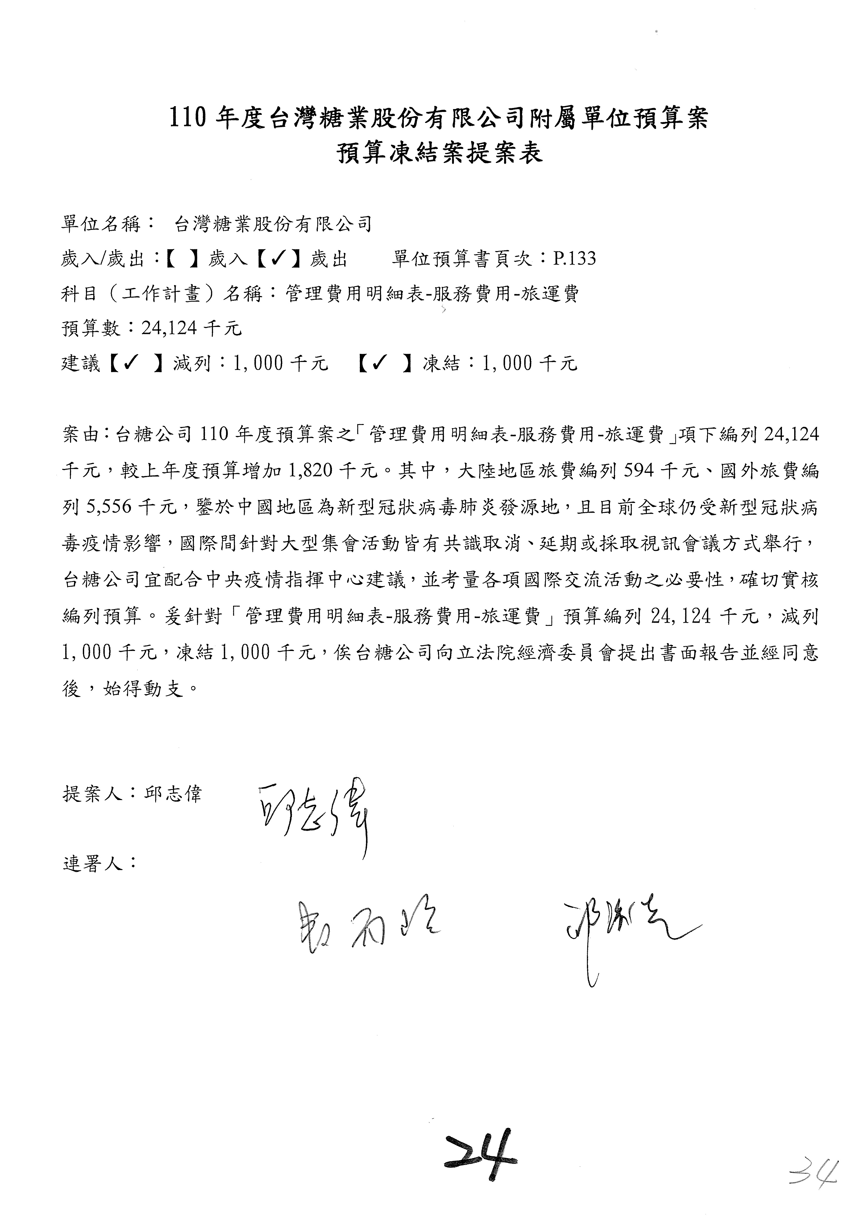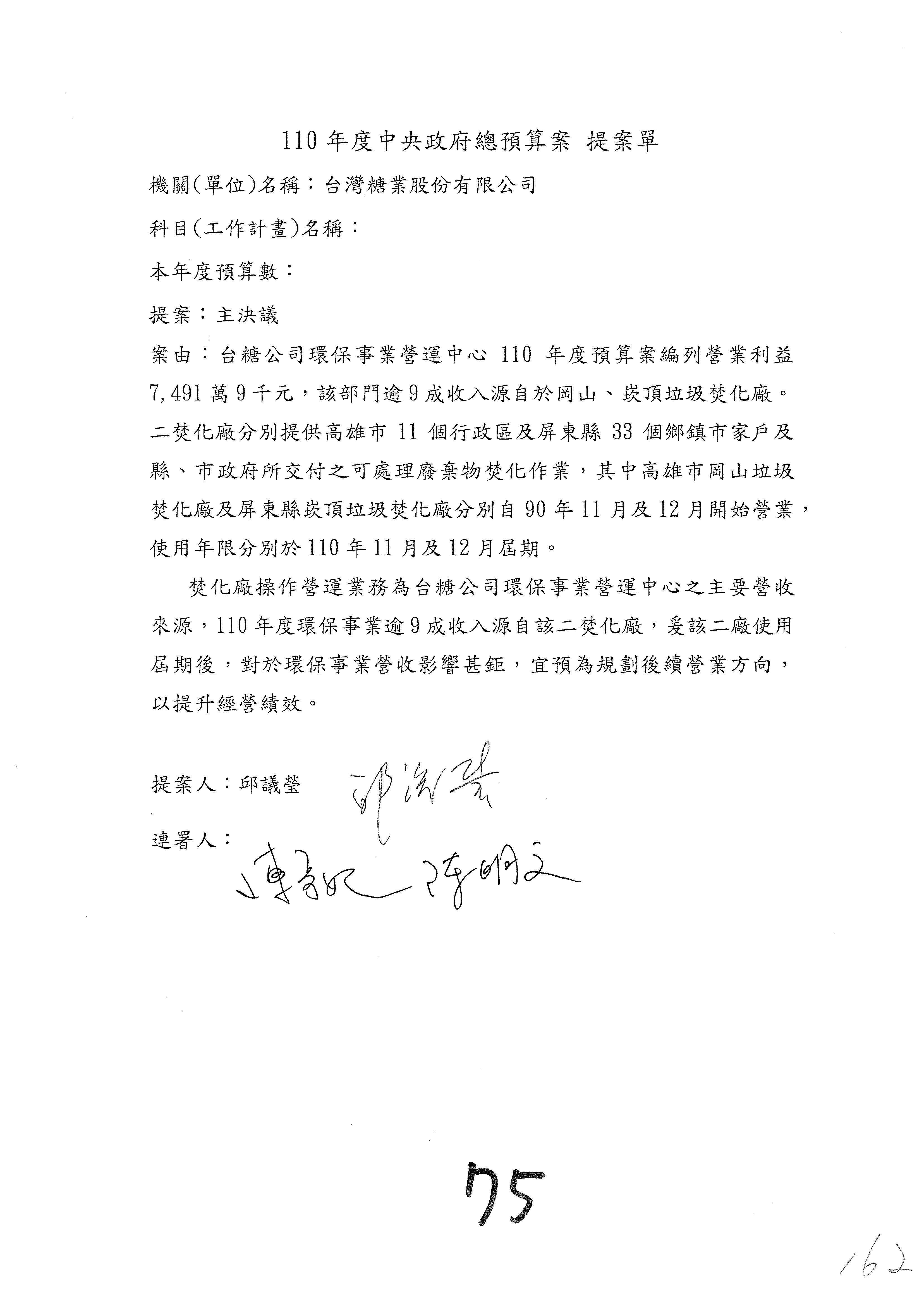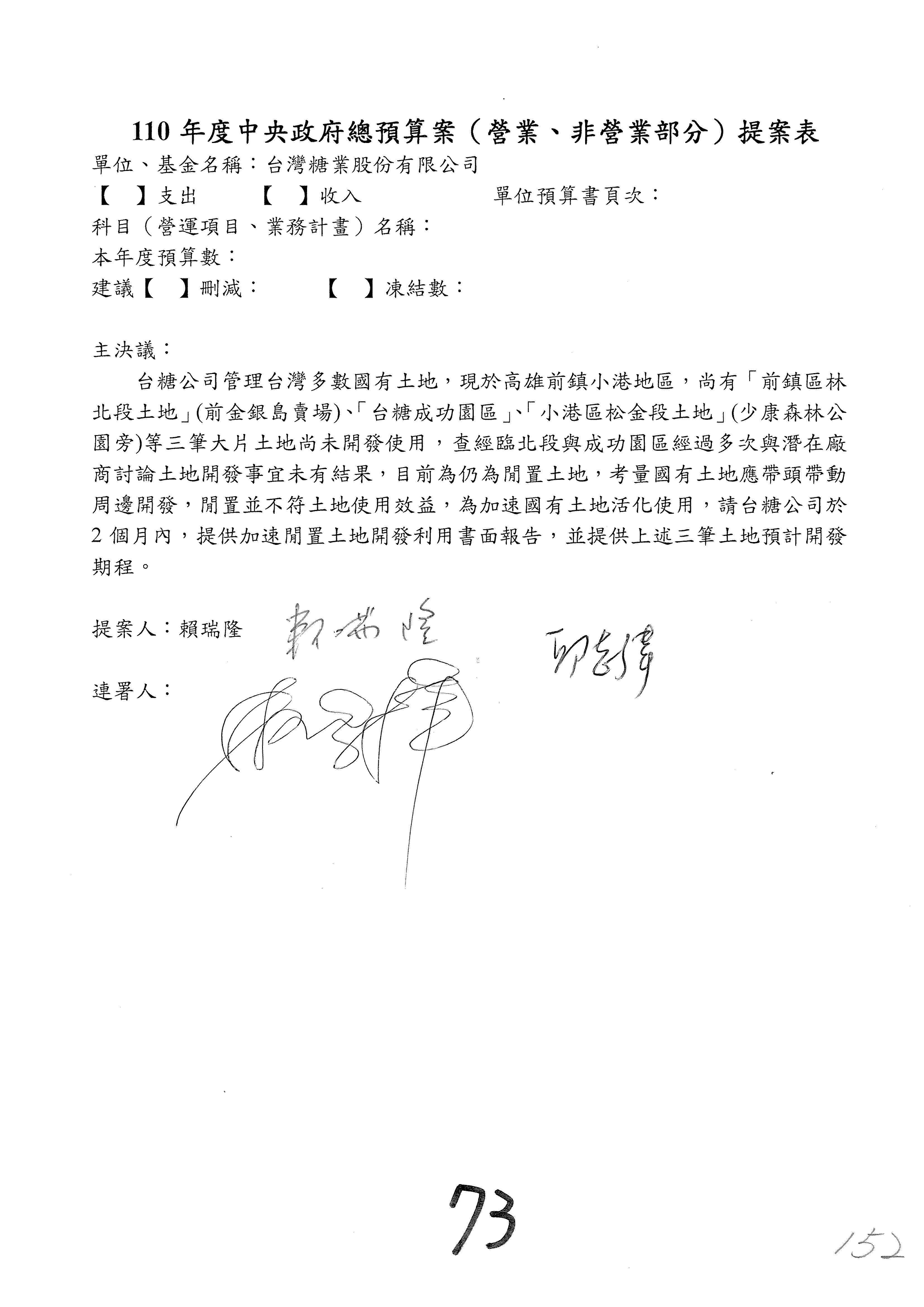 主席:台糖公司預算提案協商結論:第1案到第8案「營業收入」增列5,000萬元;第9案到第13案預算照列,其中第10案改主決議;第14案和第15案預算照列;第16案預算照列;第17案及第18案減列「水電費」1,000萬元,科目自行調整;第19案到第25案減列「旅運費」250萬元,科目自行調整;第26案預算照列;第27案至第33案預算照列;第34案到第40案預算照列;第41案到第50案「固定資產建設改良擴充」凍結5,000萬元,提出書面報告後始得動支;主決議第51案至第70案均照案通過;第71案倒數第三行「爰建請台糖公司」之後的「於符合農委會」5個字修正為「配合農委會政策於」,其餘均照案通過;第72案句中「總投資金額7,652萬元」之後修正為「計畫110年10月正式營運,為避免工程延宕影響當地觀光產業,台糖公司宜委託交通部鐵路局代為設計及施工,爰提案要求台糖公司應落實工程進度管理。」;第73案末句刪除「並提供……。」等文字;第74案、第75案與第75-1案均照案通過。