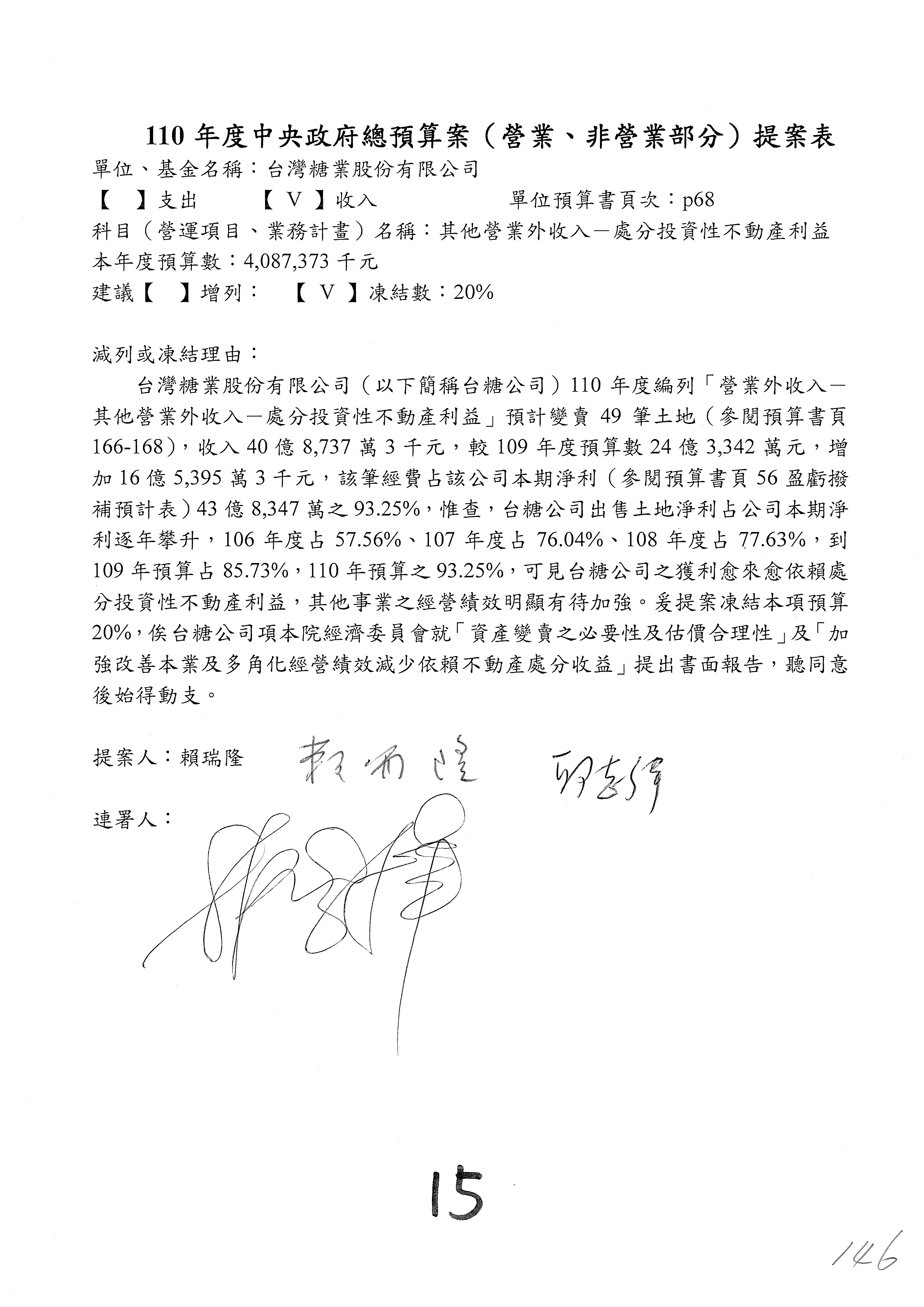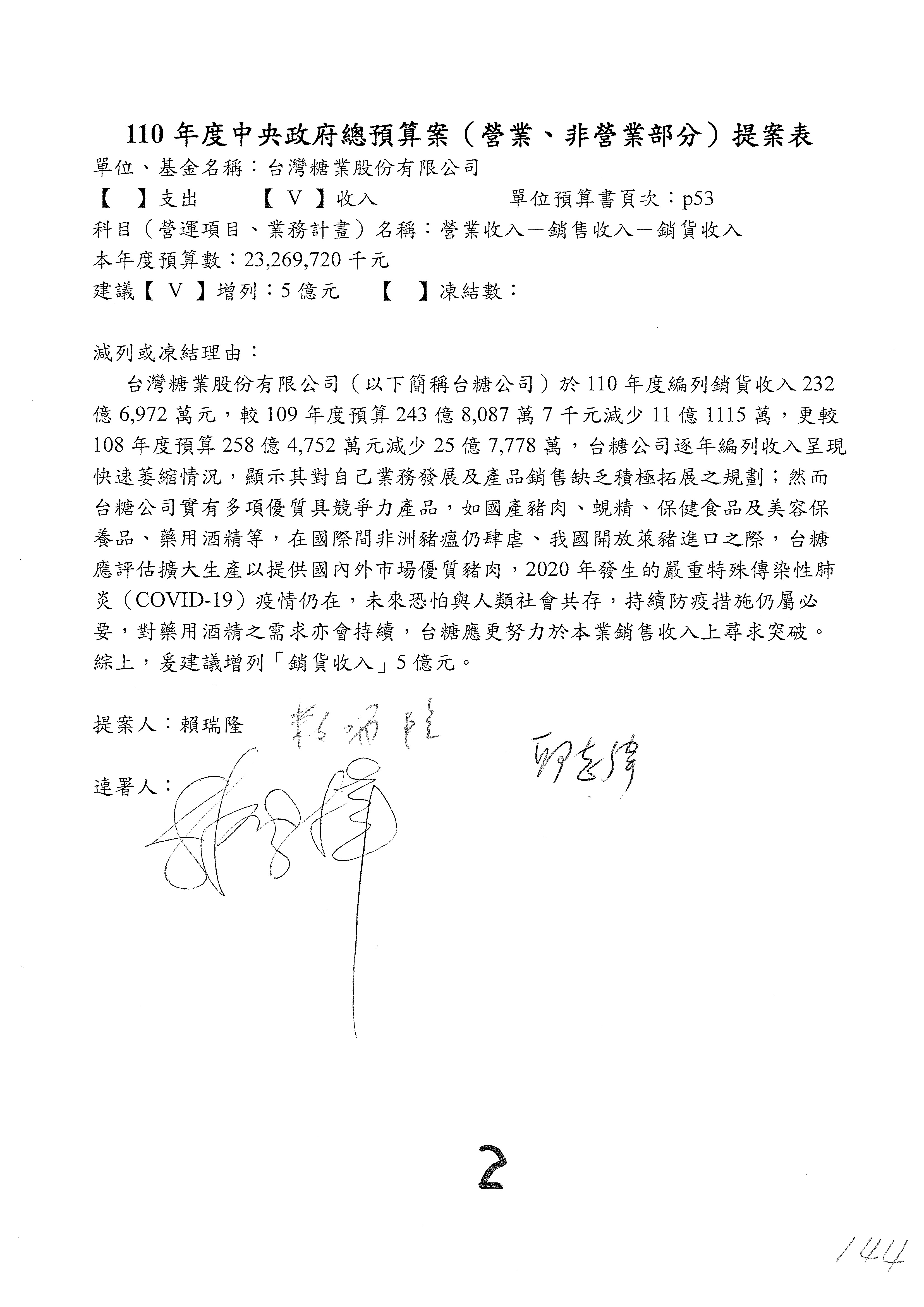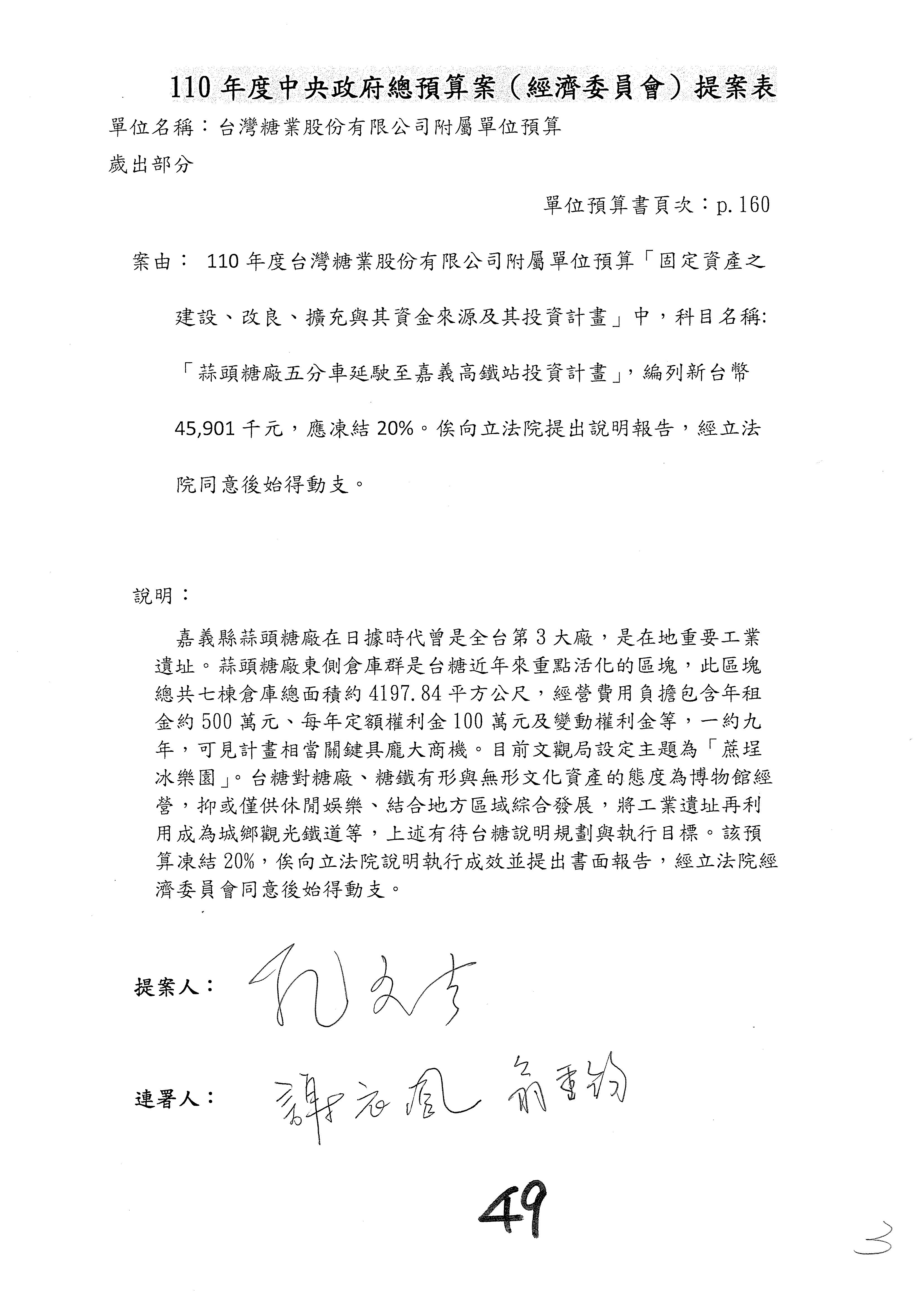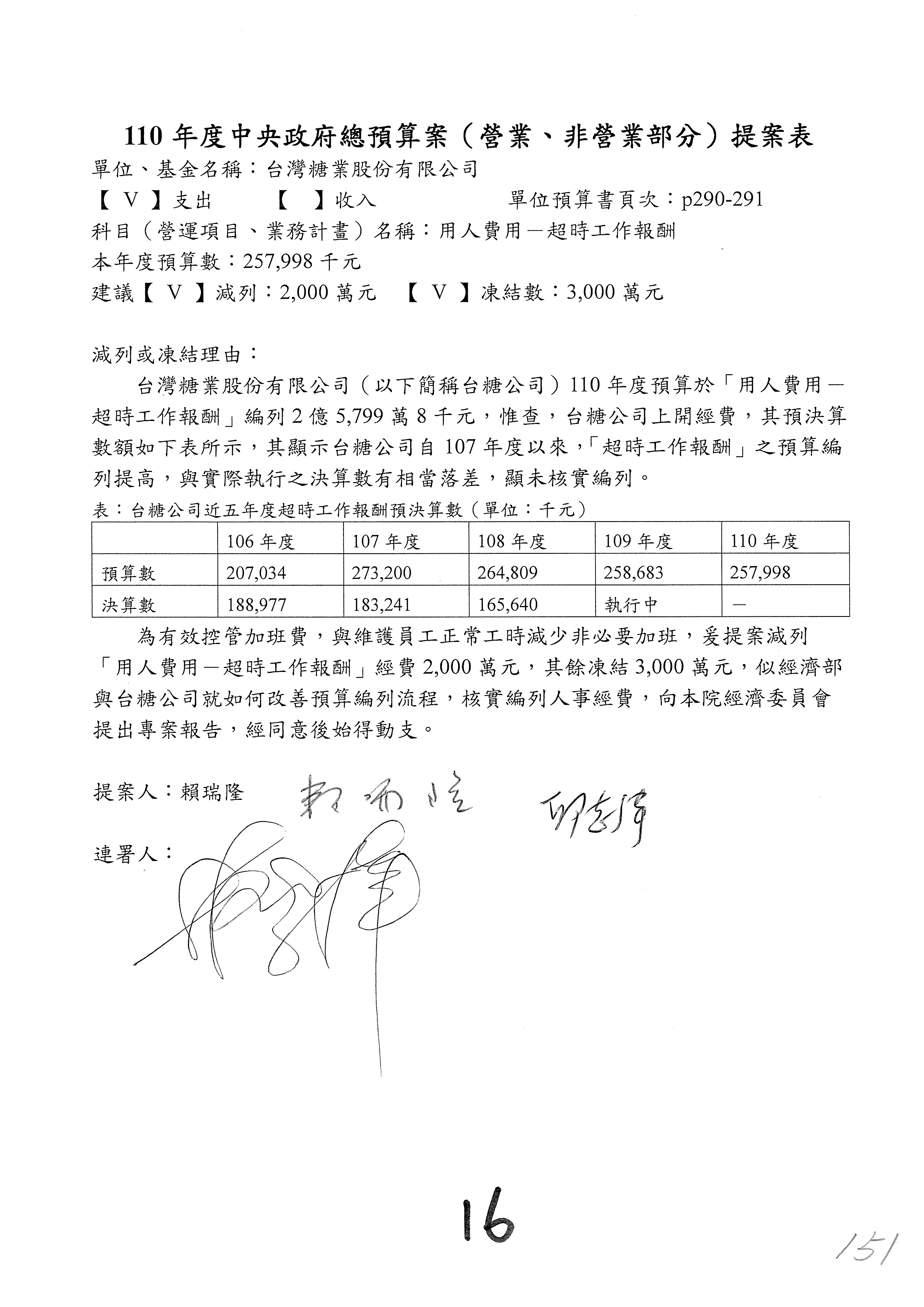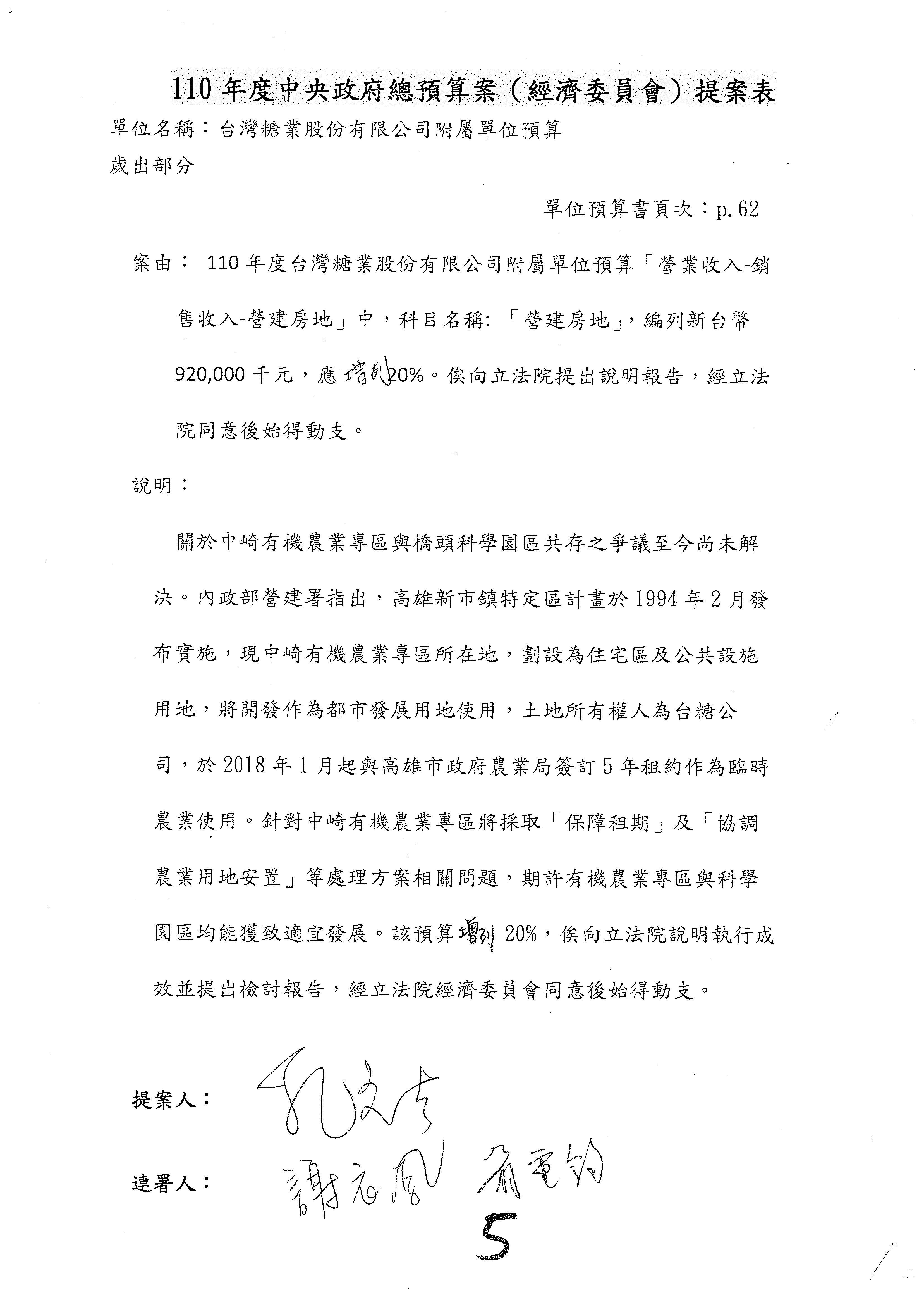 主席:台糖公司預算提案協商結論:第1案到第8案「營業收入」增列5,000萬元;第9案到第13案預算照列,其中第10案改主決議;第14案和第15案預算照列;第16案預算照列;第17案及第18案減列「水電費」1,000萬元,科目自行調整;第19案到第25案減列「旅運費」250萬元,科目自行調整;第26案預算照列;第27案至第33案預算照列;第34案到第40案預算照列;第41案到第50案「固定資產建設改良擴充」凍結5,000萬元,提出書面報告後始得動支;主決議第51案至第70案均照案通過;第71案倒數第三行「爰建請台糖公司」之後的「於符合農委會」5個字修正為「配合農委會政策於」,其餘均照案通過;第72案句中「總投資金額7,652萬元」之後修正為「計畫110年10月正式營運,為避免工程延宕影響當地觀光產業,台糖公司宜委託交通部鐵路局代為設計及施工,爰提案要求台糖公司應落實工程進度管理。」;第73案末句刪除「並提供……。」等文字;第74案、第75案與第75-1案均照案通過。