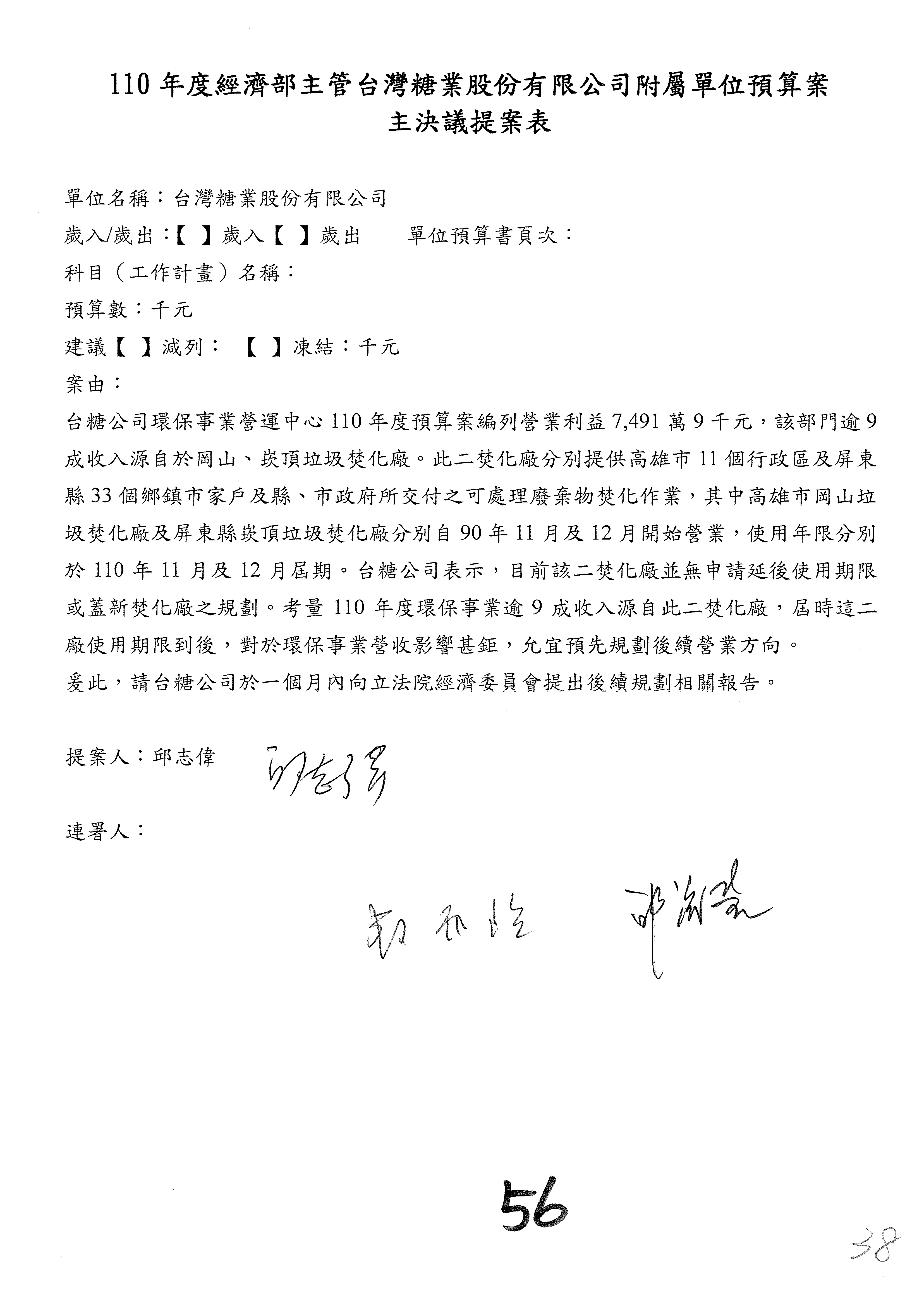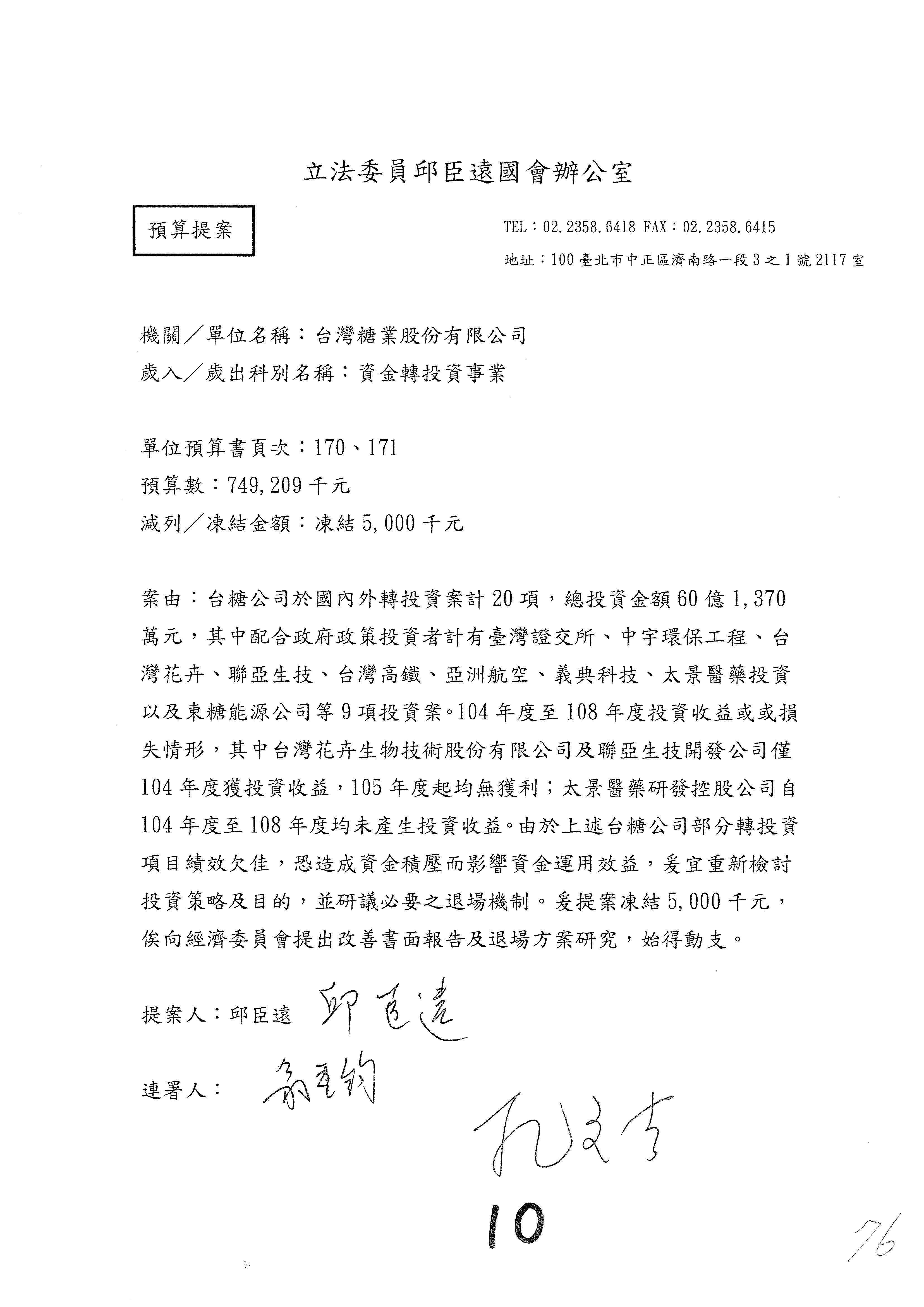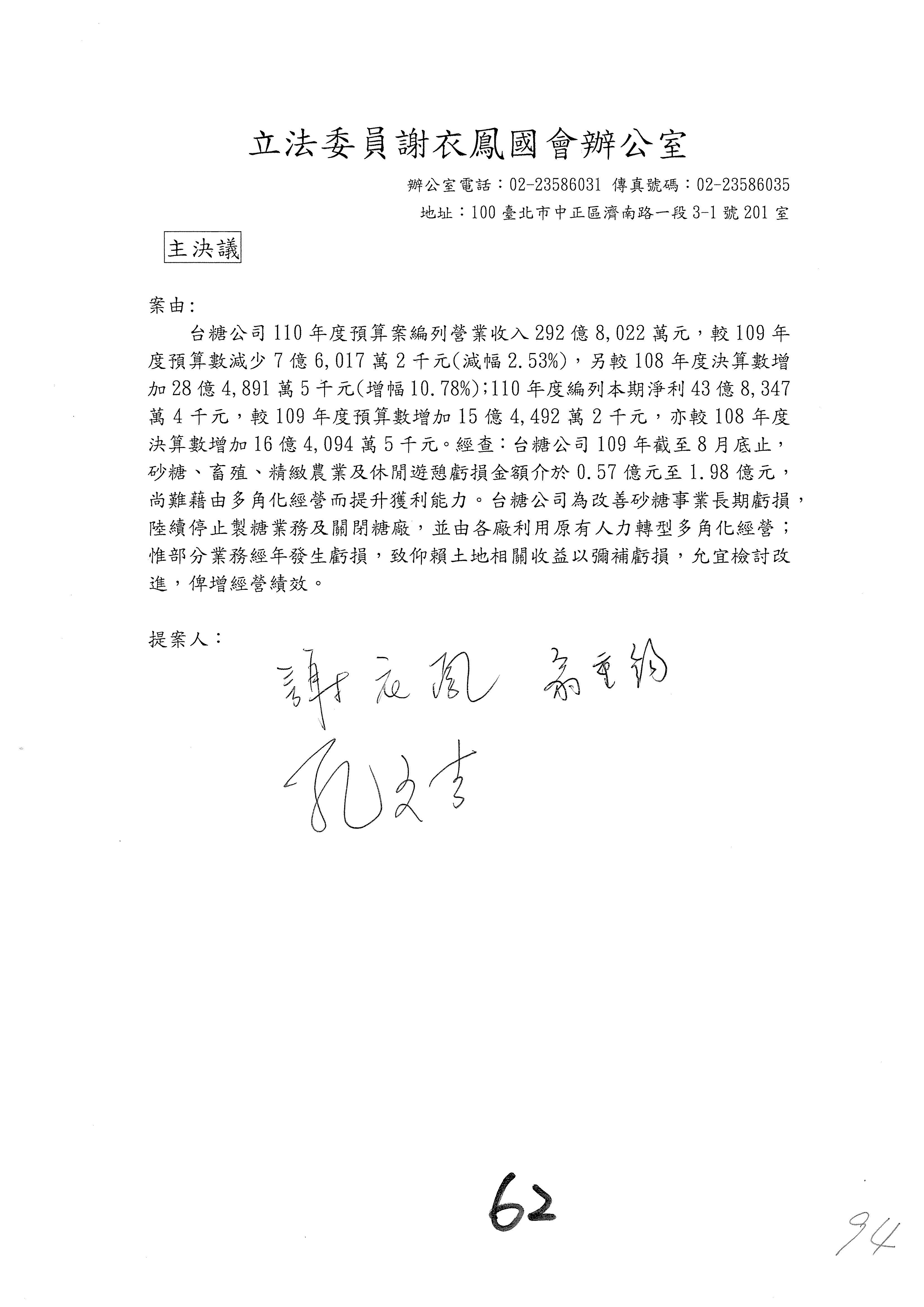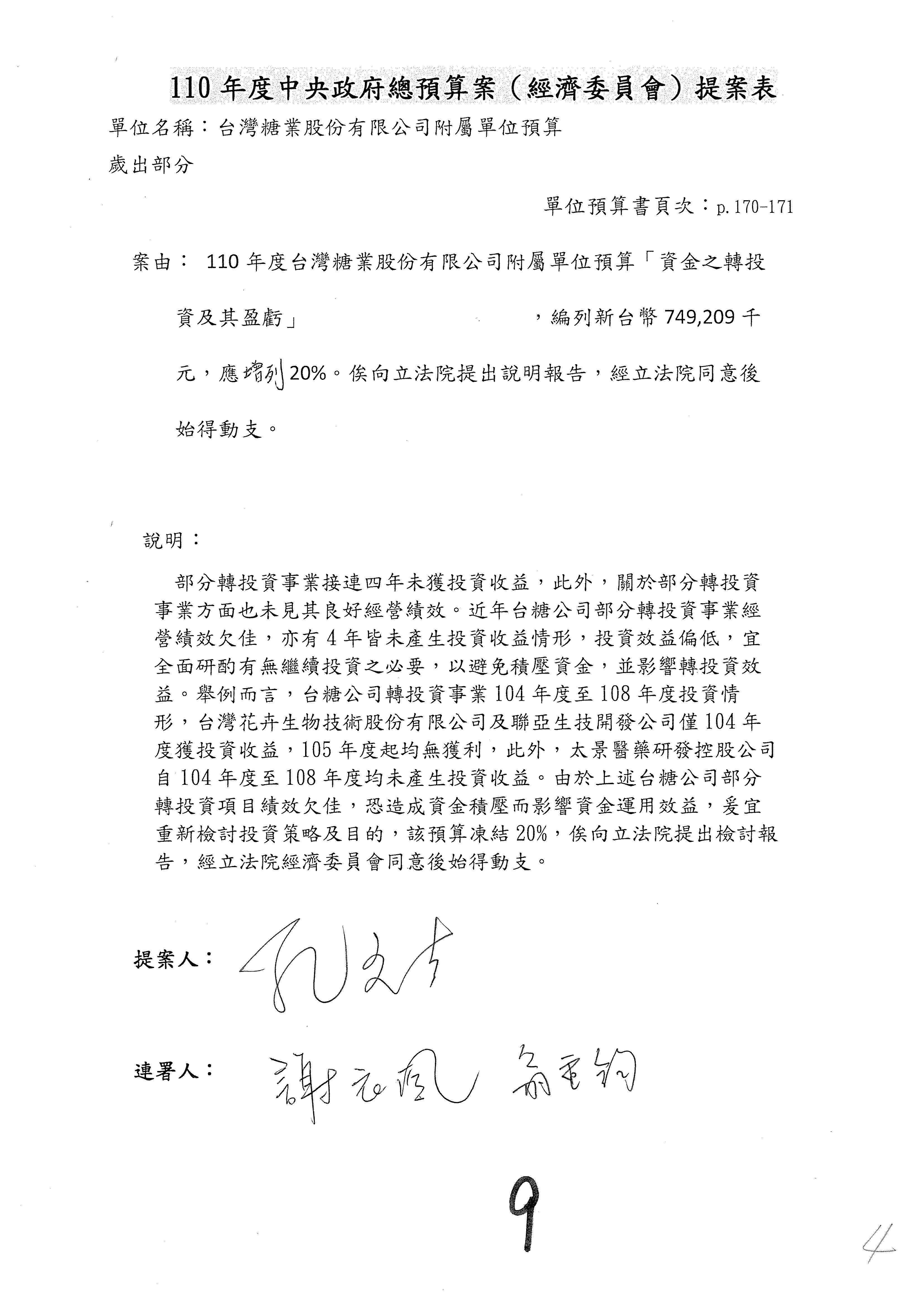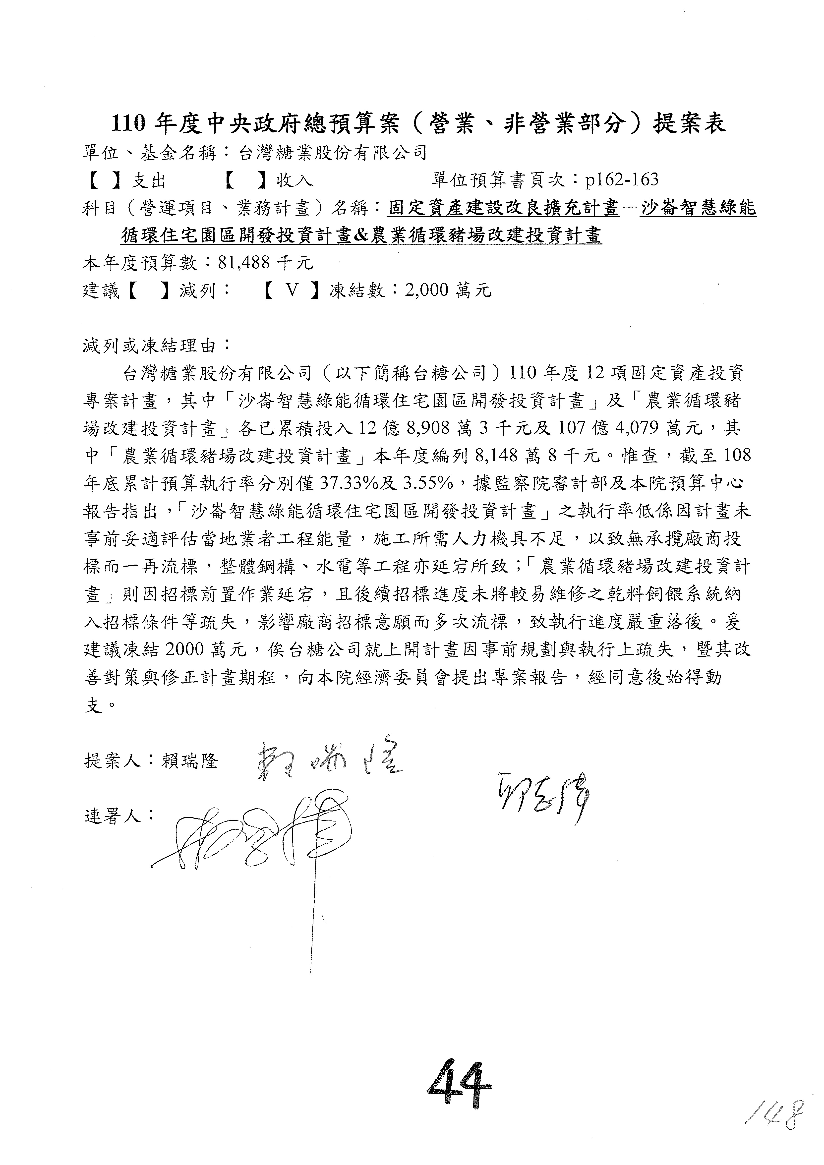 主席:台糖公司預算提案協商結論:第1案到第8案「營業收入」增列5,000萬元;第9案到第13案預算照列,其中第10案改主決議;第14案和第15案預算照列;第16案預算照列;第17案及第18案減列「水電費」1,000萬元,科目自行調整;第19案到第25案減列「旅運費」250萬元,科目自行調整;第26案預算照列;第27案至第33案預算照列;第34案到第40案預算照列;第41案到第50案「固定資產建設改良擴充」凍結5,000萬元,提出書面報告後始得動支;主決議第51案至第70案均照案通過;第71案倒數第三行「爰建請台糖公司」之後的「於符合農委會」5個字修正為「配合農委會政策於」,其餘均照案通過;第72案句中「總投資金額7,652萬元」之後修正為「計畫110年10月正式營運,為避免工程延宕影響當地觀光產業,台糖公司宜委託交通部鐵路局代為設計及施工,爰提案要求台糖公司應落實工程進度管理。」;第73案末句刪除「並提供……。」等文字;第74案、第75案與第75-1案均照案通過。