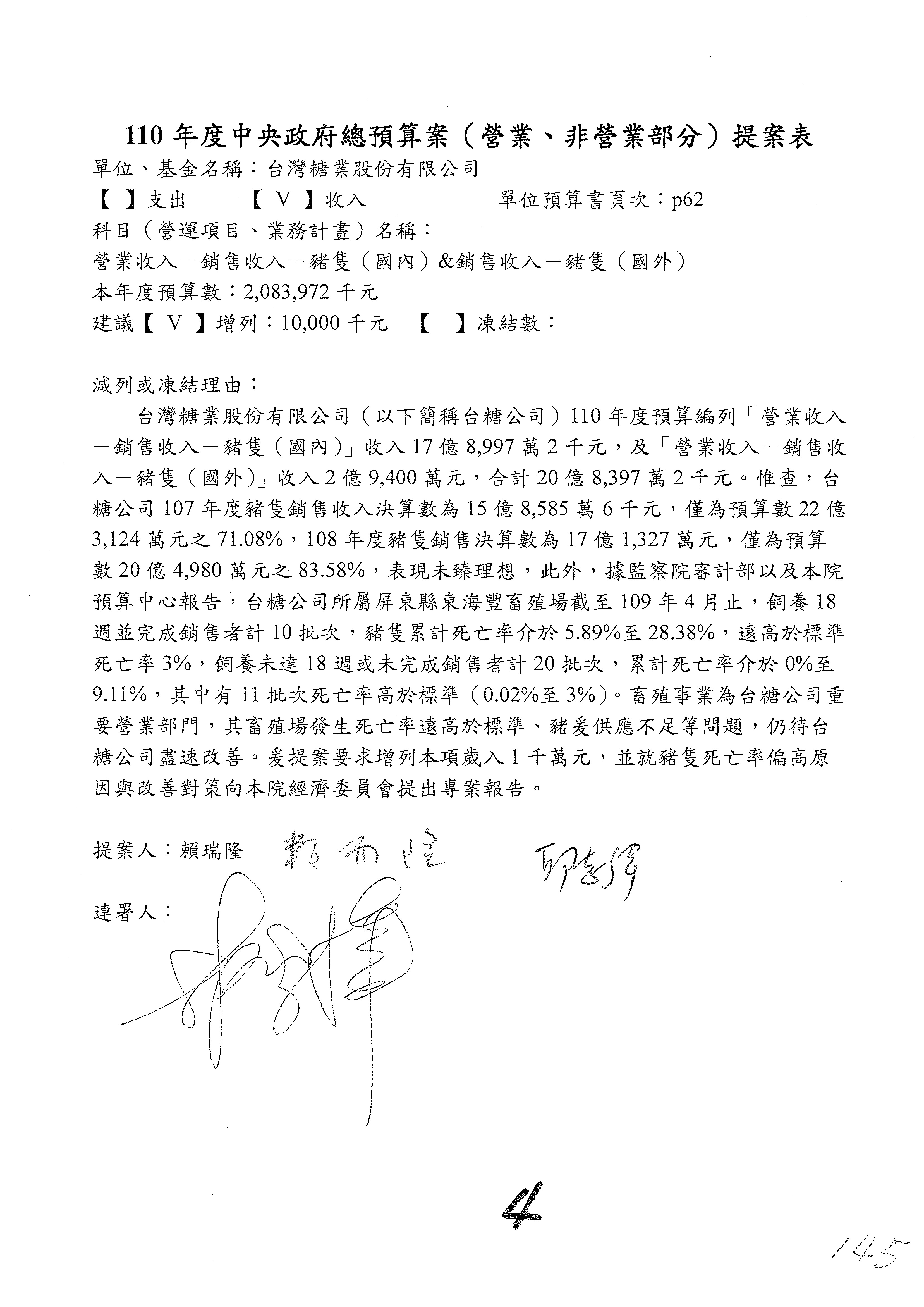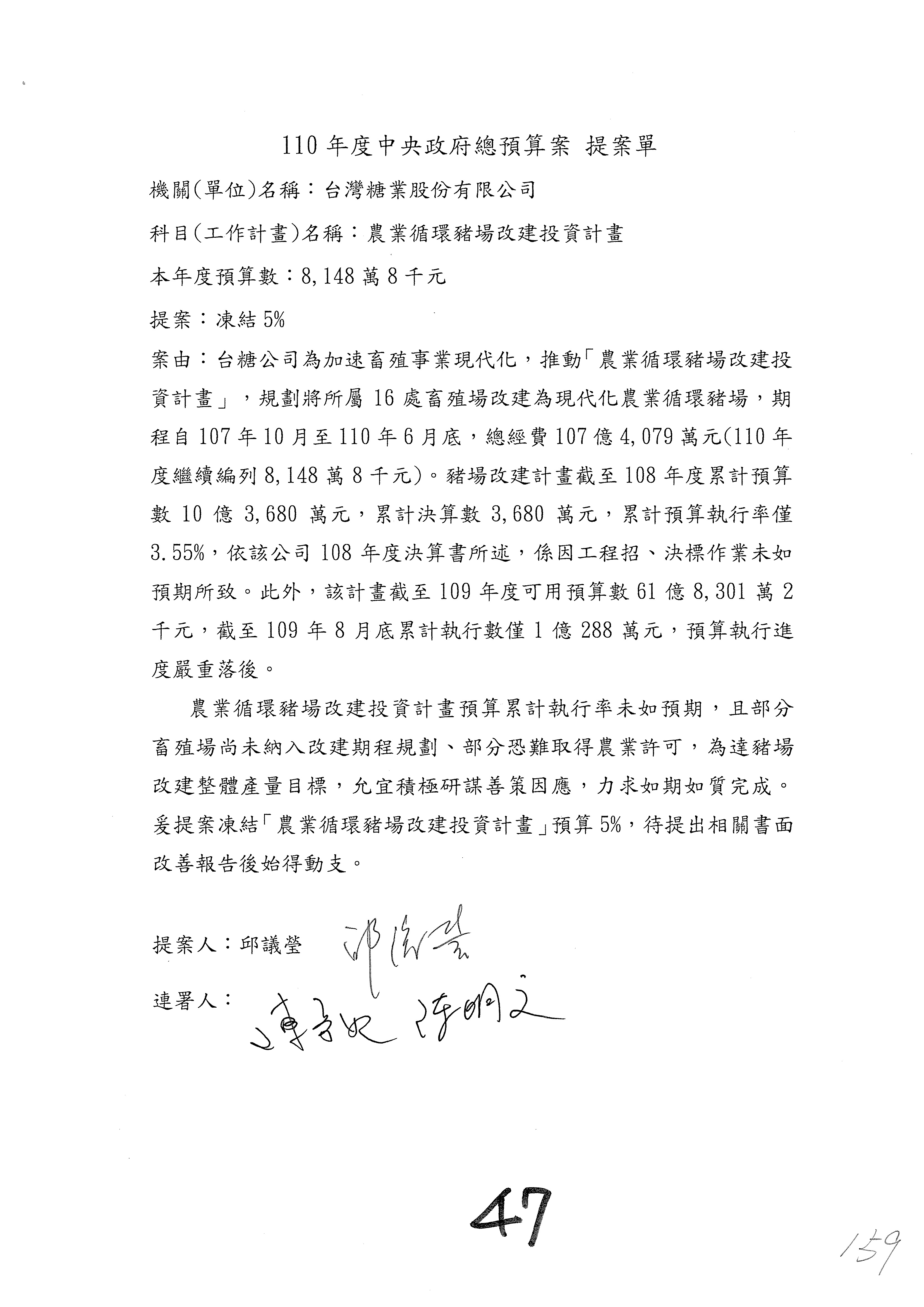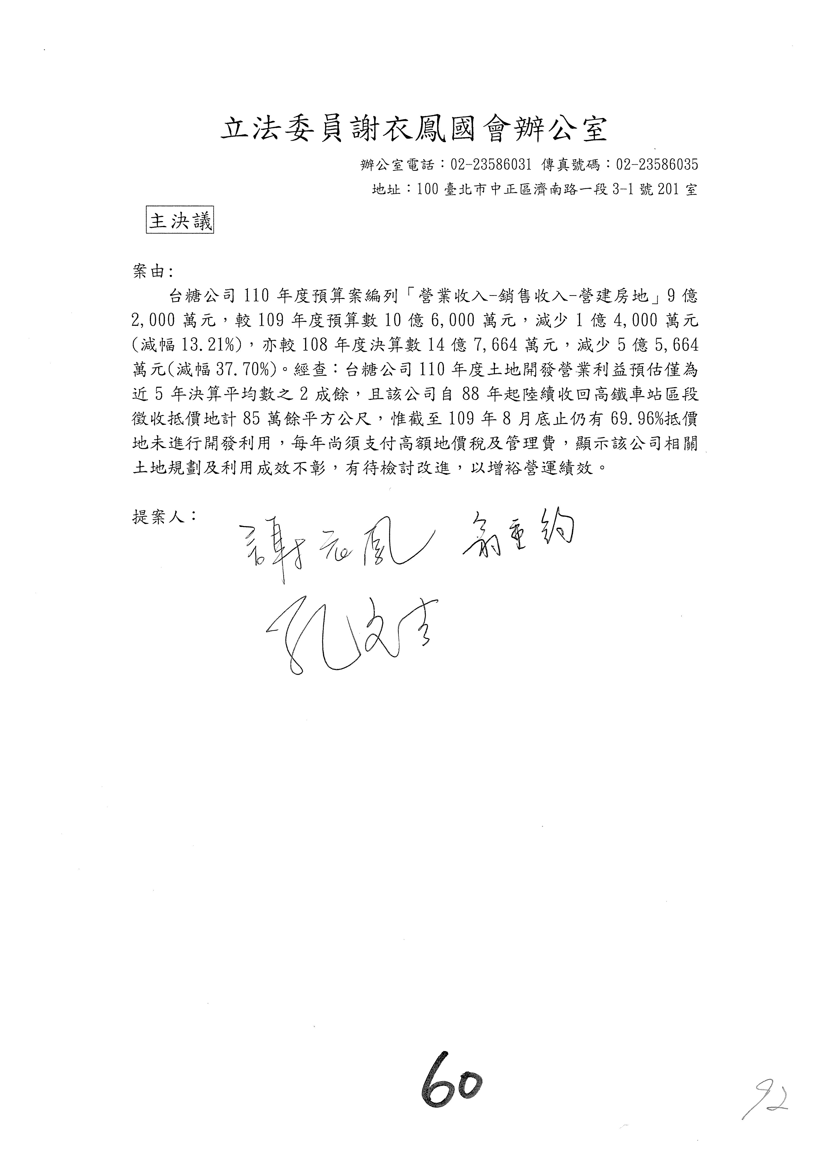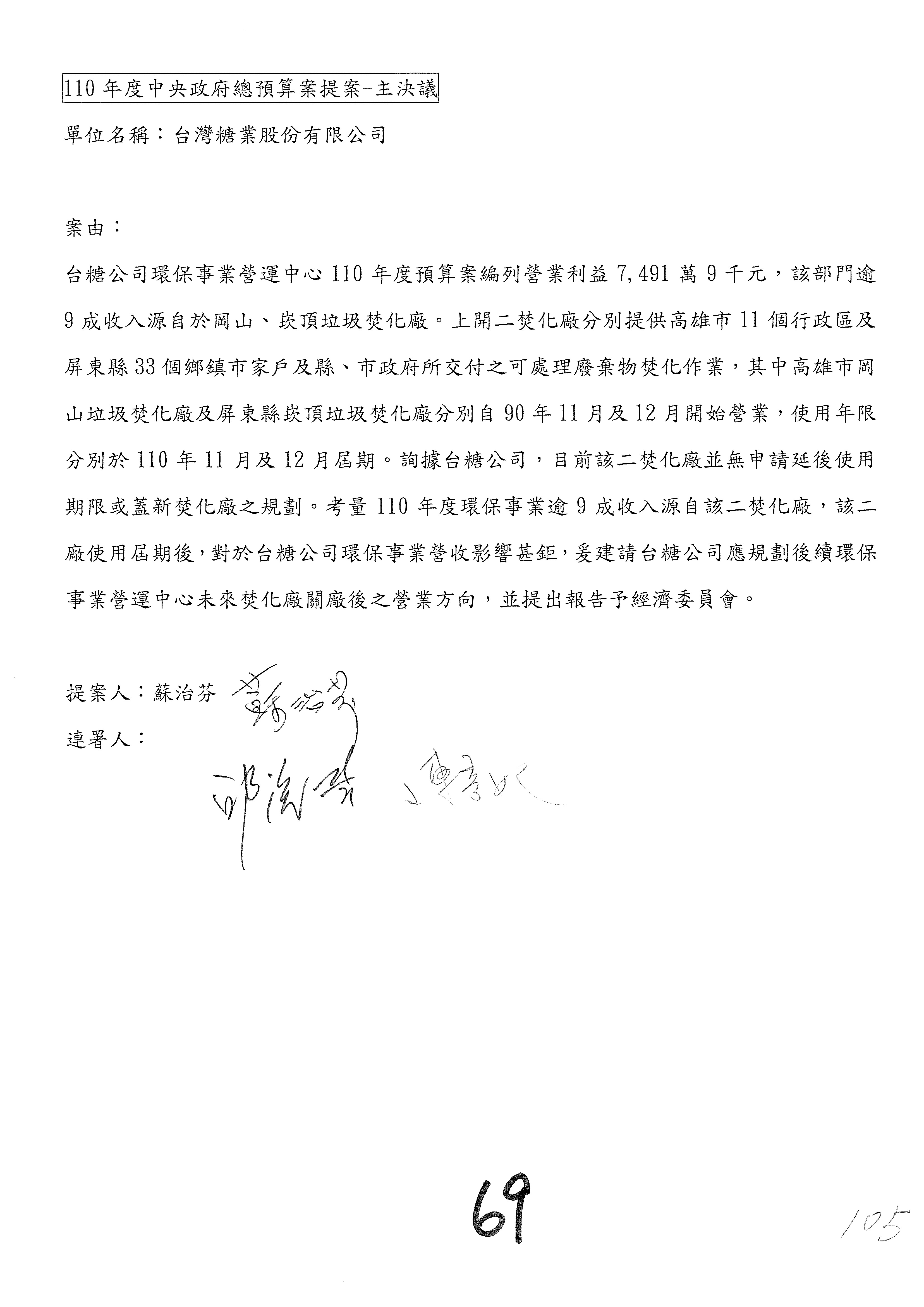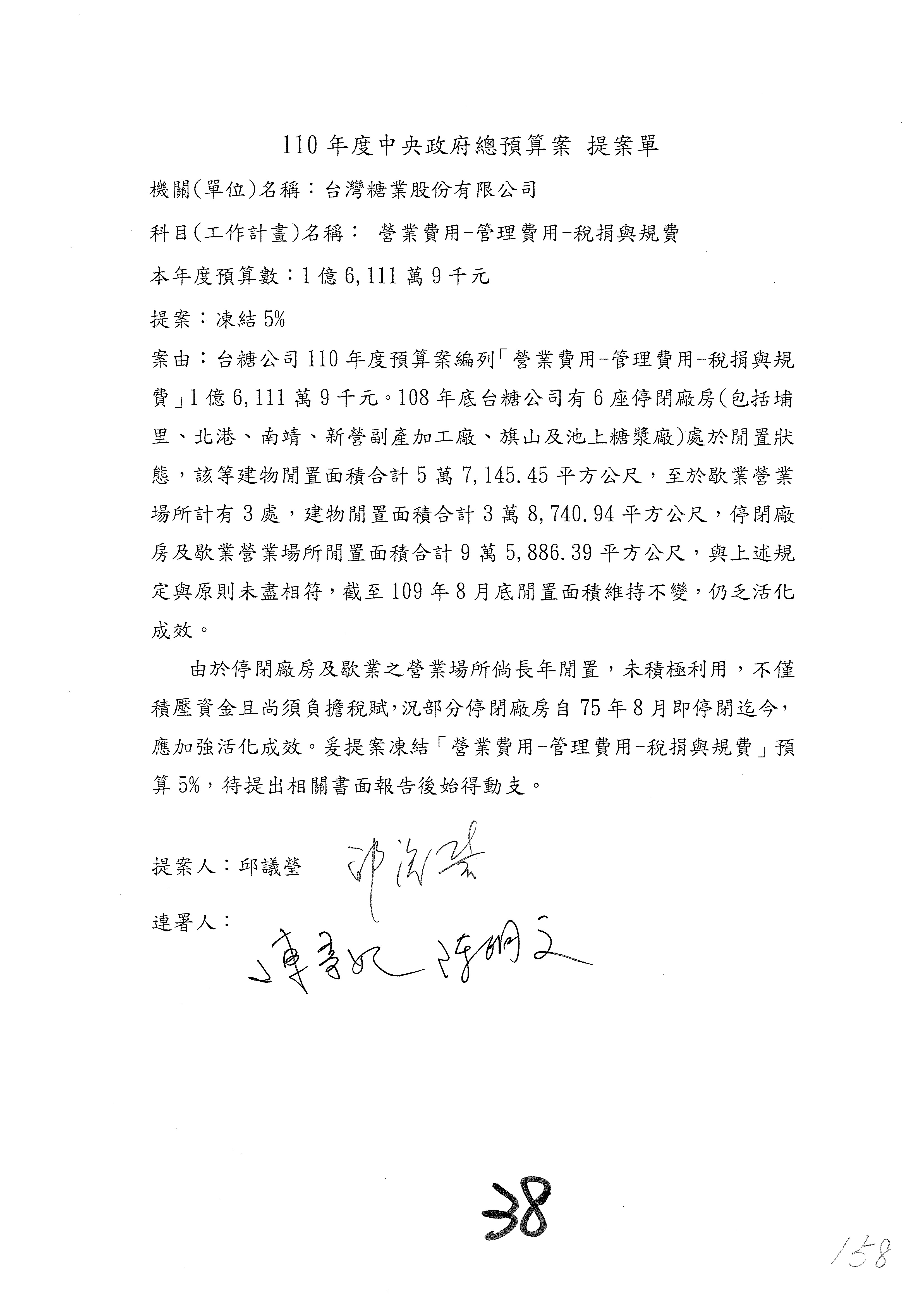 主席:台糖公司預算提案協商結論:第1案到第8案「營業收入」增列5,000萬元;第9案到第13案預算照列,其中第10案改主決議;第14案和第15案預算照列;第16案預算照列;第17案及第18案減列「水電費」1,000萬元,科目自行調整;第19案到第25案減列「旅運費」250萬元,科目自行調整;第26案預算照列;第27案至第33案預算照列;第34案到第40案預算照列;第41案到第50案「固定資產建設改良擴充」凍結5,000萬元,提出書面報告後始得動支;主決議第51案至第70案均照案通過;第71案倒數第三行「爰建請台糖公司」之後的「於符合農委會」5個字修正為「配合農委會政策於」,其餘均照案通過;第72案句中「總投資金額7,652萬元」之後修正為「計畫110年10月正式營運,為避免工程延宕影響當地觀光產業,台糖公司宜委託交通部鐵路局代為設計及施工,爰提案要求台糖公司應落實工程進度管理。」;第73案末句刪除「並提供……。」等文字;第74案、第75案與第75-1案均照案通過。