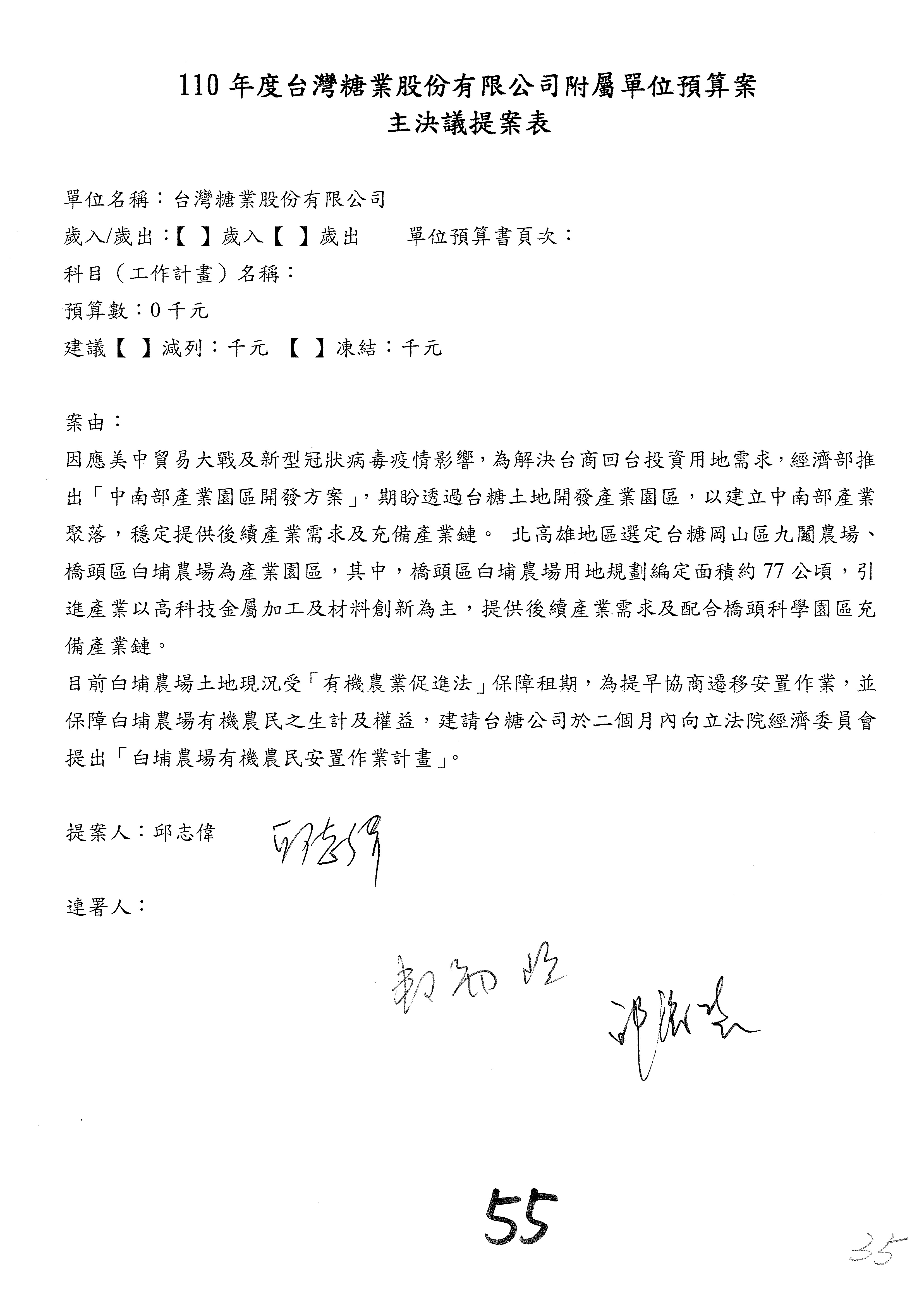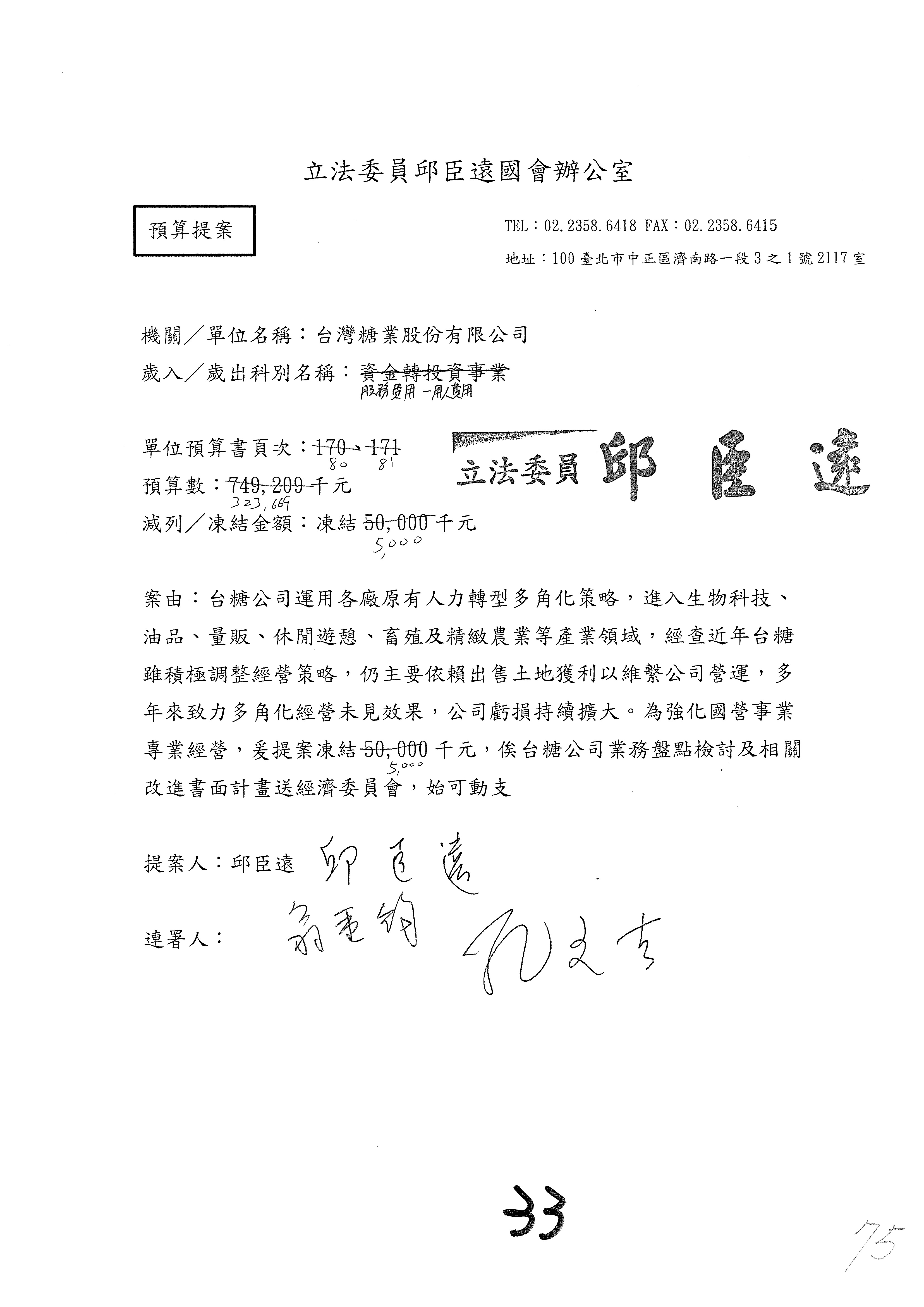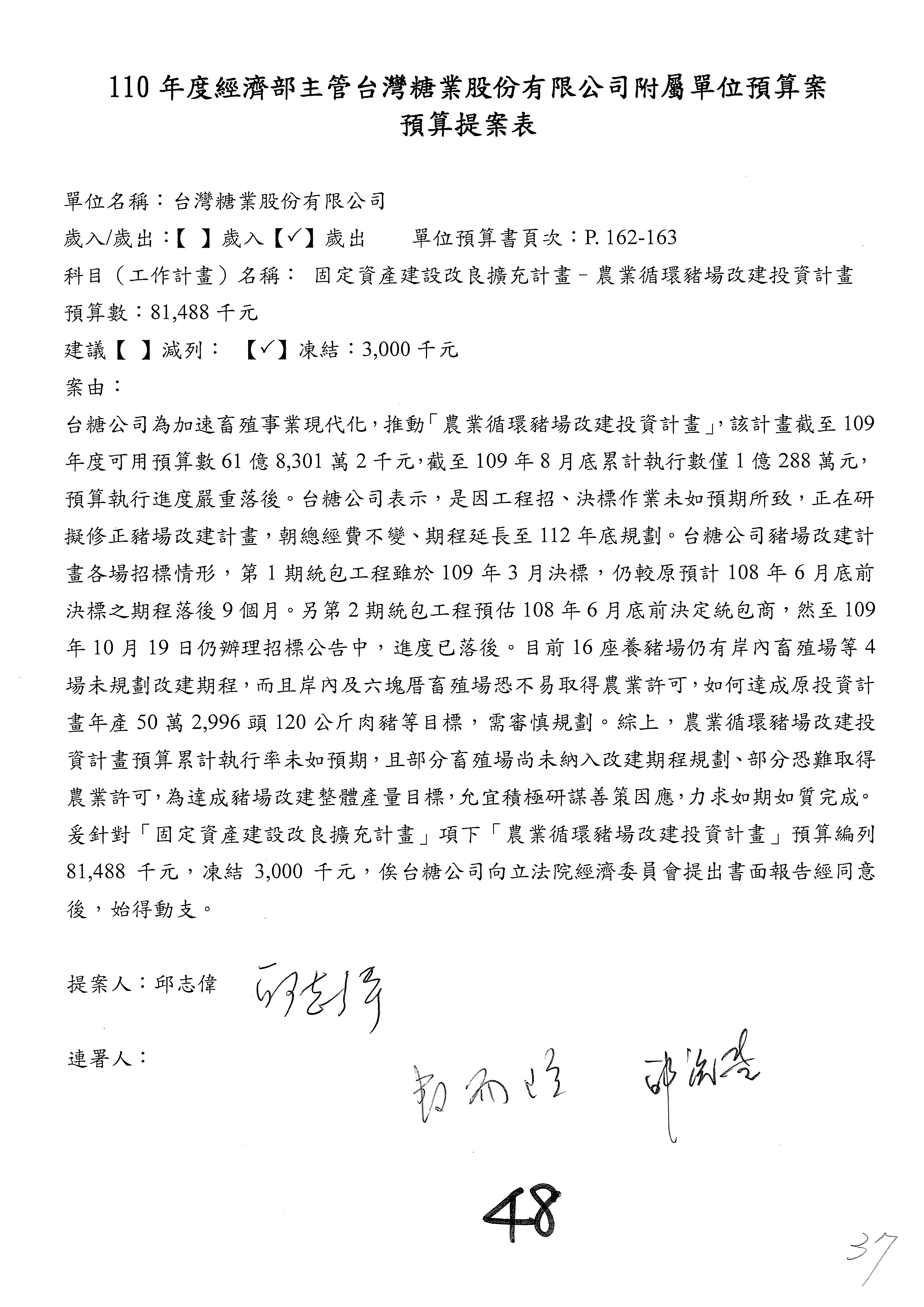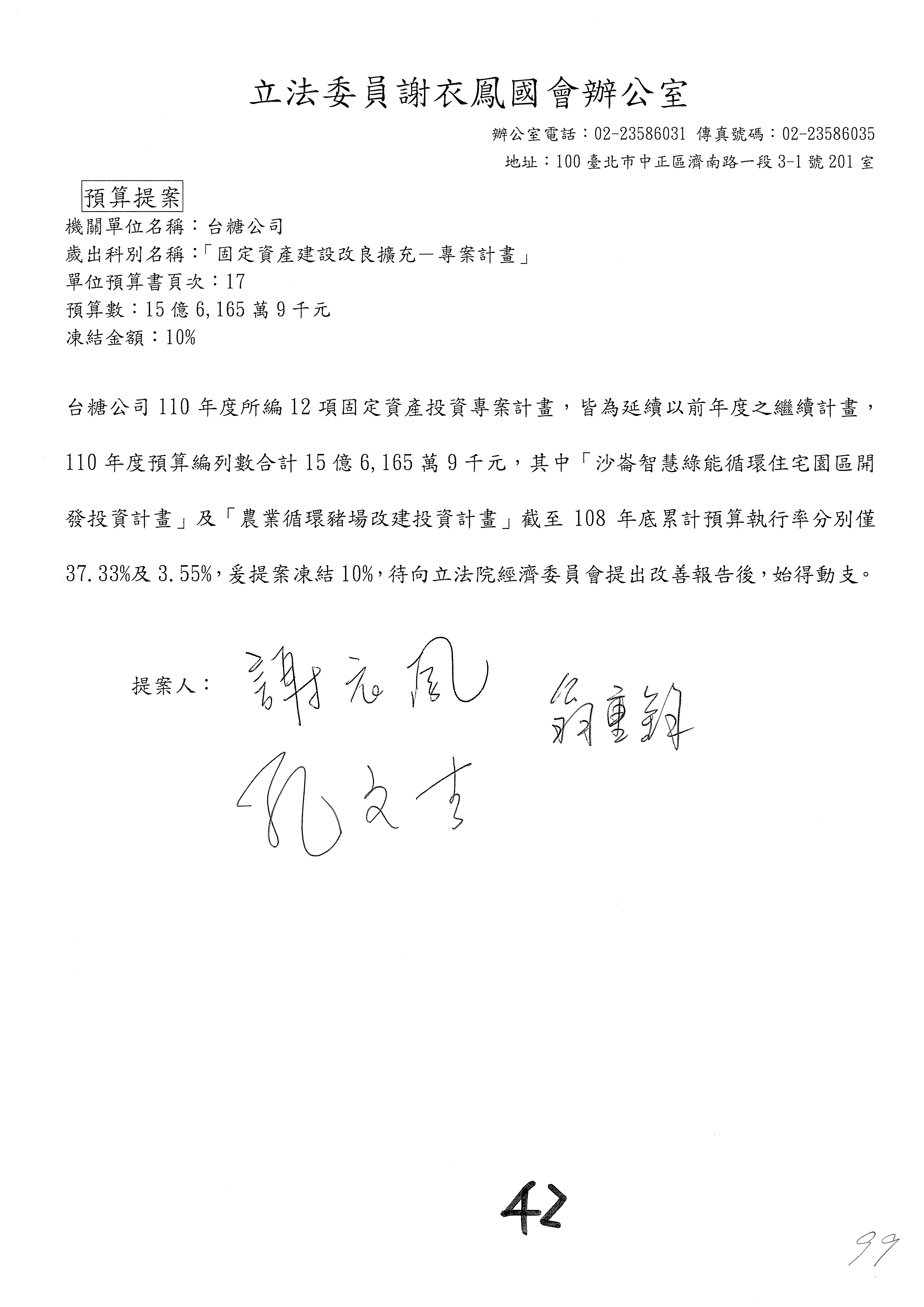 主席:台糖公司預算提案協商結論:第1案到第8案「營業收入」增列5,000萬元;第9案到第13案預算照列,其中第10案改主決議;第14案和第15案預算照列;第16案預算照列;第17案及第18案減列「水電費」1,000萬元,科目自行調整;第19案到第25案減列「旅運費」250萬元,科目自行調整;第26案預算照列;第27案至第33案預算照列;第34案到第40案預算照列;第41案到第50案「固定資產建設改良擴充」凍結5,000萬元,提出書面報告後始得動支;主決議第51案至第70案均照案通過;第71案倒數第三行「爰建請台糖公司」之後的「於符合農委會」5個字修正為「配合農委會政策於」,其餘均照案通過;第72案句中「總投資金額7,652萬元」之後修正為「計畫110年10月正式營運,為避免工程延宕影響當地觀光產業,台糖公司宜委託交通部鐵路局代為設計及施工,爰提案要求台糖公司應落實工程進度管理。」;第73案末句刪除「並提供……。」等文字;第74案、第75案與第75-1案均照案通過。