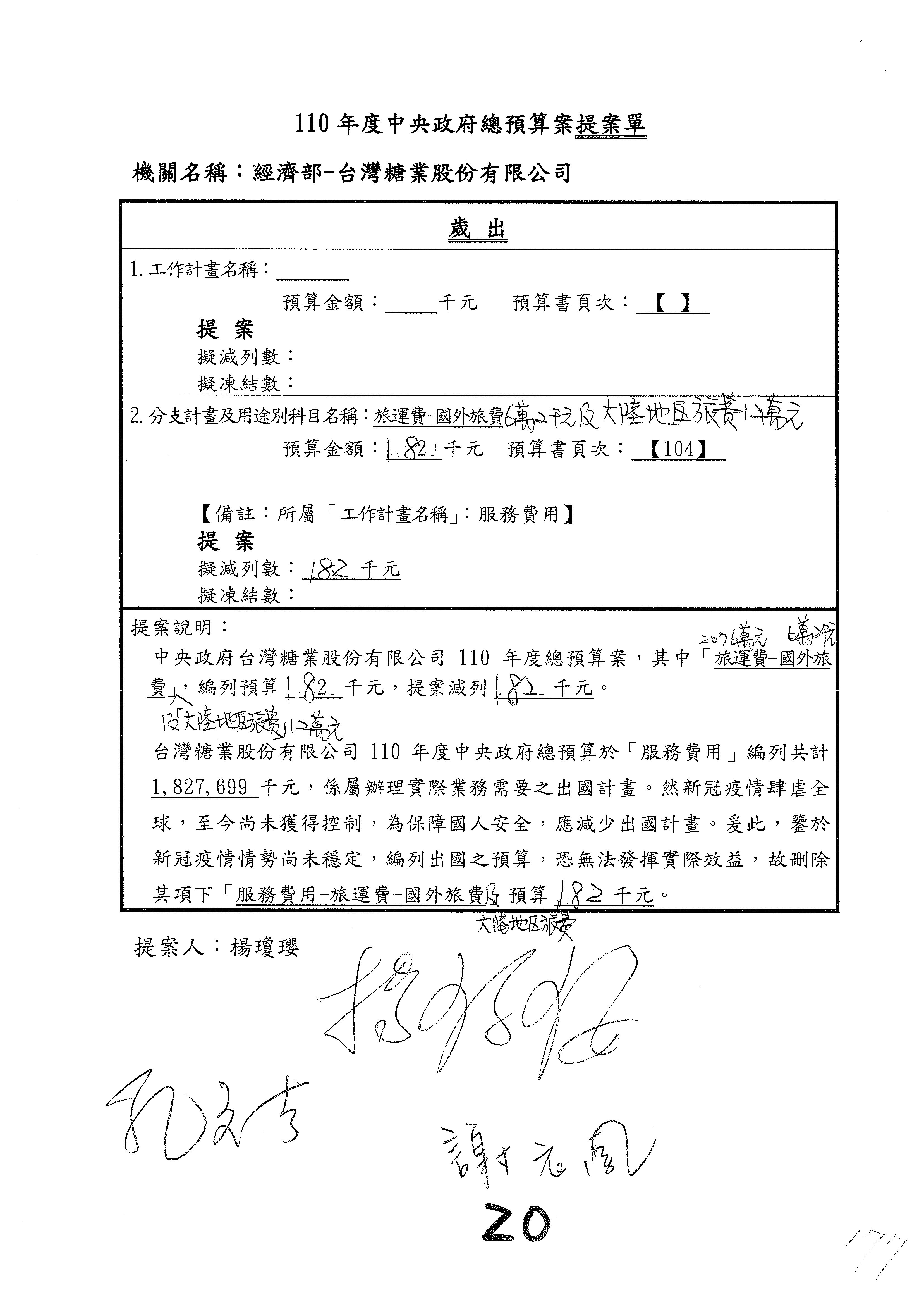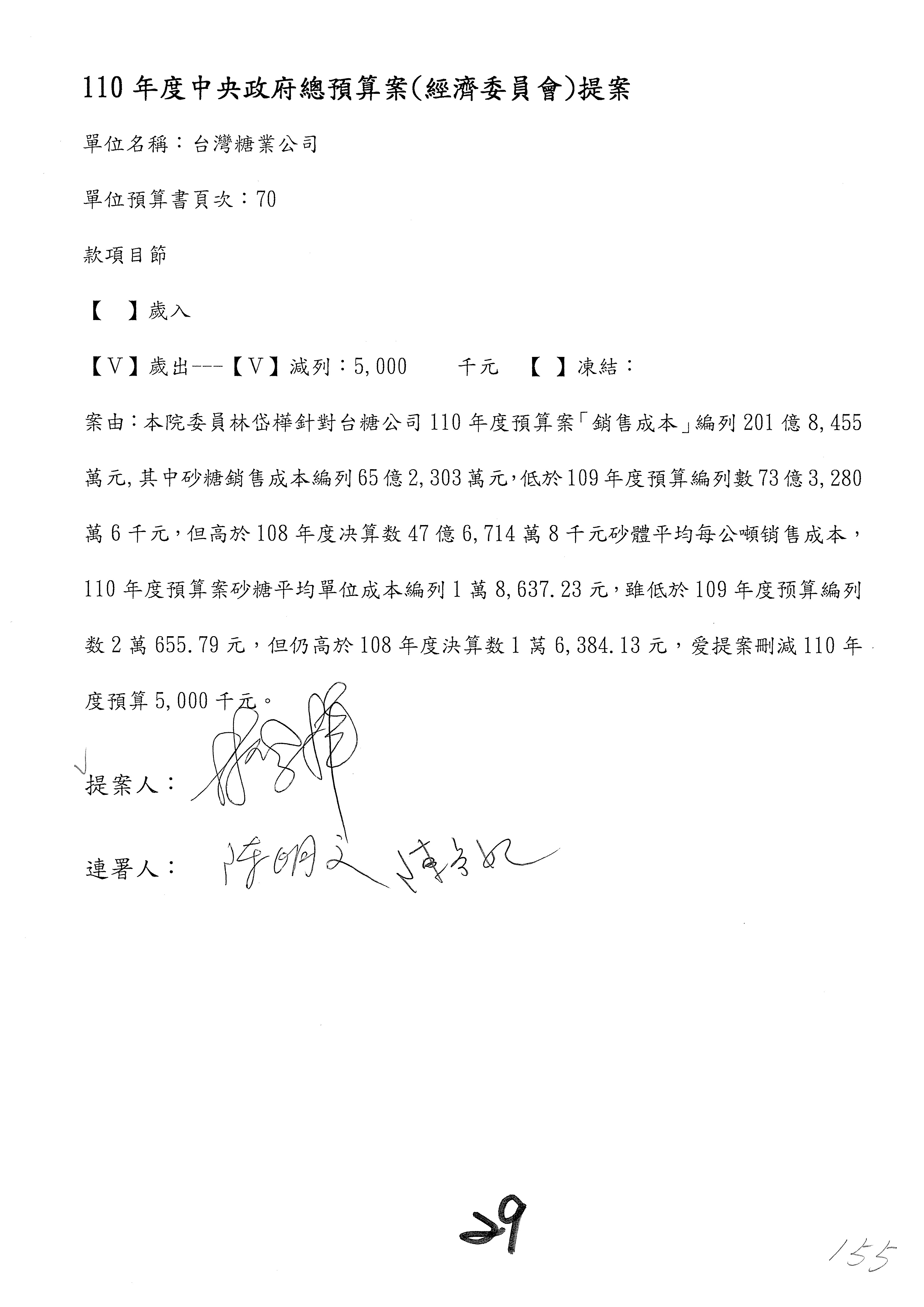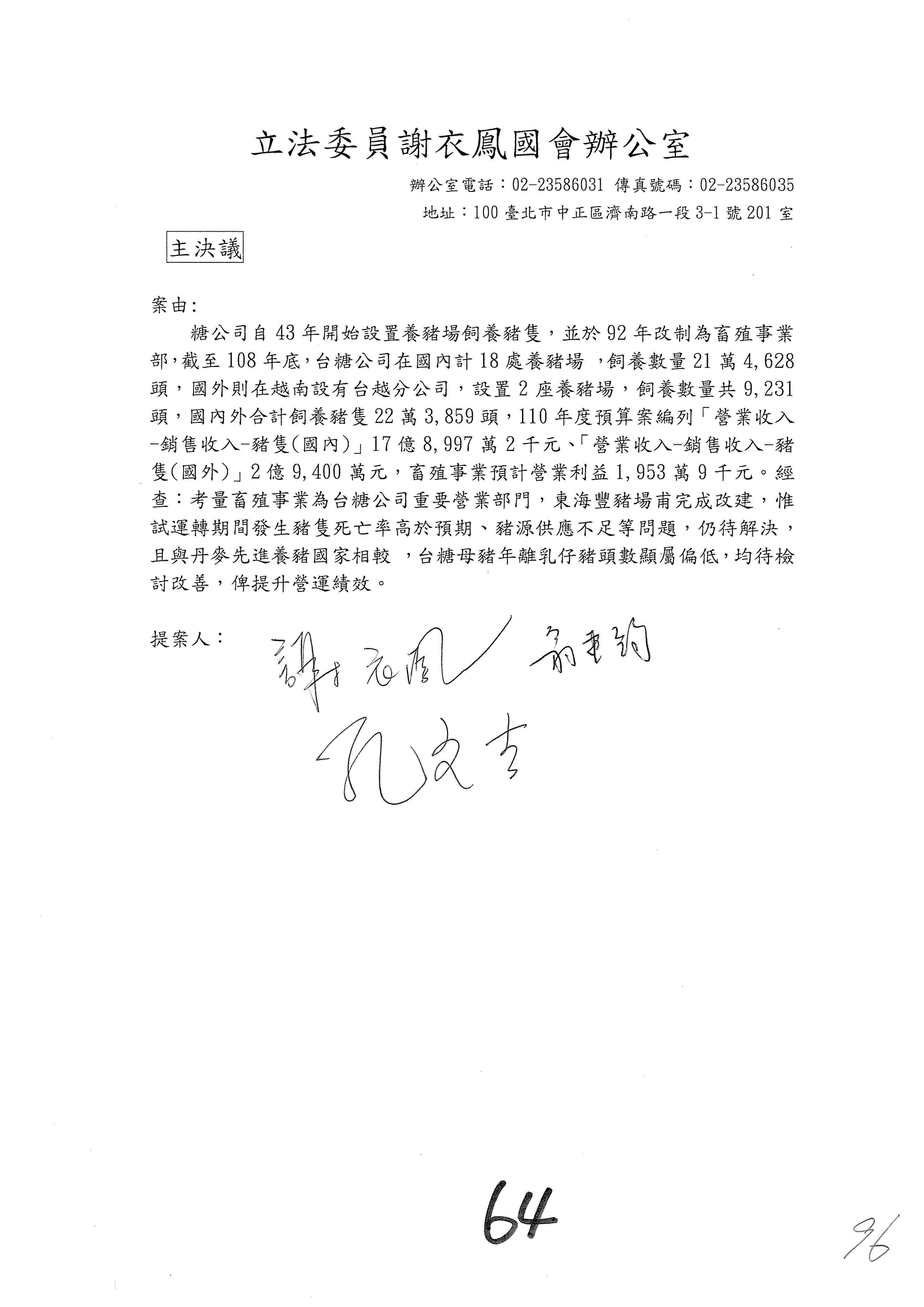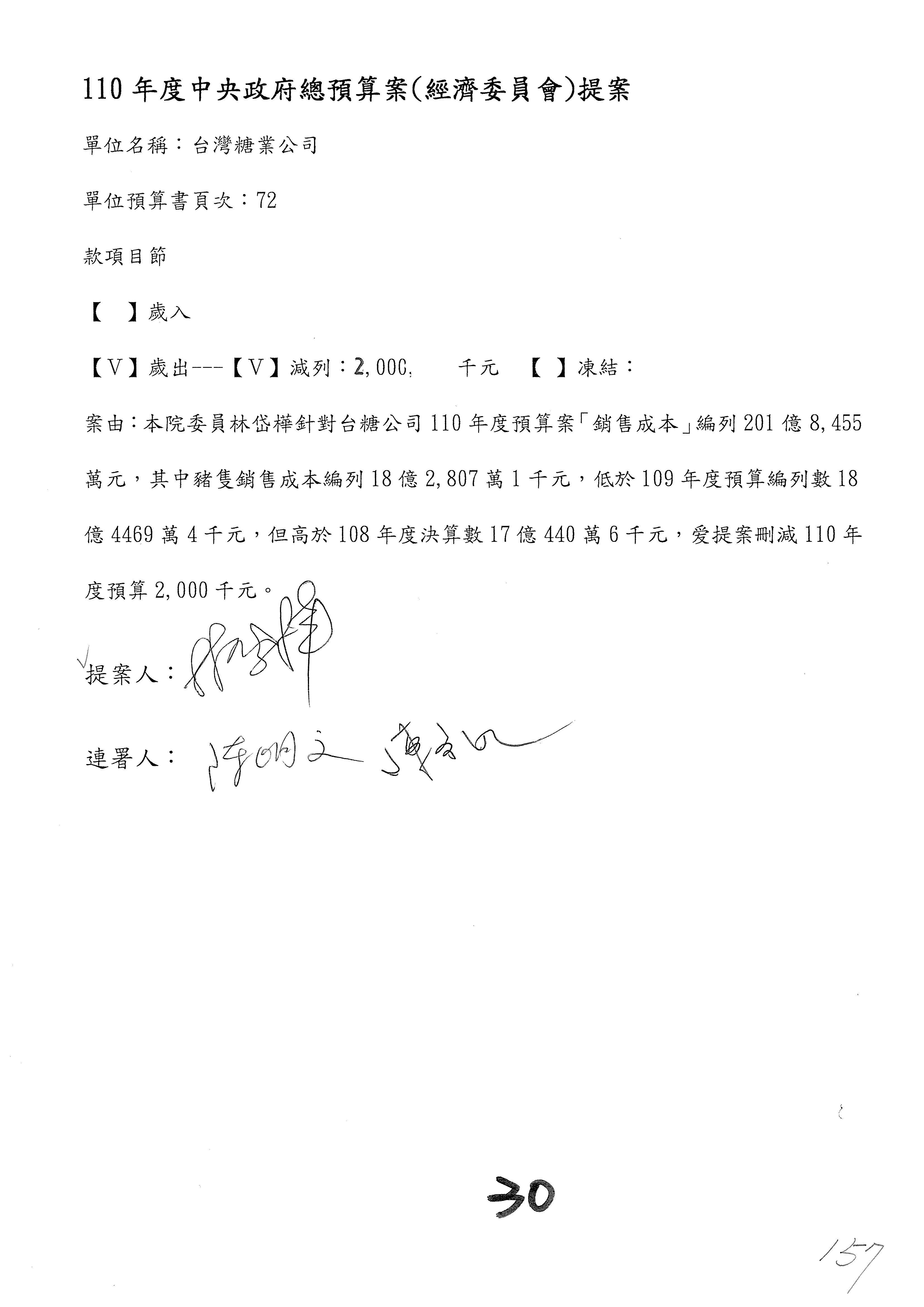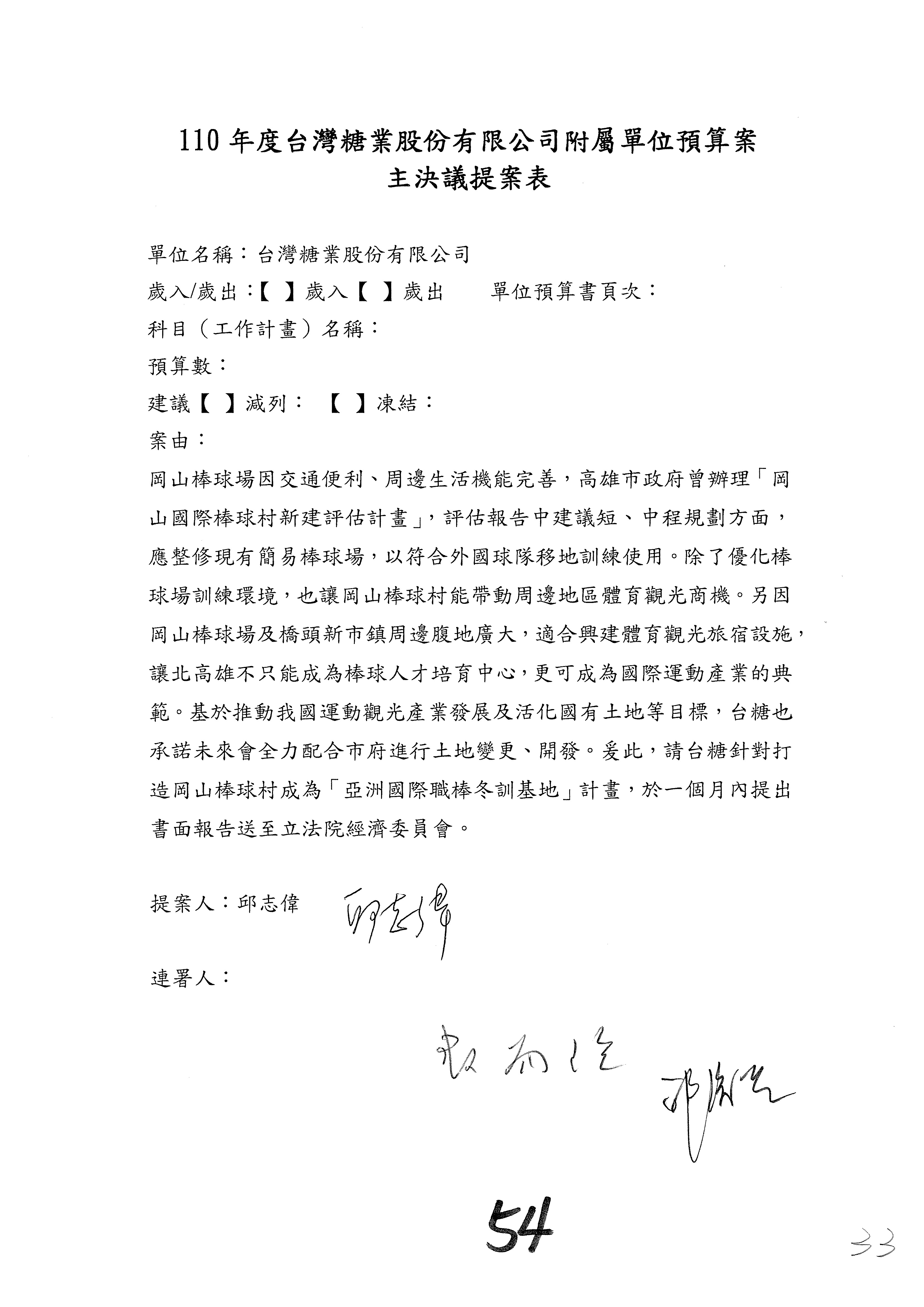 主席:台糖公司預算提案協商結論:第1案到第8案「營業收入」增列5,000萬元;第9案到第13案預算照列,其中第10案改主決議;第14案和第15案預算照列;第16案預算照列;第17案及第18案減列「水電費」1,000萬元,科目自行調整;第19案到第25案減列「旅運費」250萬元,科目自行調整;第26案預算照列;第27案至第33案預算照列;第34案到第40案預算照列;第41案到第50案「固定資產建設改良擴充」凍結5,000萬元,提出書面報告後始得動支;主決議第51案至第70案均照案通過;第71案倒數第三行「爰建請台糖公司」之後的「於符合農委會」5個字修正為「配合農委會政策於」,其餘均照案通過;第72案句中「總投資金額7,652萬元」之後修正為「計畫110年10月正式營運,為避免工程延宕影響當地觀光產業,台糖公司宜委託交通部鐵路局代為設計及施工,爰提案要求台糖公司應落實工程進度管理。」;第73案末句刪除「並提供……。」等文字;第74案、第75案與第75-1案均照案通過。