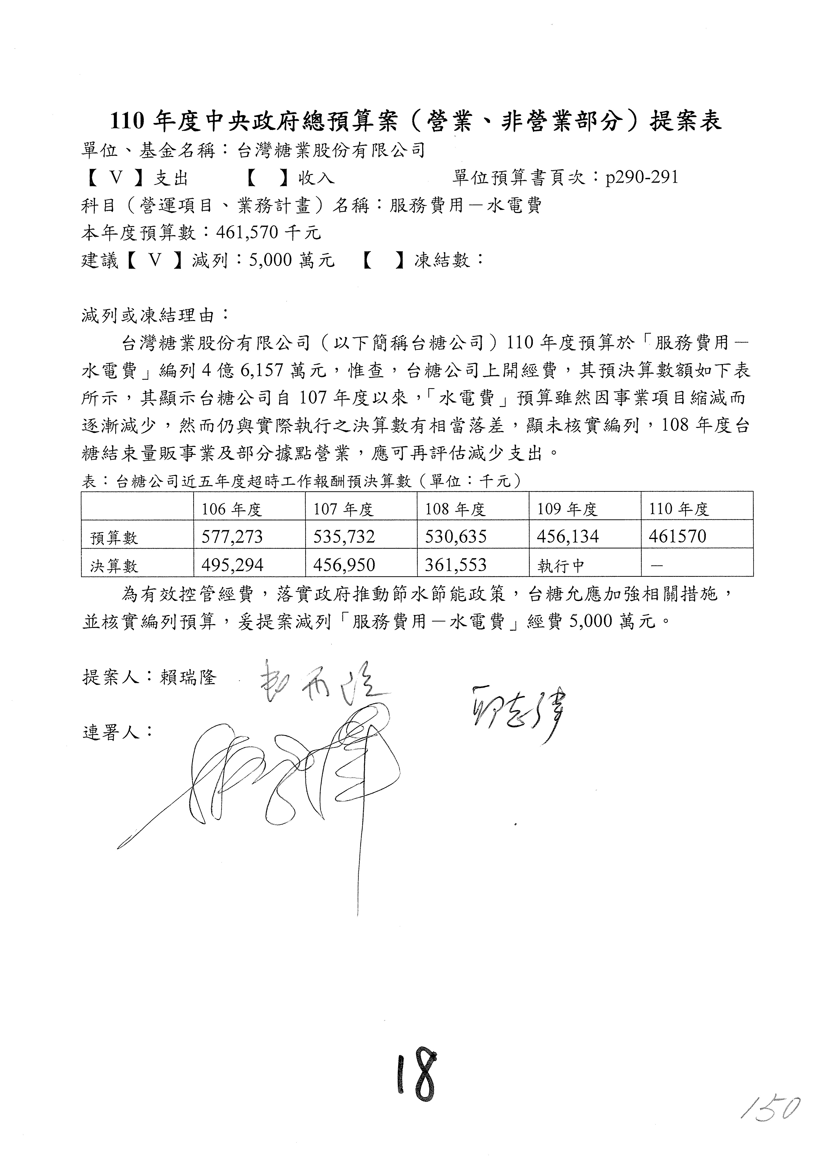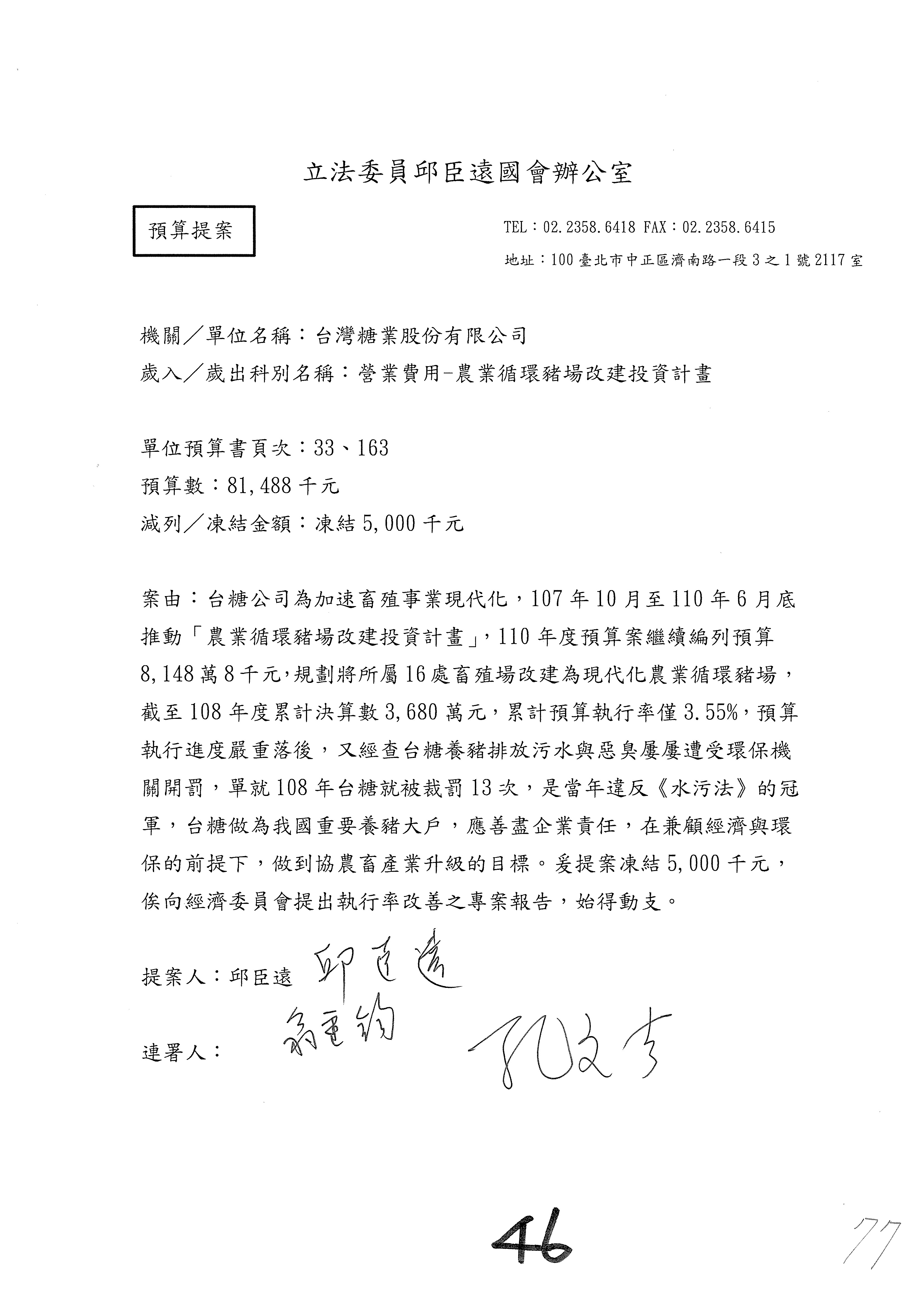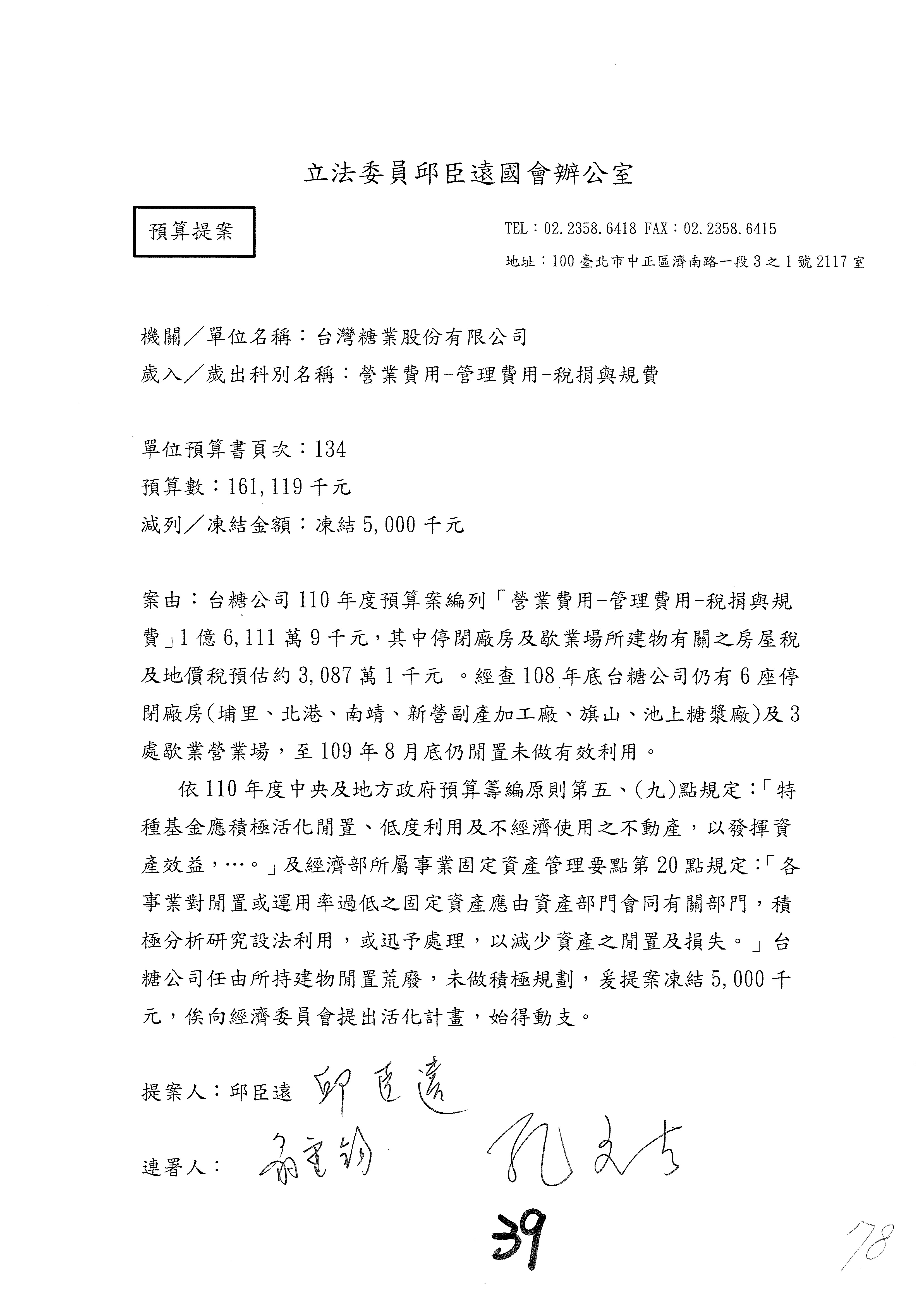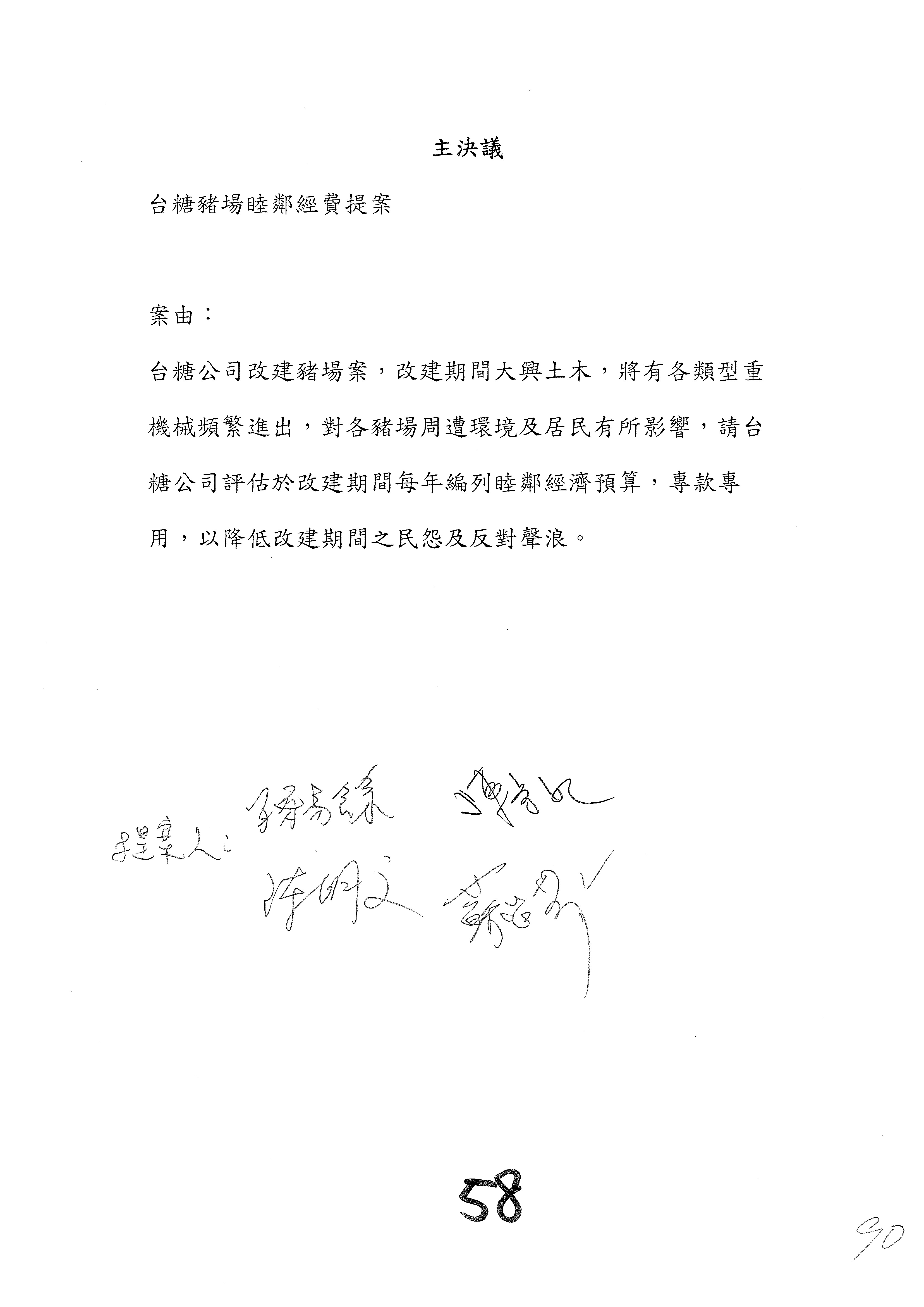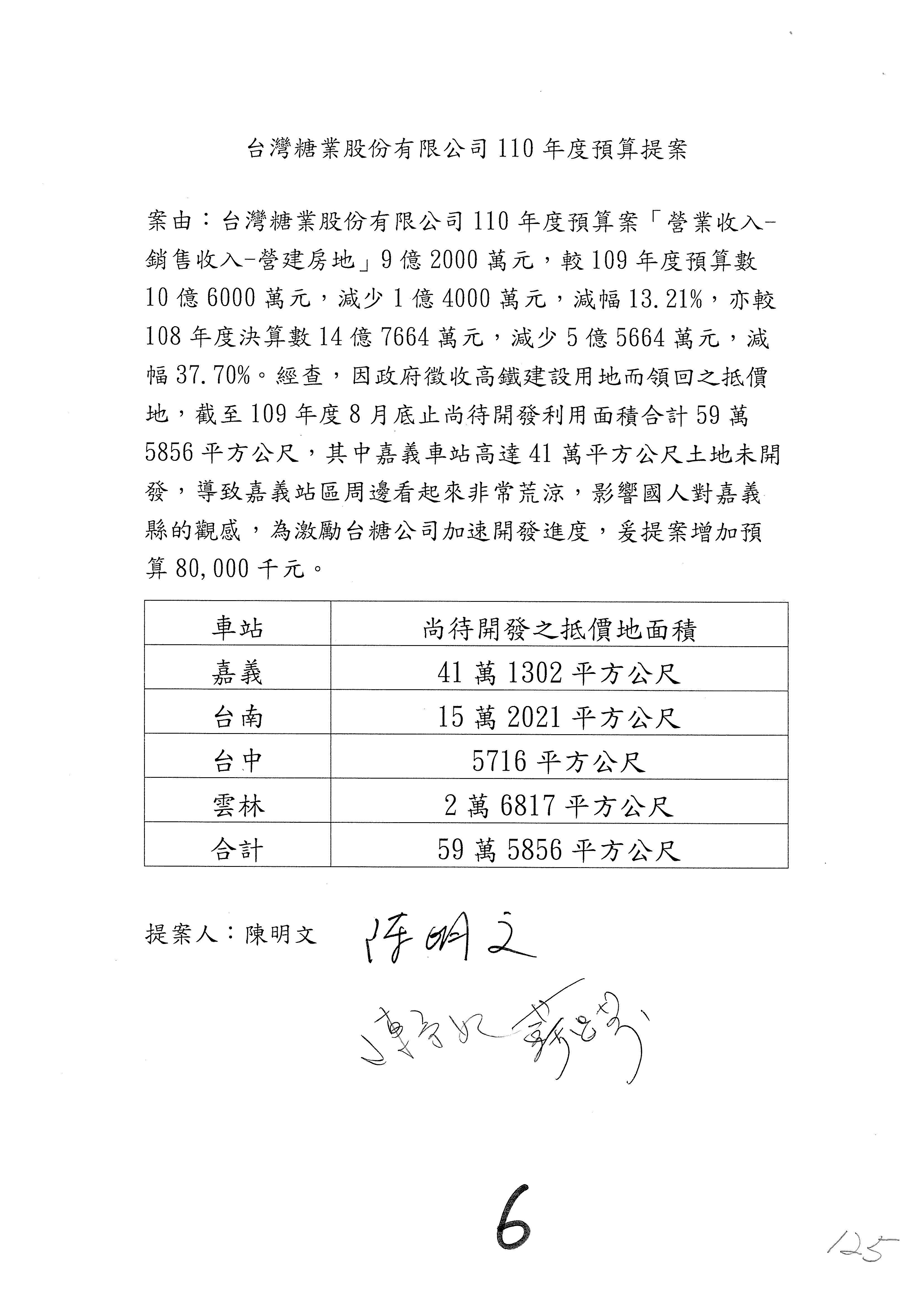 主席:台糖公司預算提案協商結論:第1案到第8案「營業收入」增列5,000萬元;第9案到第13案預算照列,其中第10案改主決議;第14案和第15案預算照列;第16案預算照列;第17案及第18案減列「水電費」1,000萬元,科目自行調整;第19案到第25案減列「旅運費」250萬元,科目自行調整;第26案預算照列;第27案至第33案預算照列;第34案到第40案預算照列;第41案到第50案「固定資產建設改良擴充」凍結5,000萬元,提出書面報告後始得動支;主決議第51案至第70案均照案通過;第71案倒數第三行「爰建請台糖公司」之後的「於符合農委會」5個字修正為「配合農委會政策於」,其餘均照案通過;第72案句中「總投資金額7,652萬元」之後修正為「計畫110年10月正式營運,為避免工程延宕影響當地觀光產業,台糖公司宜委託交通部鐵路局代為設計及施工,爰提案要求台糖公司應落實工程進度管理。」;第73案末句刪除「並提供……。」等文字;第74案、第75案與第75-1案均照案通過。