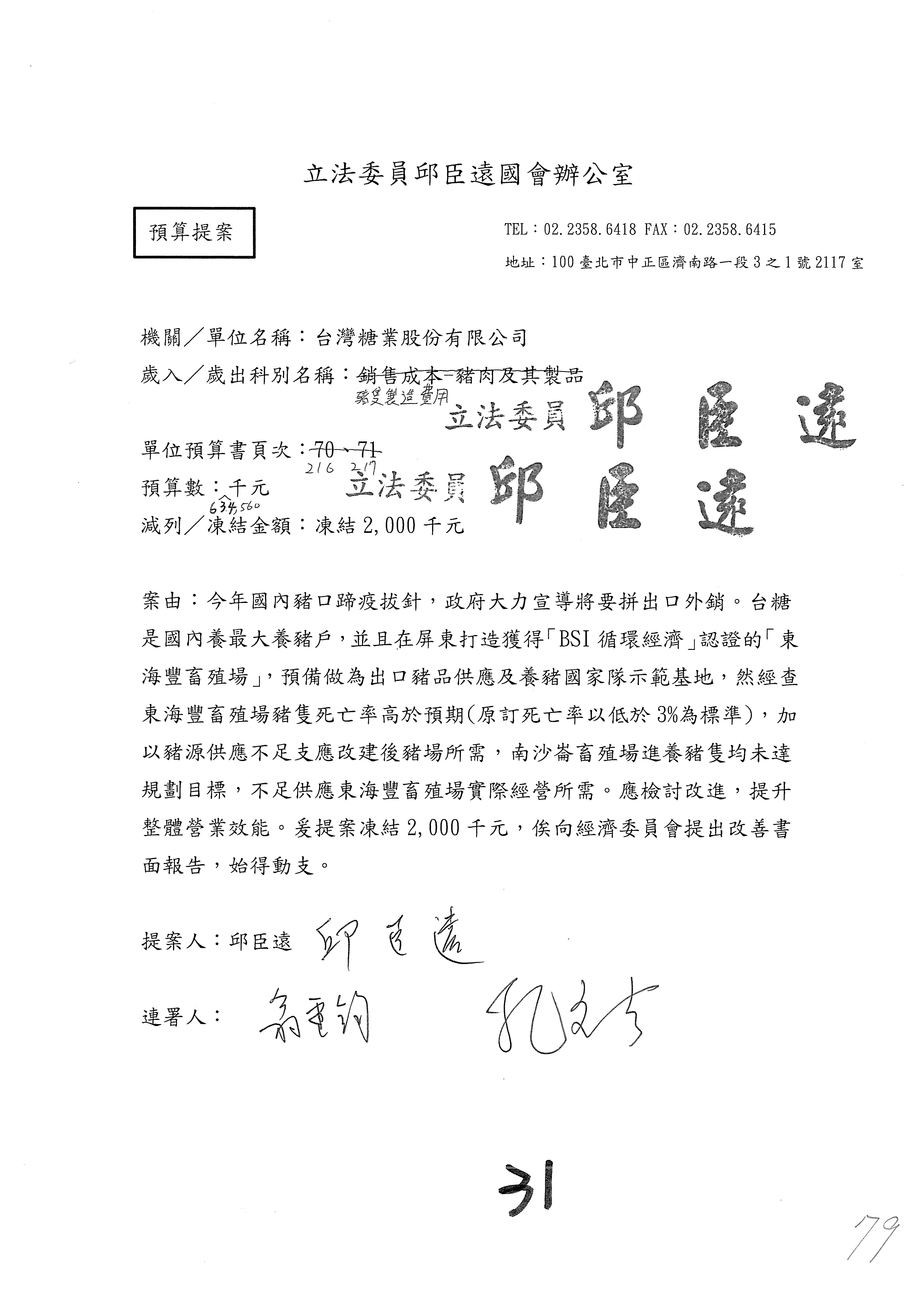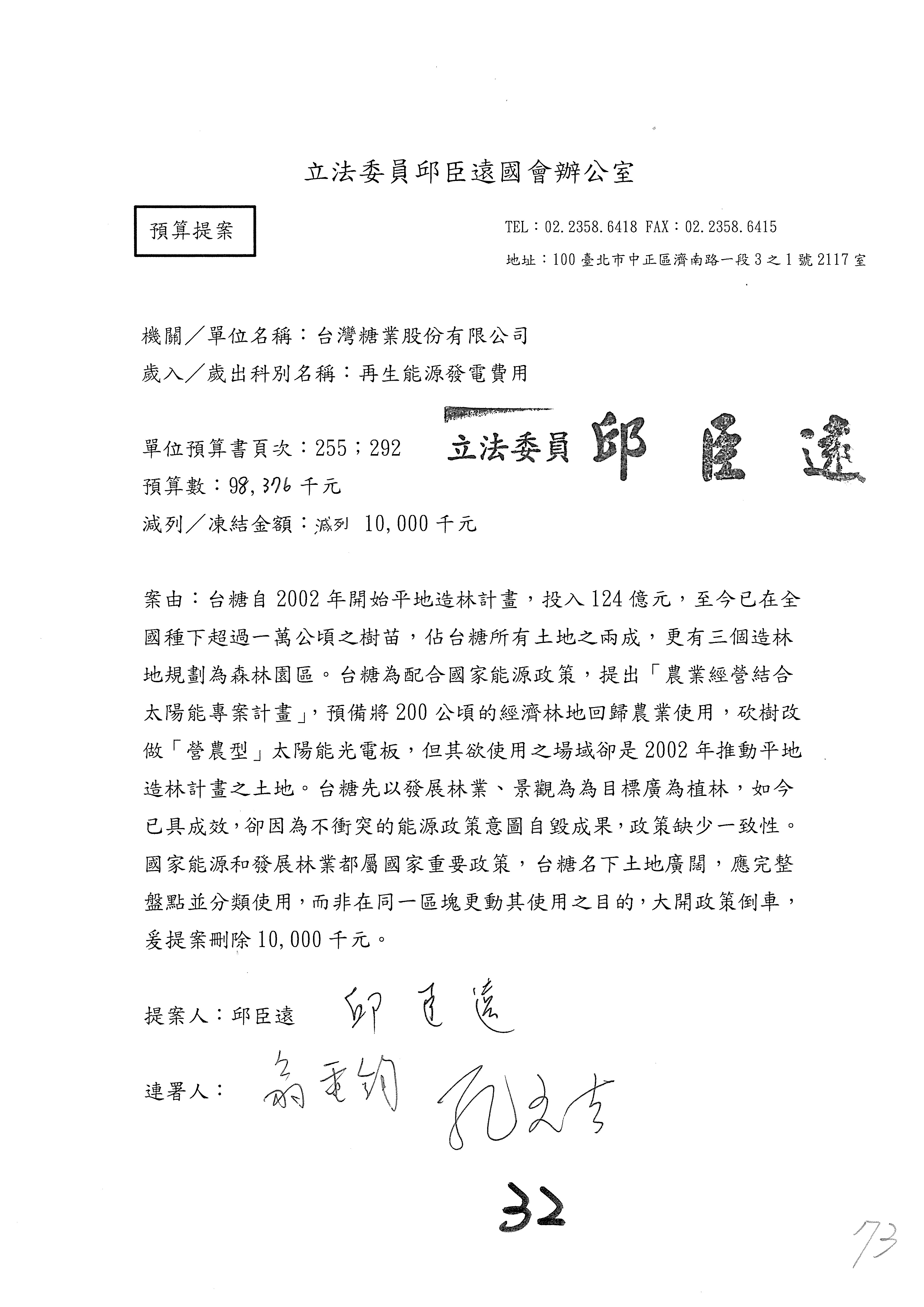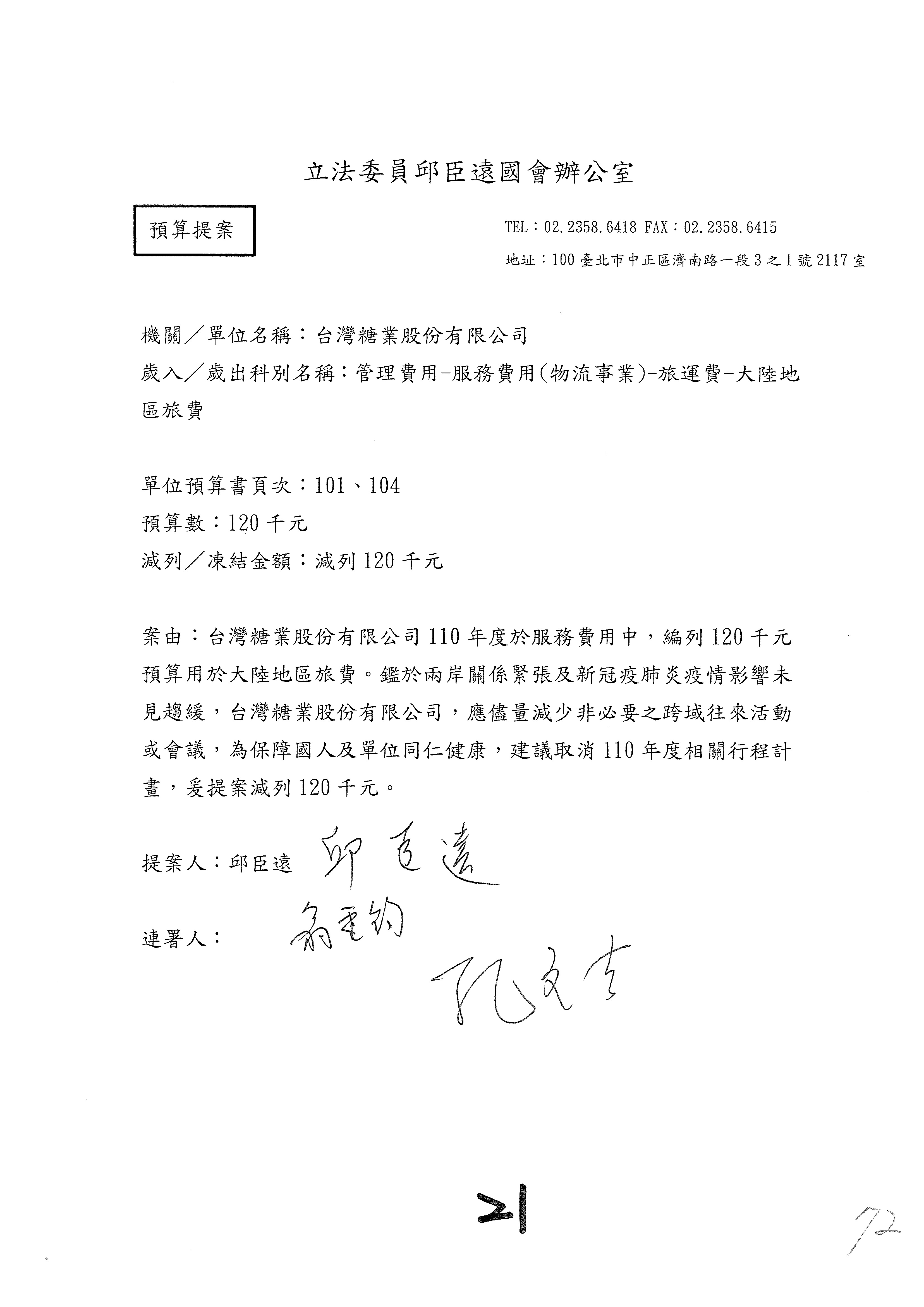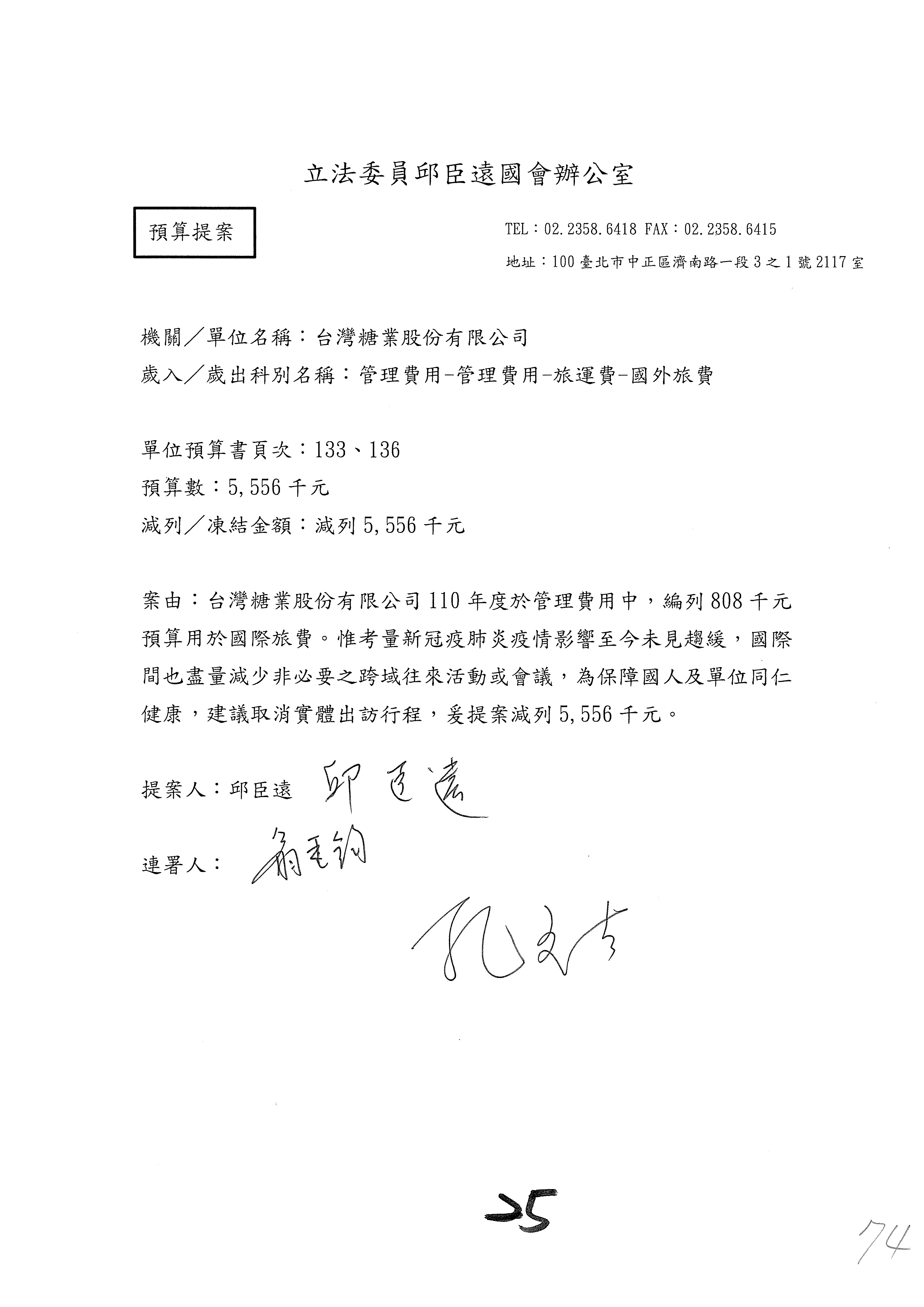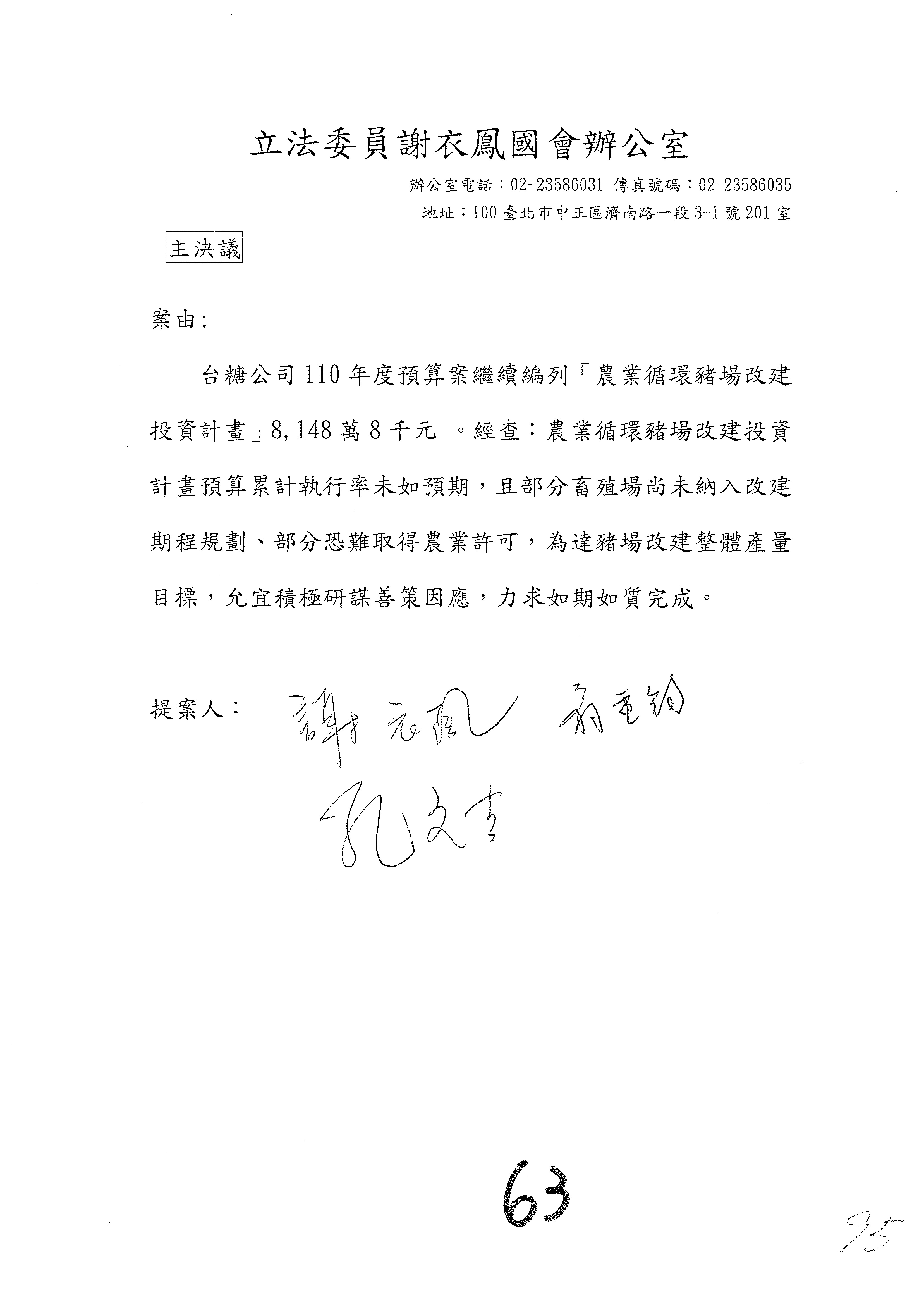 主席:台糖公司預算提案協商結論:第1案到第8案「營業收入」增列5,000萬元;第9案到第13案預算照列,其中第10案改主決議;第14案和第15案預算照列;第16案預算照列;第17案及第18案減列「水電費」1,000萬元,科目自行調整;第19案到第25案減列「旅運費」250萬元,科目自行調整;第26案預算照列;第27案至第33案預算照列;第34案到第40案預算照列;第41案到第50案「固定資產建設改良擴充」凍結5,000萬元,提出書面報告後始得動支;主決議第51案至第70案均照案通過;第71案倒數第三行「爰建請台糖公司」之後的「於符合農委會」5個字修正為「配合農委會政策於」,其餘均照案通過;第72案句中「總投資金額7,652萬元」之後修正為「計畫110年10月正式營運,為避免工程延宕影響當地觀光產業,台糖公司宜委託交通部鐵路局代為設計及施工,爰提案要求台糖公司應落實工程進度管理。」;第73案末句刪除「並提供……。」等文字;第74案、第75案與第75-1案均照案通過。