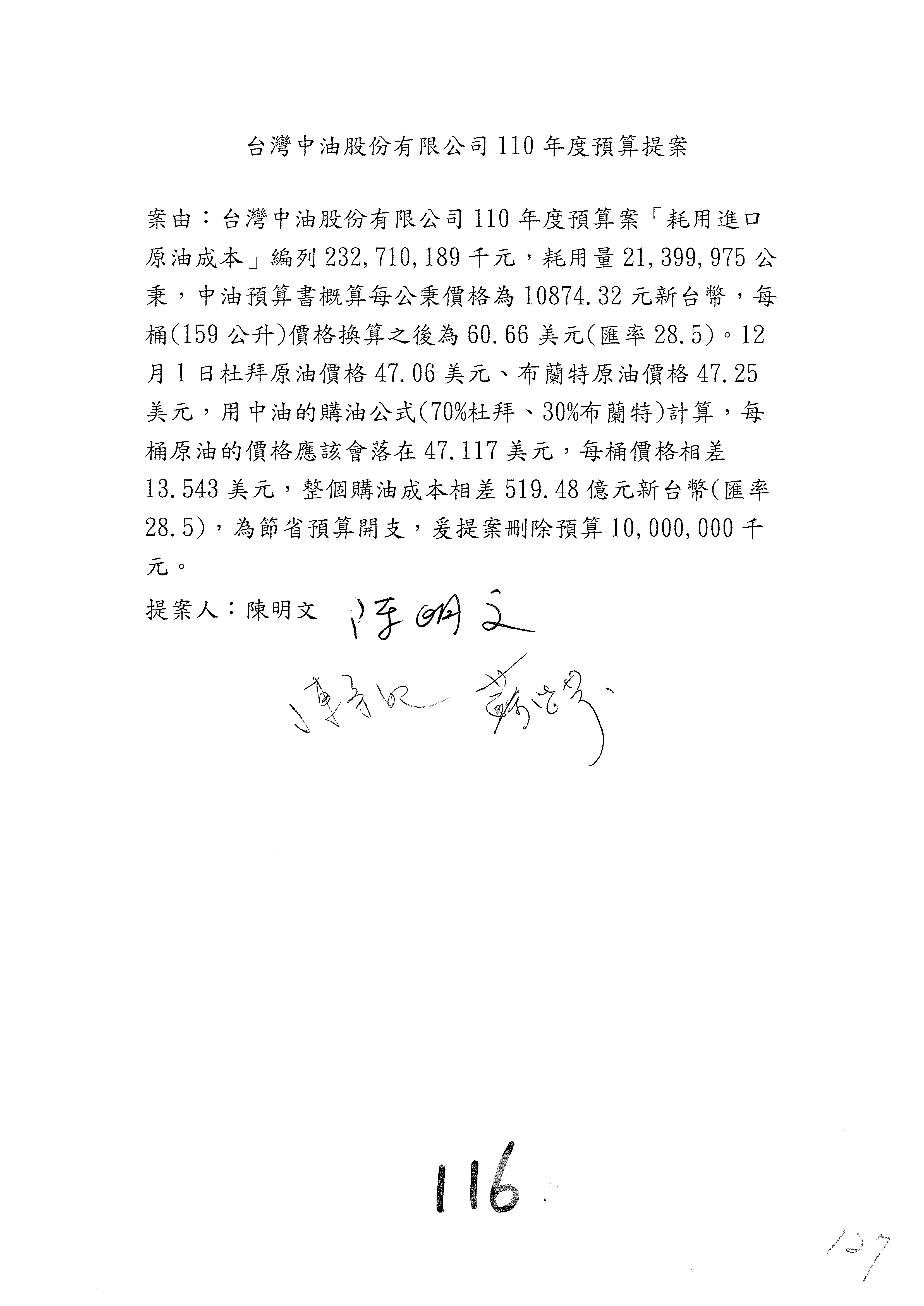 曾次長文生:第116案主要是油價估算的問題,銷貨收入和銷貨成本要同時減列,所以我們的估算是,如果FOB的價格少1美元的話,就約減列60億元;如果把估算做得保守一點,以52元計算的話,銷貨成本和銷貨收入就是各減列120億元。