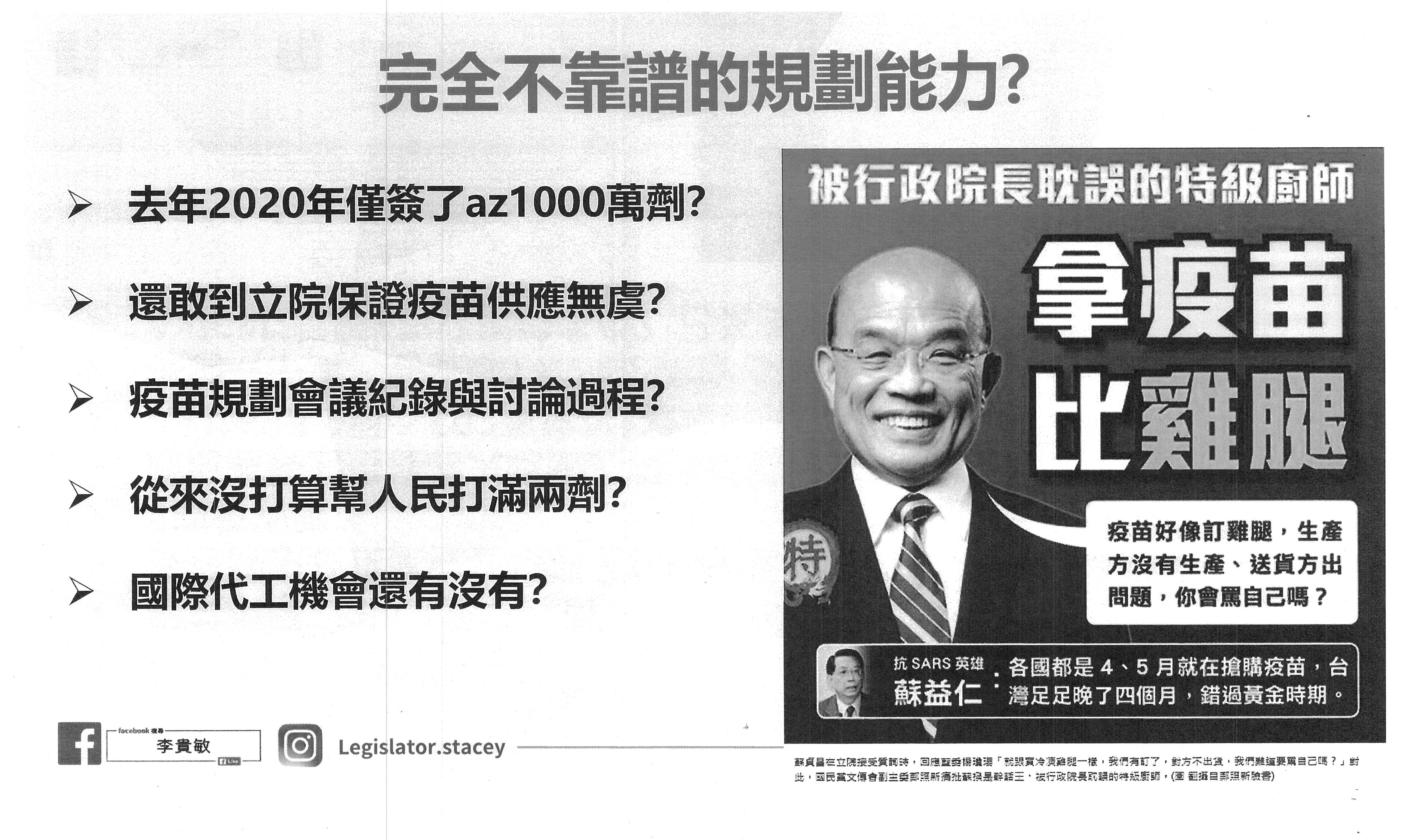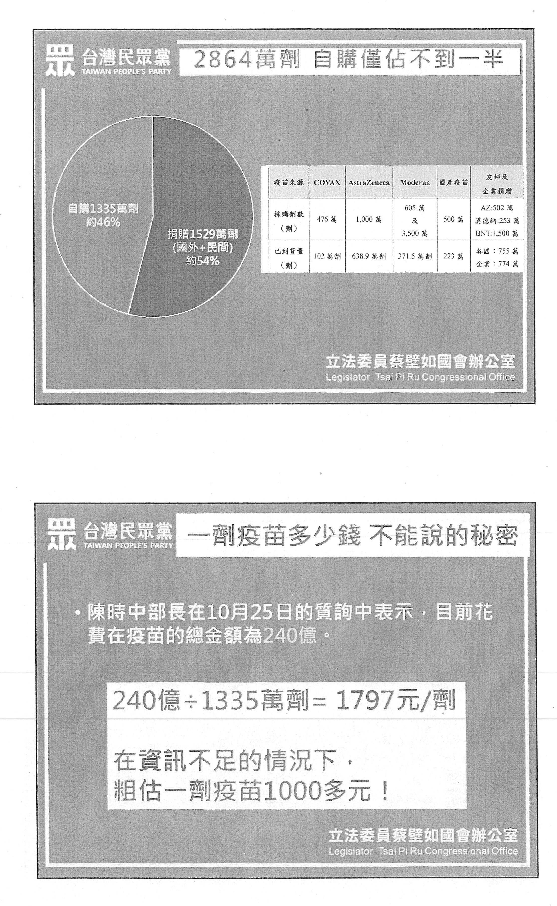 疫苗整備情形部分,為強化國人群體免疫力並發揮防治效益,指揮中心採取國際投資、逕洽廠商購買及國內自製等多元方案同時進行,以期分散風險,儘速取得安全有效的COVID-19疫苗,並考量病毒變異情形,持續向國際疫苗廠洽購次世代疫苗,以因應未來疫情所需,採購量應該是足夠的。截至本年10月29日,疫苗透過COVAX平台採購476萬劑,透過多方管道與國外疫苗廠商洽購1,000萬劑AZ疫苗、605萬劑的Moderna疫苗,並於本年7月21日再與Moderna簽署2年共3,500萬劑COVID-19疫苗的供應合約,將於111年及112年分批供應基礎型與次世代追加型疫苗,以因應變異病毒株之威脅,同時加購100萬劑疫苗於本年第4季供應,以提供更多族群接種需求,與高端公司簽訂COVID-19疫苗500萬劑採購合約。