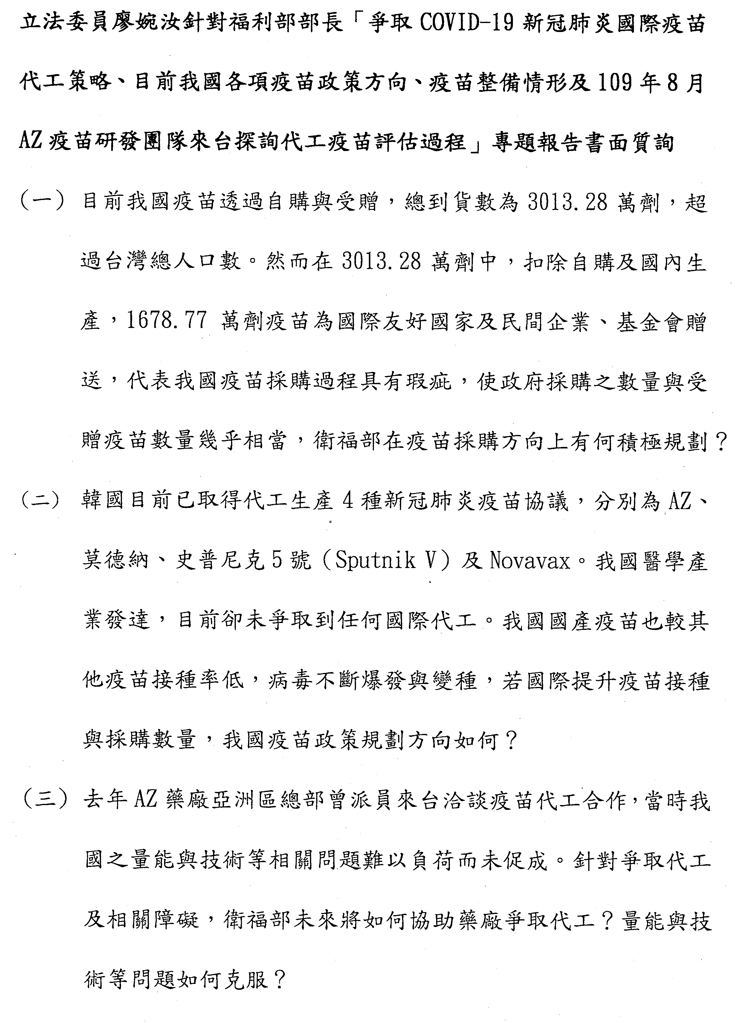 邀請衛生福利部部長針對「爭取COVID-19新冠肺炎國際疫苗代工策略、目前我國各項疫苗政策方向、疫苗整備情形及109年8月AZ疫苗研發團隊來台探詢代工疫苗評估過程」進行專題報告,並備質詢。