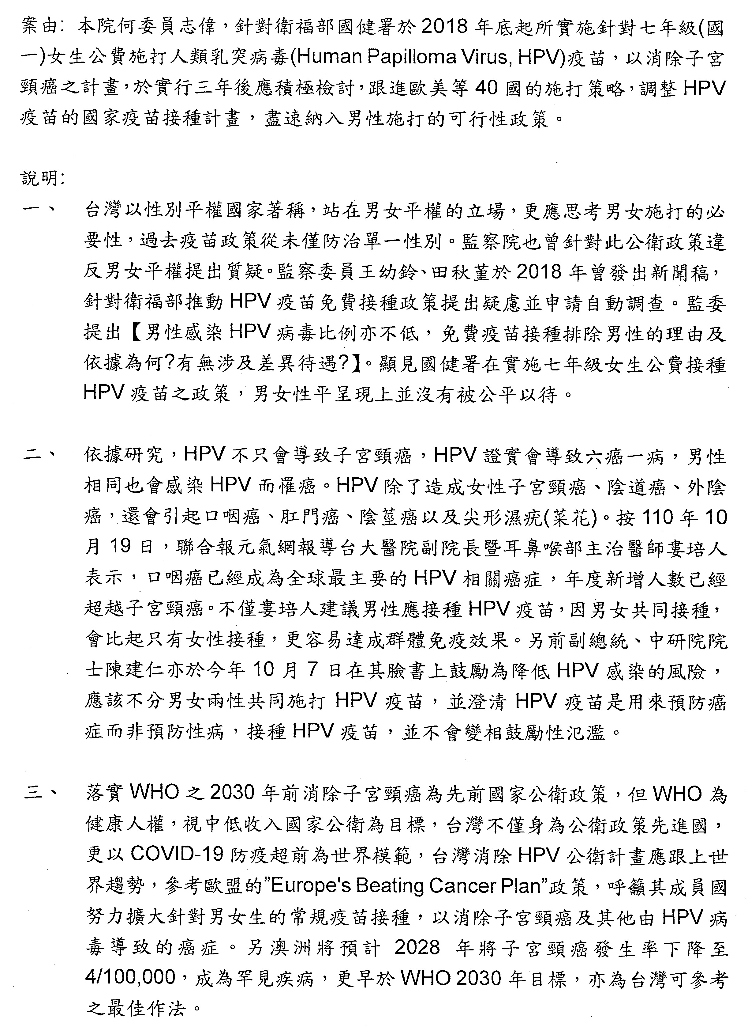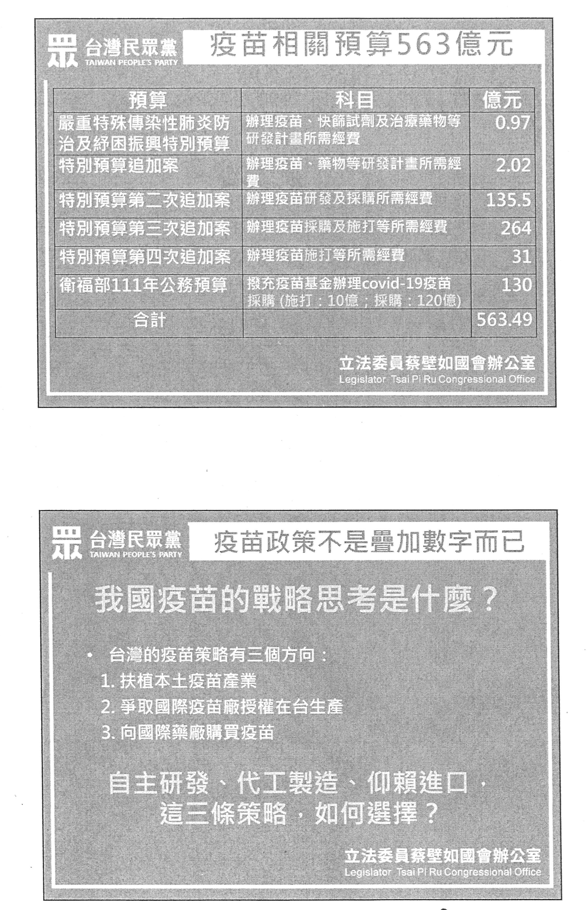 本部透過多元管道尋求研發自製、採購等疫苗整備的妥適方案,以確保COVID-19疫苗供應無虞,提升全民的健康。本部承大院各委員的指教及監督,在此敬致謝忱,希望各位委員繼續予以支持。以上報告。