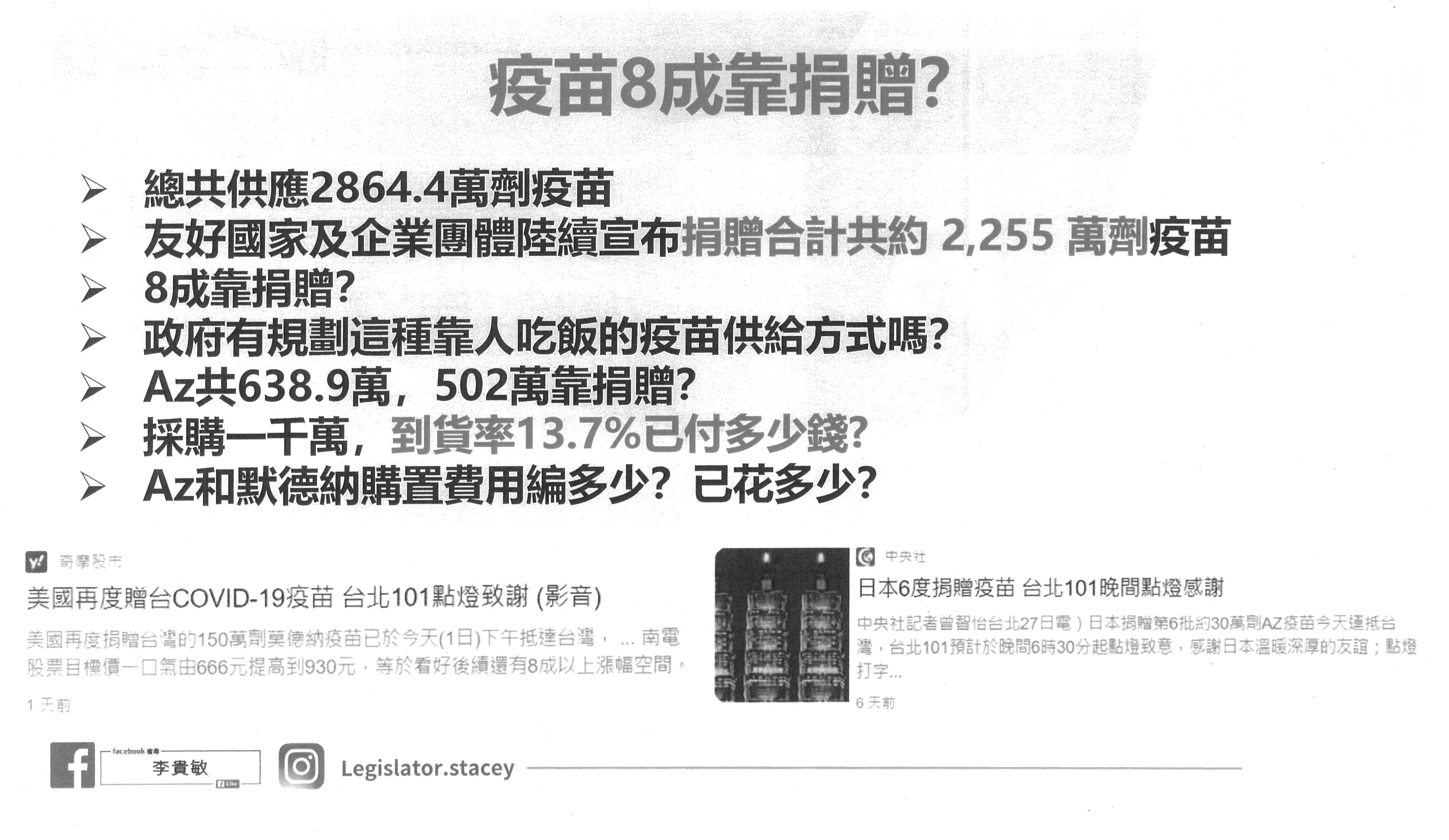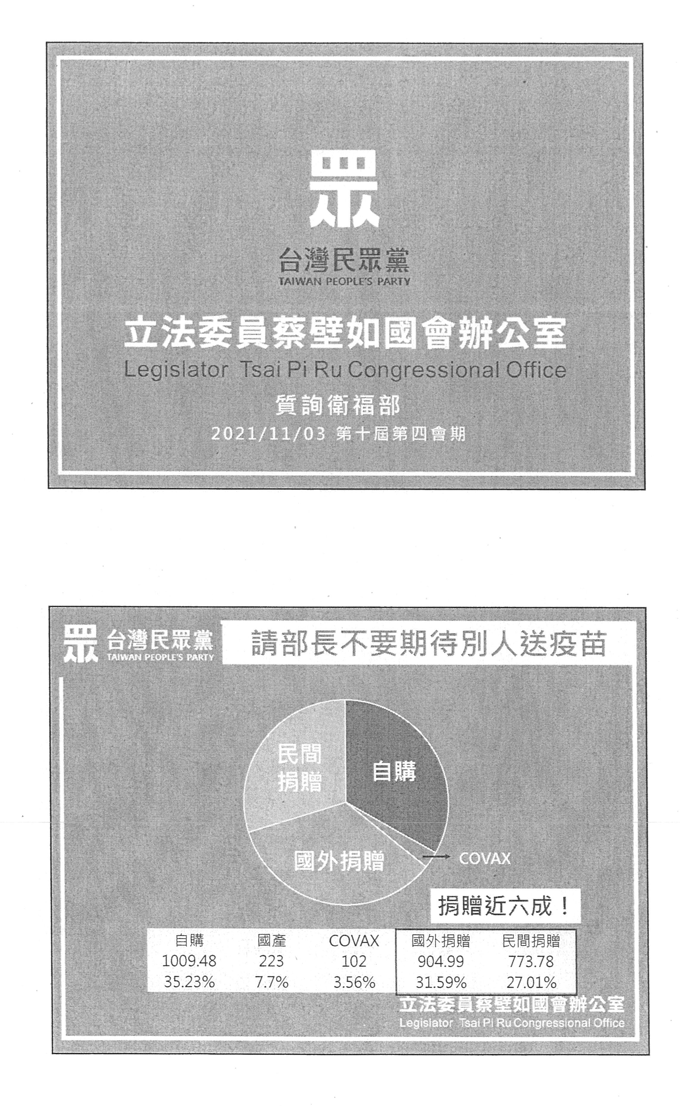 除上述自行採購的國內外疫苗,友好國家及企業團體亦陸續宣布捐贈疫苗共計2,405萬劑的疫苗,因昨天又新進了150萬劑,所以書面報告裡面應該是2,405萬劑。