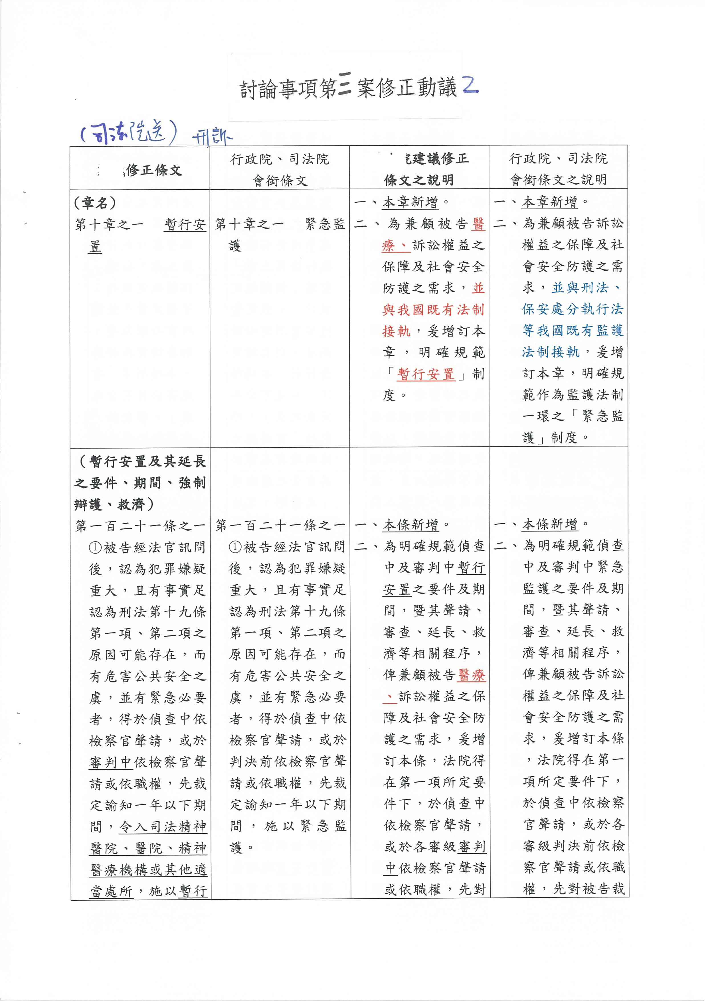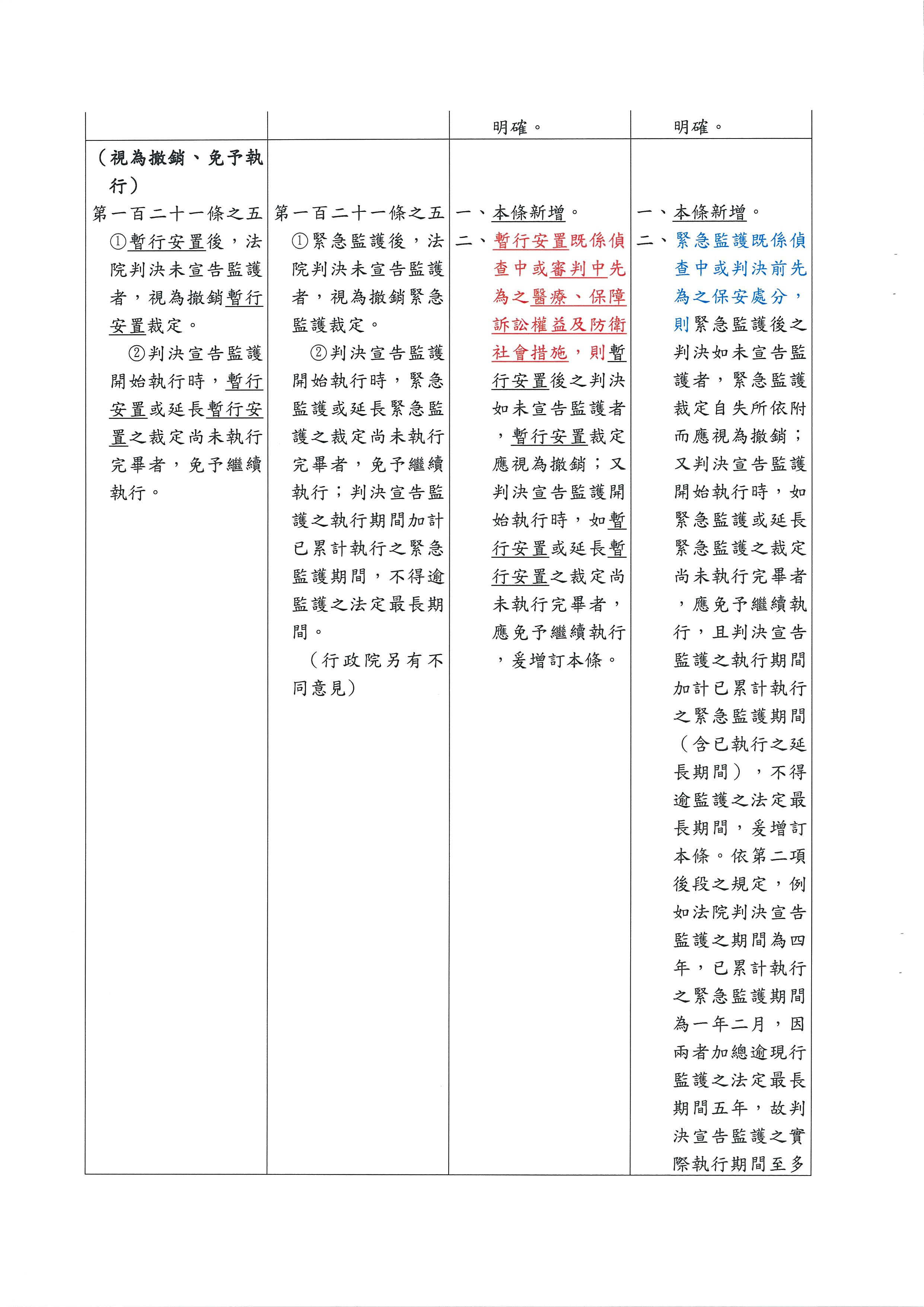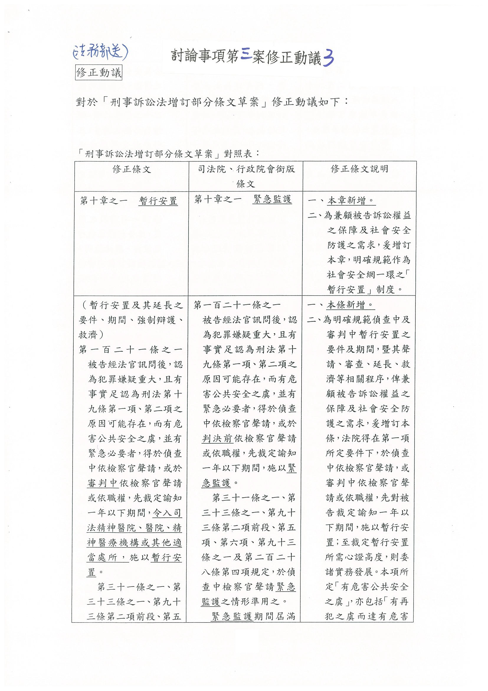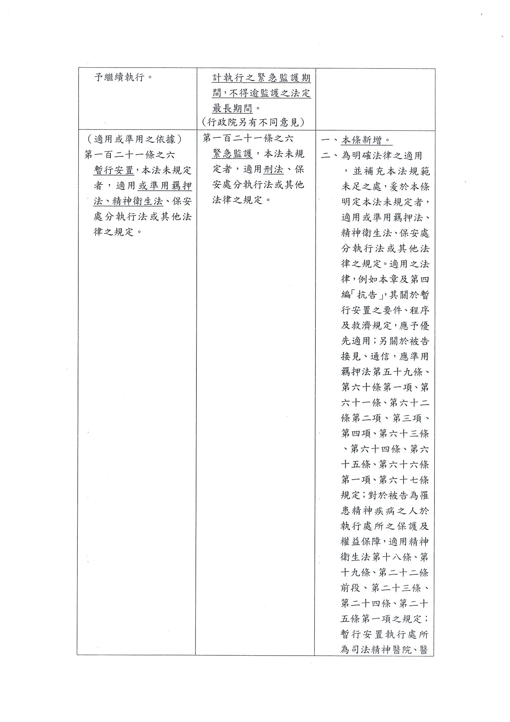 林秘書長輝煌:跟主席報告,如果在第一百二十一條之六法務部硬是要加羈押的條文,會讓我們整個要擱置定性的共識完全破滅,我們可能沒有辦法接受「暫行安置」的用語。