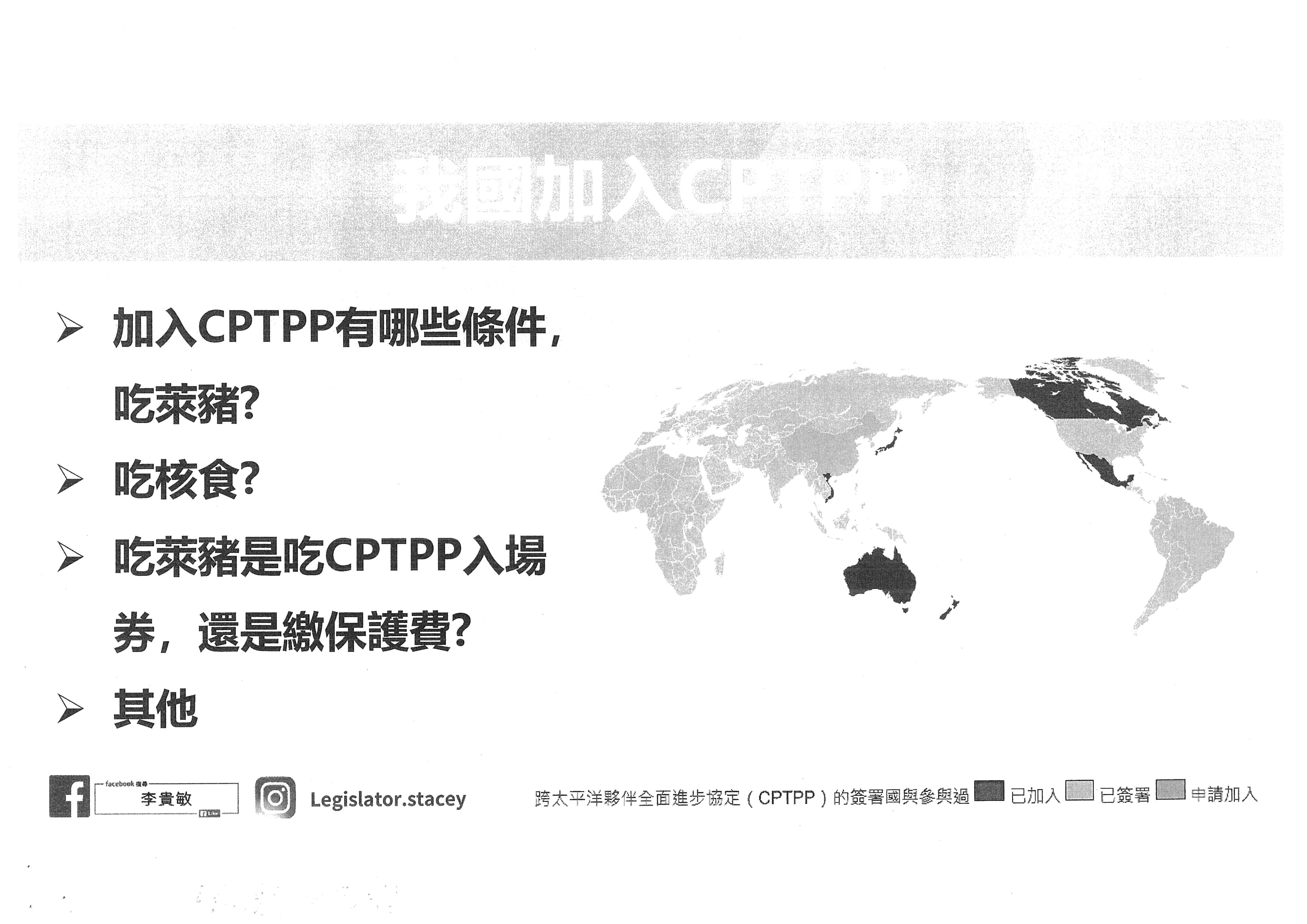 楊副總談判代表珍妮:第一個就是所謂含有萊劑的豬肉,這就是國際承諾的問題,至於日本食品則是未來要進入談判的問題,談判時首先要注意國民的健康、國際的標準與科學證據,並注意日本對相關規定有沒有嚴格把關。兩者雖與食安有關,但在進入CPTPP的本質上是有一點區隔的,因為進口含有萊劑的豬肉是我們老早就在國際間做的承諾。