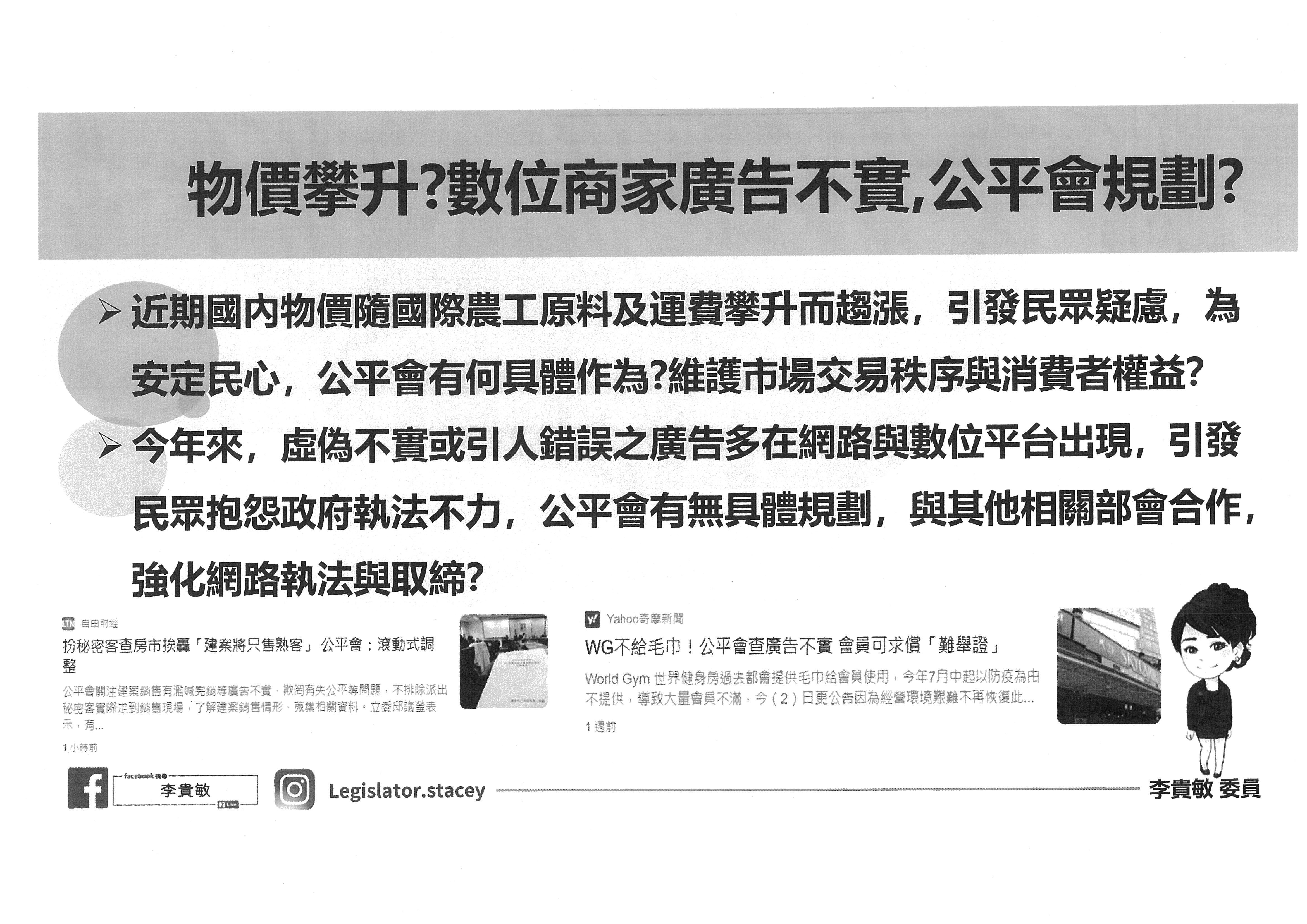 邱委員志偉:好啦!這部分我們會後再討論,我的用意是說你們針對數位經濟之下數位平臺上的廣告不實,你們要主動立案調查或設有一個機制,否則如果你沒有嚇阻作用、你沒有主動去調查的話,受害人會不斷增加。你其實是有工具的,你可以依據公平交易法第二十一條去罰他,對不對?未來這部分在統計數據上能否呈現出來?你們針對不實廣告部分的查處一年大概有幾件?