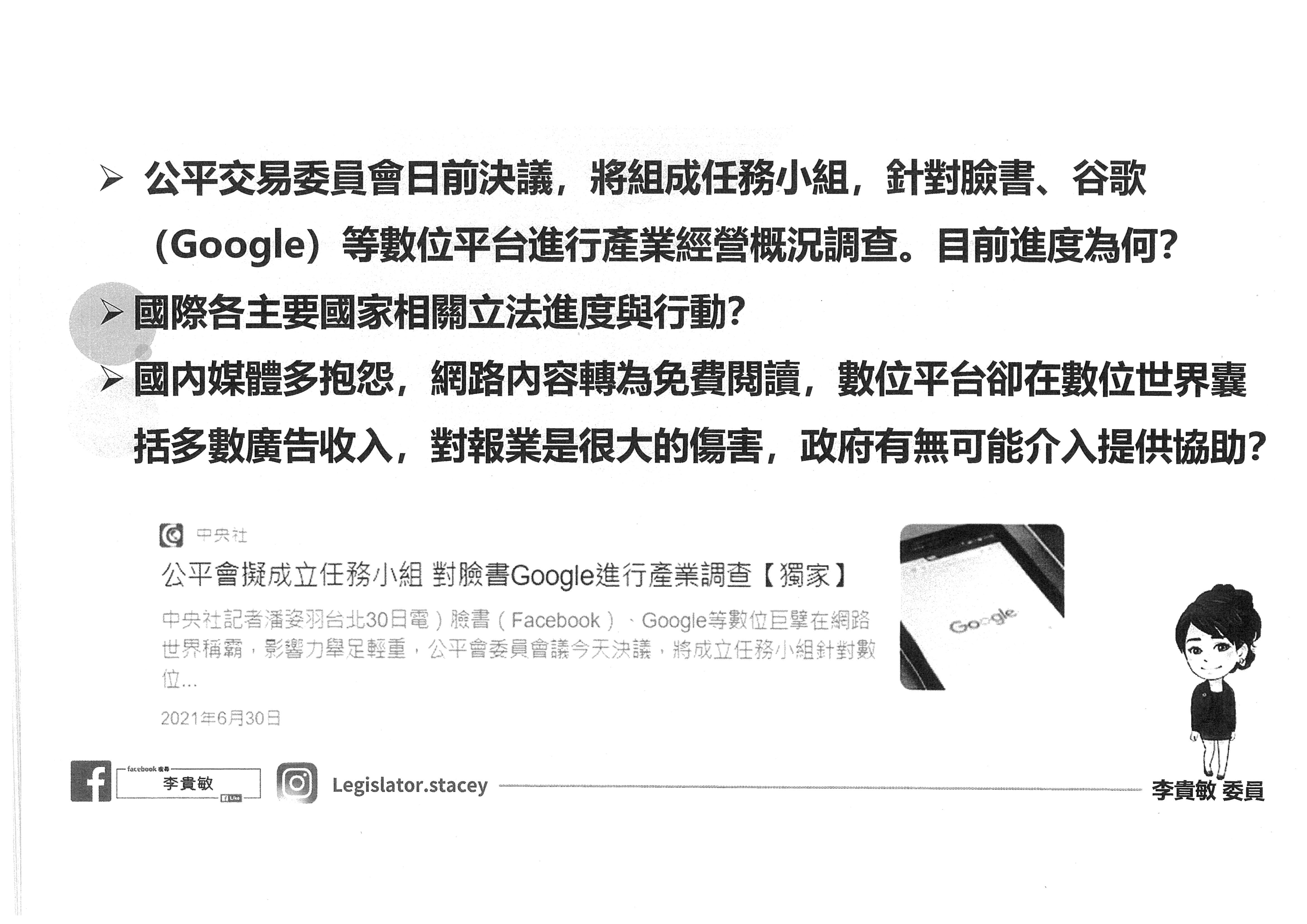 邱委員志偉:目前網路一頁式的詐騙非常猖獗,不論是入口網站或者平臺,這部分涉及廣告不實,違反公平交易法第二十一條,數位經濟是你們公平會未來的主要業務,但是你們在數位經濟的部分,我也看不到你們有編列什麼預算,今年的預算書裡面並沒有看到。你說數位經濟是你們的重要業務,你們也規劃提出數位經濟白皮書,但你們怎麼去查處數位經濟下違反公平交易法的相關行為?這個部分你們要更積極去調查數位平臺上面廣告不實的狀況。