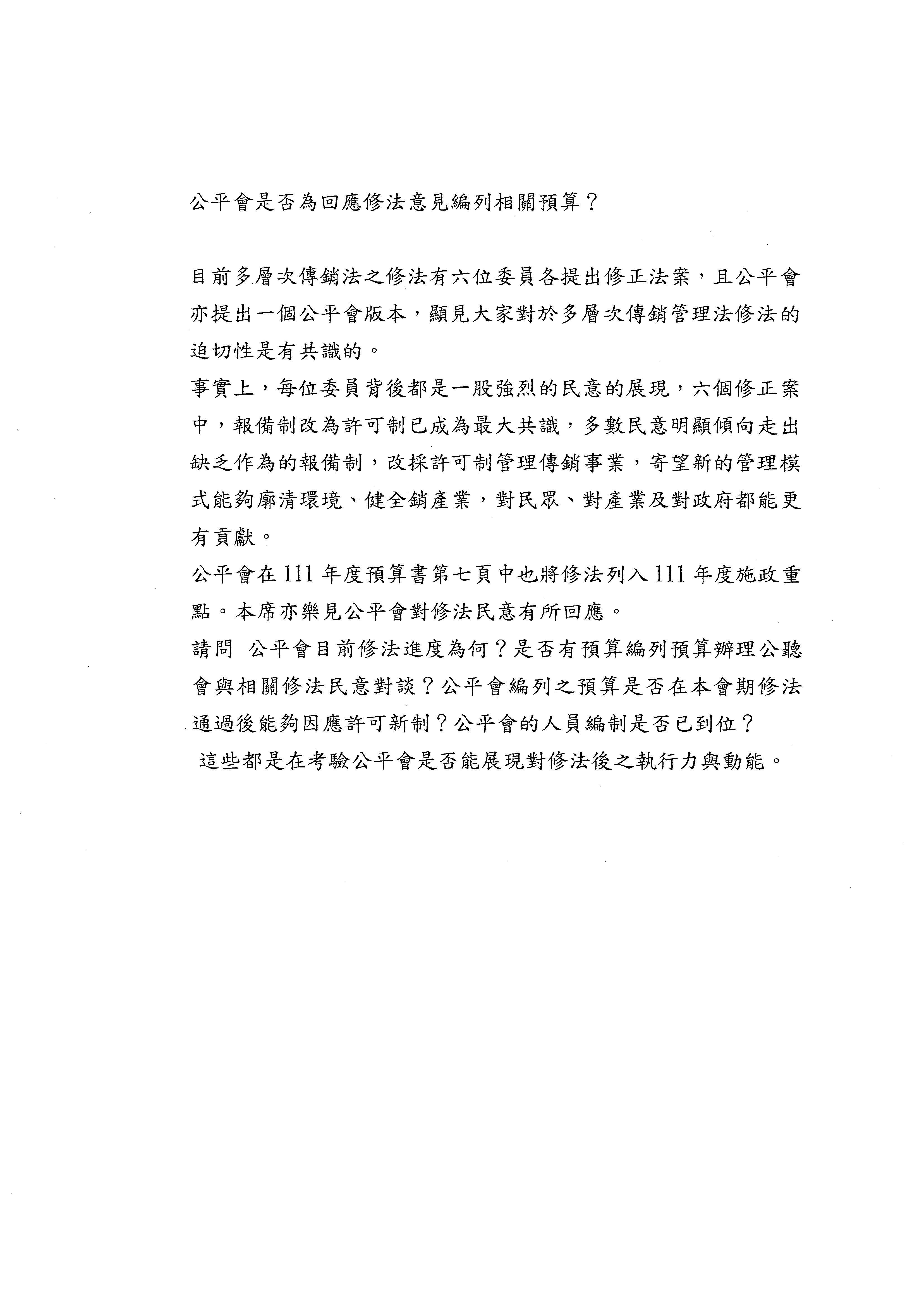 審查111年度中央政府總預算案關於公平交易委員會單位預算部分。