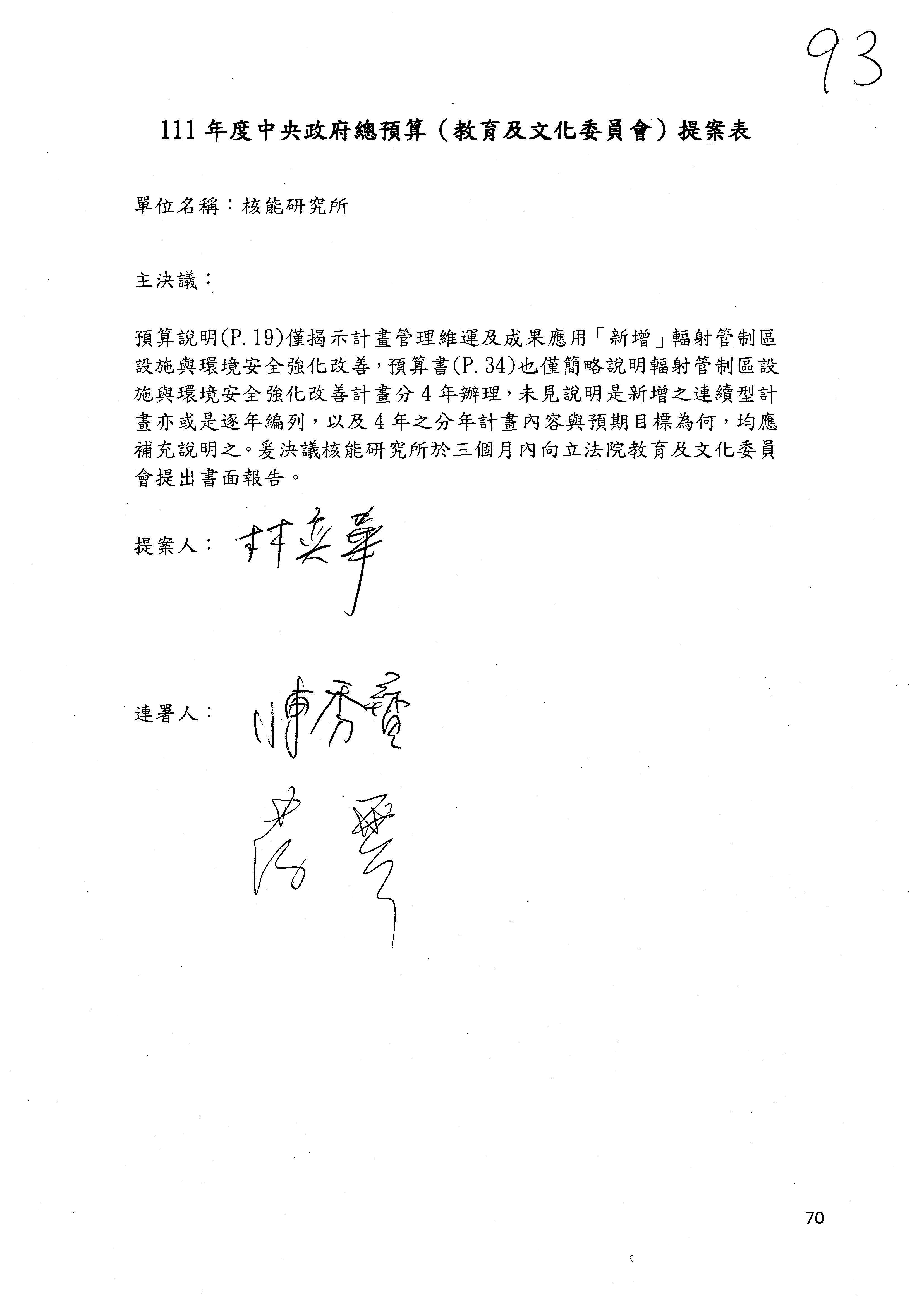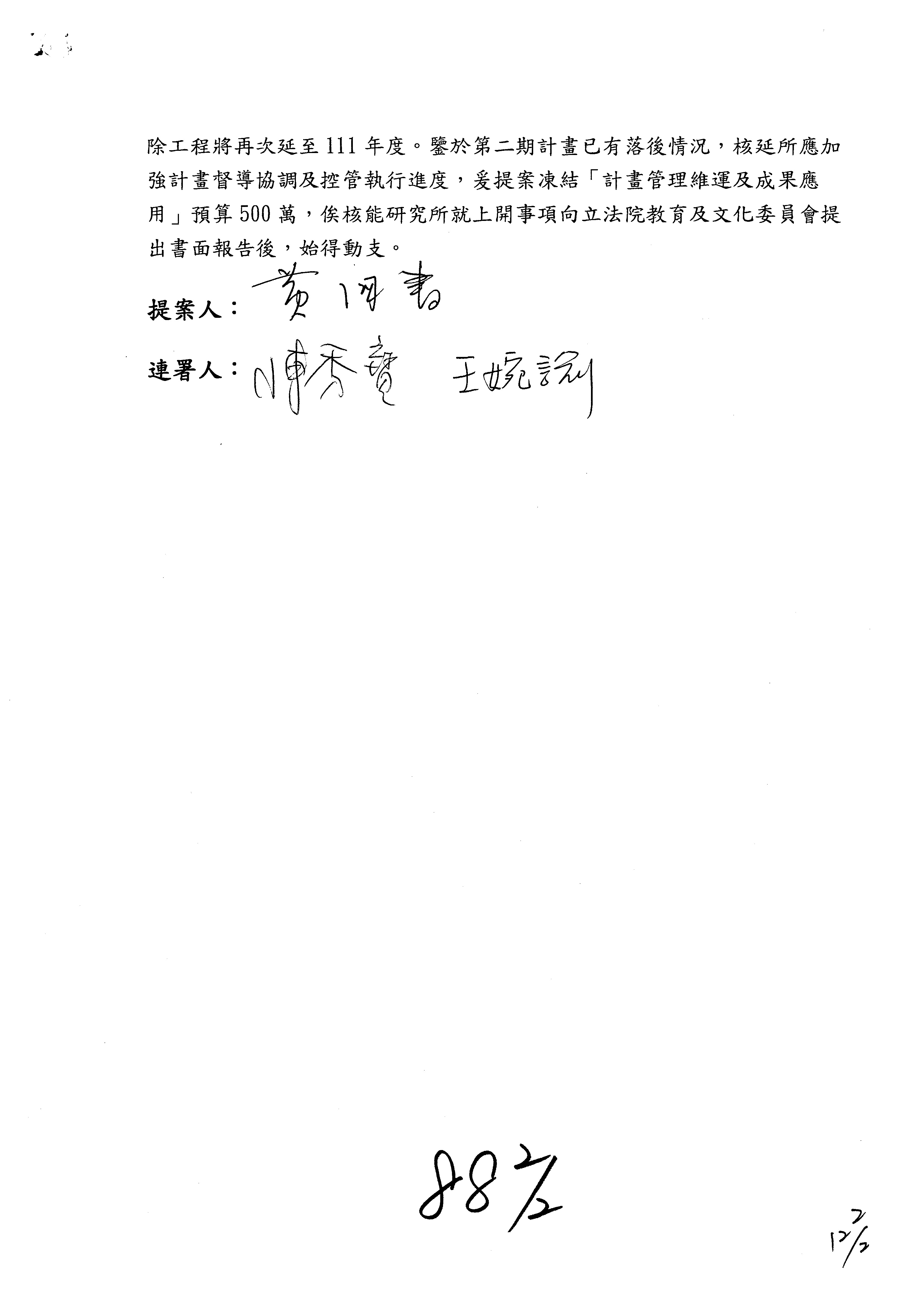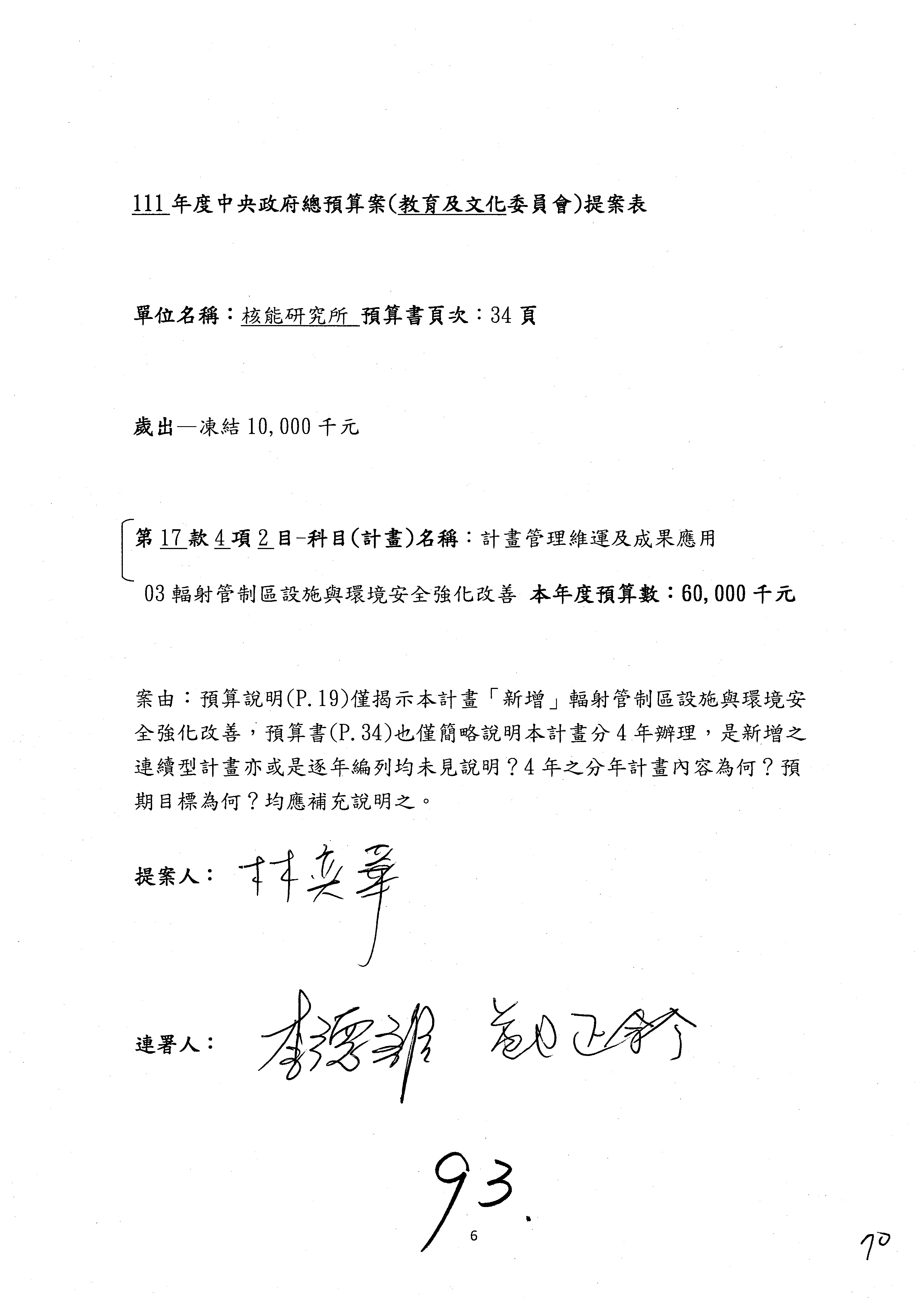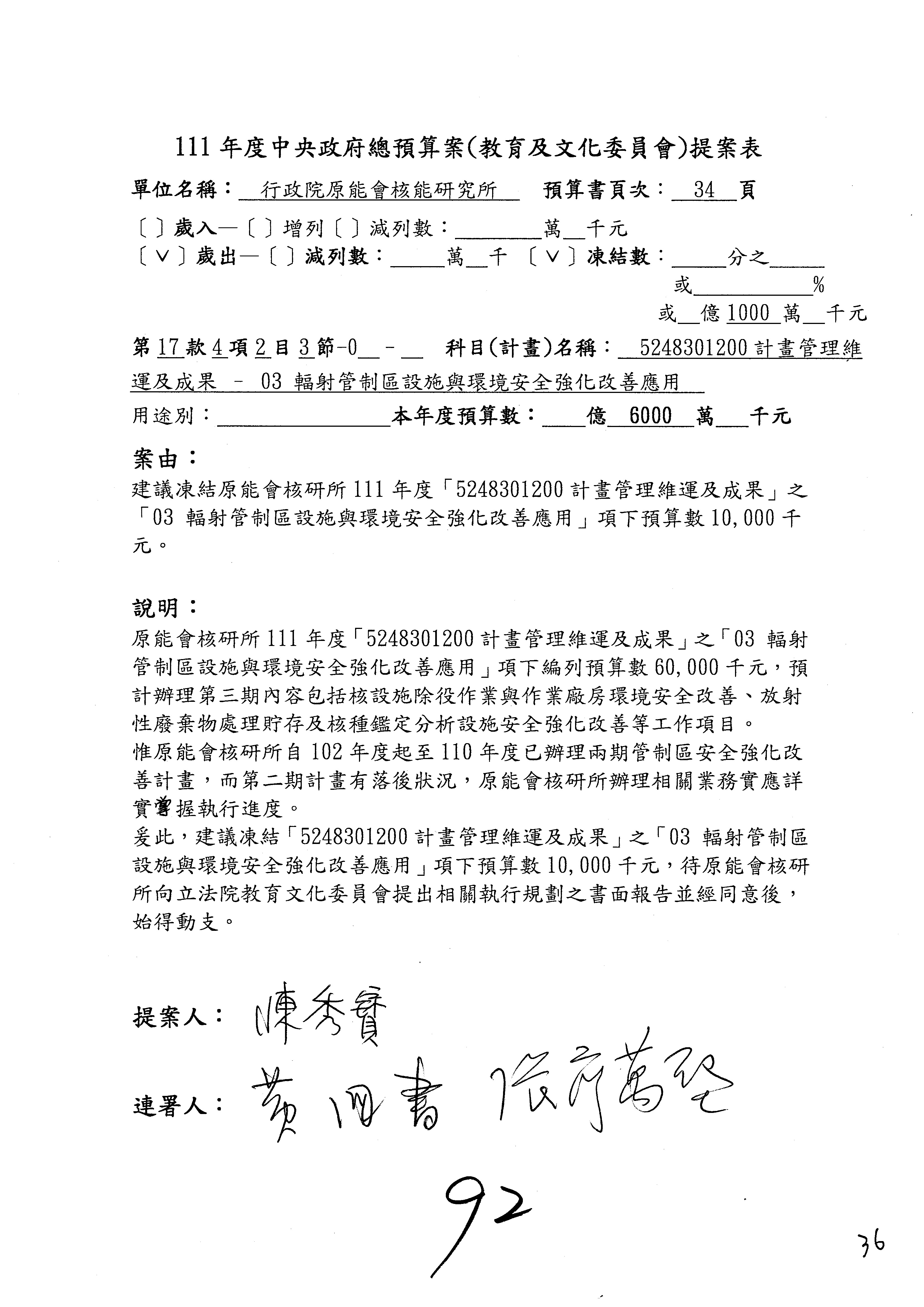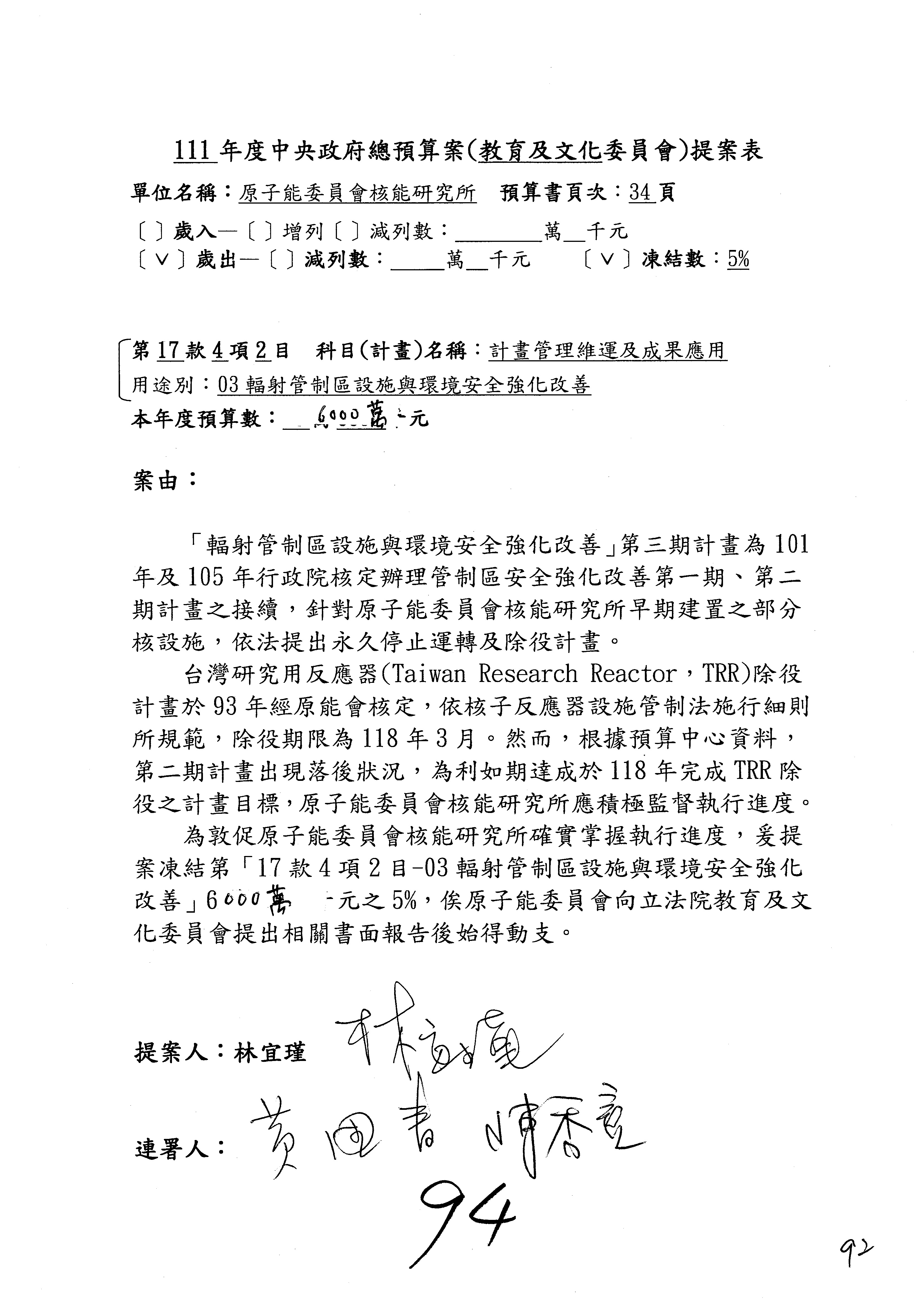 針對第92案,這部分是關於核設施除役作業、放射性廢棄物處理貯存及核種鑑定分析設施安全強化改善等工作,原能會核研所自102年度到110年度已經辦理兩期管制區的安全強化改善計畫,但第二期進度有落後的狀況,雖然你們表示針對落後的部分,在明年上半年度可以趕上來,但基於我們監督行政機關執行預算的職責,還是希望你們能夠確實掌握相關計畫的執行進度。原來本席的提凍金額是1,000萬元,但我也沒有堅持一定要凍結,這部分也可以與其他委員的提案併案處理,但是有關書面報告的部分,我希望你們能夠自行檢討,然後在書面報告裡面說明,謝謝。
