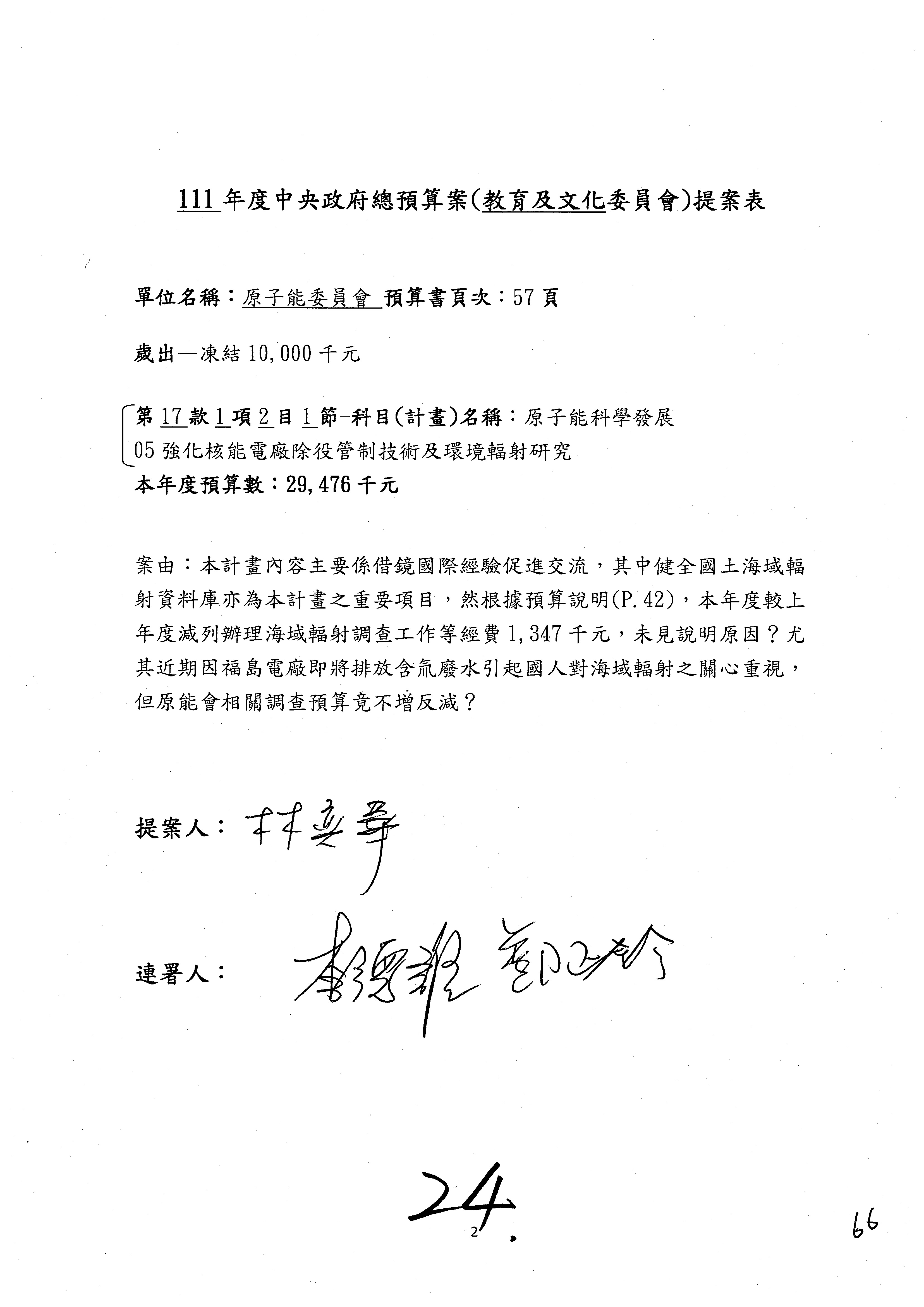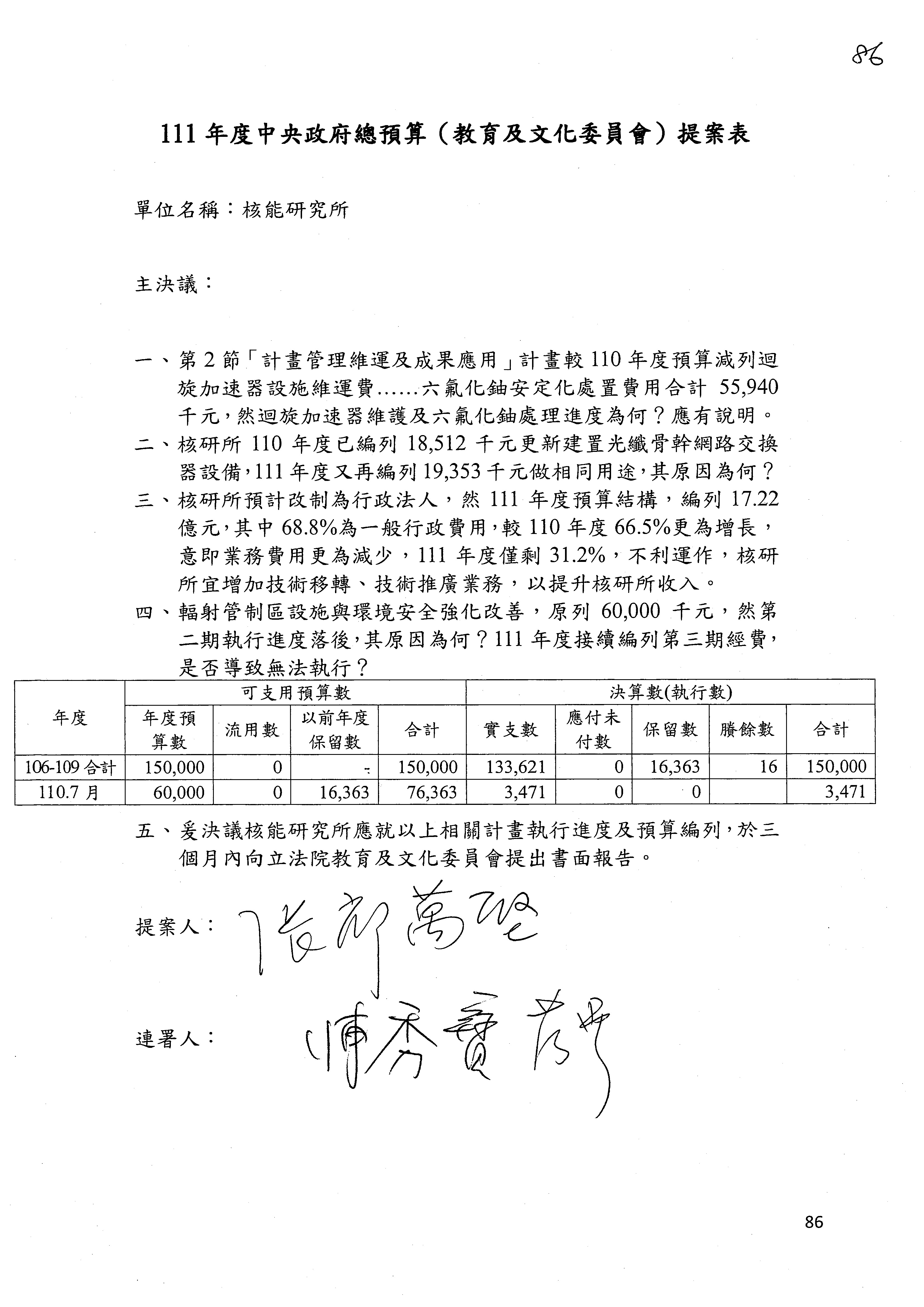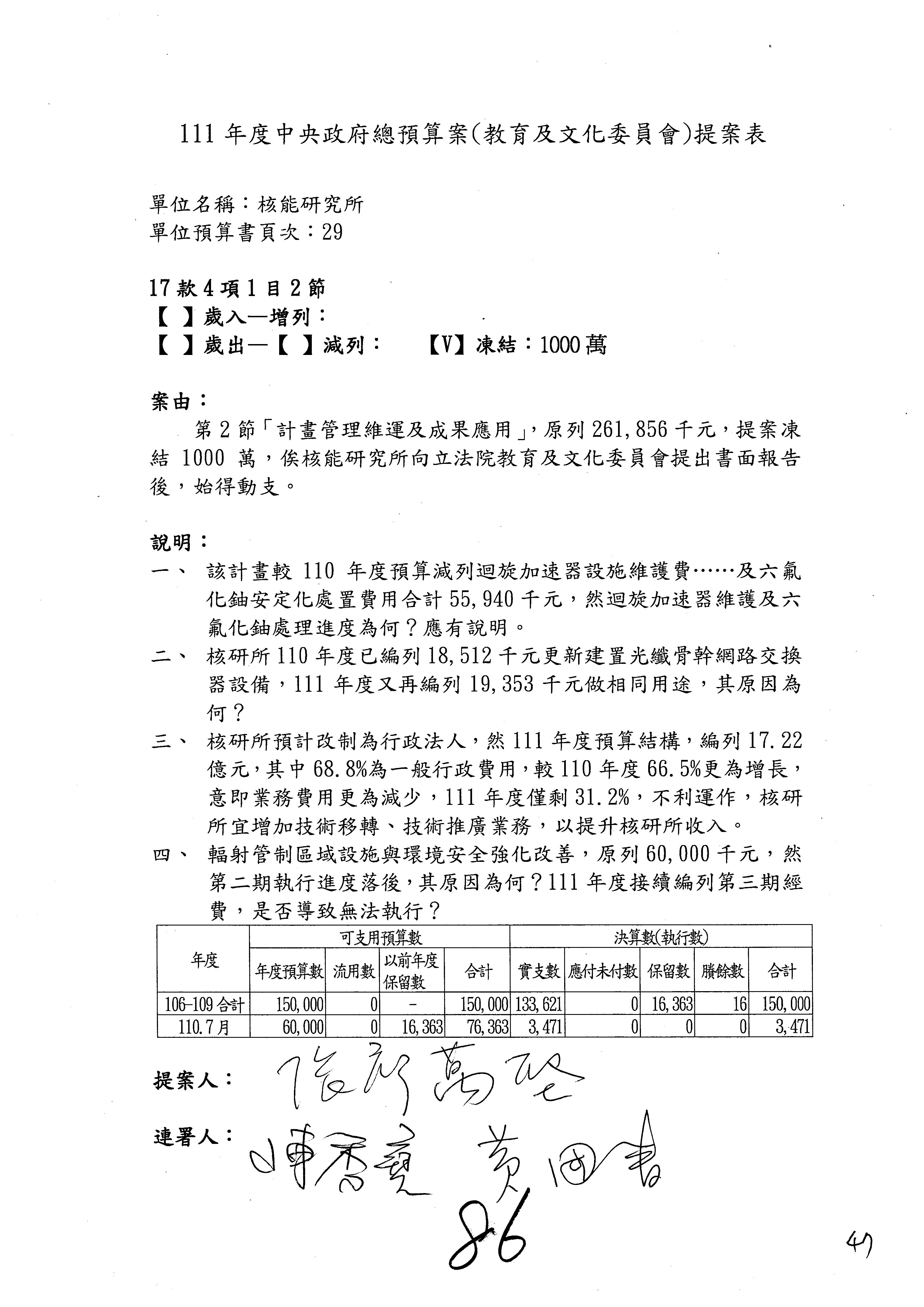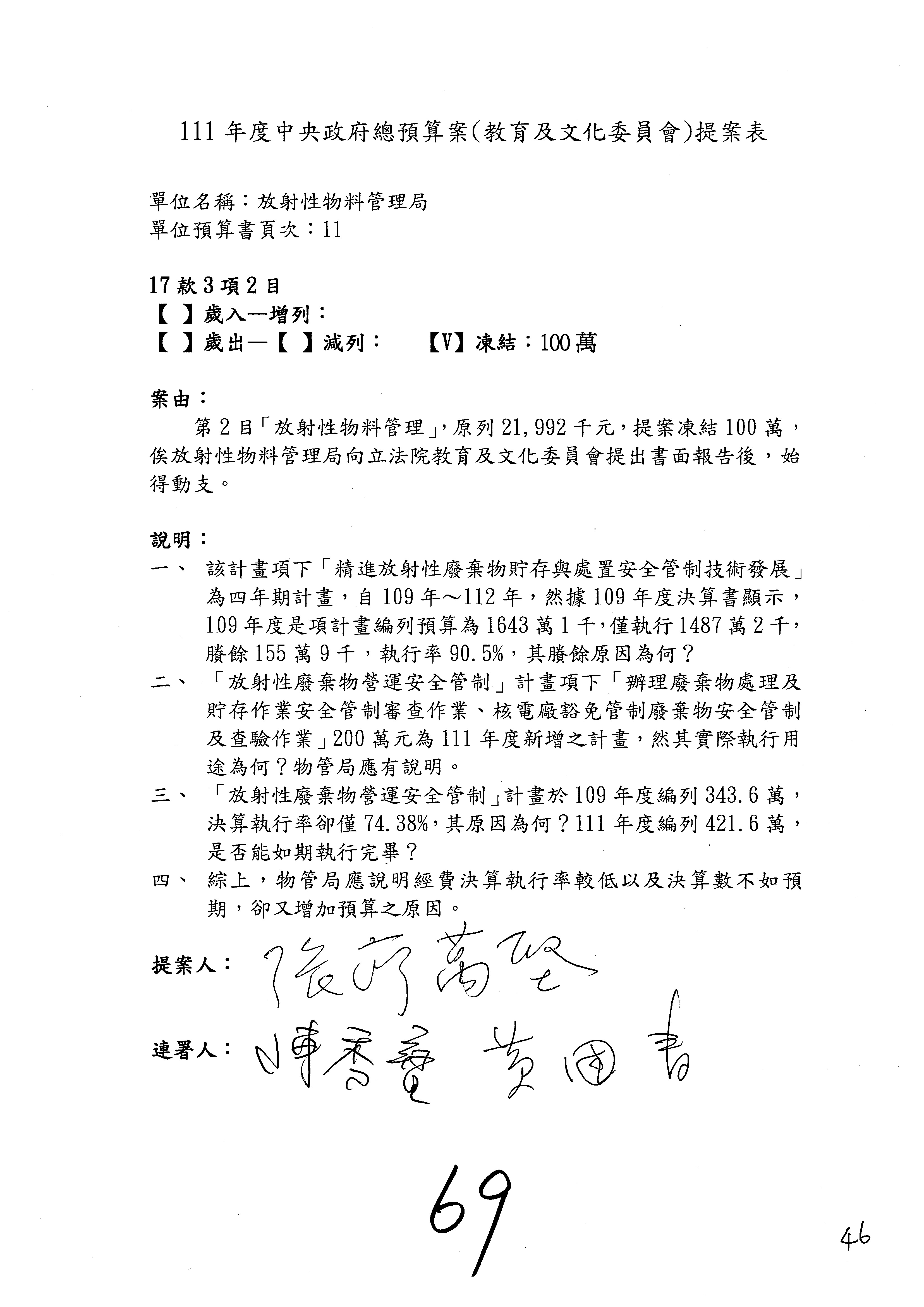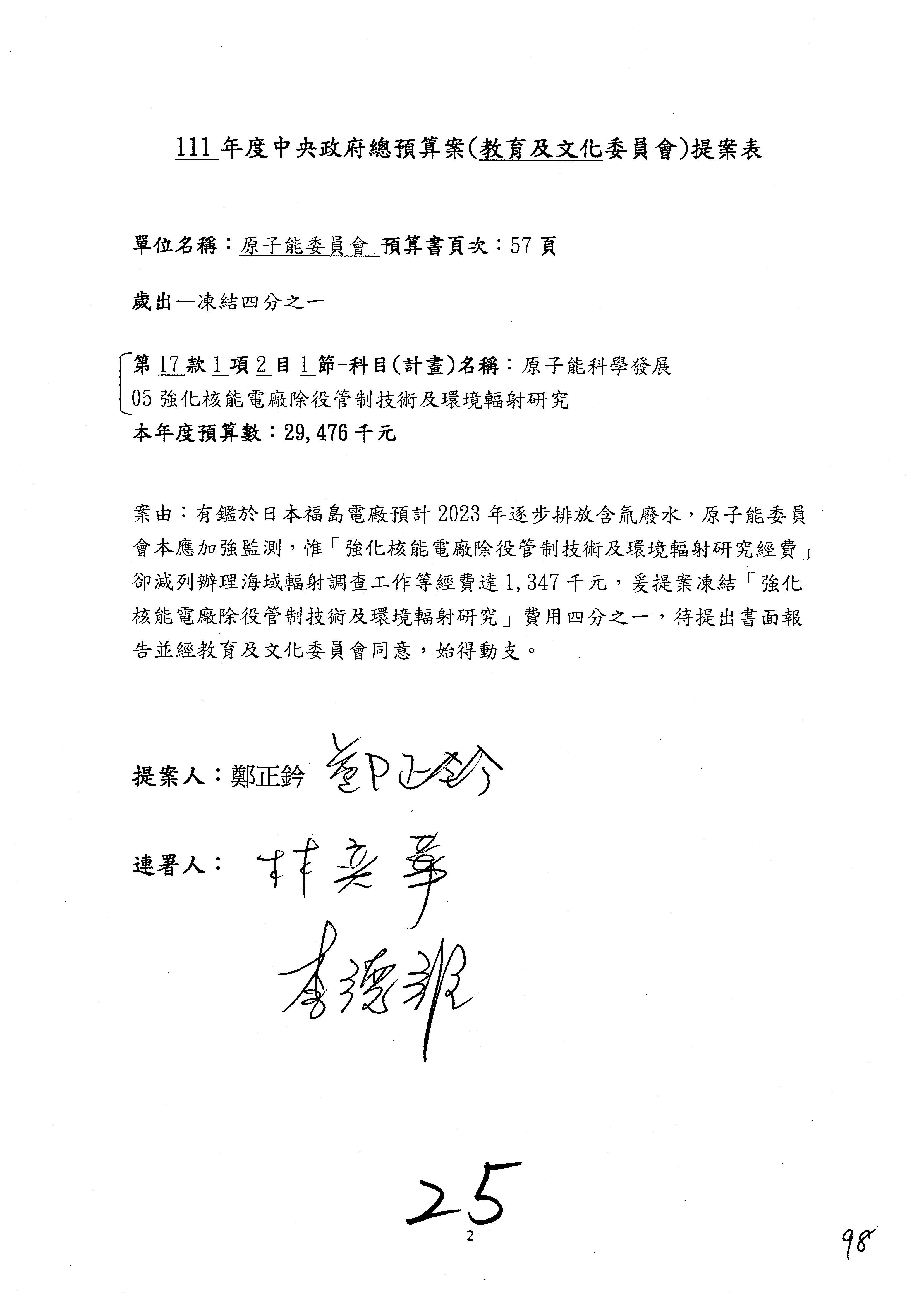 針對第92案,這部分是關於核設施除役作業、放射性廢棄物處理貯存及核種鑑定分析設施安全強化改善等工作,原能會核研所自102年度到110年度已經辦理兩期管制區的安全強化改善計畫,但第二期進度有落後的狀況,雖然你們表示針對落後的部分,在明年上半年度可以趕上來,但基於我們監督行政機關執行預算的職責,還是希望你們能夠確實掌握相關計畫的執行進度。原來本席的提凍金額是1,000萬元,但我也沒有堅持一定要凍結,這部分也可以與其他委員的提案併案處理,但是有關書面報告的部分,我希望你們能夠自行檢討,然後在書面報告裡面說明,謝謝。