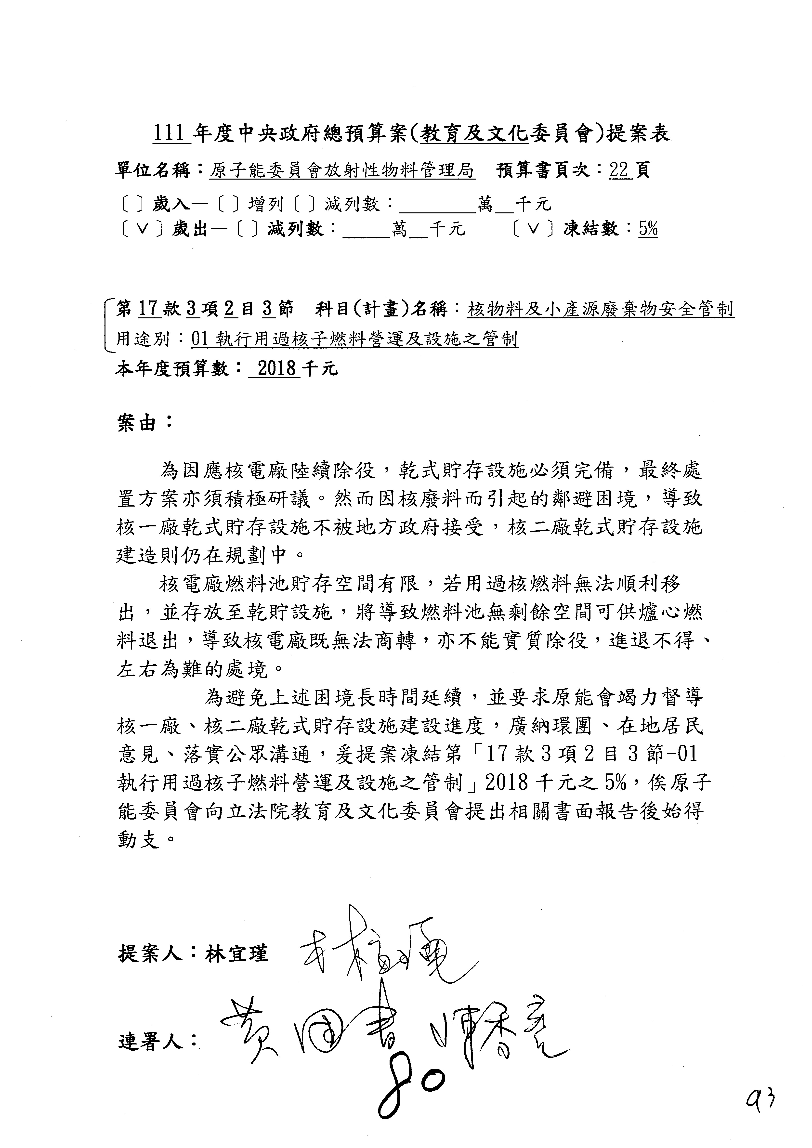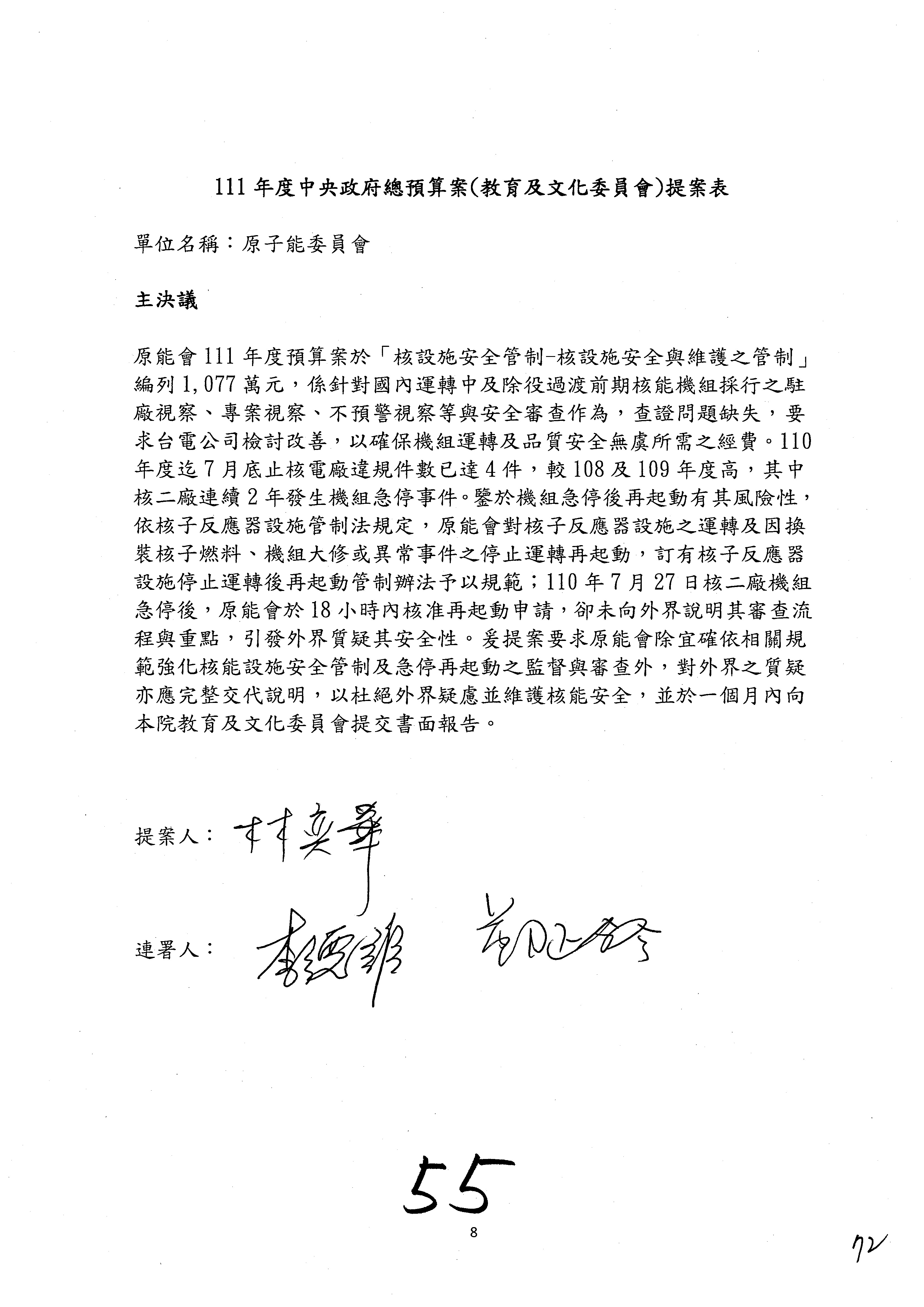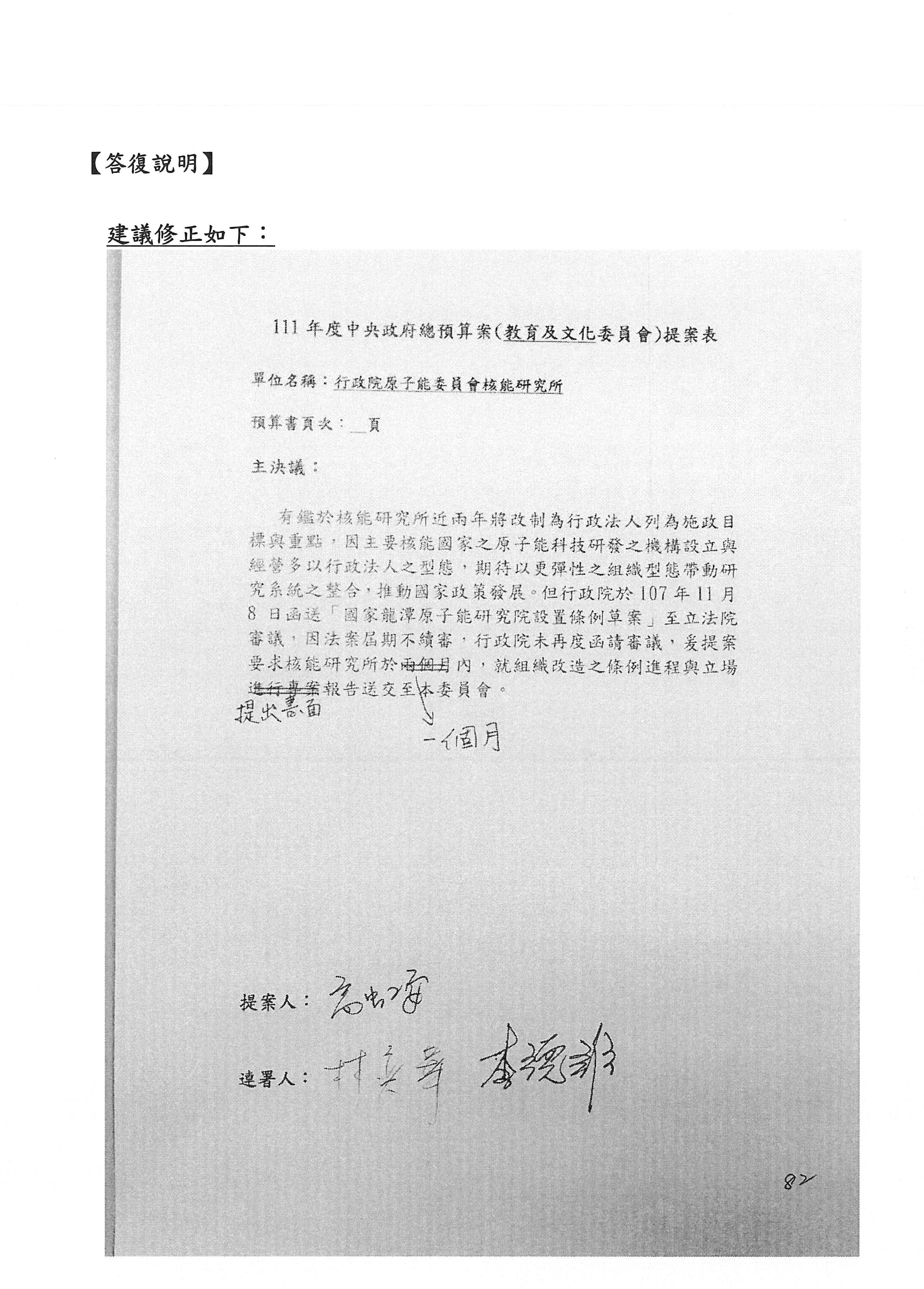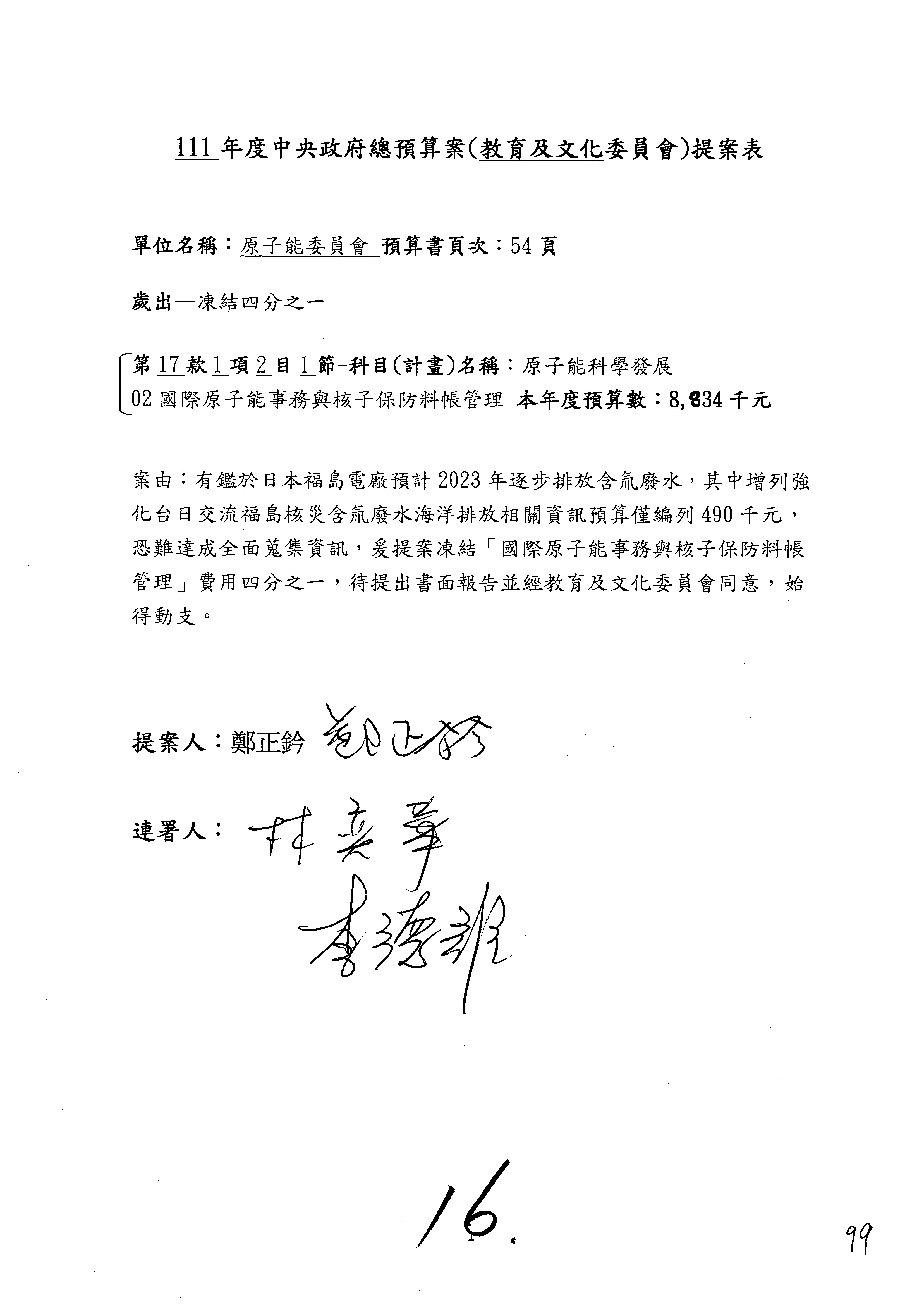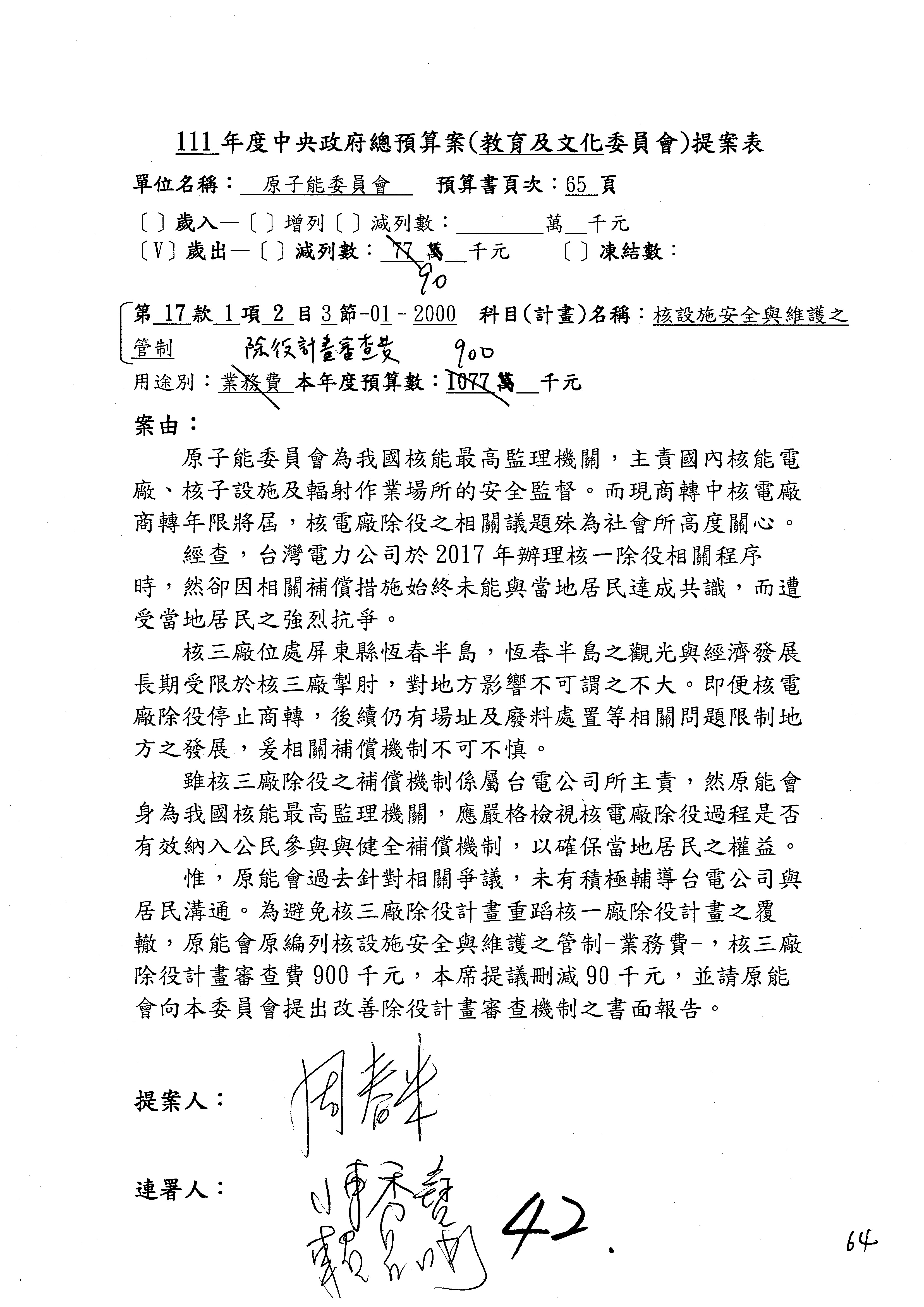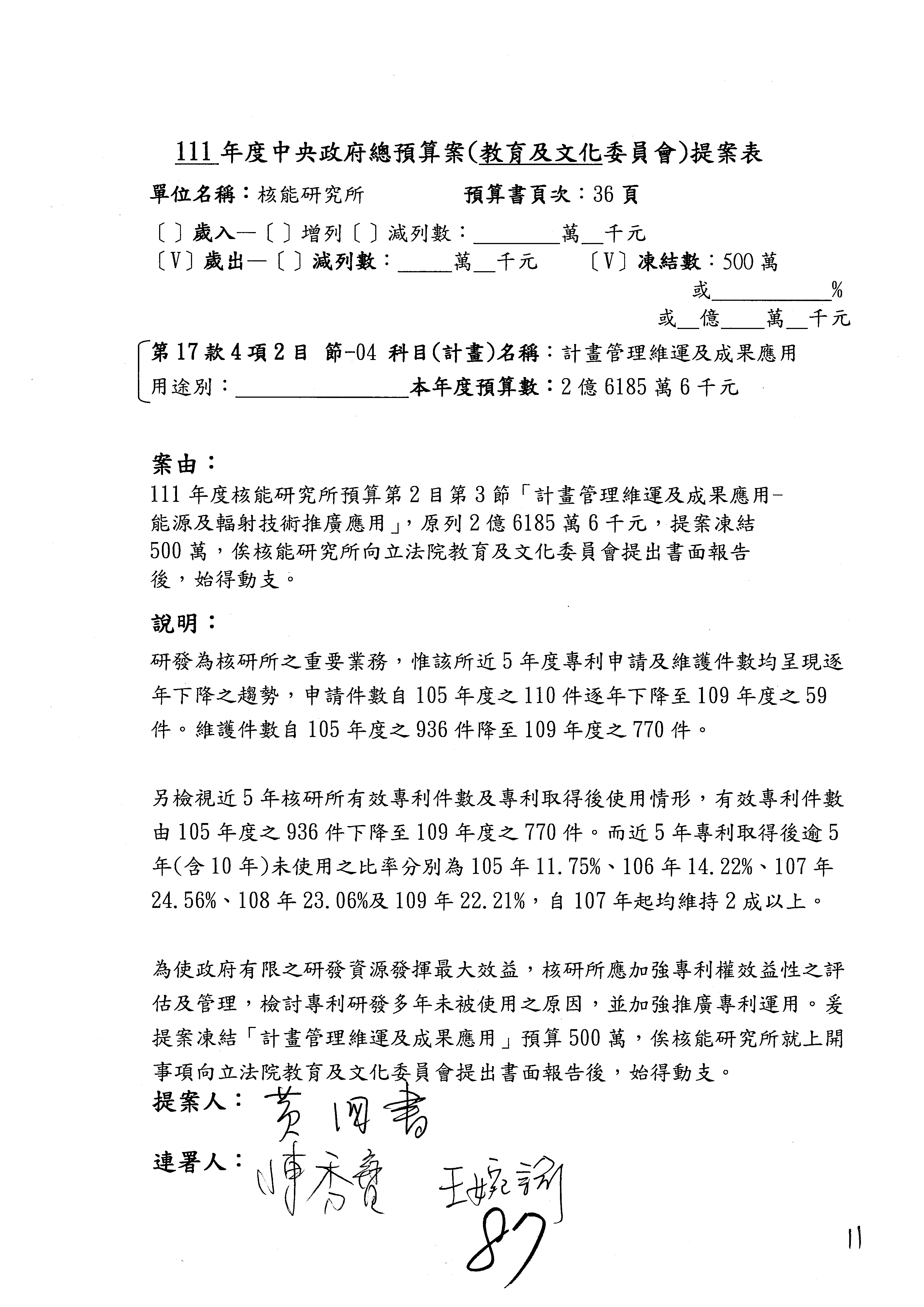 針對第92案,這部分是關於核設施除役作業、放射性廢棄物處理貯存及核種鑑定分析設施安全強化改善等工作,原能會核研所自102年度到110年度已經辦理兩期管制區的安全強化改善計畫,但第二期進度有落後的狀況,雖然你們表示針對落後的部分,在明年上半年度可以趕上來,但基於我們監督行政機關執行預算的職責,還是希望你們能夠確實掌握相關計畫的執行進度。原來本席的提凍金額是1,000萬元,但我也沒有堅持一定要凍結,這部分也可以與其他委員的提案併案處理,但是有關書面報告的部分,我希望你們能夠自行檢討,然後在書面報告裡面說明,謝謝。