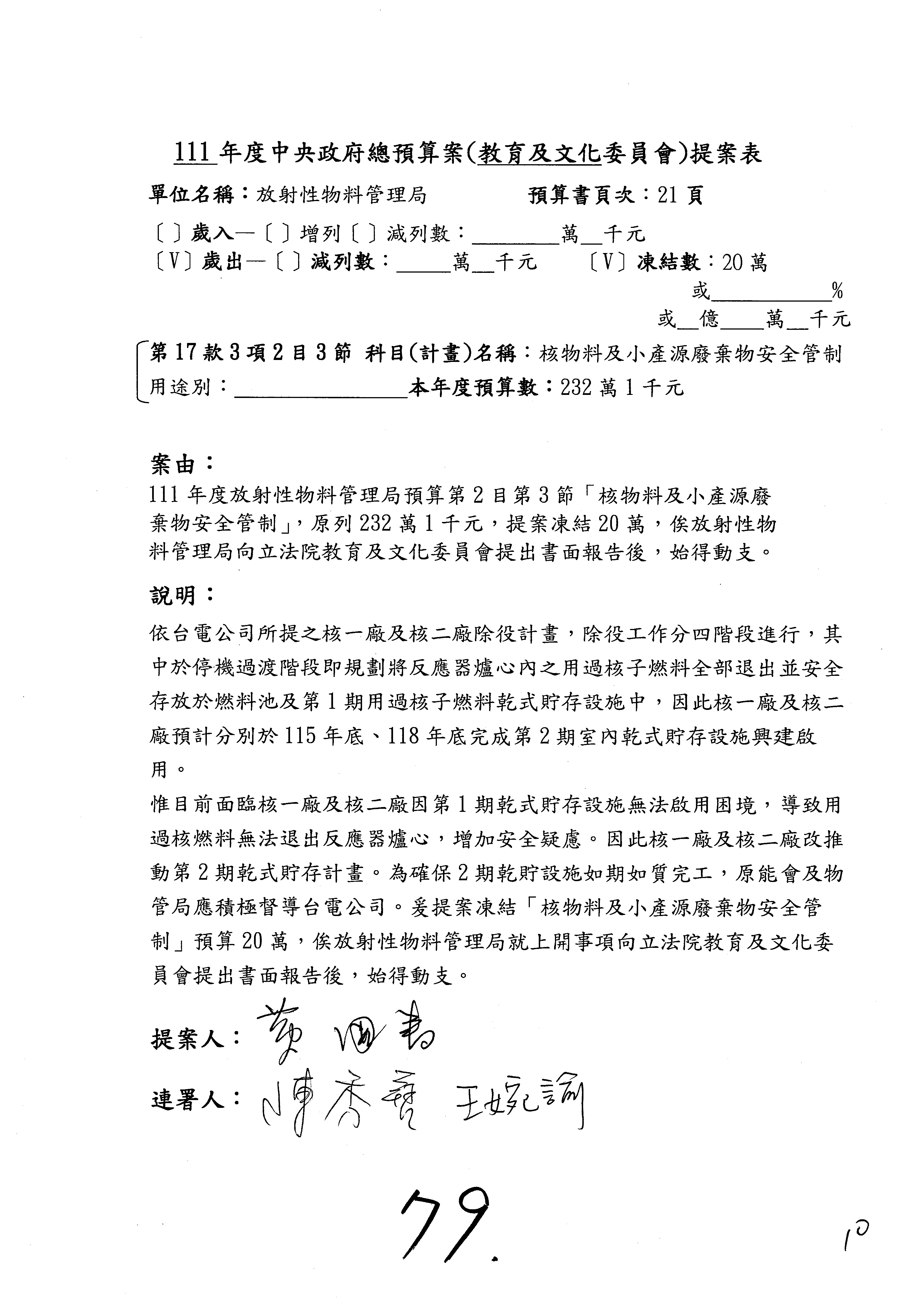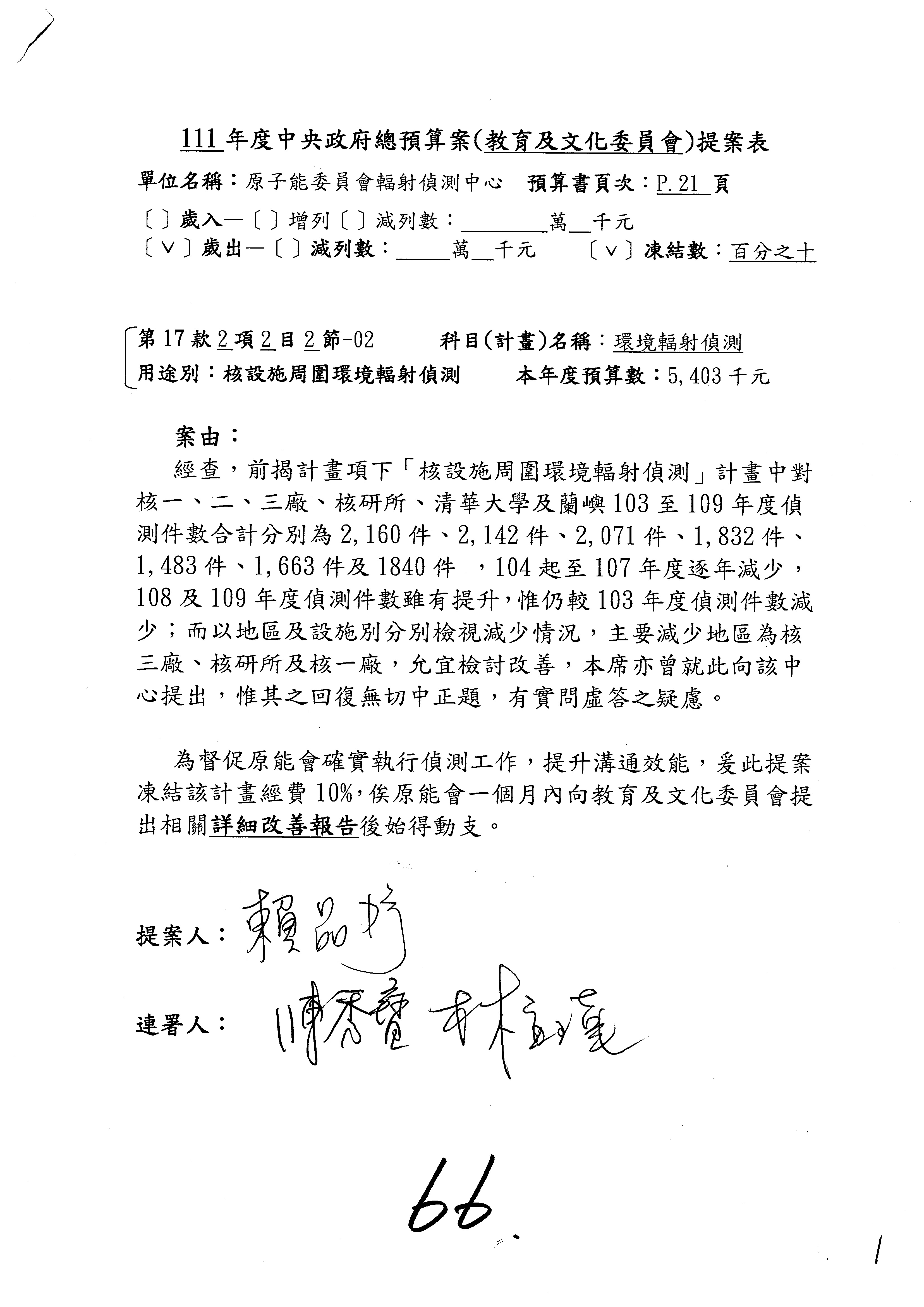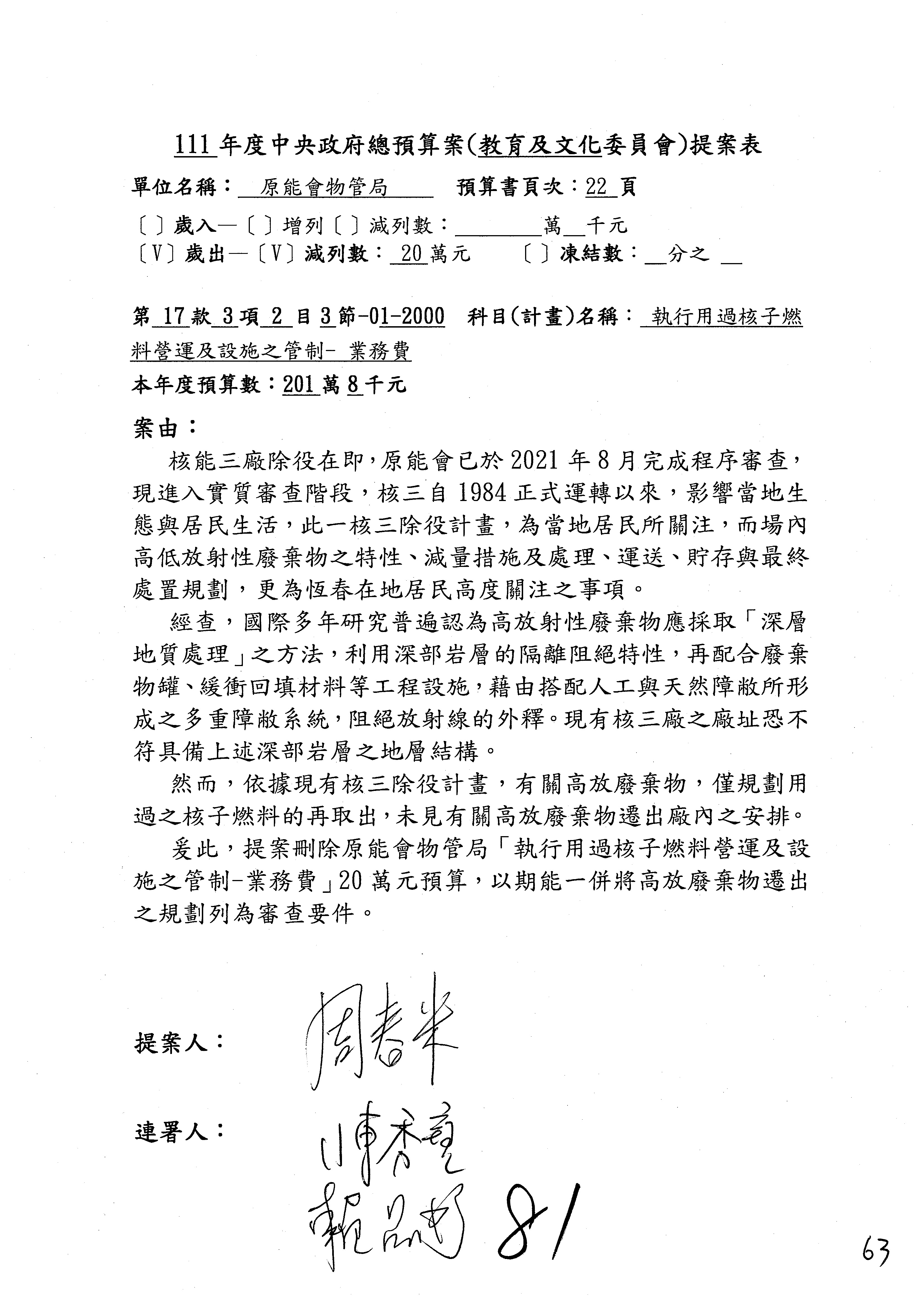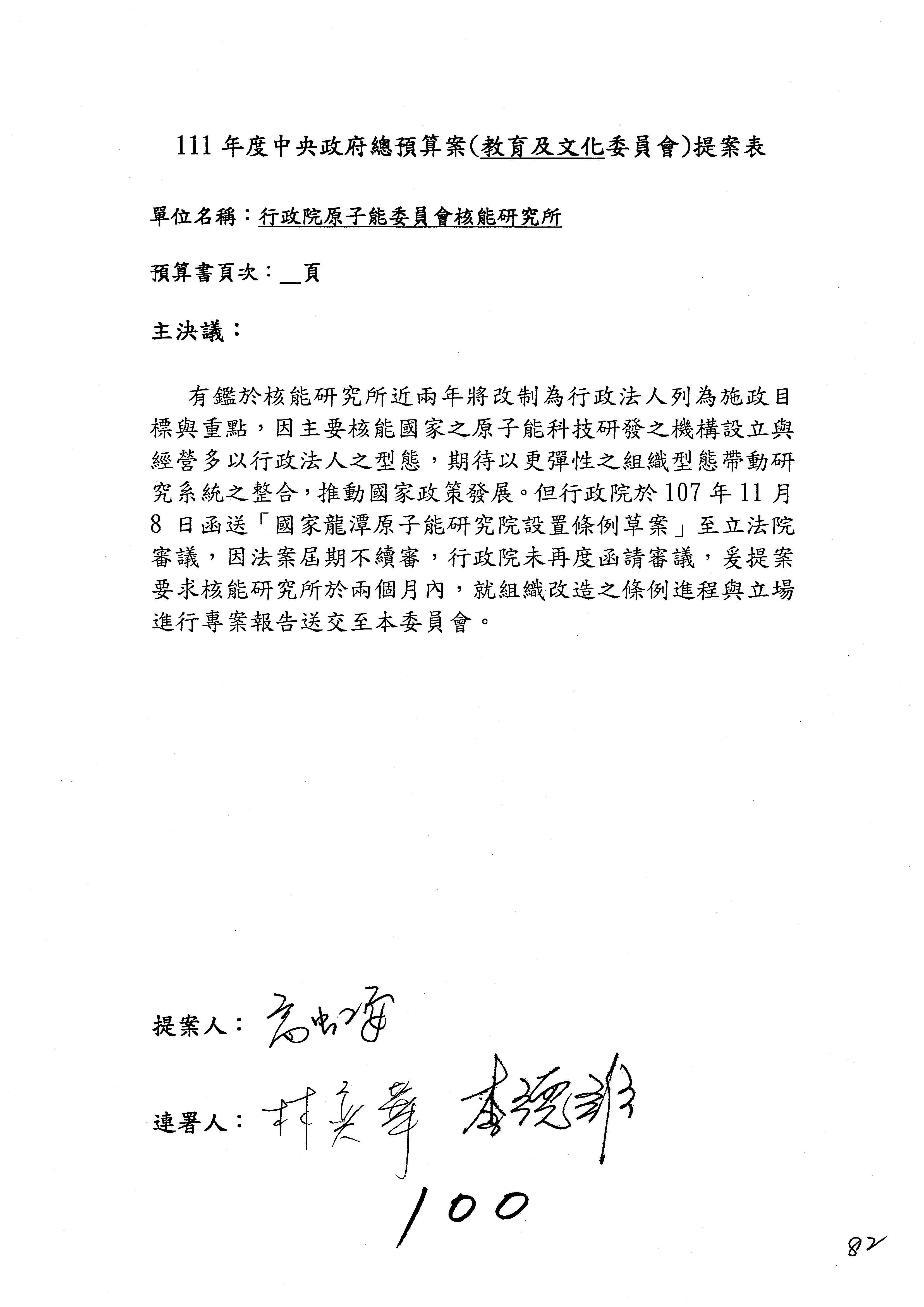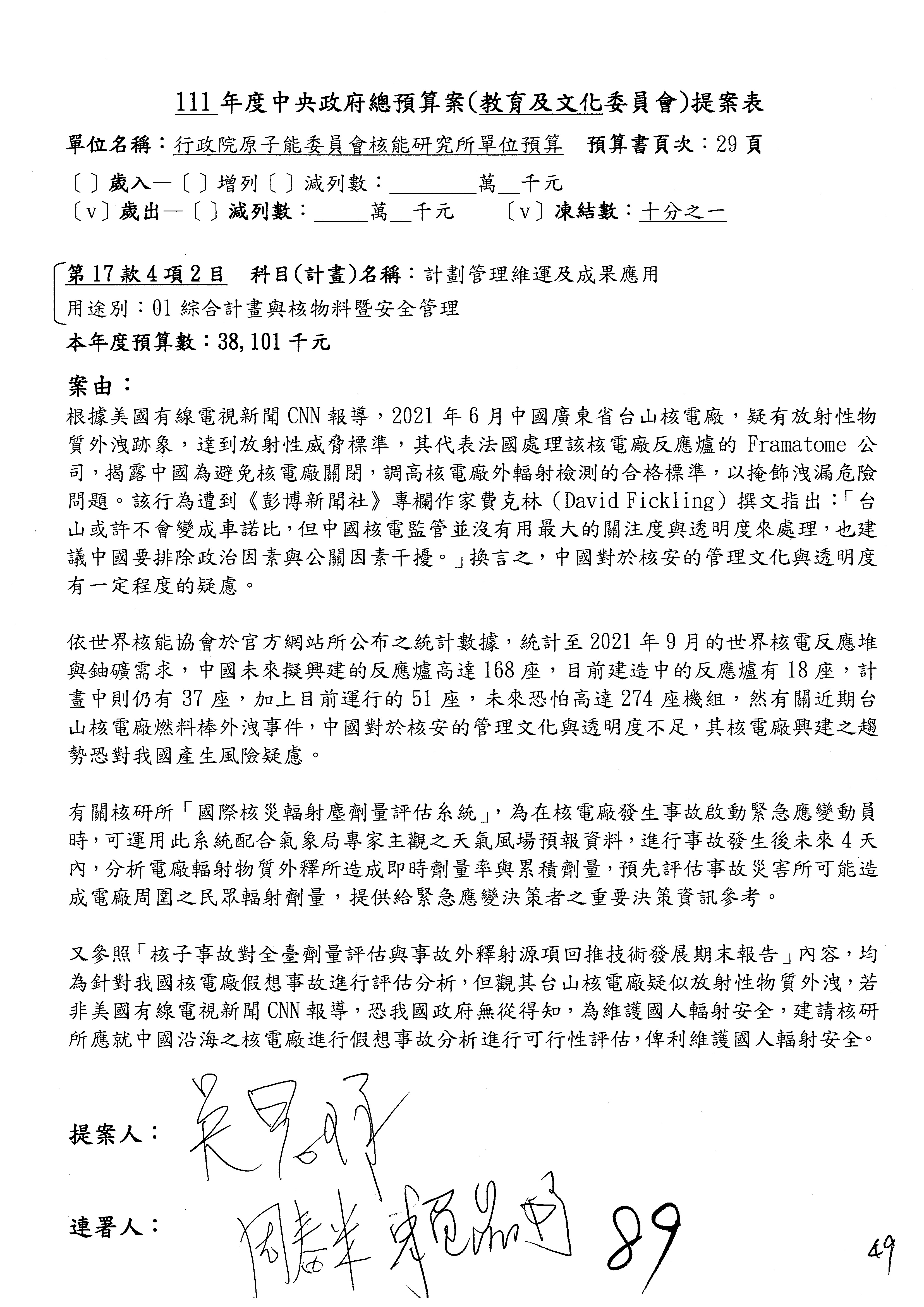 針對第92案,這部分是關於核設施除役作業、放射性廢棄物處理貯存及核種鑑定分析設施安全強化改善等工作,原能會核研所自102年度到110年度已經辦理兩期管制區的安全強化改善計畫,但第二期進度有落後的狀況,雖然你們表示針對落後的部分,在明年上半年度可以趕上來,但基於我們監督行政機關執行預算的職責,還是希望你們能夠確實掌握相關計畫的執行進度。原來本席的提凍金額是1,000萬元,但我也沒有堅持一定要凍結,這部分也可以與其他委員的提案併案處理,但是有關書面報告的部分,我希望你們能夠自行檢討,然後在書面報告裡面說明,謝謝。