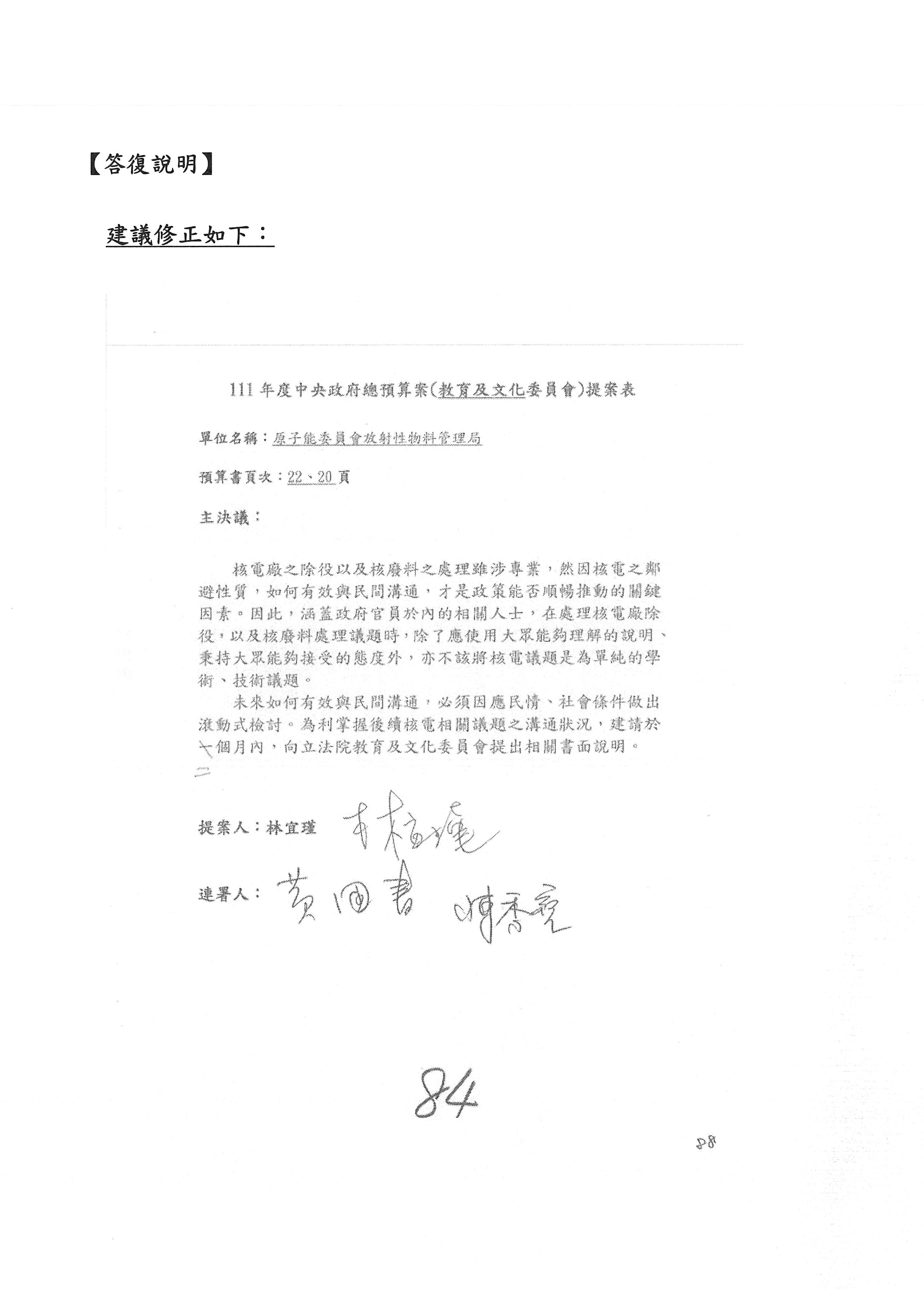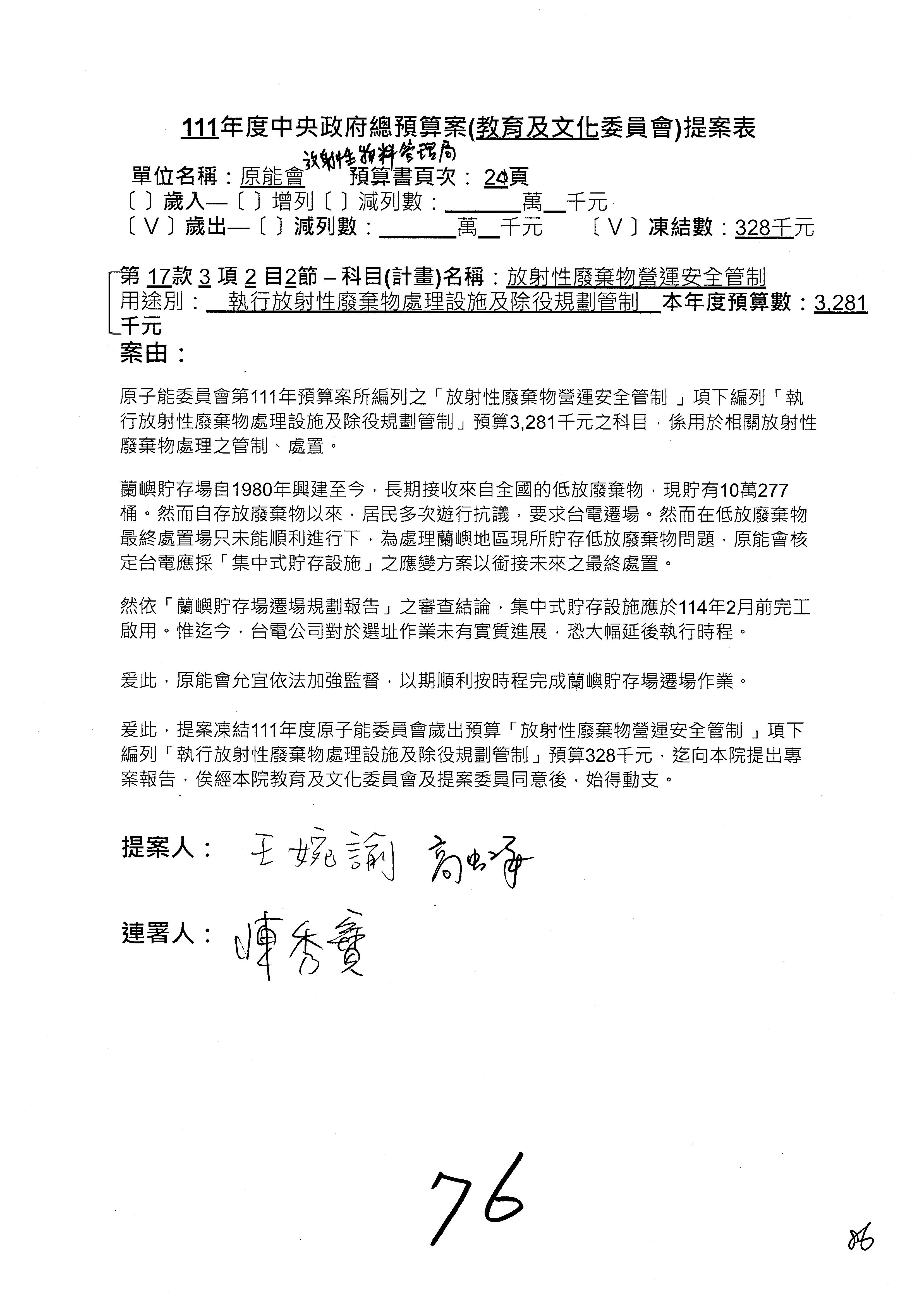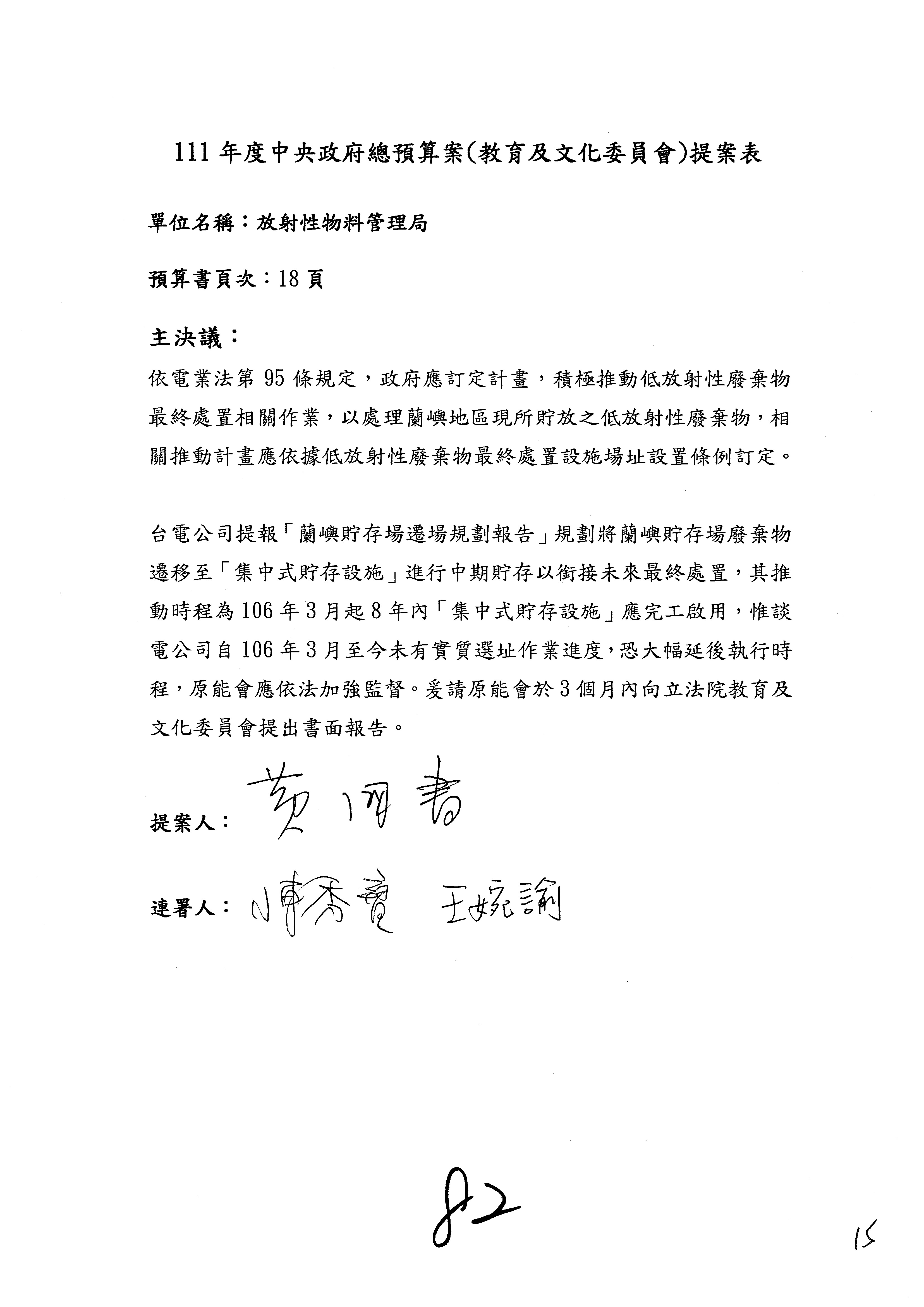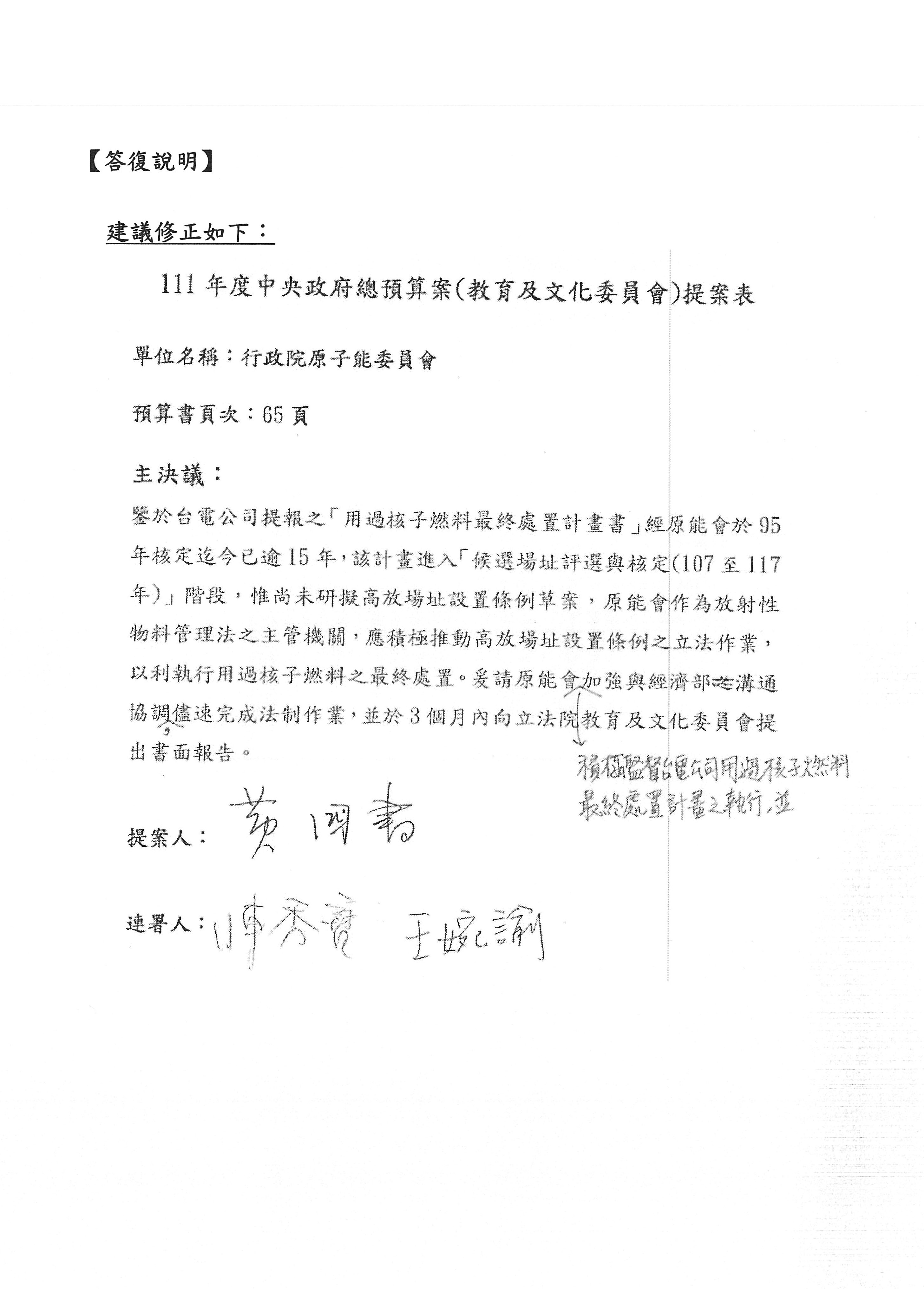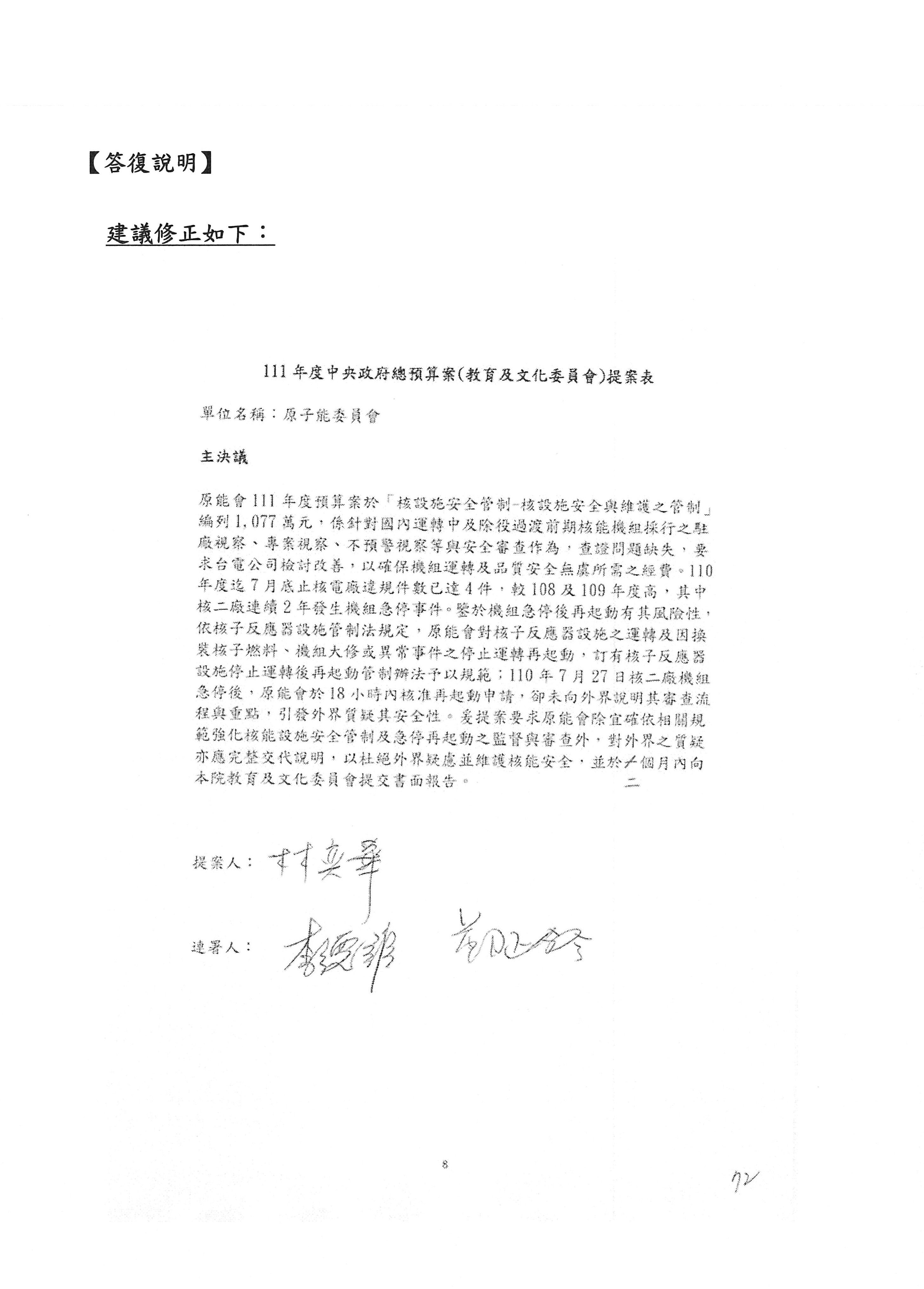 針對第92案,這部分是關於核設施除役作業、放射性廢棄物處理貯存及核種鑑定分析設施安全強化改善等工作,原能會核研所自102年度到110年度已經辦理兩期管制區的安全強化改善計畫,但第二期進度有落後的狀況,雖然你們表示針對落後的部分,在明年上半年度可以趕上來,但基於我們監督行政機關執行預算的職責,還是希望你們能夠確實掌握相關計畫的執行進度。原來本席的提凍金額是1,000萬元,但我也沒有堅持一定要凍結,這部分也可以與其他委員的提案併案處理,但是有關書面報告的部分,我希望你們能夠自行檢討,然後在書面報告裡面說明,謝謝。