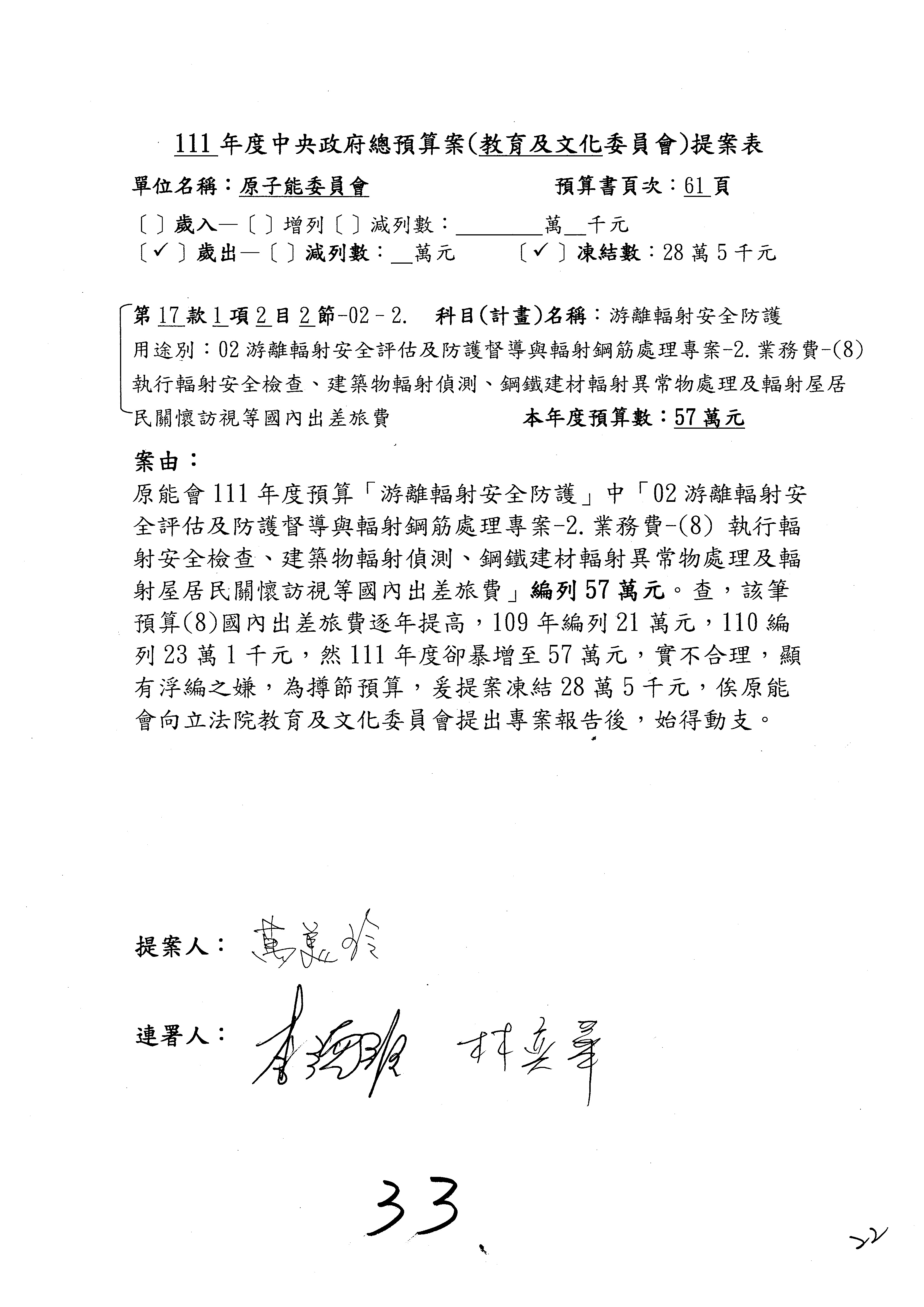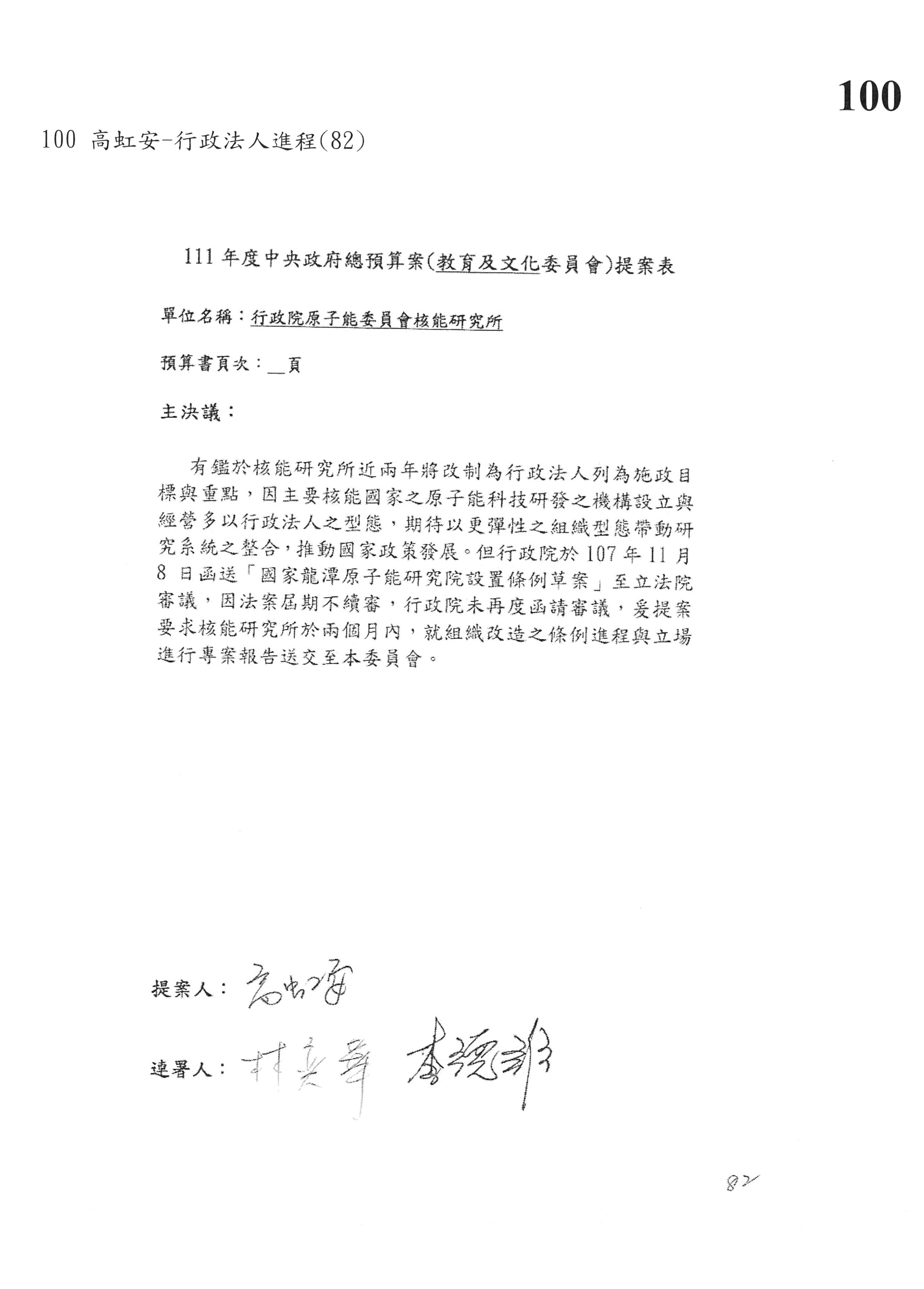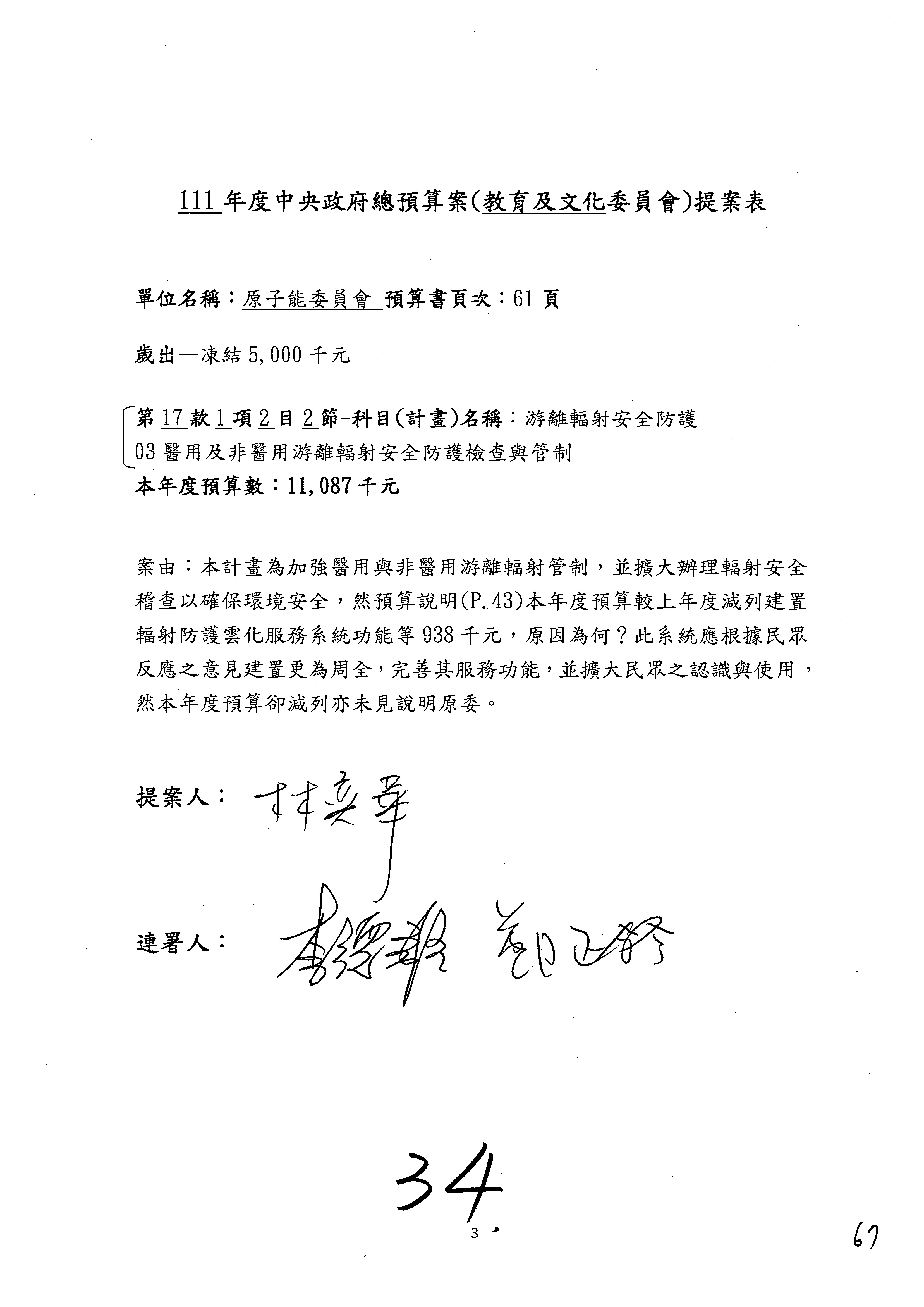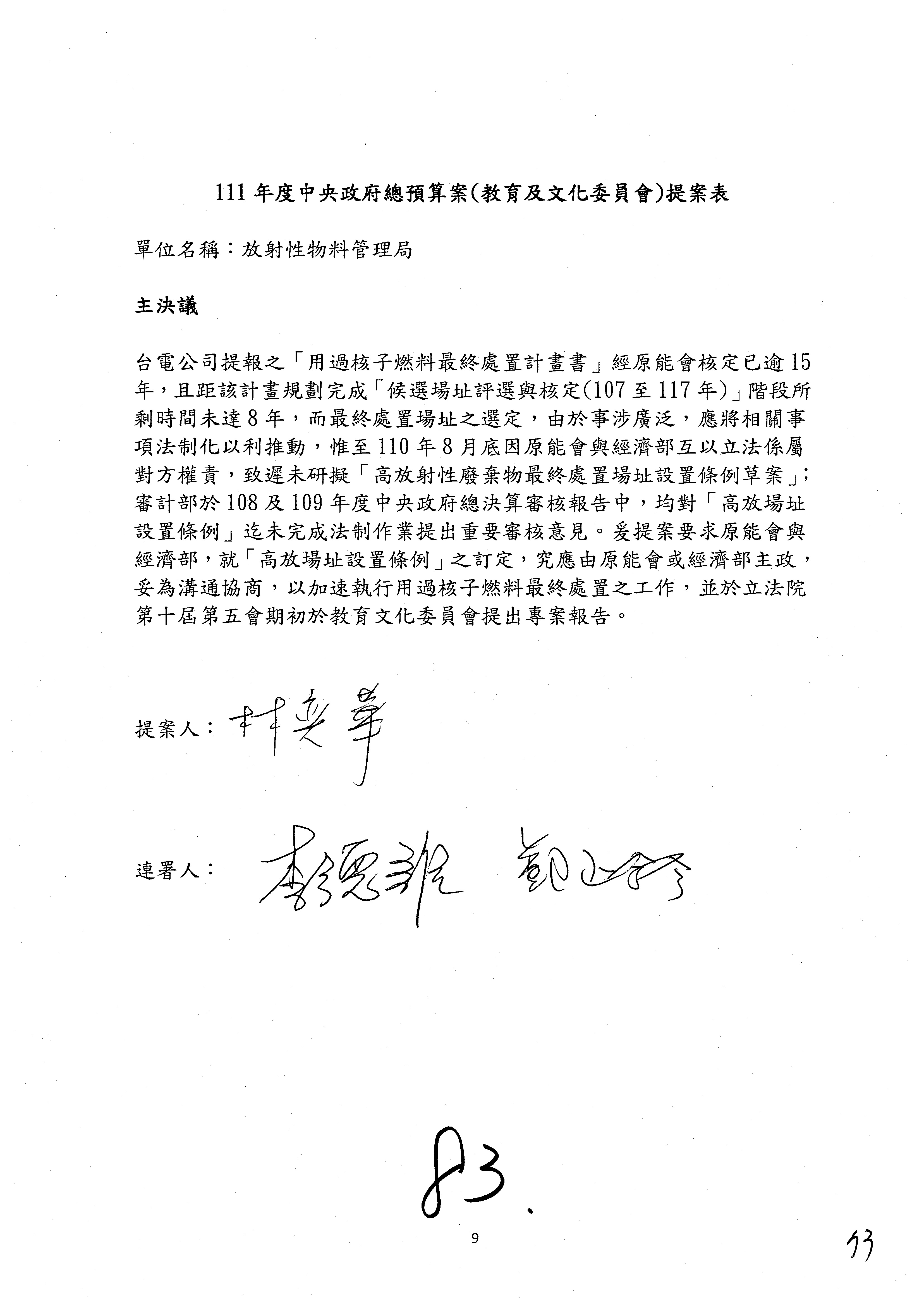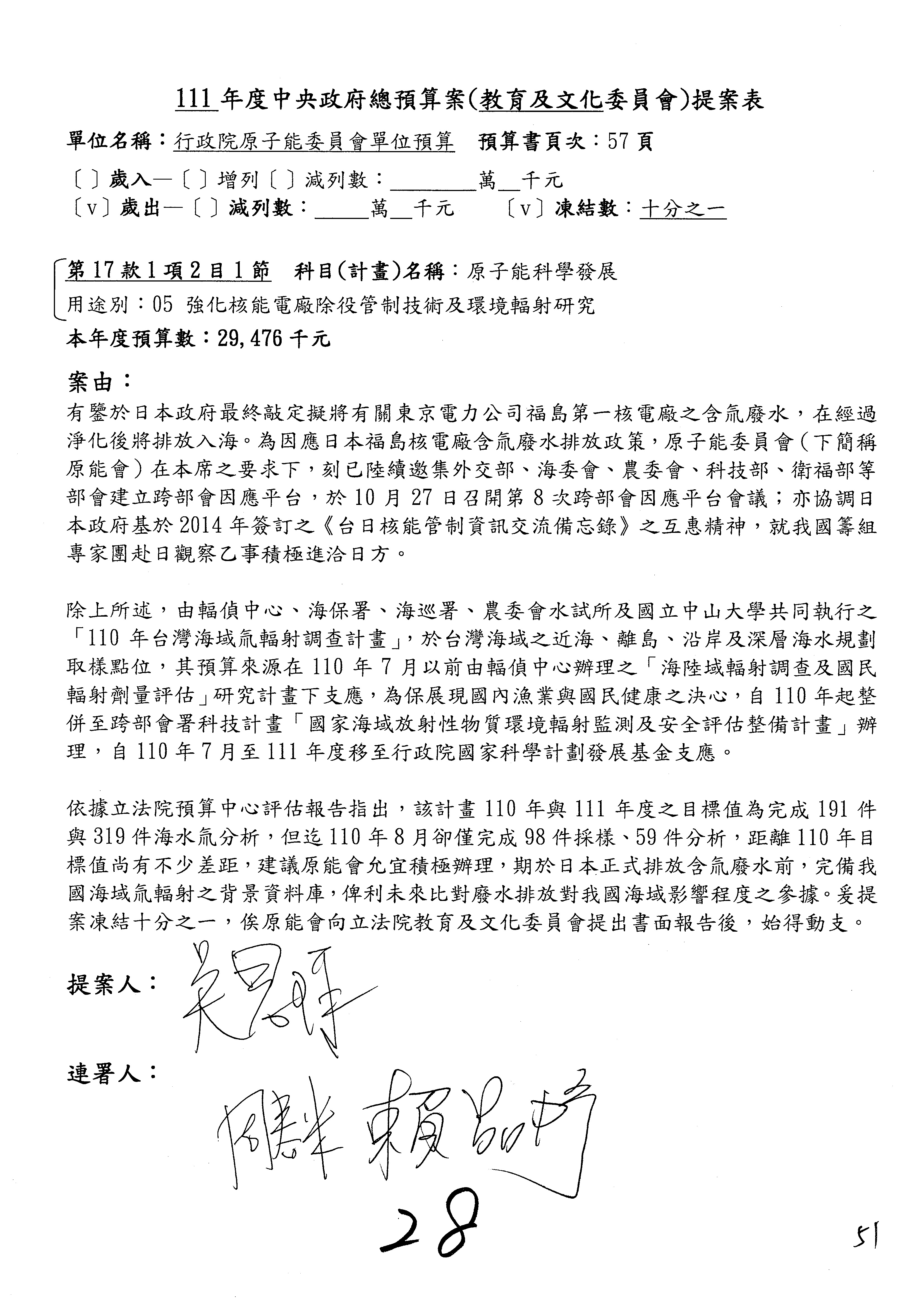 針對第92案,這部分是關於核設施除役作業、放射性廢棄物處理貯存及核種鑑定分析設施安全強化改善等工作,原能會核研所自102年度到110年度已經辦理兩期管制區的安全強化改善計畫,但第二期進度有落後的狀況,雖然你們表示針對落後的部分,在明年上半年度可以趕上來,但基於我們監督行政機關執行預算的職責,還是希望你們能夠確實掌握相關計畫的執行進度。原來本席的提凍金額是1,000萬元,但我也沒有堅持一定要凍結,這部分也可以與其他委員的提案併案處理,但是有關書面報告的部分,我希望你們能夠自行檢討,然後在書面報告裡面說明,謝謝。