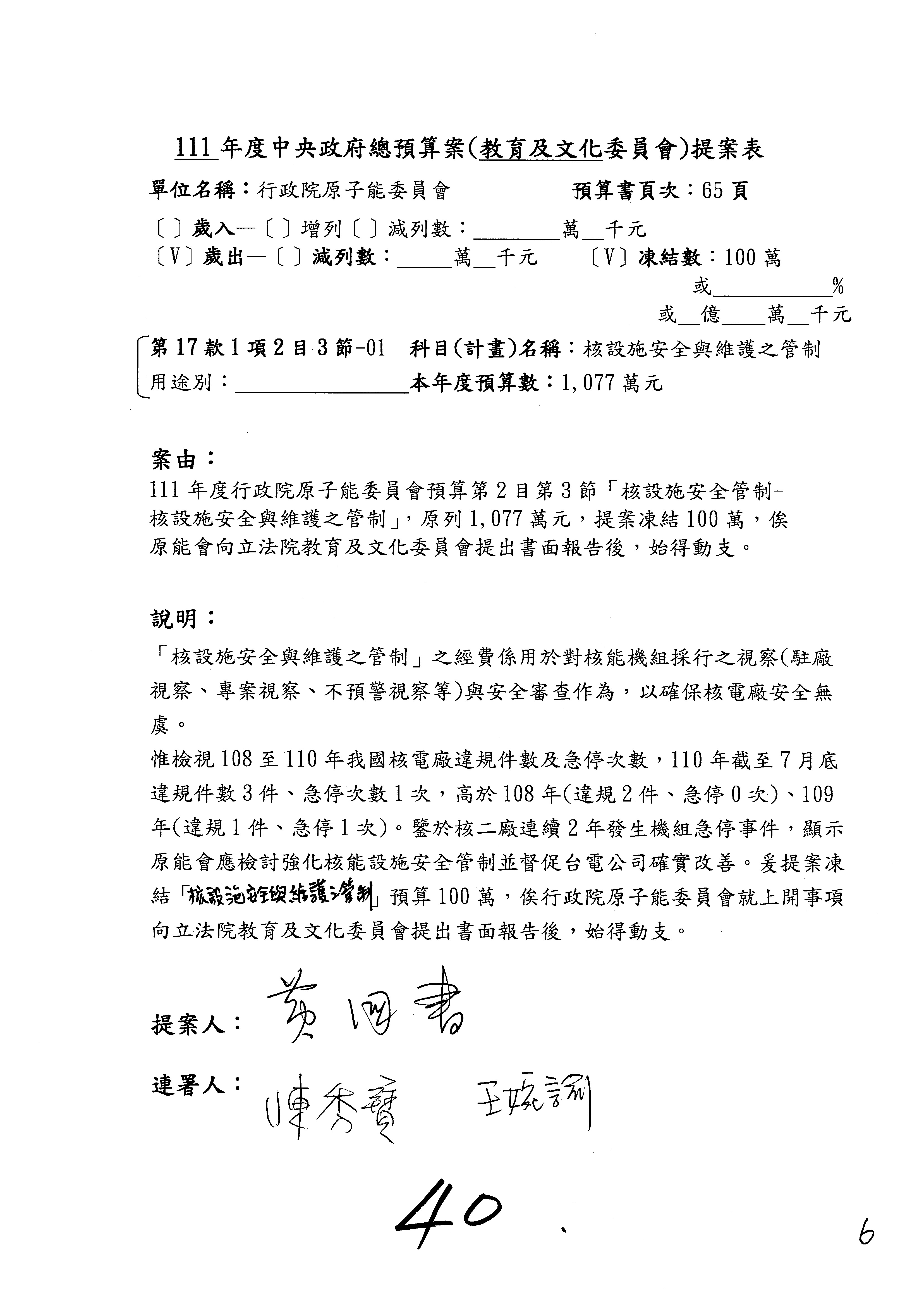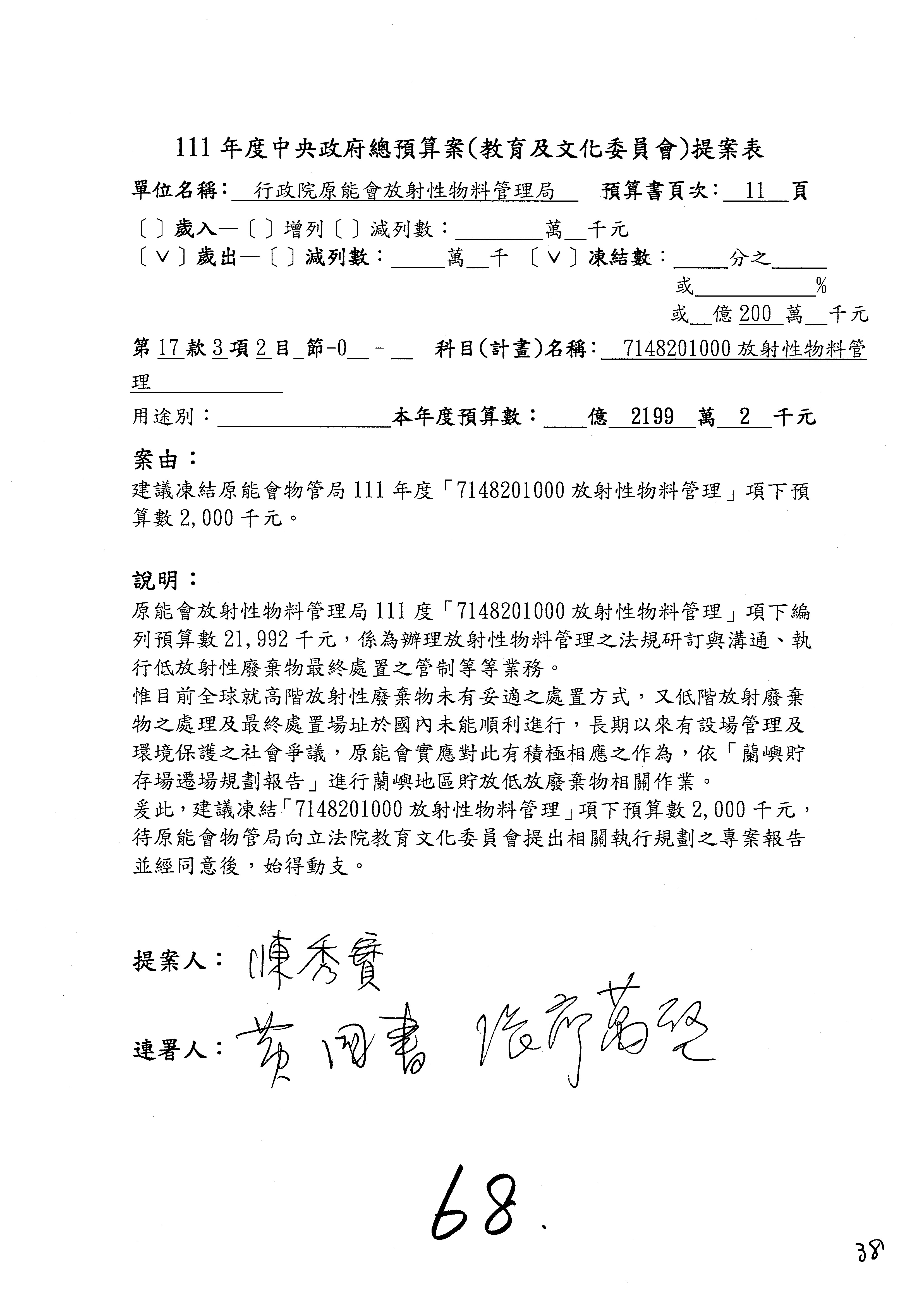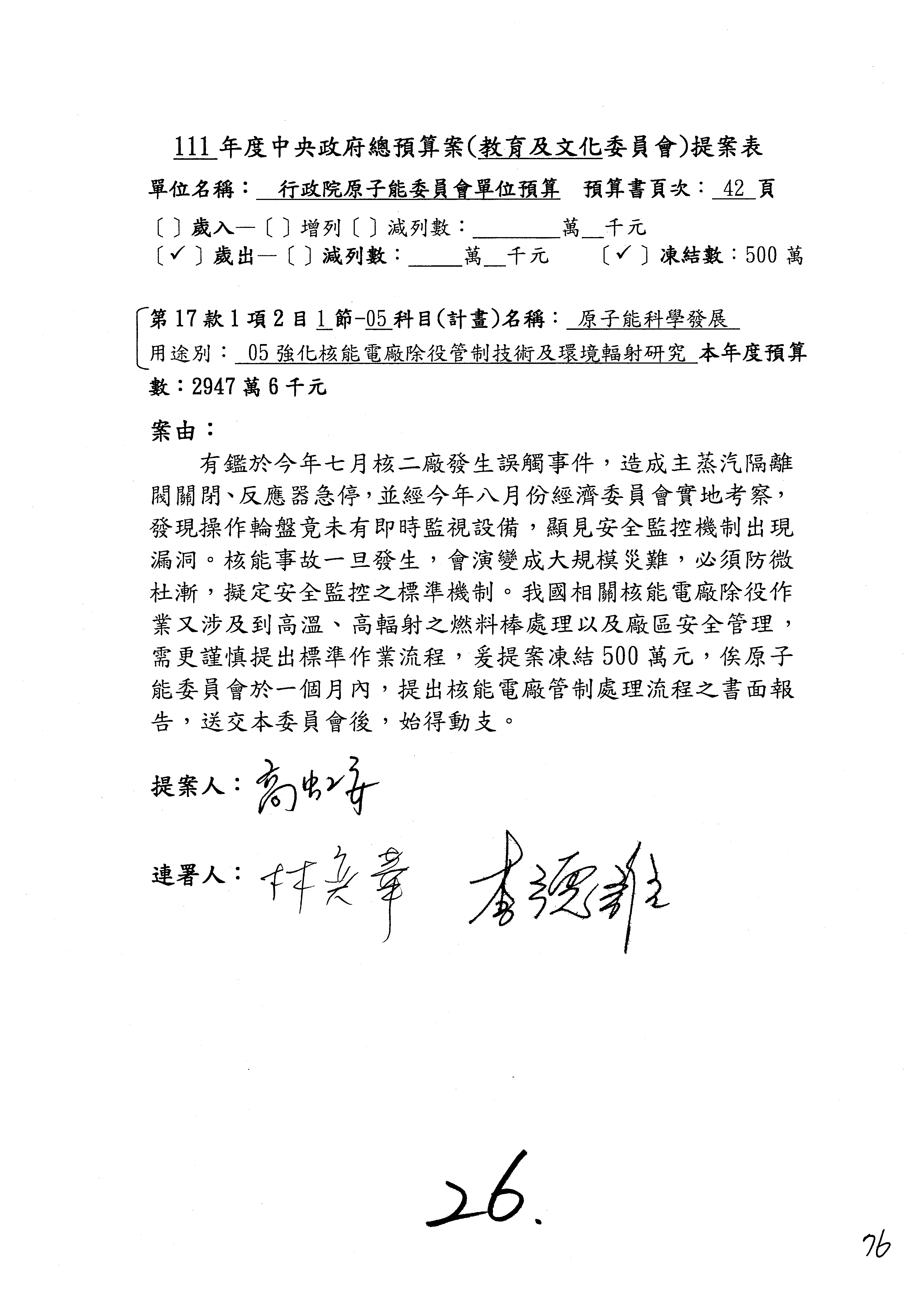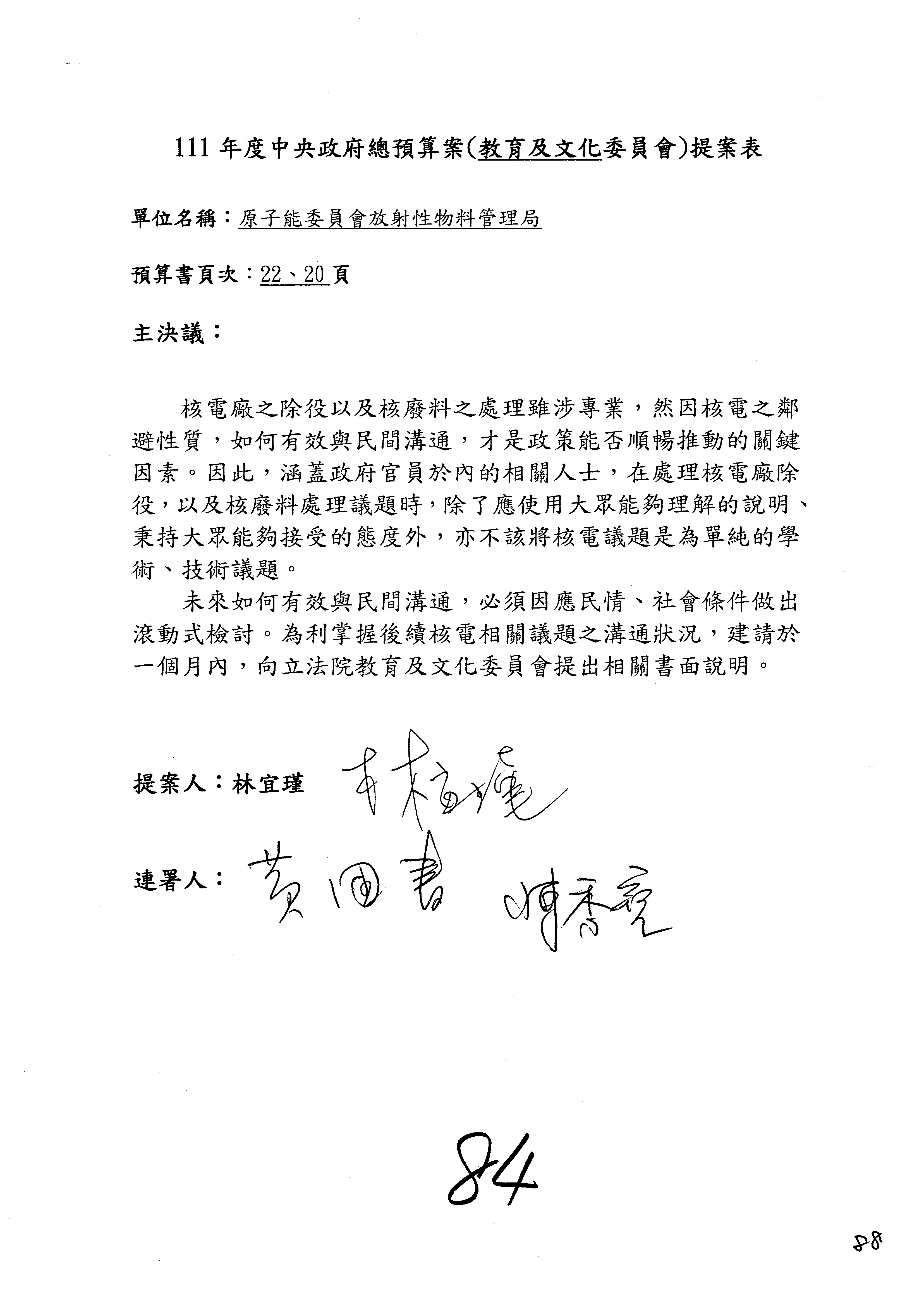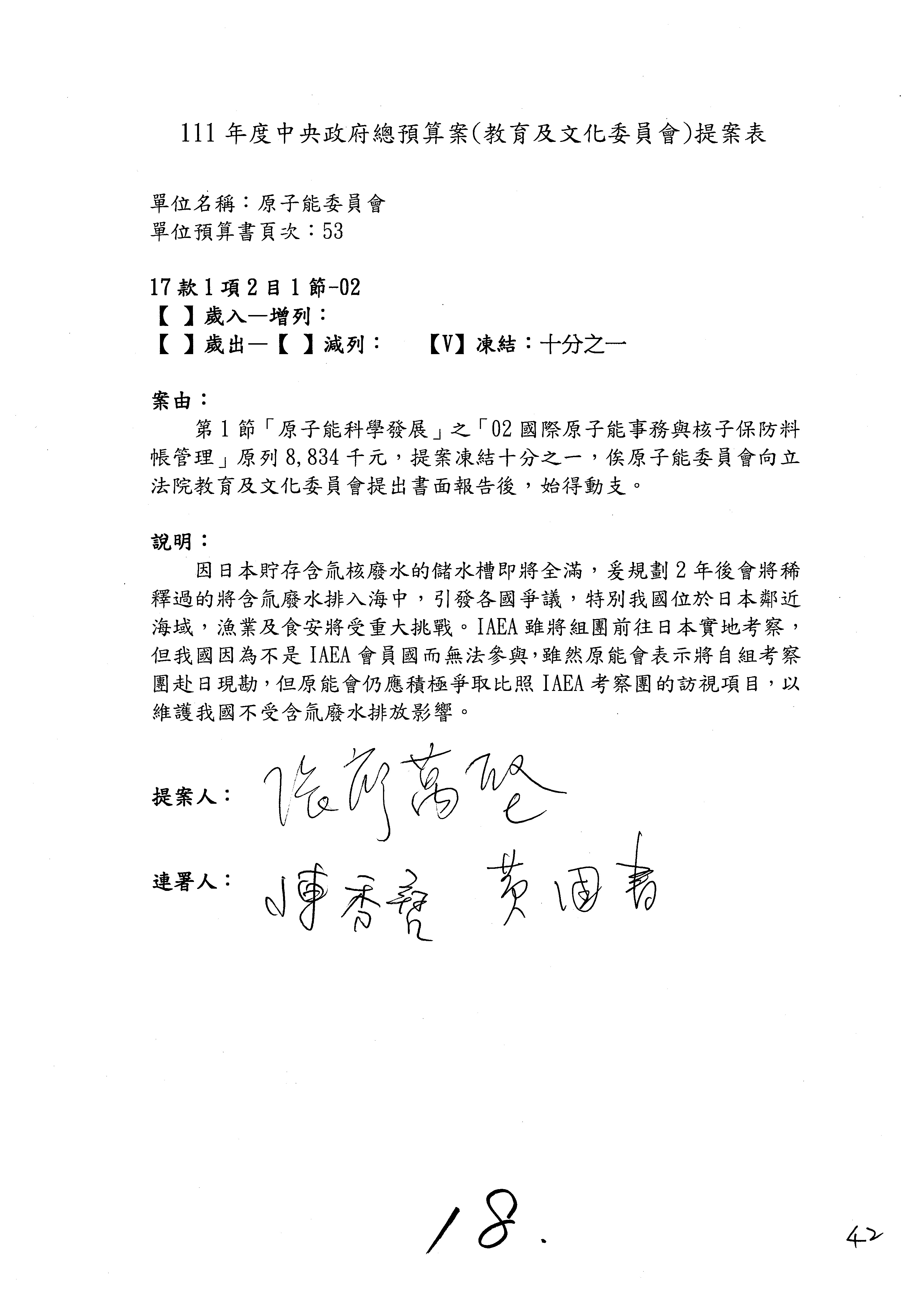 針對第92案,這部分是關於核設施除役作業、放射性廢棄物處理貯存及核種鑑定分析設施安全強化改善等工作,原能會核研所自102年度到110年度已經辦理兩期管制區的安全強化改善計畫,但第二期進度有落後的狀況,雖然你們表示針對落後的部分,在明年上半年度可以趕上來,但基於我們監督行政機關執行預算的職責,還是希望你們能夠確實掌握相關計畫的執行進度。原來本席的提凍金額是1,000萬元,但我也沒有堅持一定要凍結,這部分也可以與其他委員的提案併案處理,但是有關書面報告的部分,我希望你們能夠自行檢討,然後在書面報告裡面說明,謝謝。