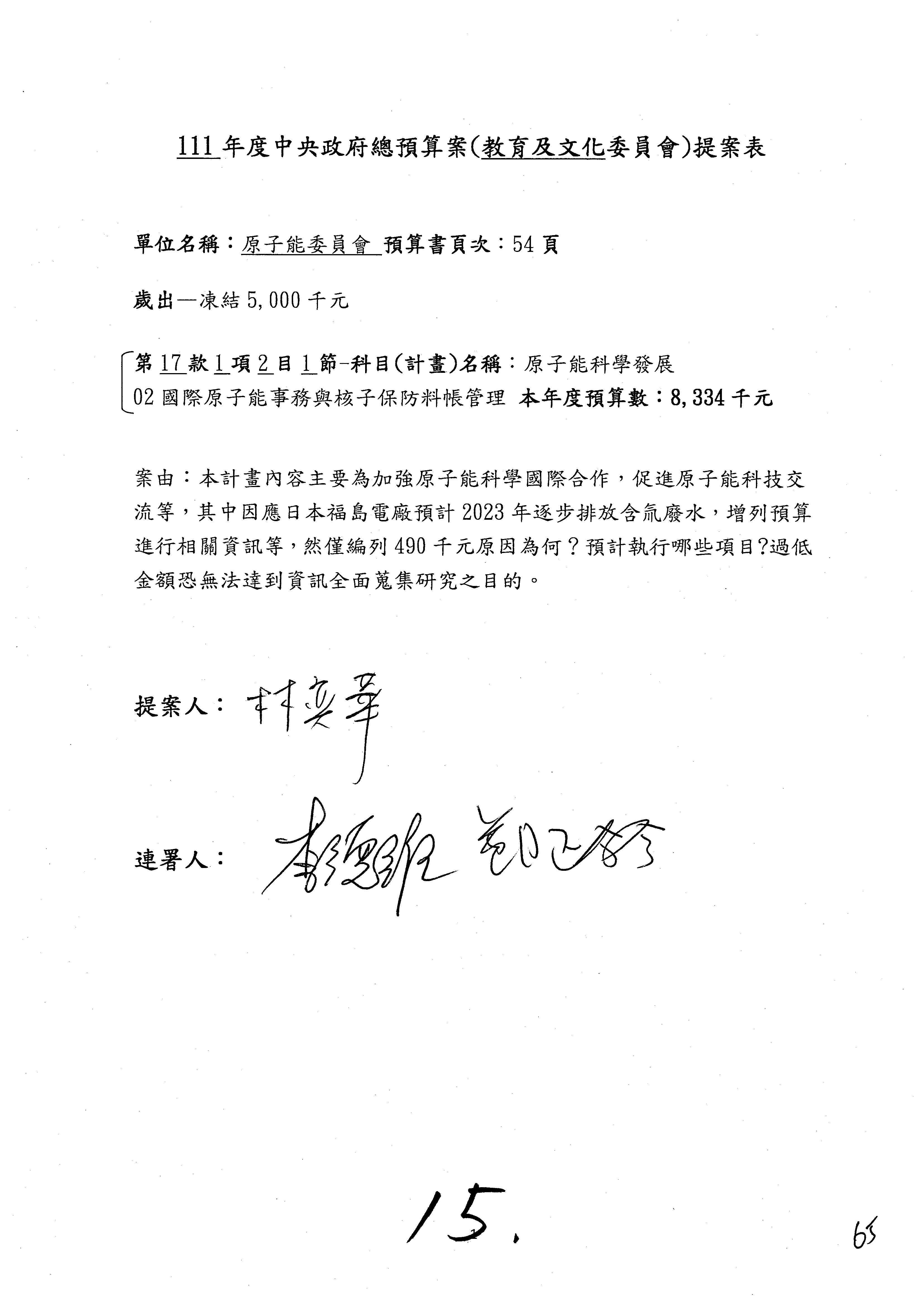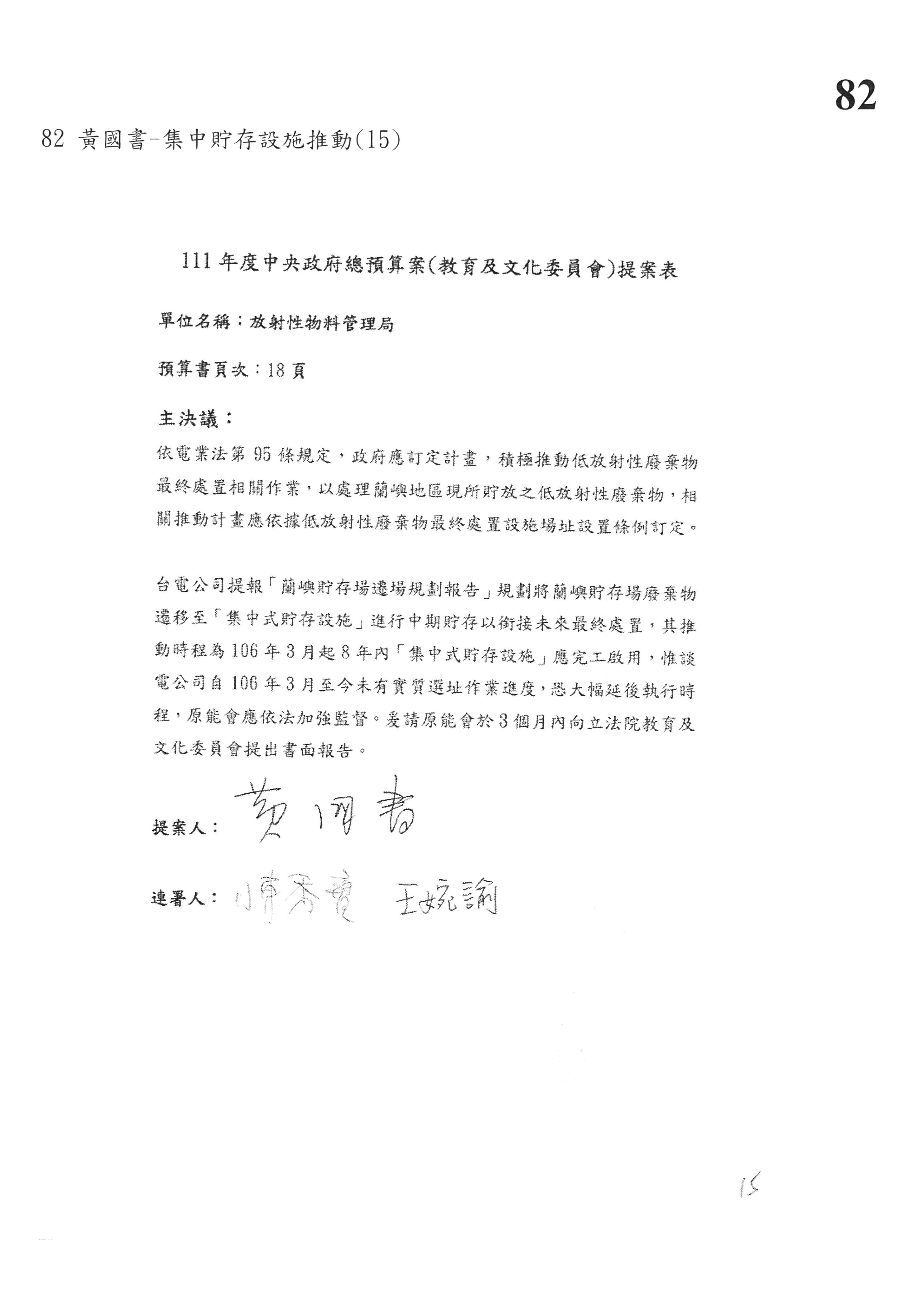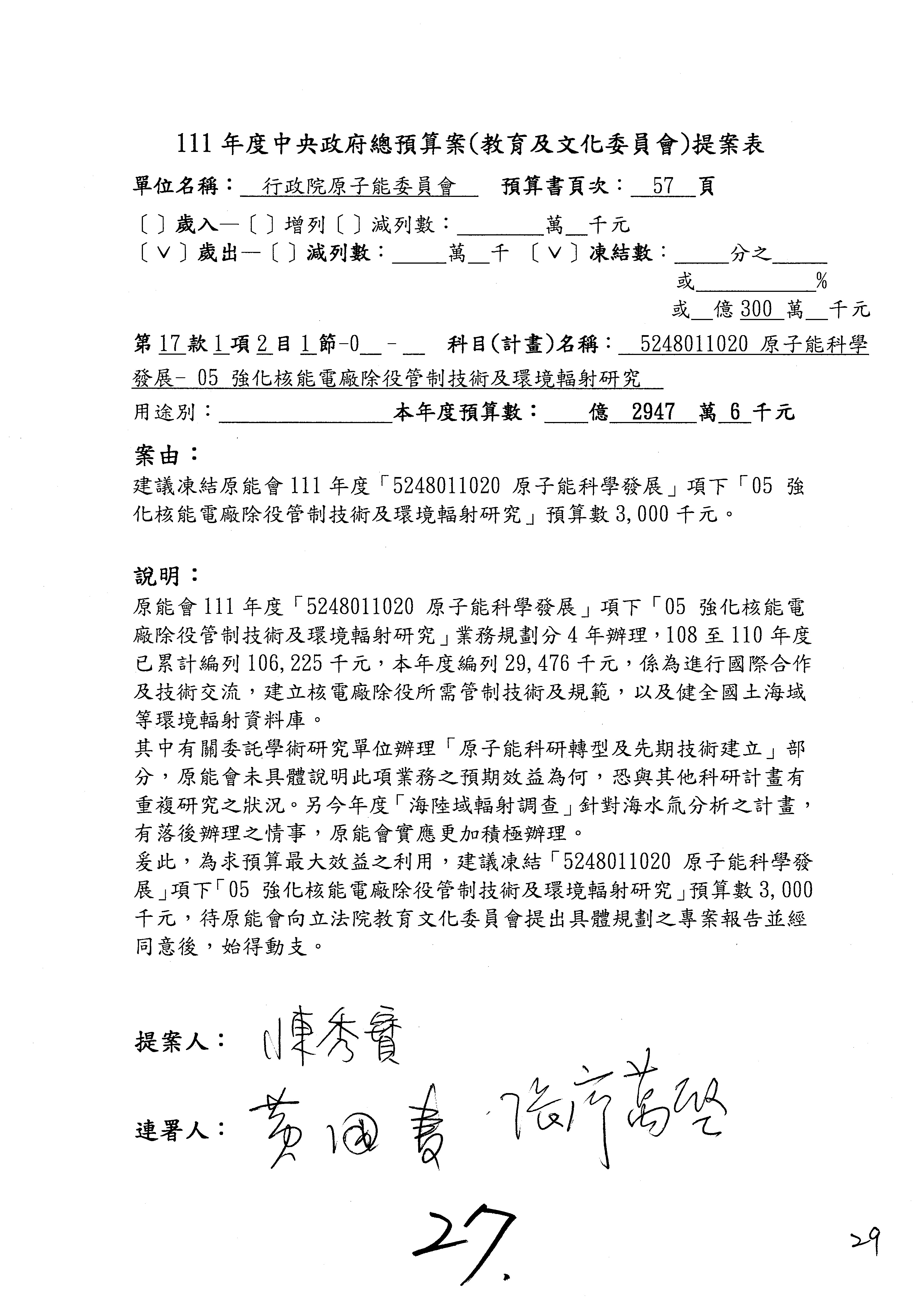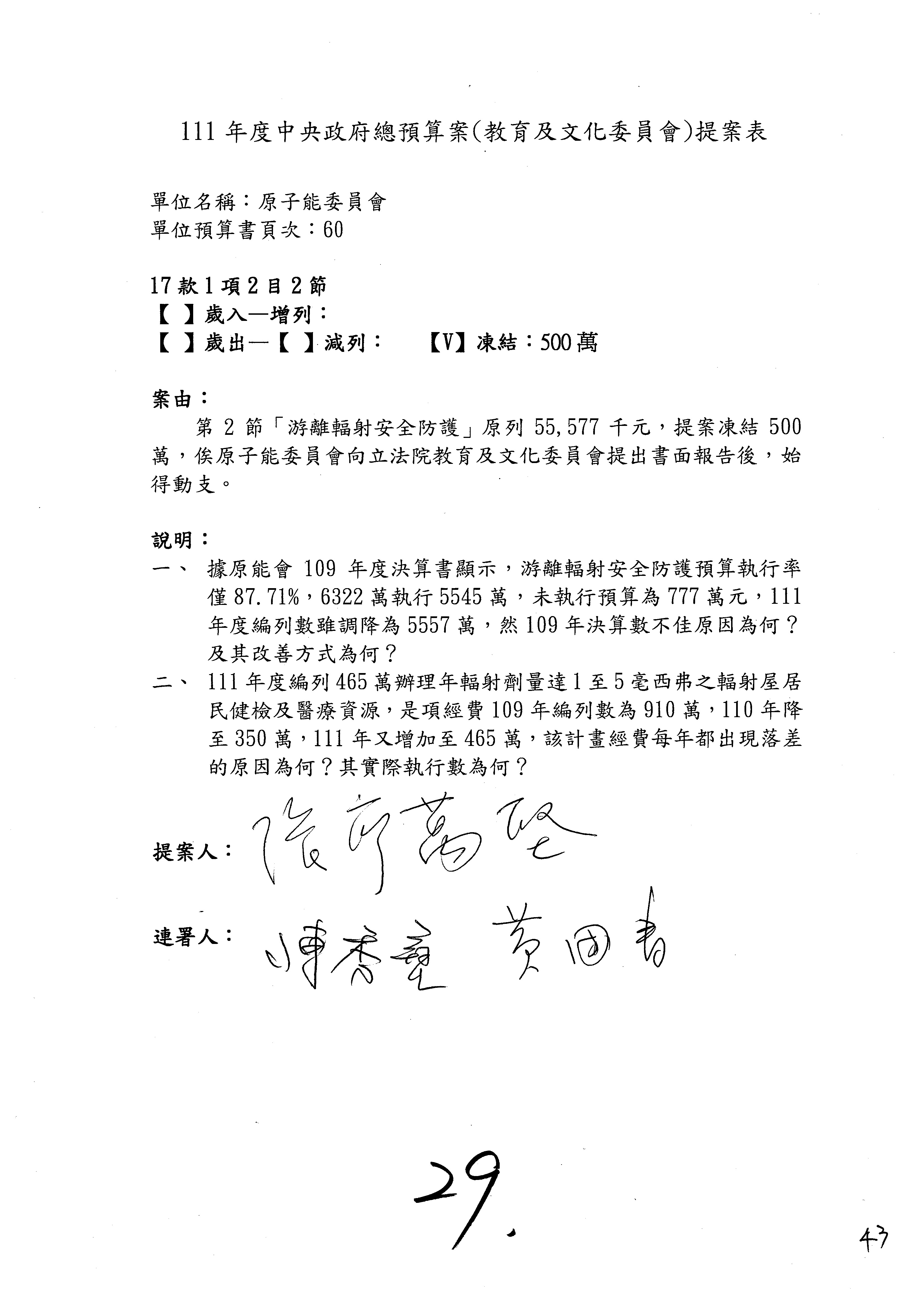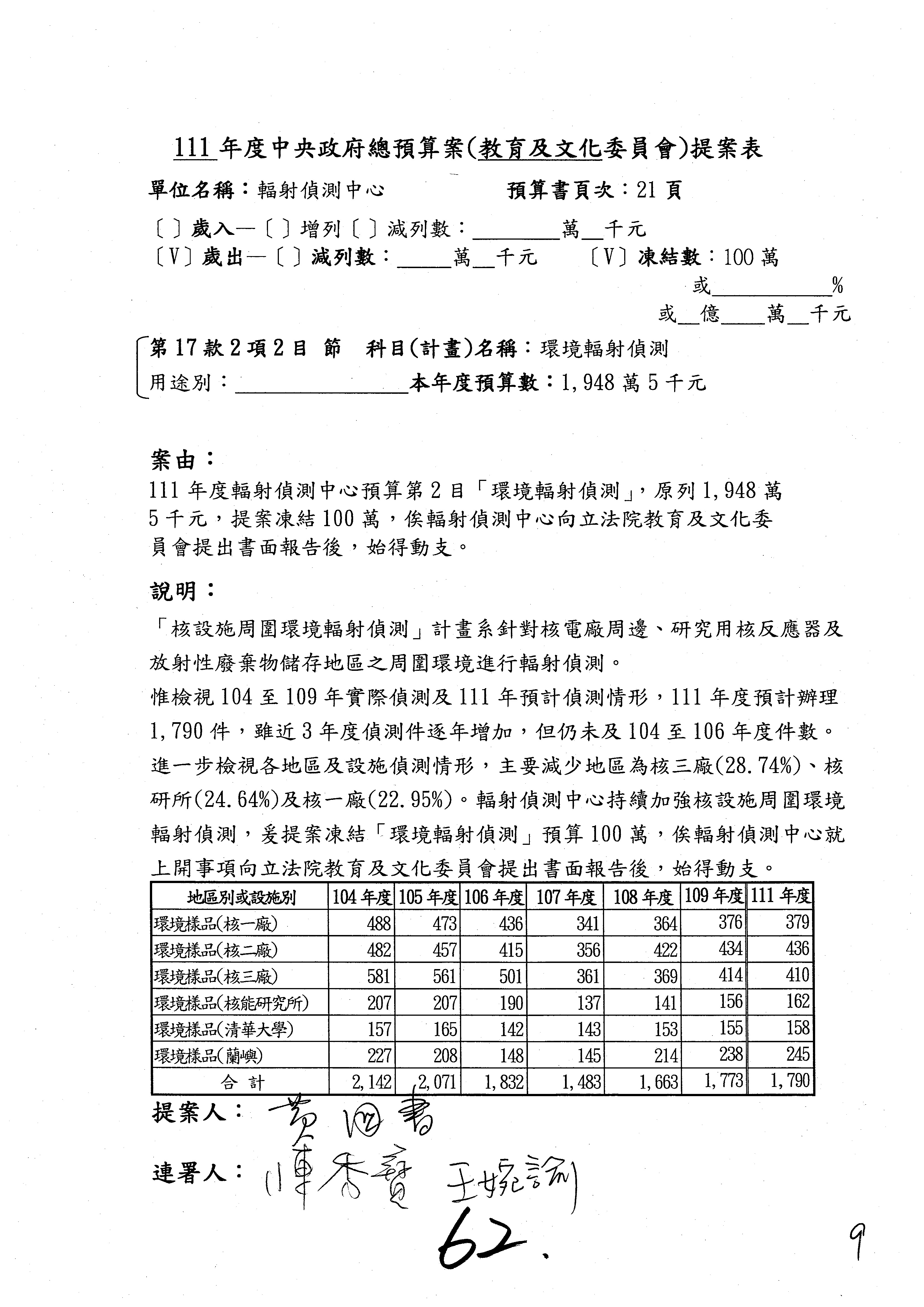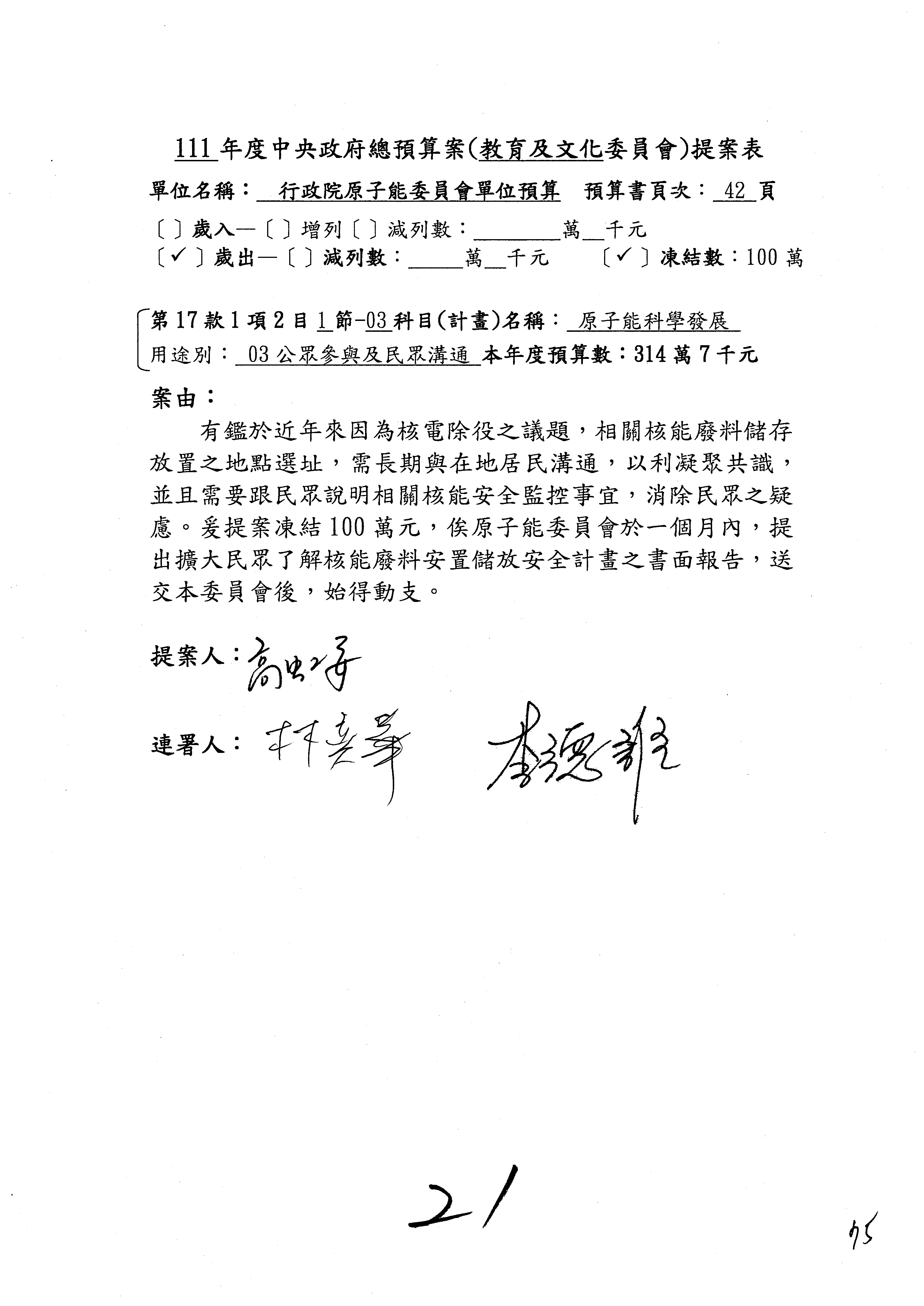 針對第92案,這部分是關於核設施除役作業、放射性廢棄物處理貯存及核種鑑定分析設施安全強化改善等工作,原能會核研所自102年度到110年度已經辦理兩期管制區的安全強化改善計畫,但第二期進度有落後的狀況,雖然你們表示針對落後的部分,在明年上半年度可以趕上來,但基於我們監督行政機關執行預算的職責,還是希望你們能夠確實掌握相關計畫的執行進度。原來本席的提凍金額是1,000萬元,但我也沒有堅持一定要凍結,這部分也可以與其他委員的提案併案處理,但是有關書面報告的部分,我希望你們能夠自行檢討,然後在書面報告裡面說明,謝謝。