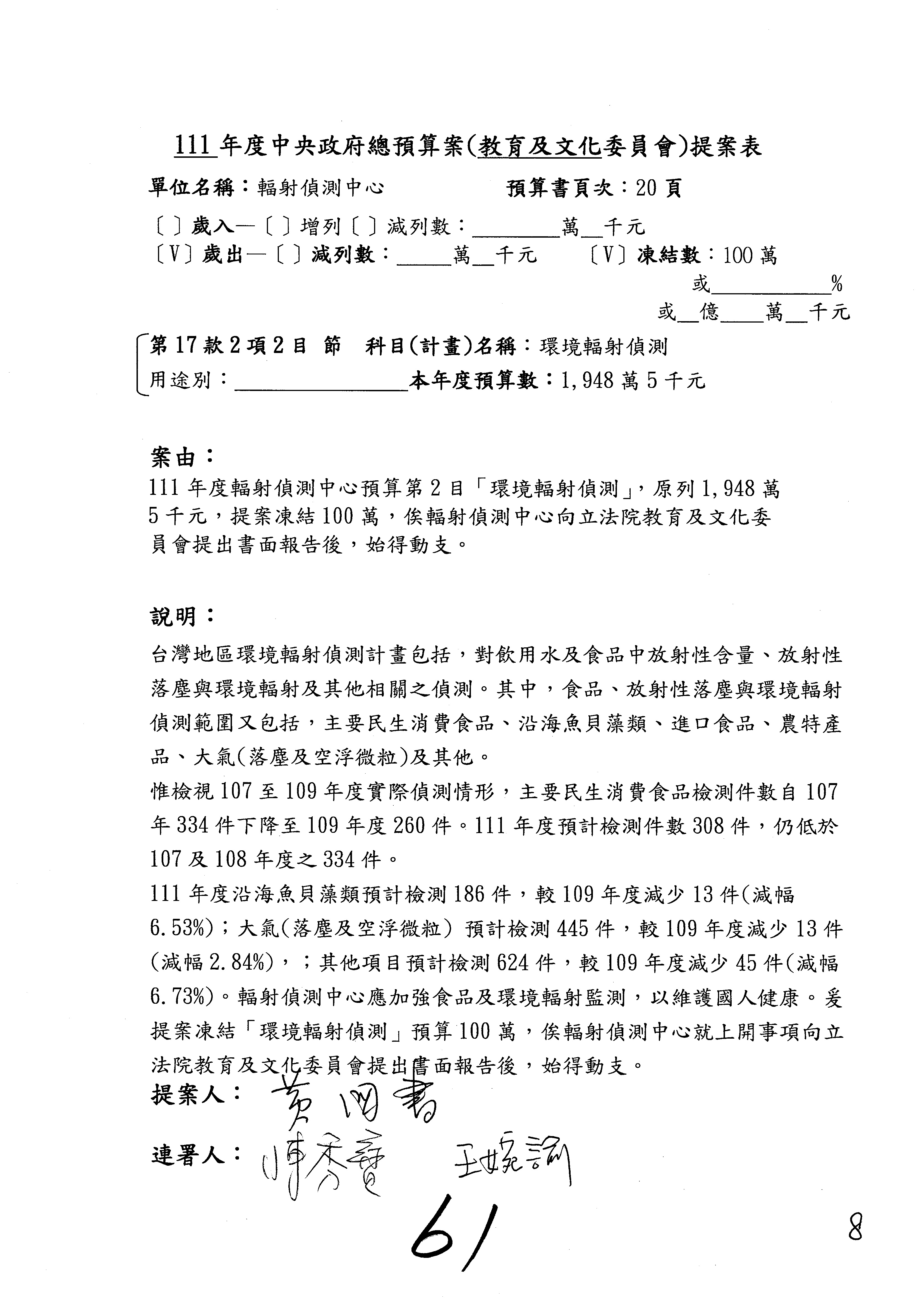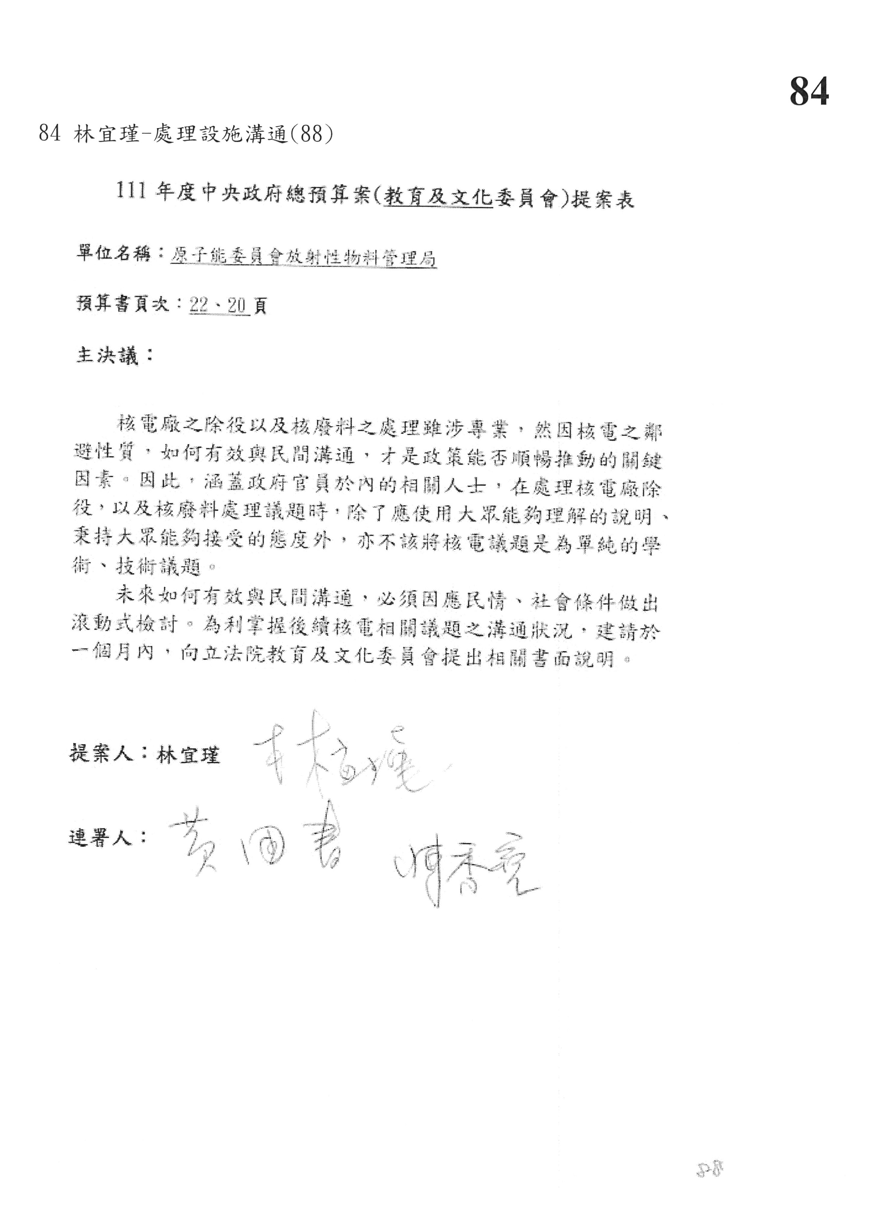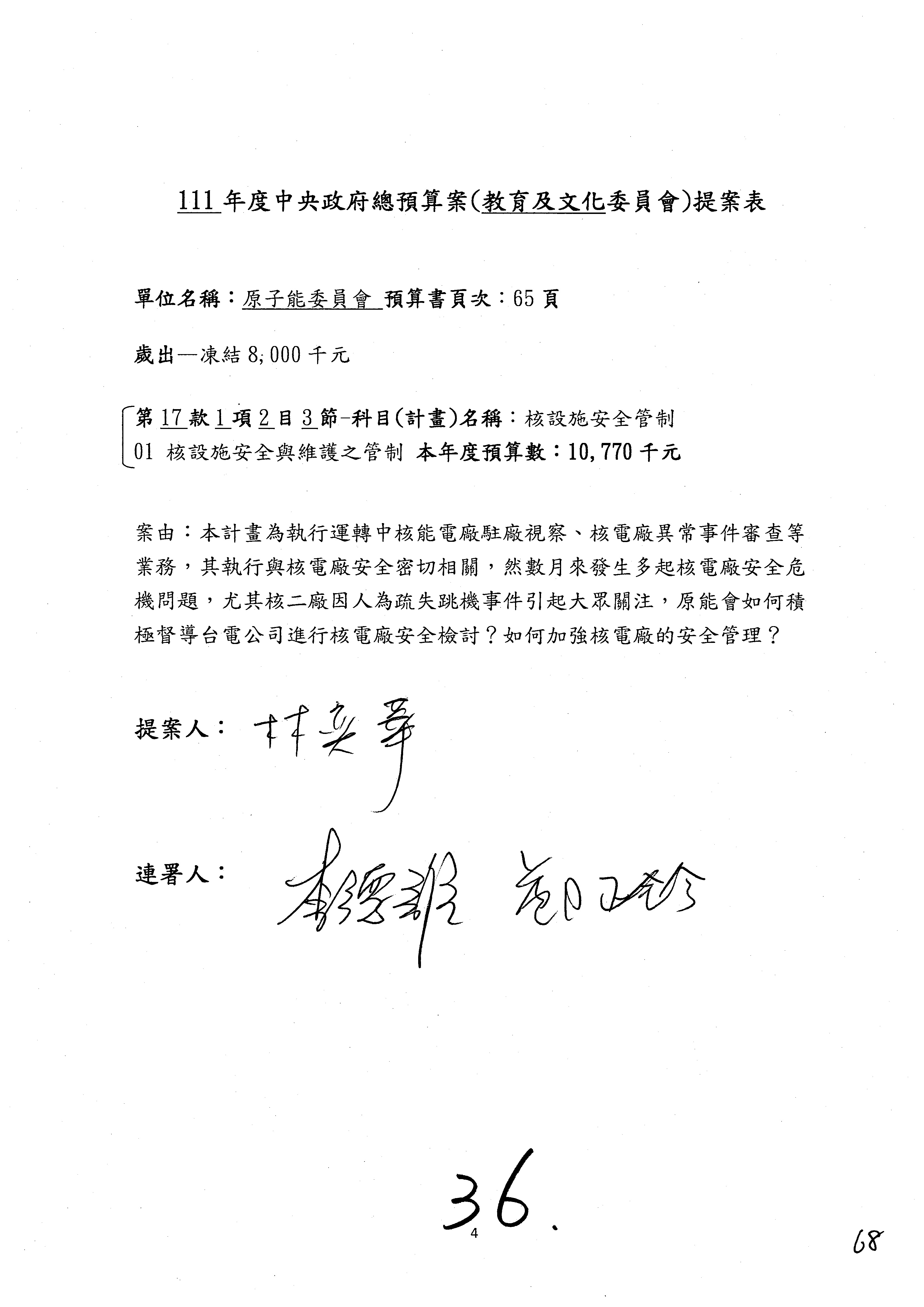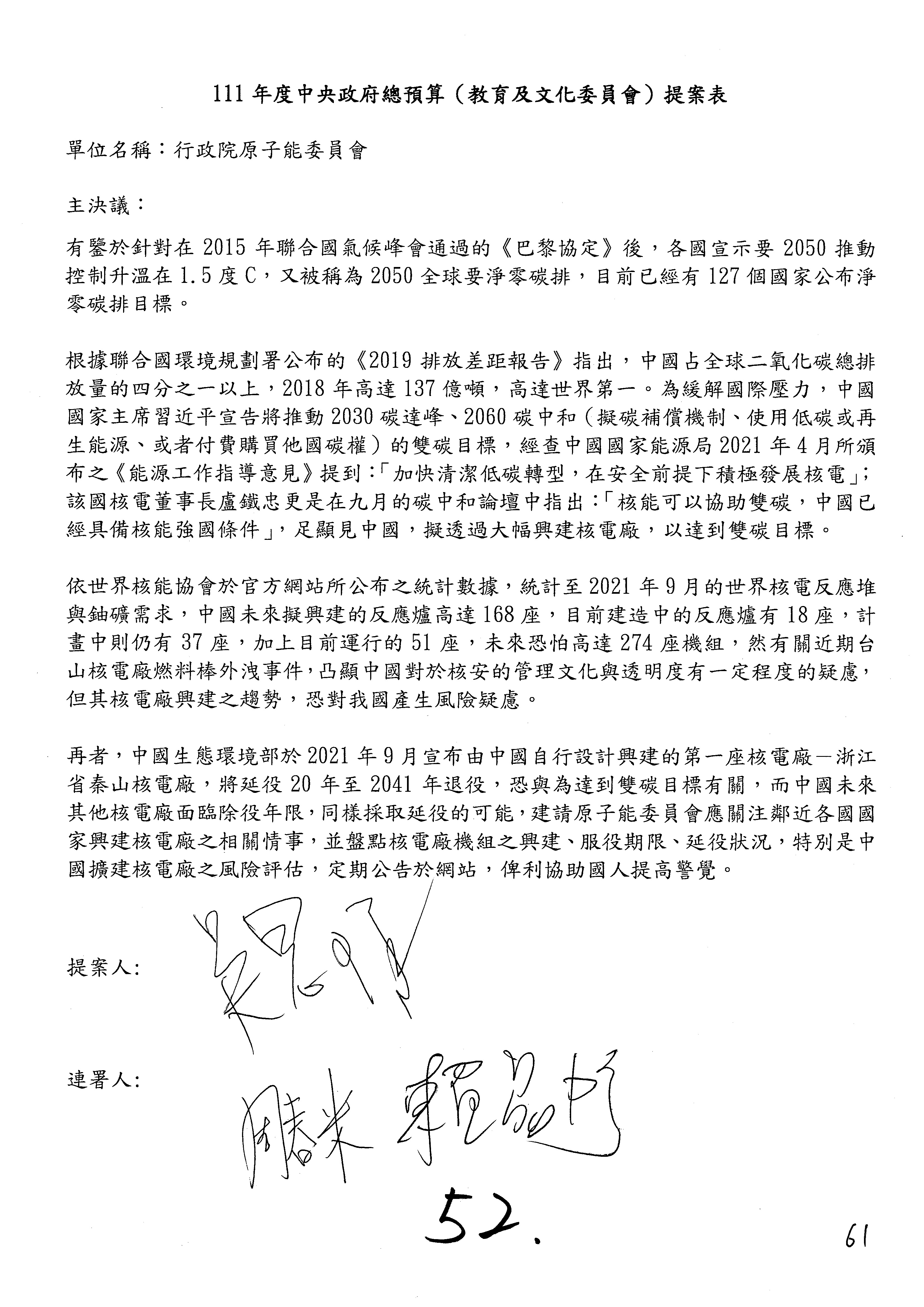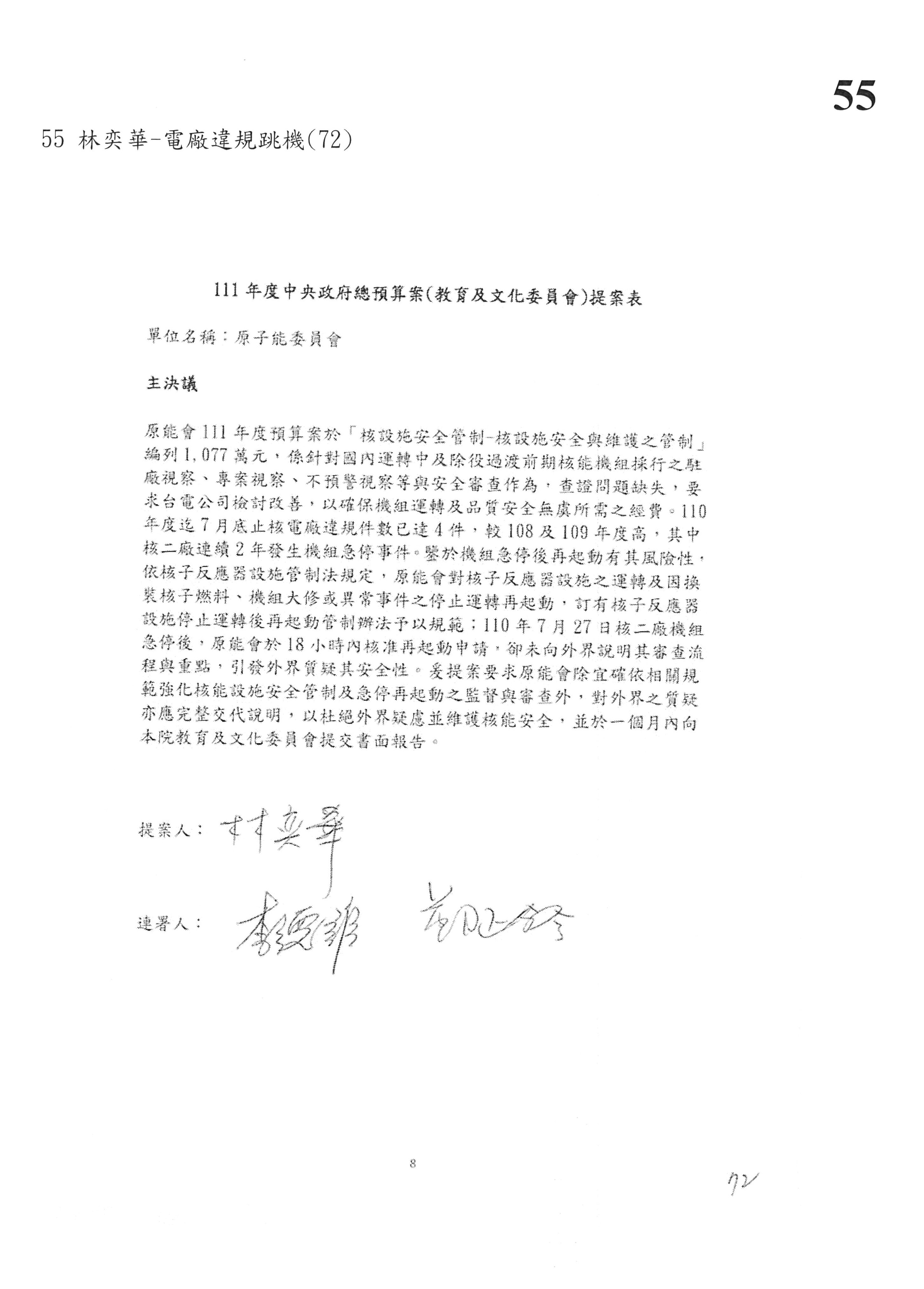 針對第92案,這部分是關於核設施除役作業、放射性廢棄物處理貯存及核種鑑定分析設施安全強化改善等工作,原能會核研所自102年度到110年度已經辦理兩期管制區的安全強化改善計畫,但第二期進度有落後的狀況,雖然你們表示針對落後的部分,在明年上半年度可以趕上來,但基於我們監督行政機關執行預算的職責,還是希望你們能夠確實掌握相關計畫的執行進度。原來本席的提凍金額是1,000萬元,但我也沒有堅持一定要凍結,這部分也可以與其他委員的提案併案處理,但是有關書面報告的部分,我希望你們能夠自行檢討,然後在書面報告裡面說明,謝謝。