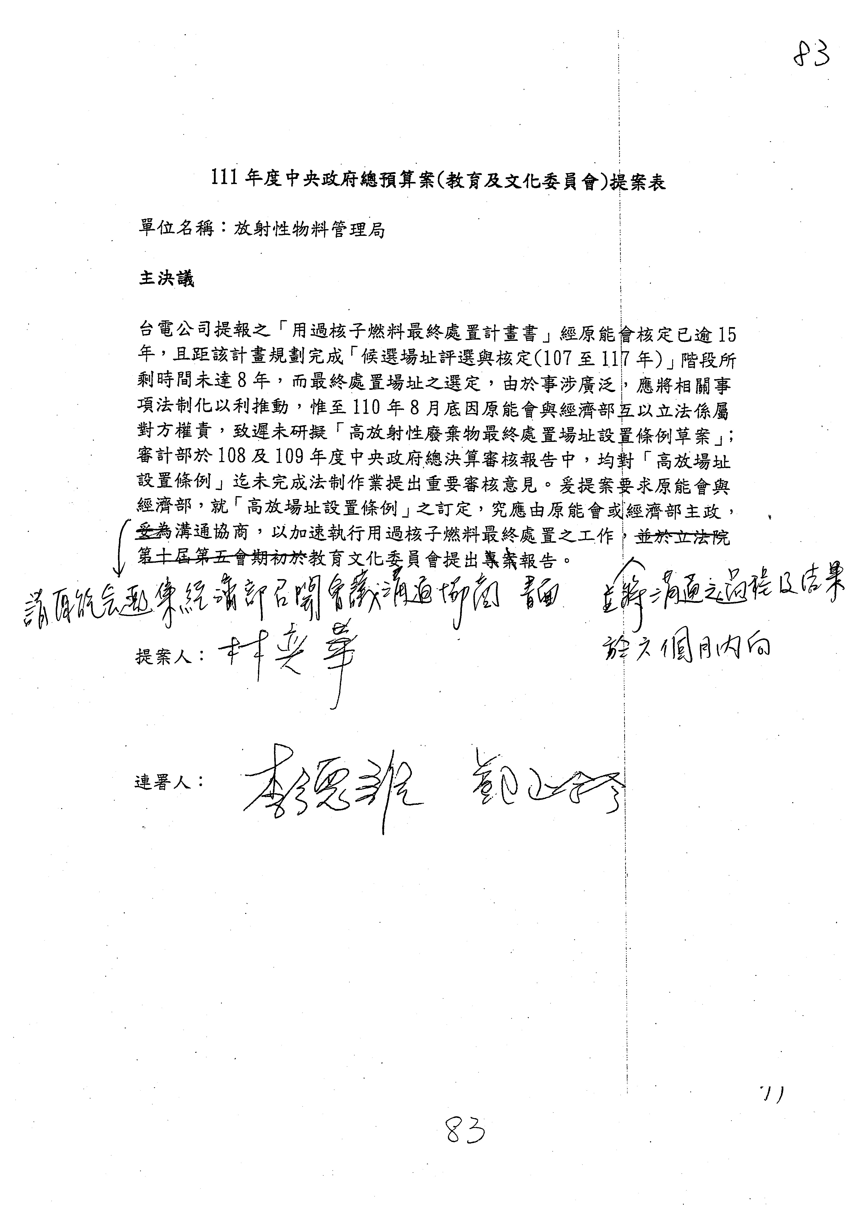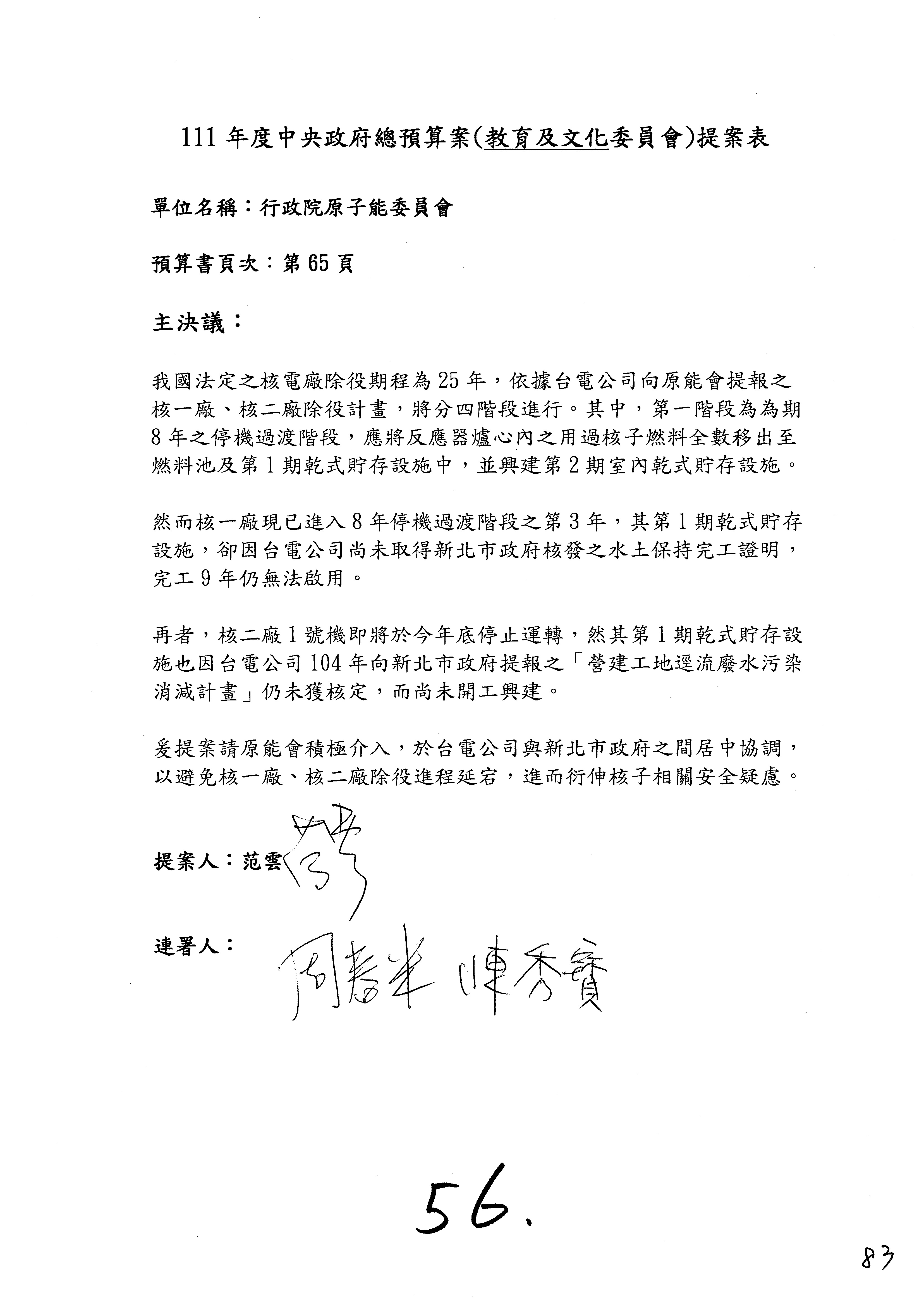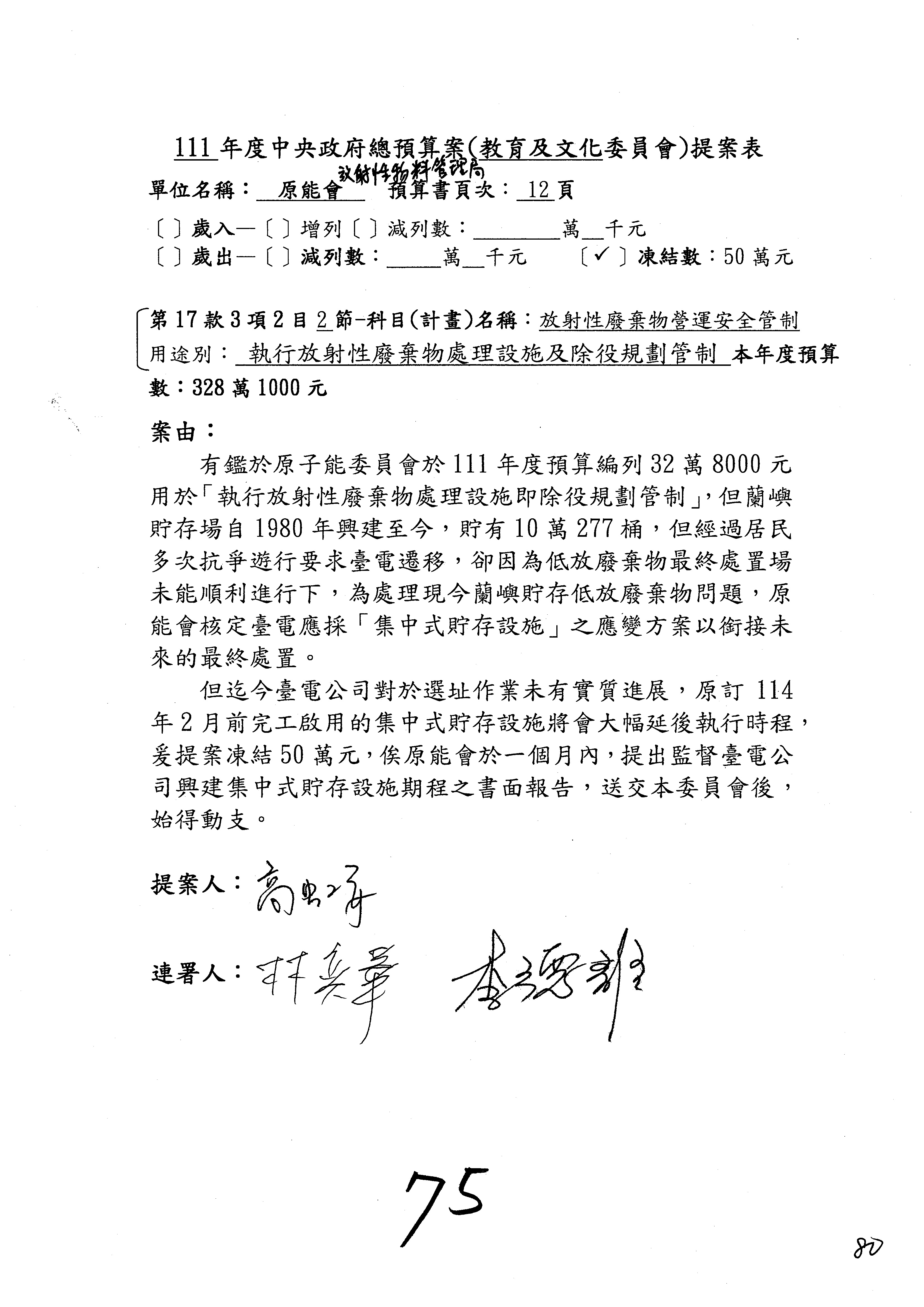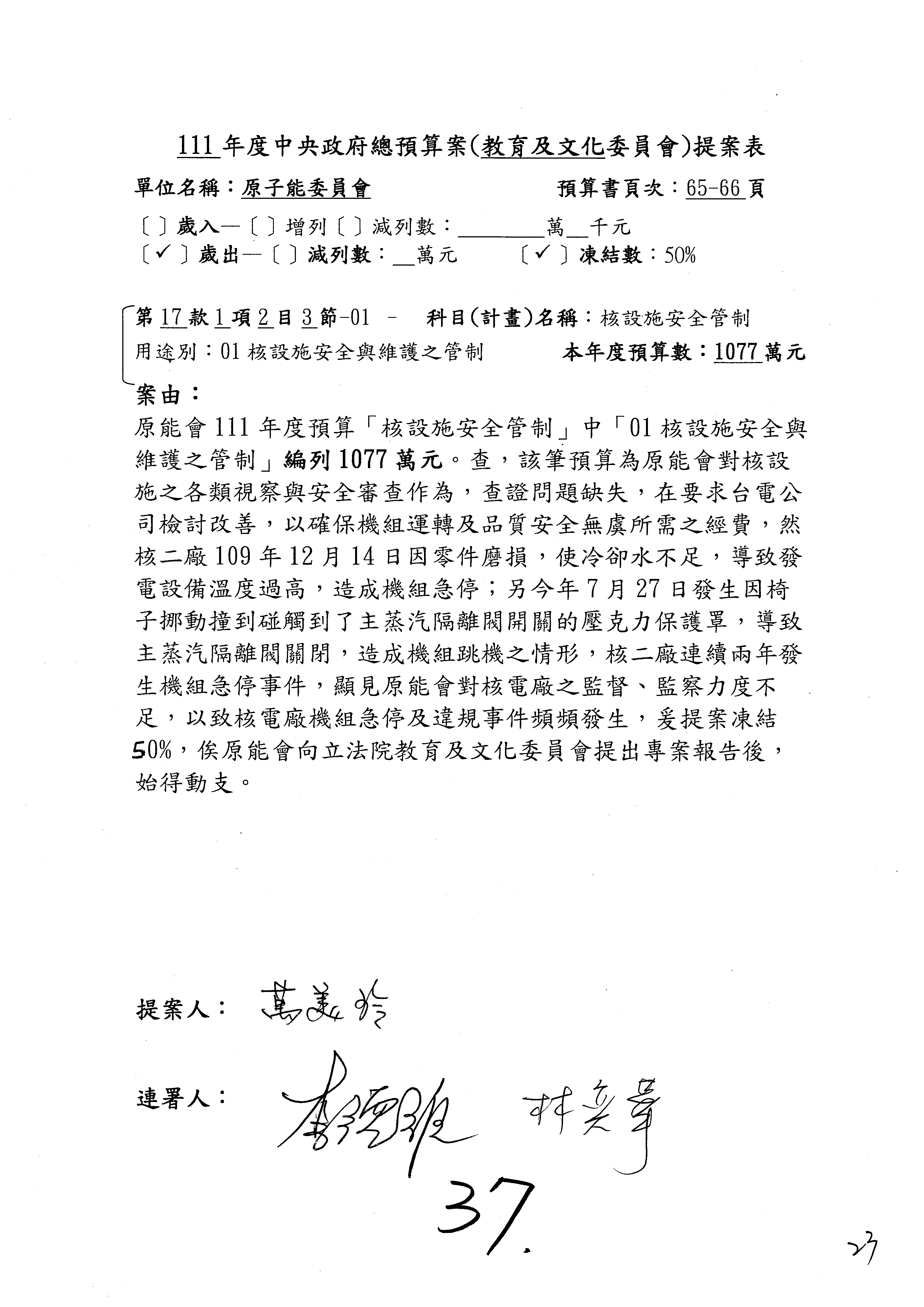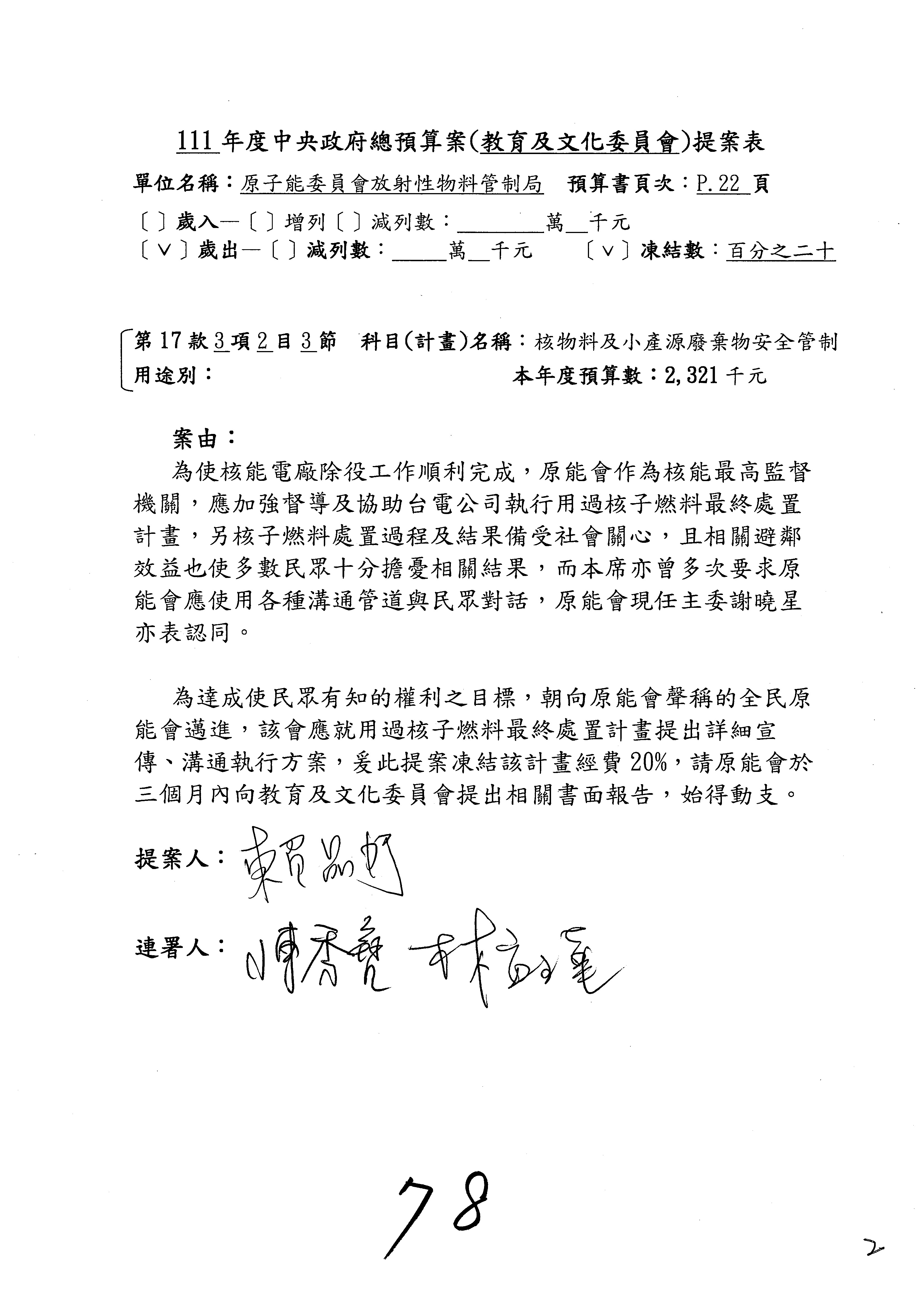 針對第92案,這部分是關於核設施除役作業、放射性廢棄物處理貯存及核種鑑定分析設施安全強化改善等工作,原能會核研所自102年度到110年度已經辦理兩期管制區的安全強化改善計畫,但第二期進度有落後的狀況,雖然你們表示針對落後的部分,在明年上半年度可以趕上來,但基於我們監督行政機關執行預算的職責,還是希望你們能夠確實掌握相關計畫的執行進度。原來本席的提凍金額是1,000萬元,但我也沒有堅持一定要凍結,這部分也可以與其他委員的提案併案處理,但是有關書面報告的部分,我希望你們能夠自行檢討,然後在書面報告裡面說明,謝謝。