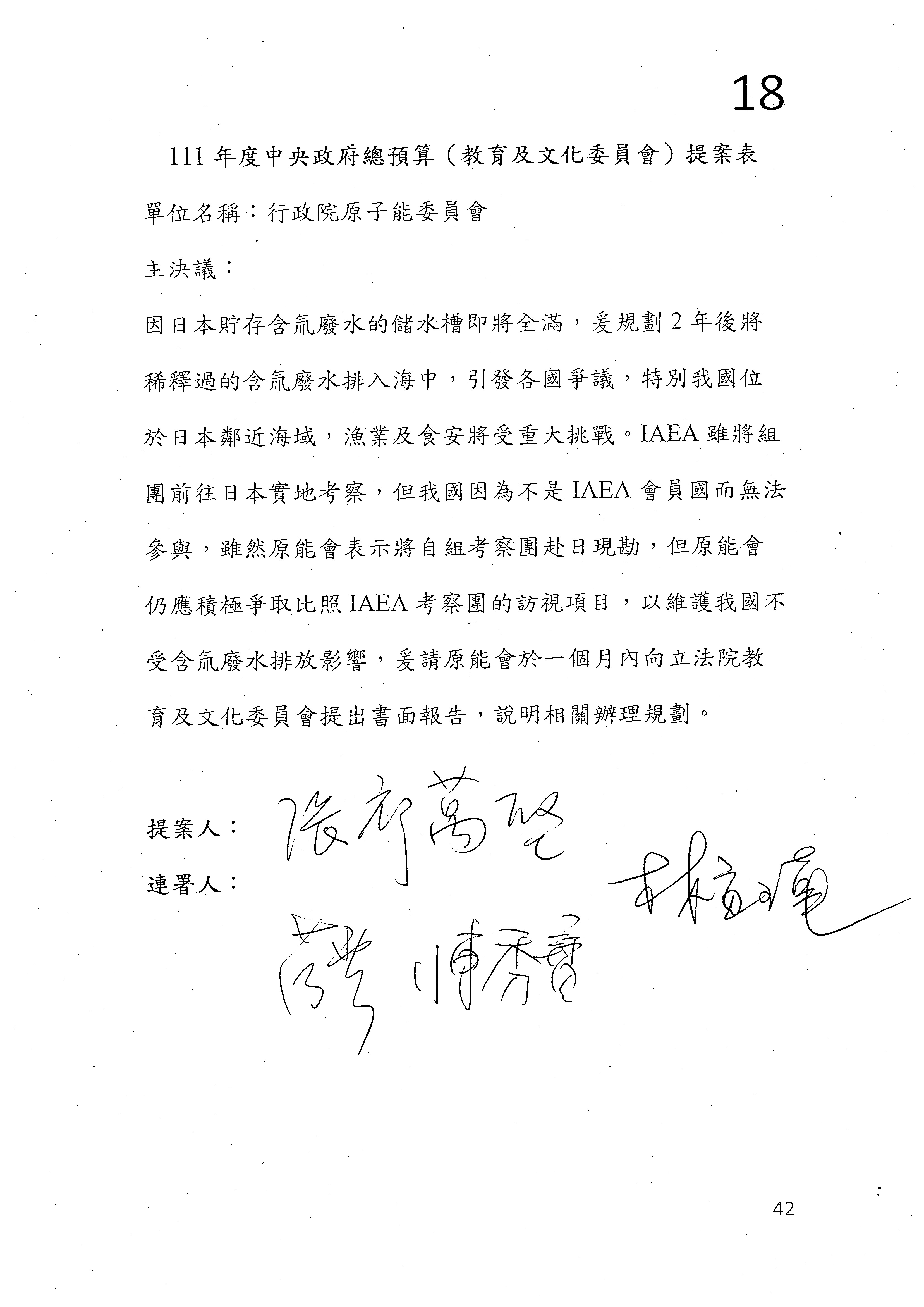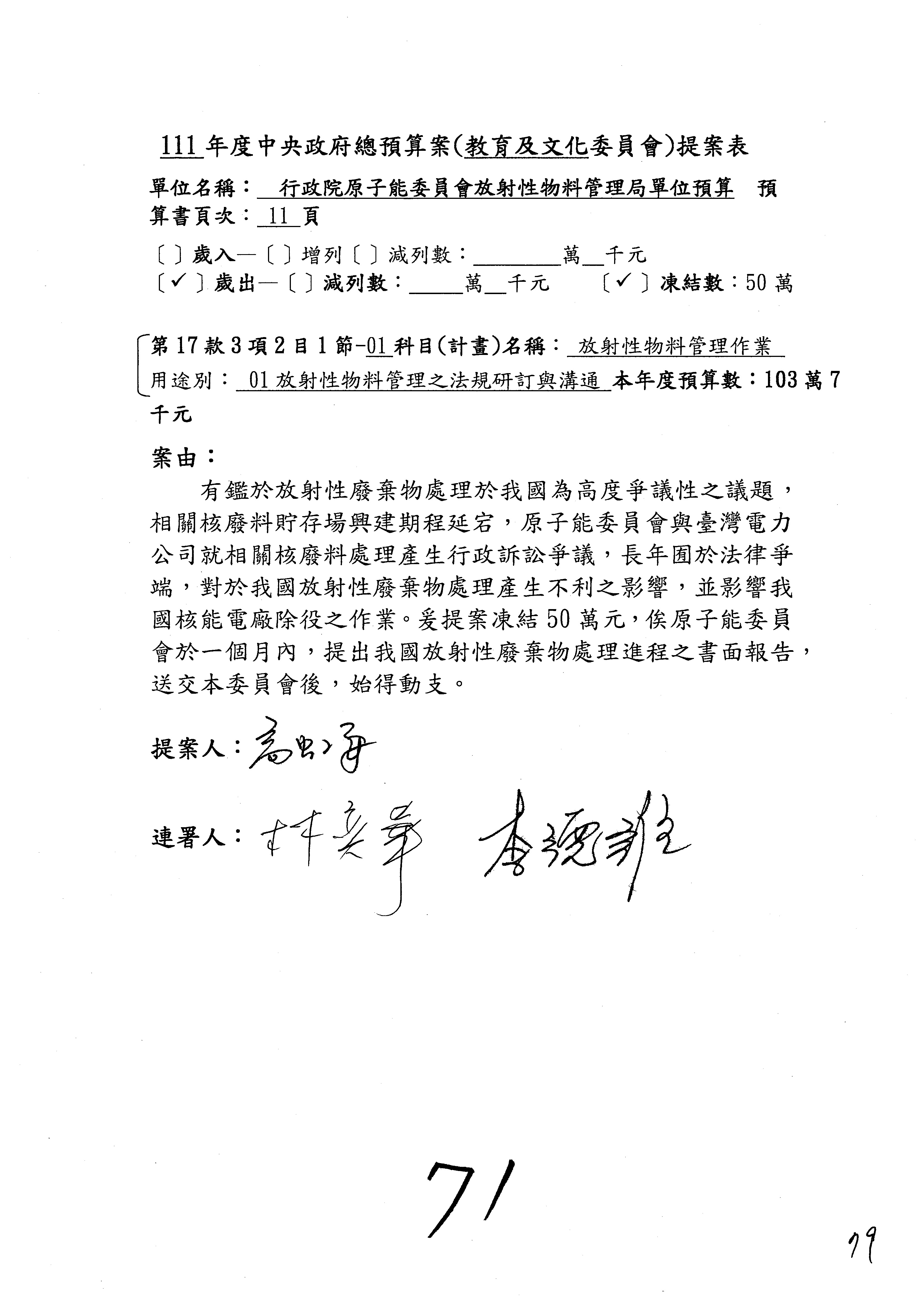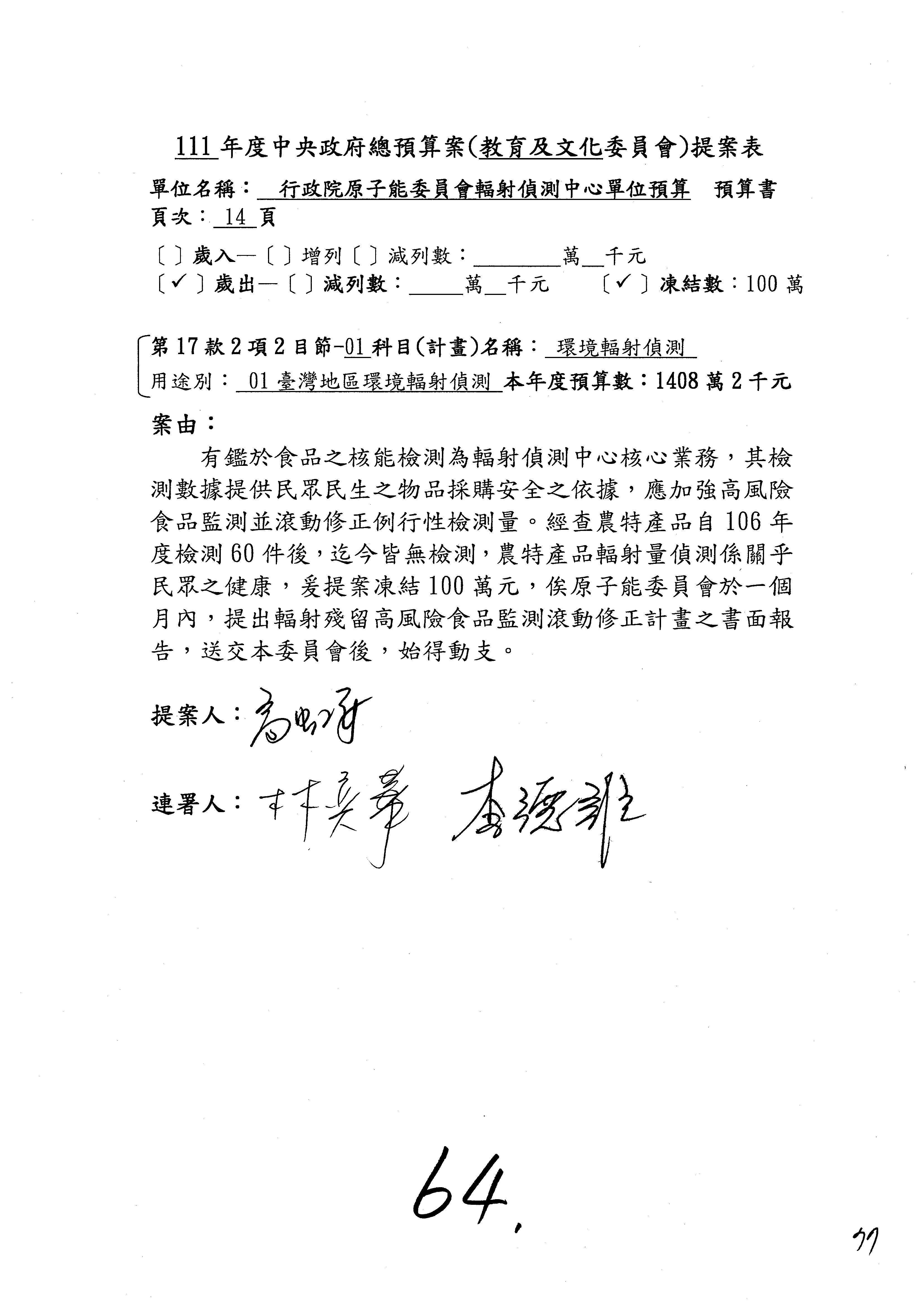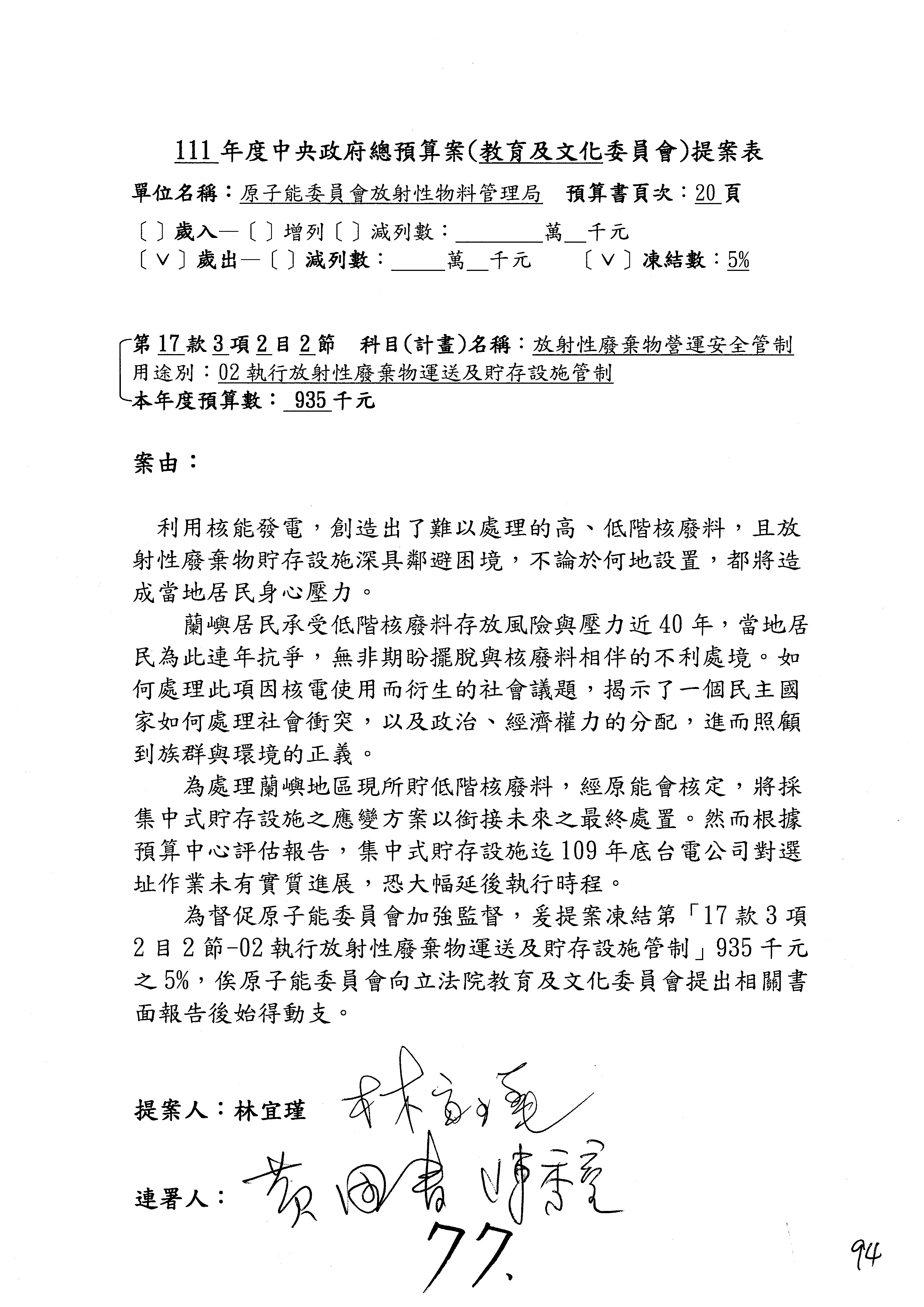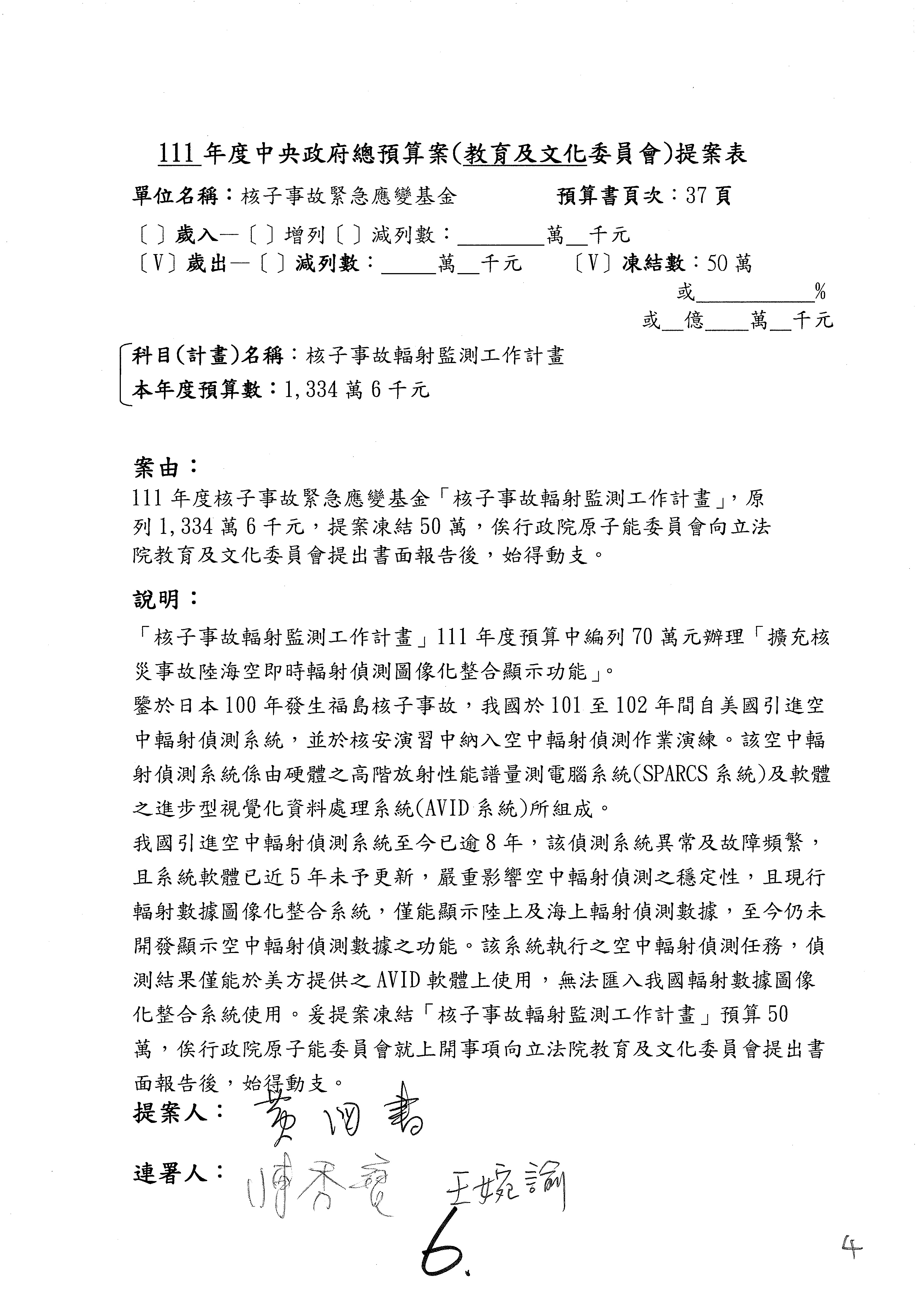 針對第92案,這部分是關於核設施除役作業、放射性廢棄物處理貯存及核種鑑定分析設施安全強化改善等工作,原能會核研所自102年度到110年度已經辦理兩期管制區的安全強化改善計畫,但第二期進度有落後的狀況,雖然你們表示針對落後的部分,在明年上半年度可以趕上來,但基於我們監督行政機關執行預算的職責,還是希望你們能夠確實掌握相關計畫的執行進度。原來本席的提凍金額是1,000萬元,但我也沒有堅持一定要凍結,這部分也可以與其他委員的提案併案處理,但是有關書面報告的部分,我希望你們能夠自行檢討,然後在書面報告裡面說明,謝謝。