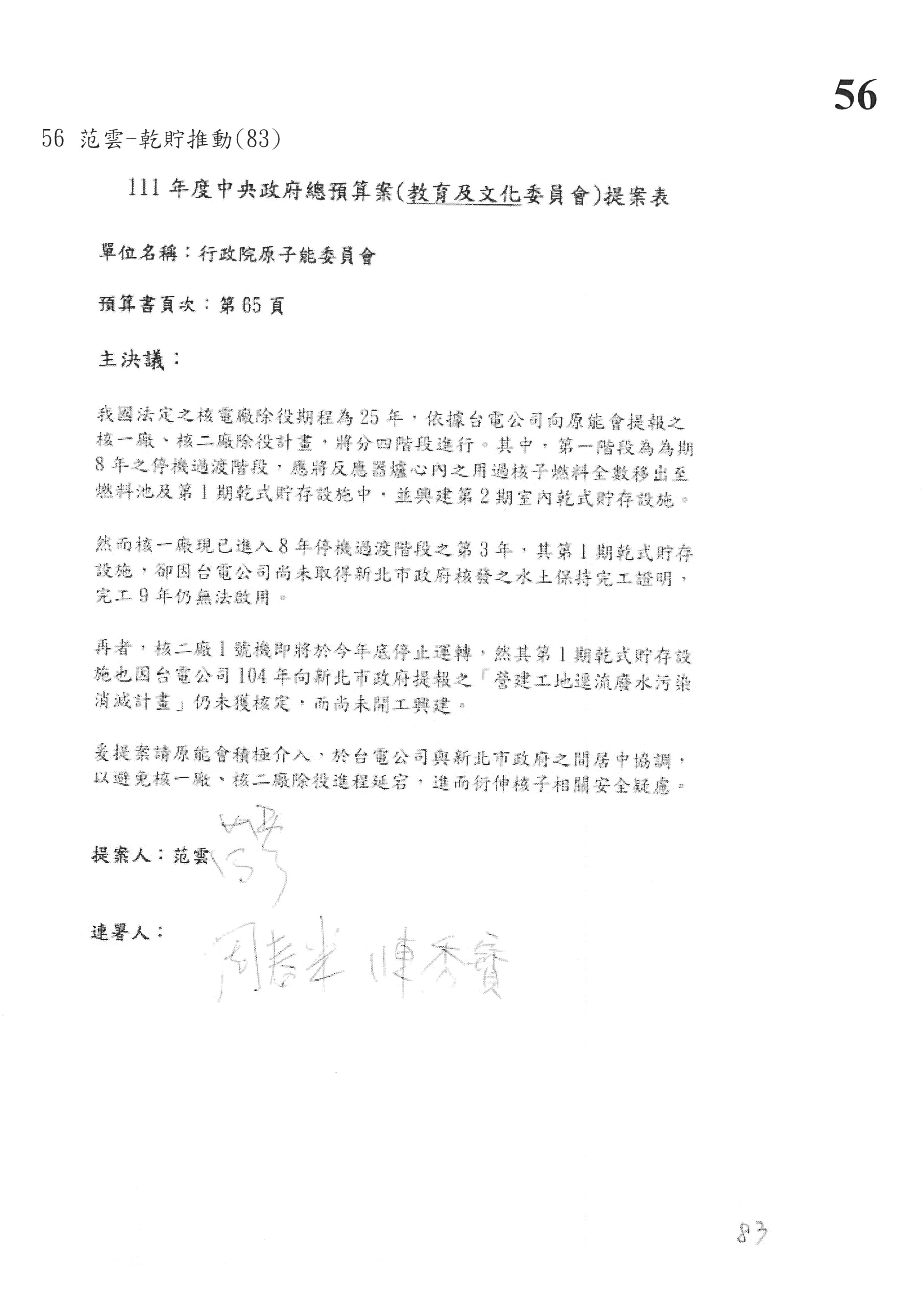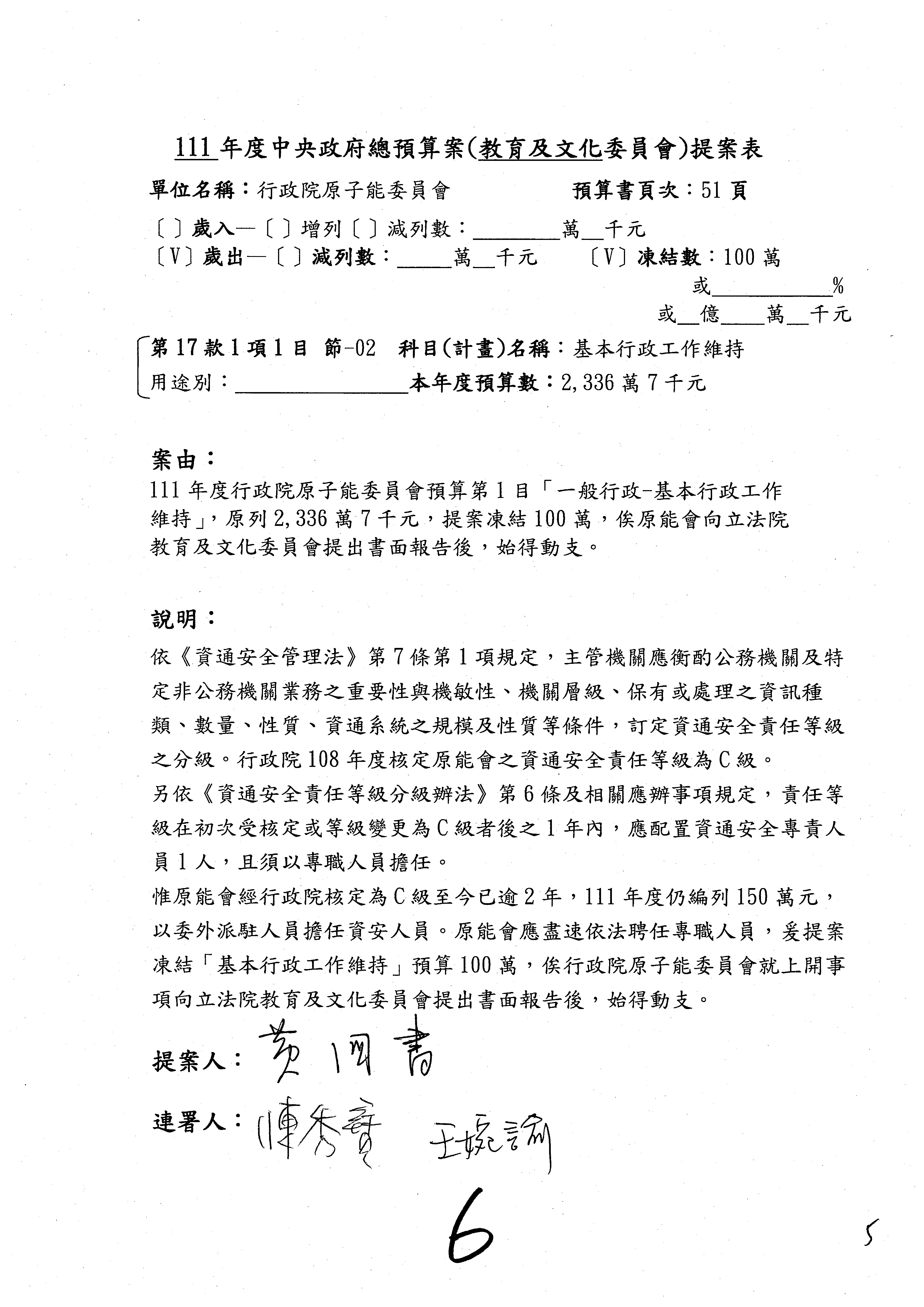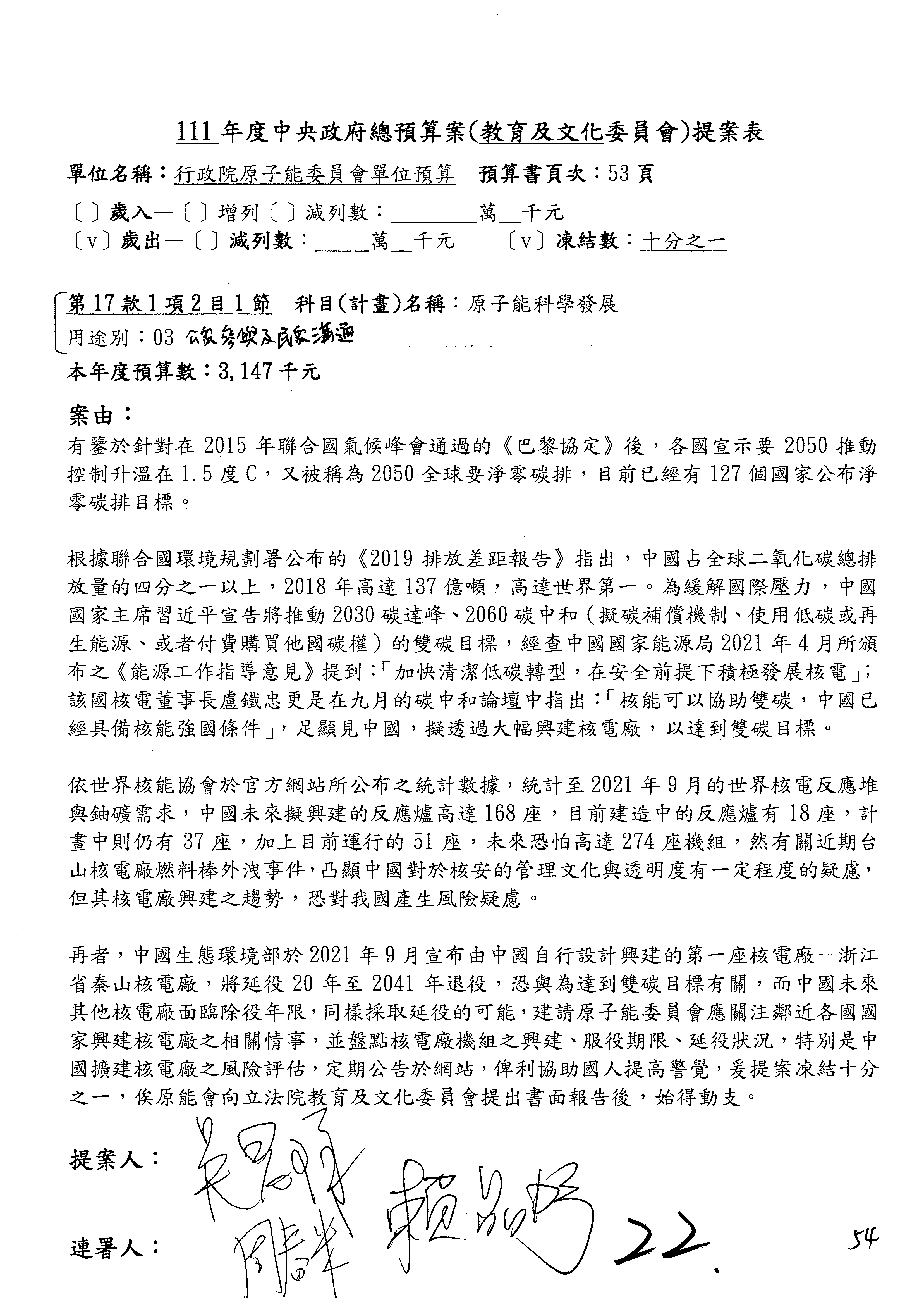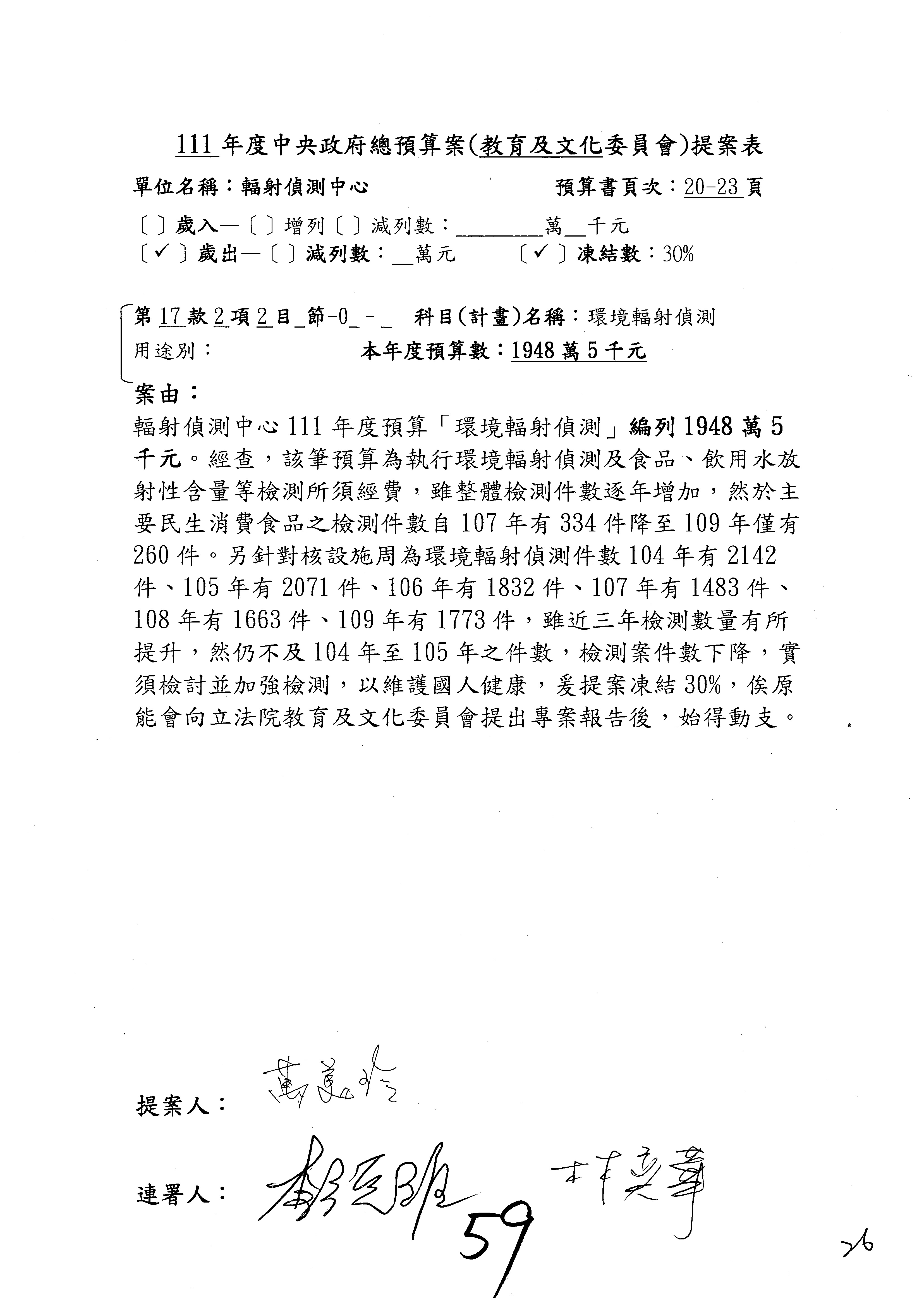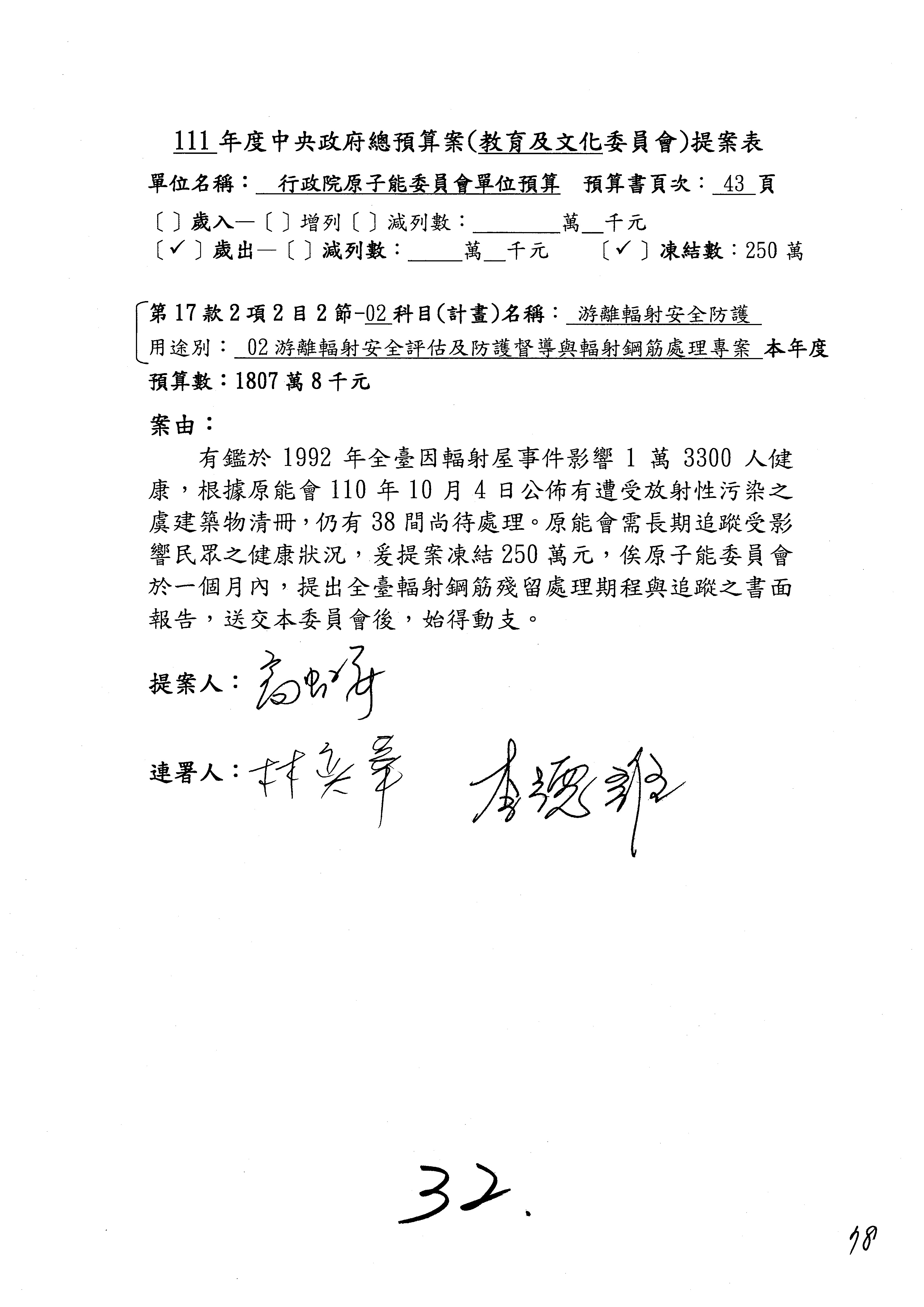 針對第92案,這部分是關於核設施除役作業、放射性廢棄物處理貯存及核種鑑定分析設施安全強化改善等工作,原能會核研所自102年度到110年度已經辦理兩期管制區的安全強化改善計畫,但第二期進度有落後的狀況,雖然你們表示針對落後的部分,在明年上半年度可以趕上來,但基於我們監督行政機關執行預算的職責,還是希望你們能夠確實掌握相關計畫的執行進度。原來本席的提凍金額是1,000萬元,但我也沒有堅持一定要凍結,這部分也可以與其他委員的提案併案處理,但是有關書面報告的部分,我希望你們能夠自行檢討,然後在書面報告裡面說明,謝謝。