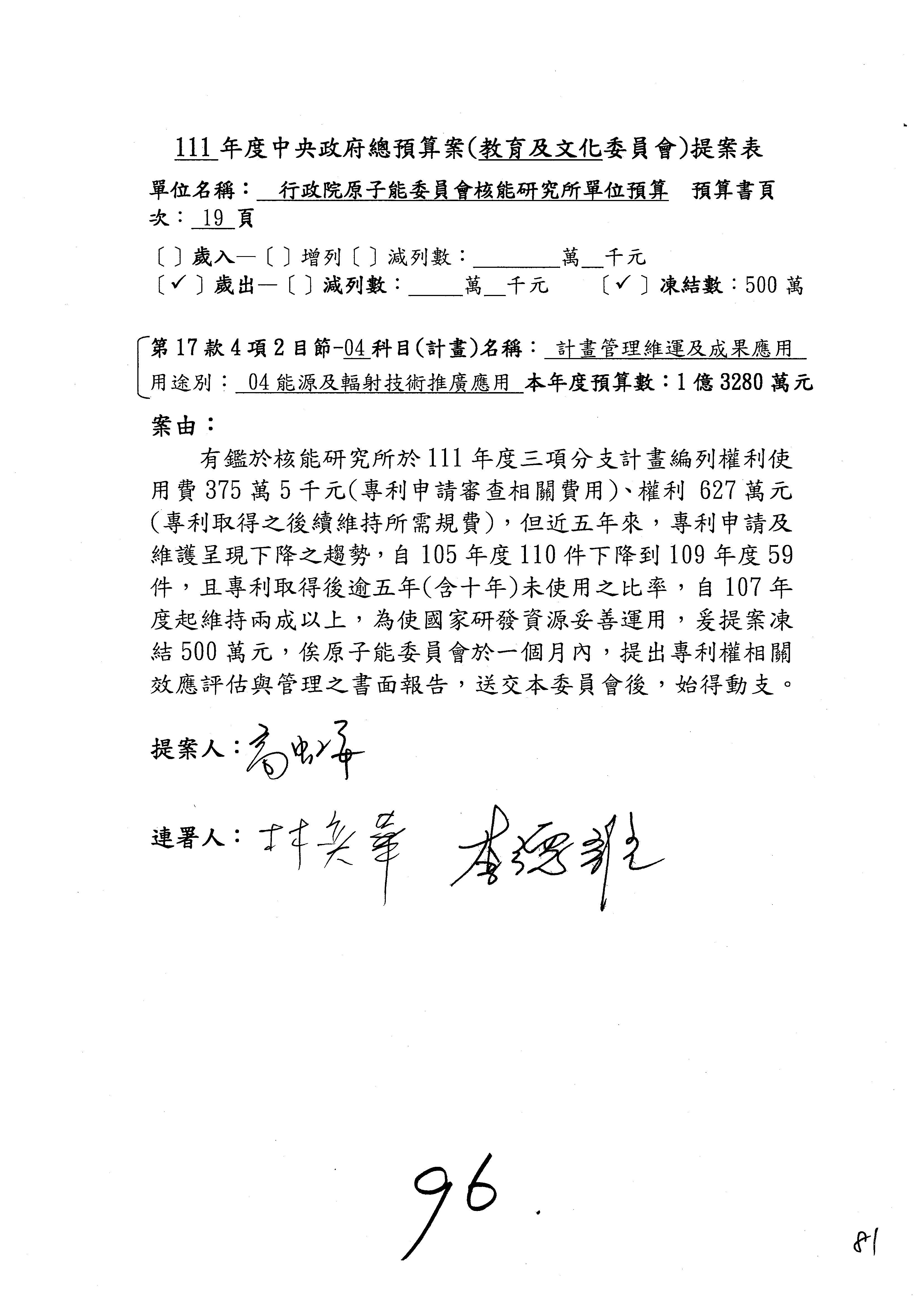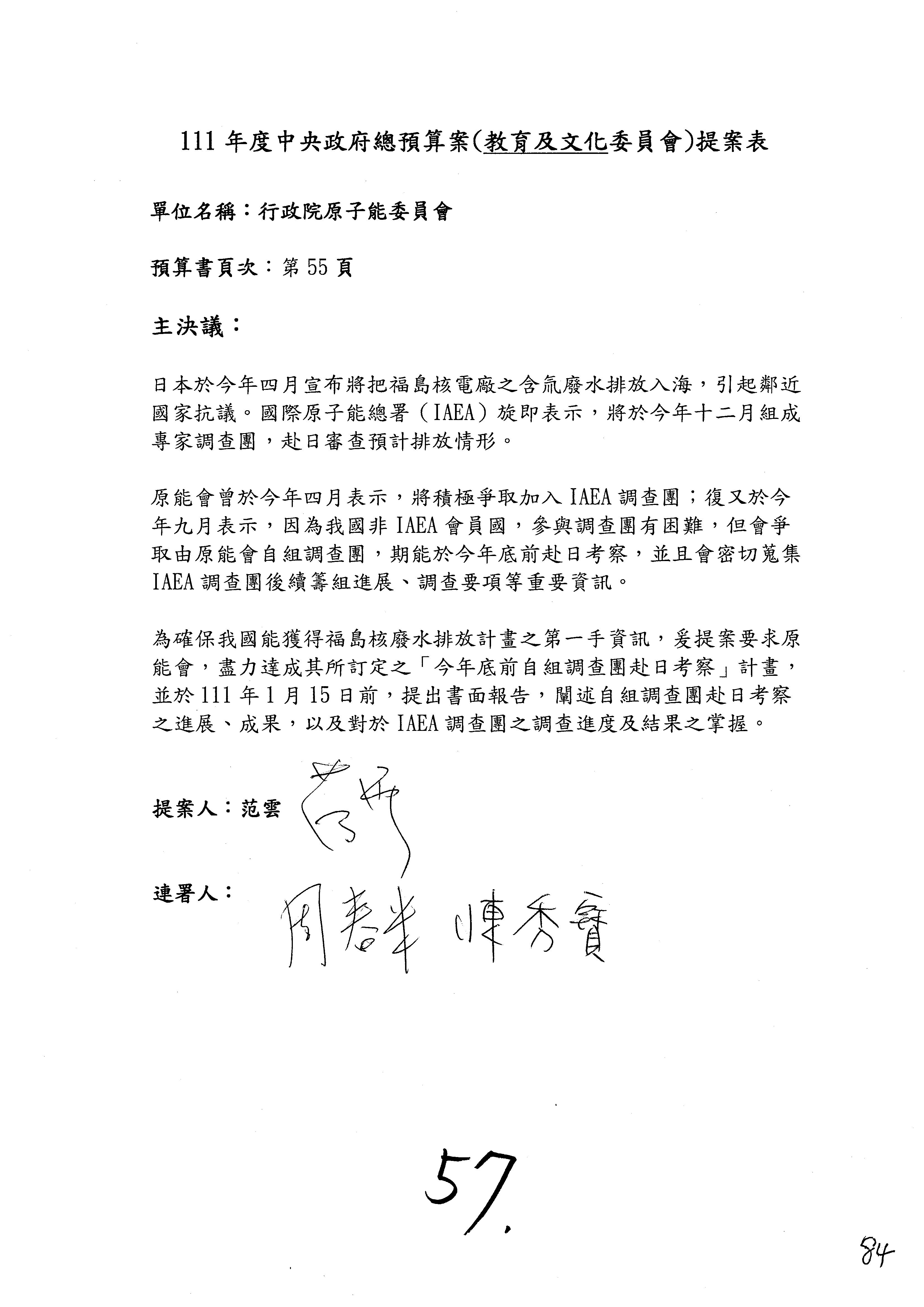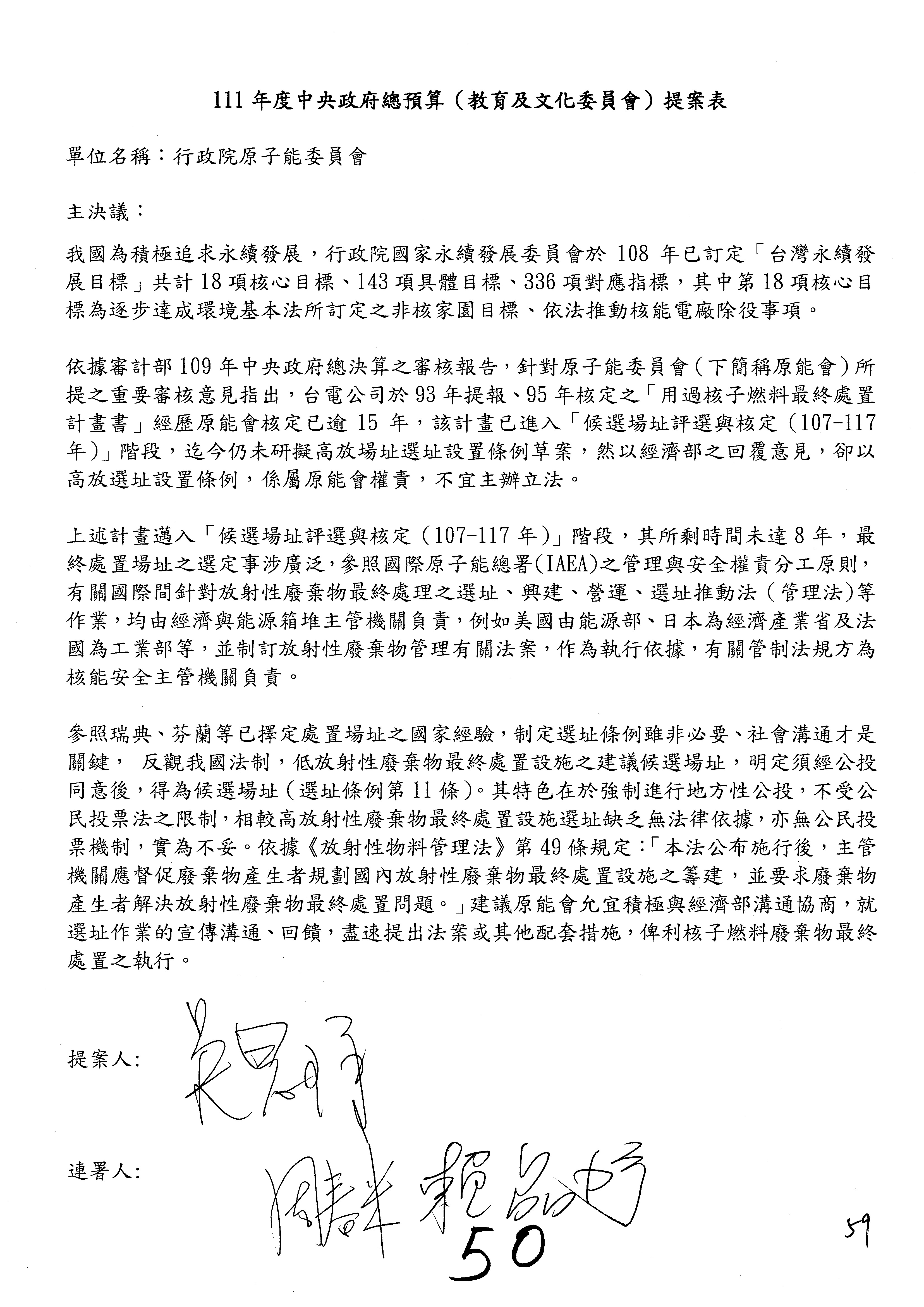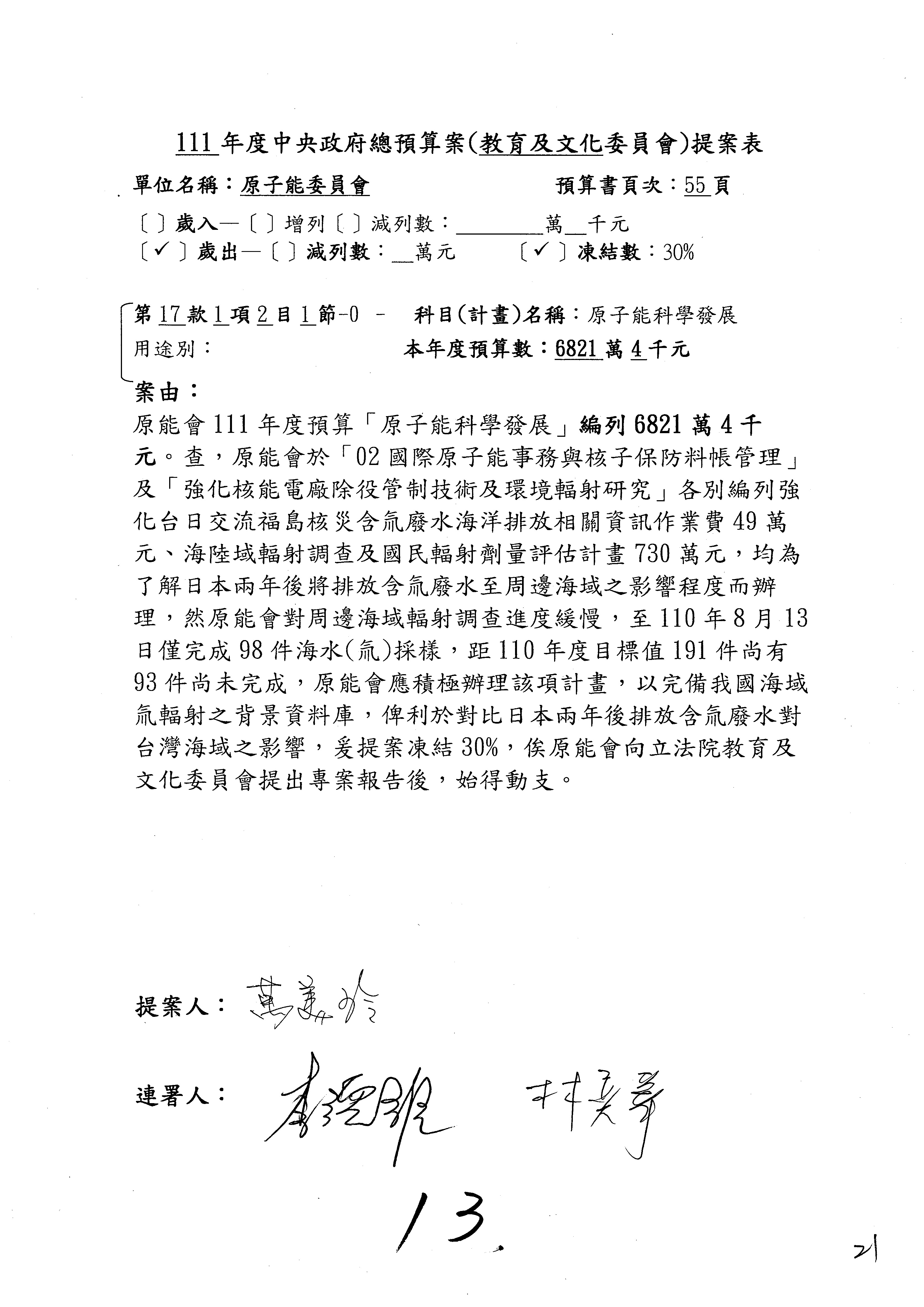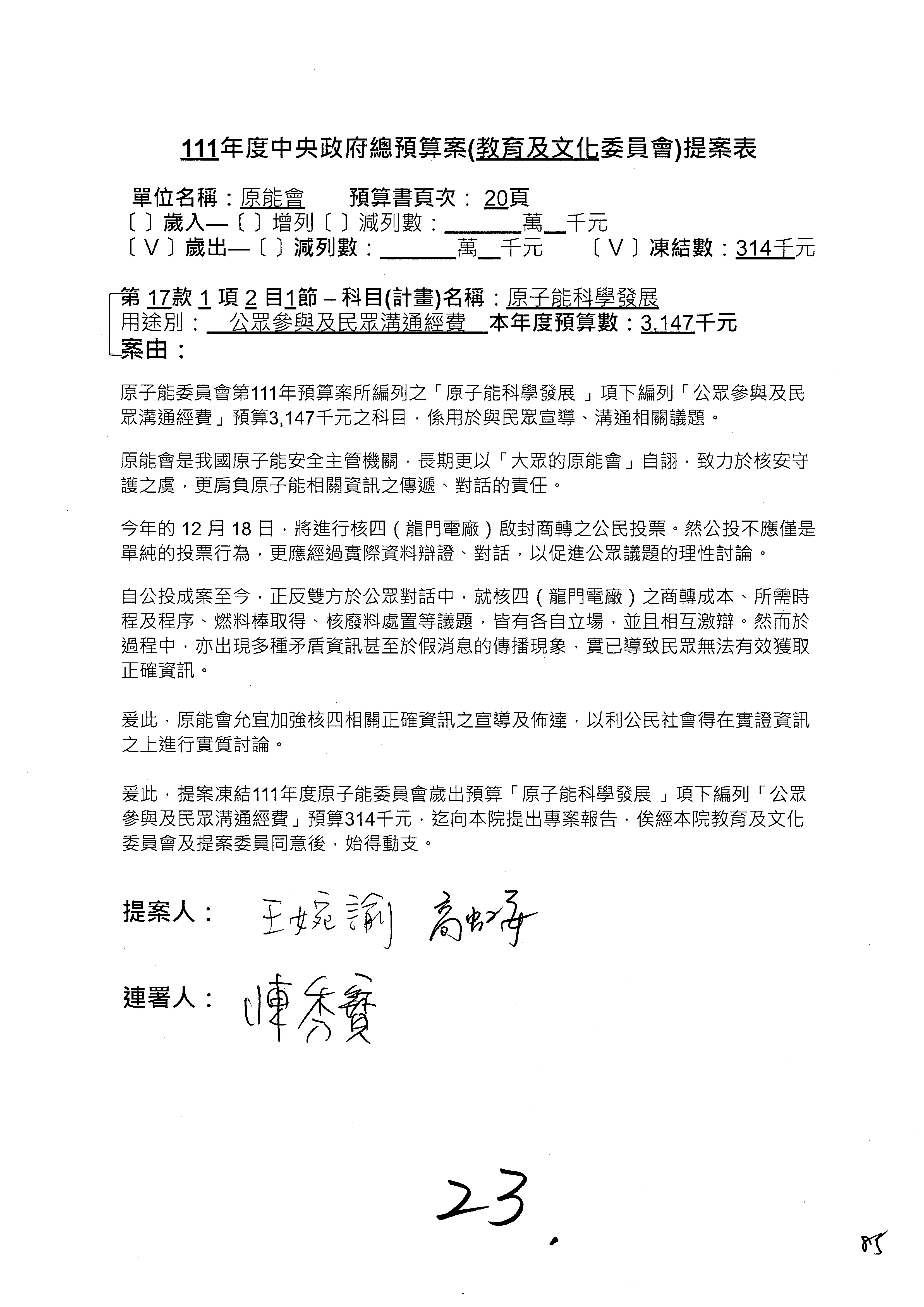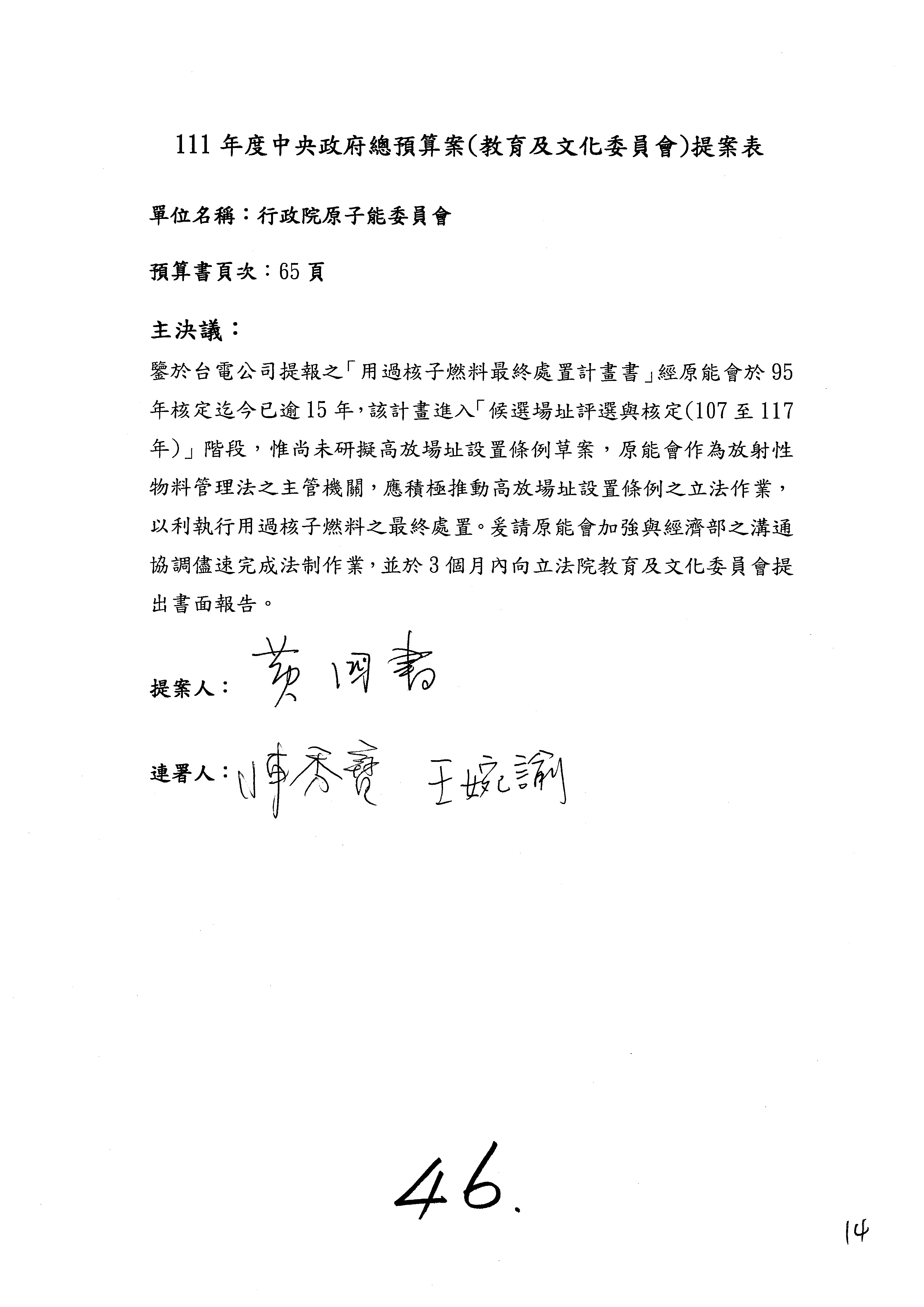針對第92案,這部分是關於核設施除役作業、放射性廢棄物處理貯存及核種鑑定分析設施安全強化改善等工作,原能會核研所自102年度到110年度已經辦理兩期管制區的安全強化改善計畫,但第二期進度有落後的狀況,雖然你們表示針對落後的部分,在明年上半年度可以趕上來,但基於我們監督行政機關執行預算的職責,還是希望你們能夠確實掌握相關計畫的執行進度。原來本席的提凍金額是1,000萬元,但我也沒有堅持一定要凍結,這部分也可以與其他委員的提案併案處理,但是有關書面報告的部分,我希望你們能夠自行檢討,然後在書面報告裡面說明,謝謝。