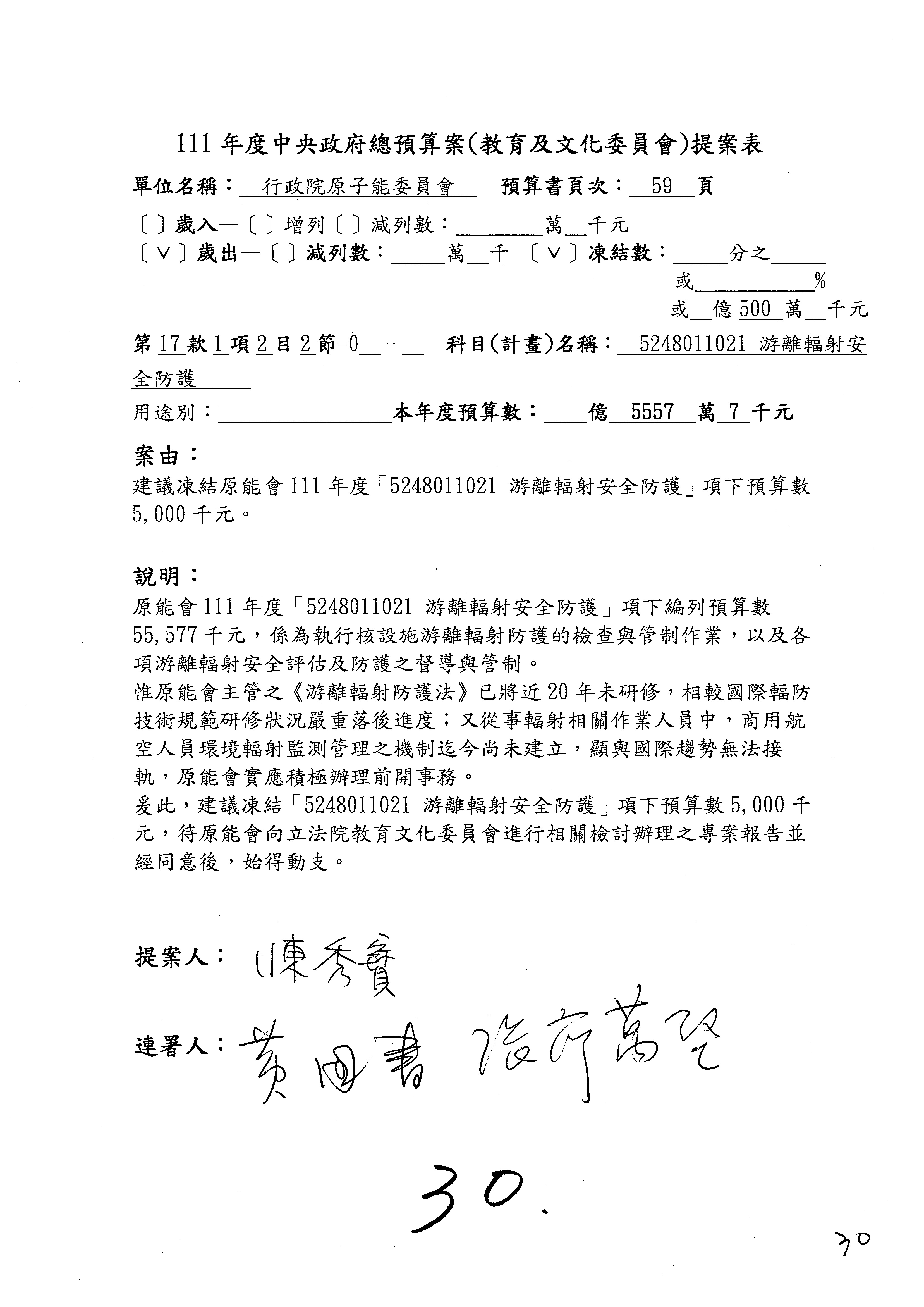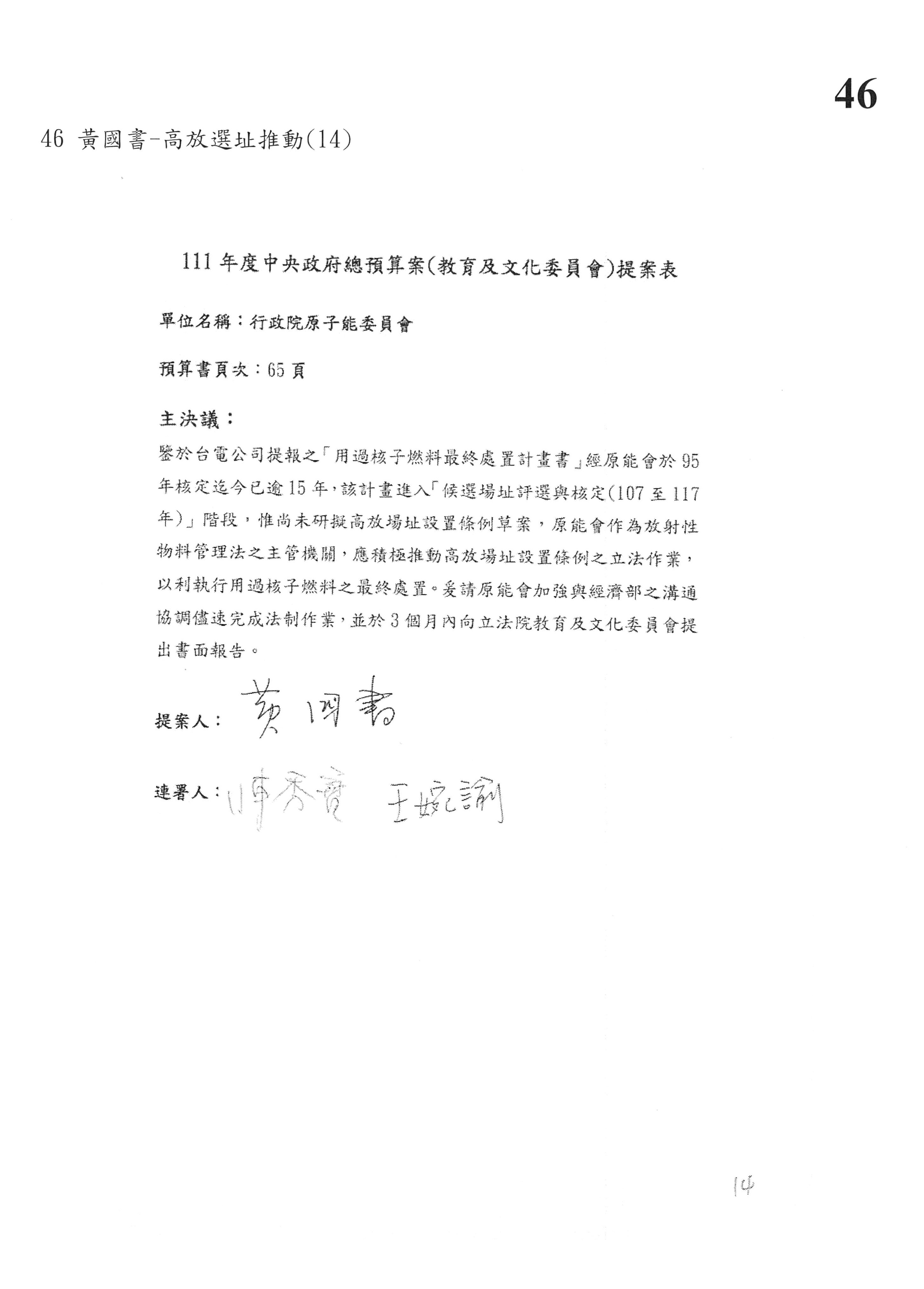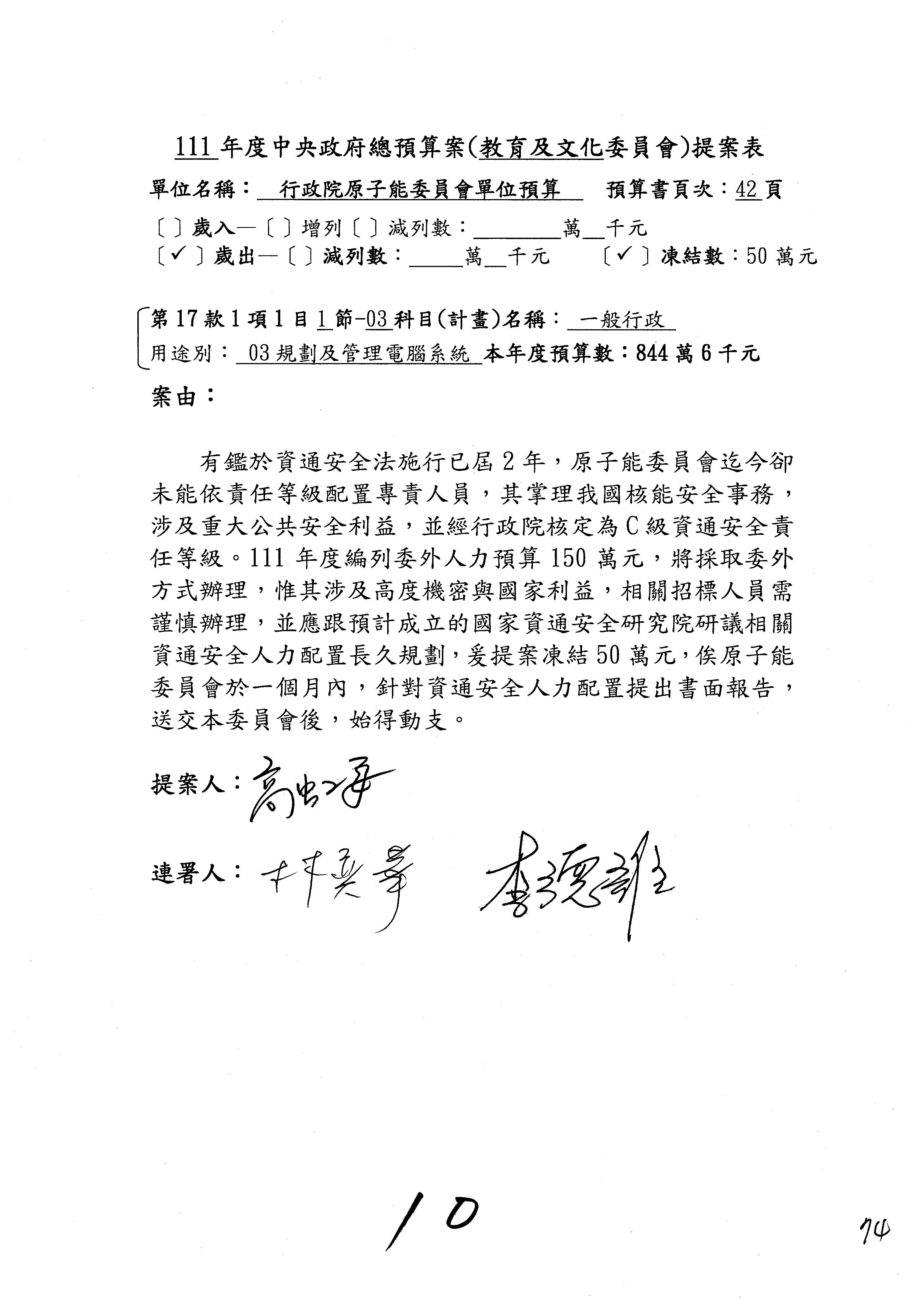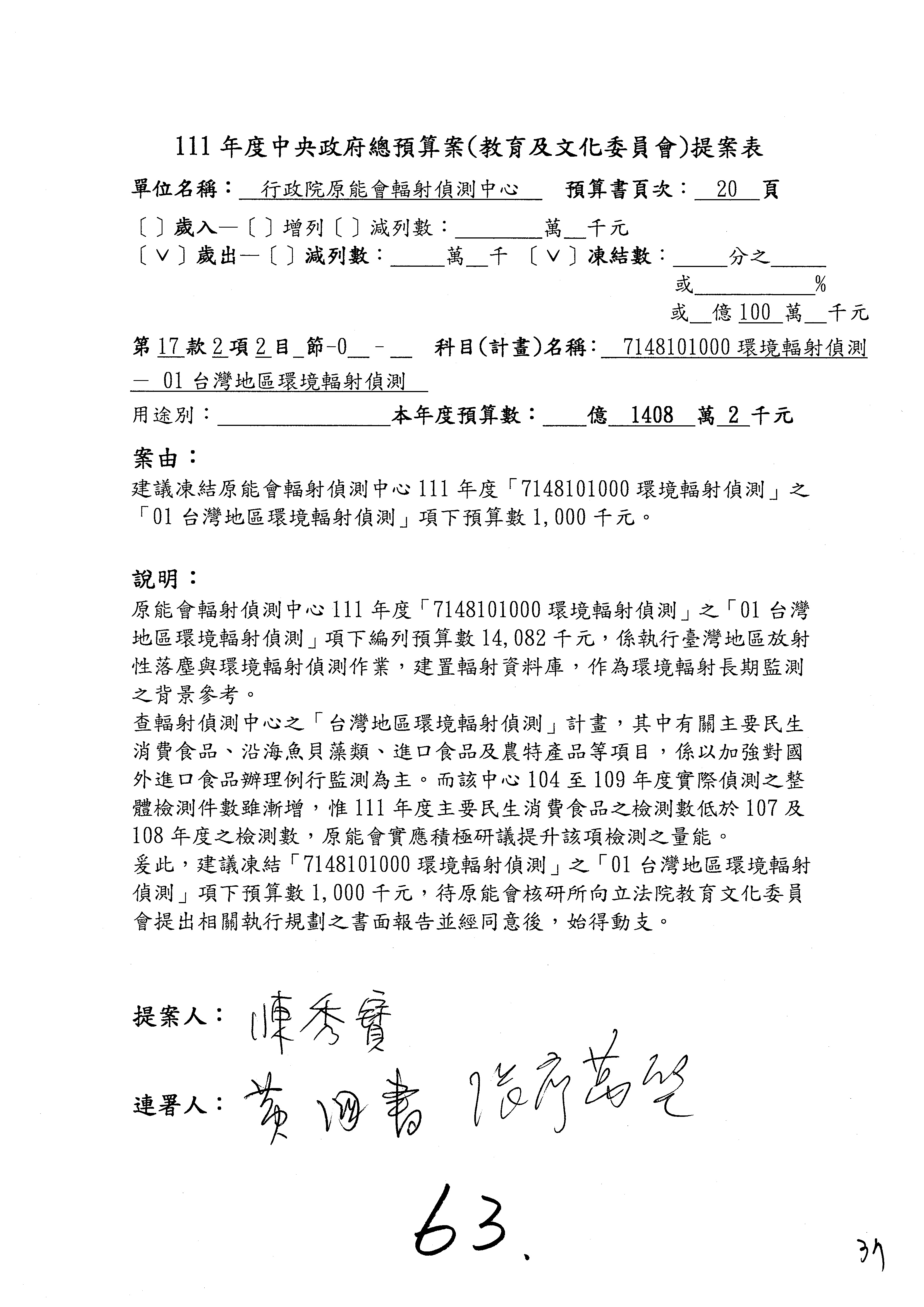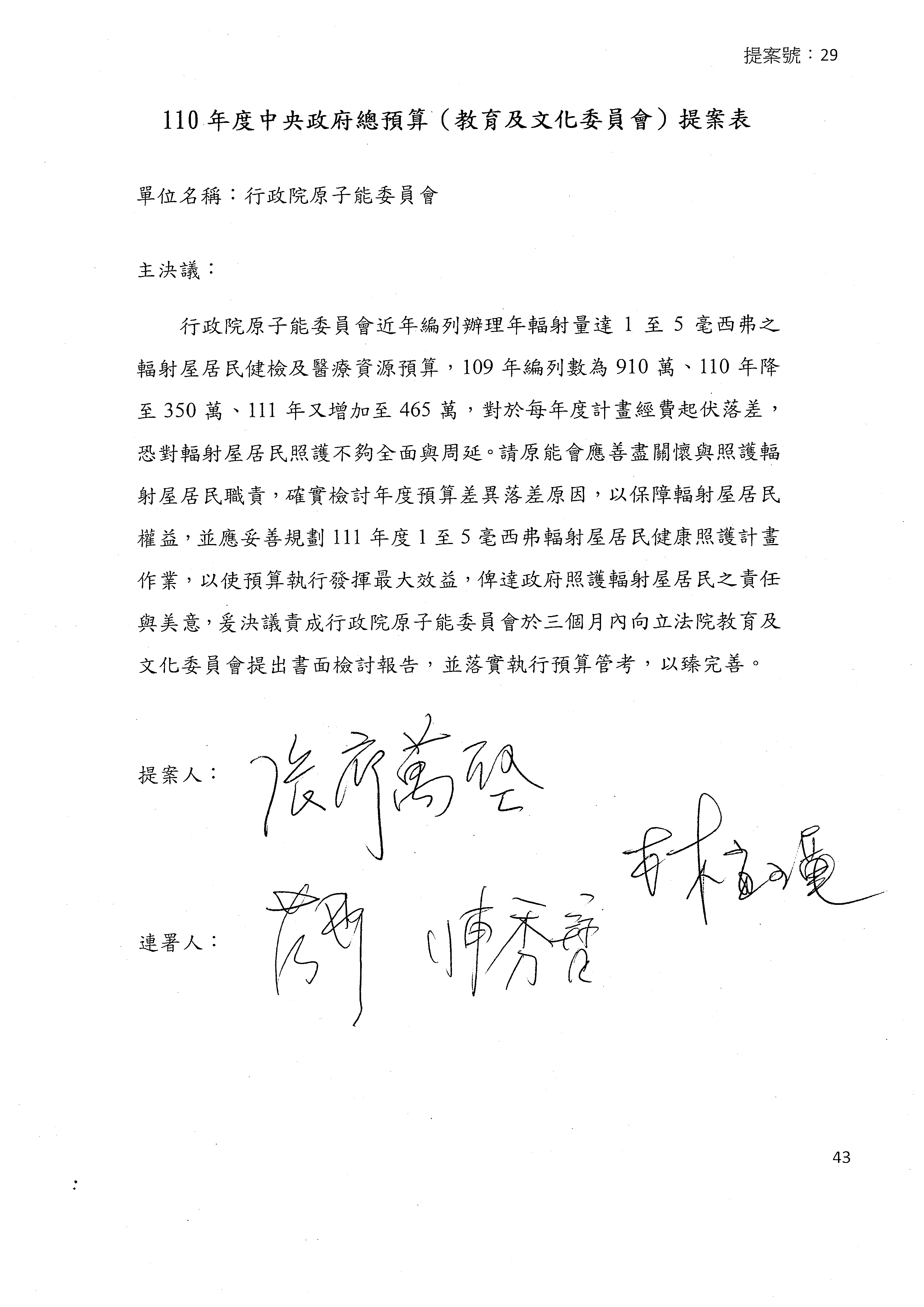 針對第92案,這部分是關於核設施除役作業、放射性廢棄物處理貯存及核種鑑定分析設施安全強化改善等工作,原能會核研所自102年度到110年度已經辦理兩期管制區的安全強化改善計畫,但第二期進度有落後的狀況,雖然你們表示針對落後的部分,在明年上半年度可以趕上來,但基於我們監督行政機關執行預算的職責,還是希望你們能夠確實掌握相關計畫的執行進度。原來本席的提凍金額是1,000萬元,但我也沒有堅持一定要凍結,這部分也可以與其他委員的提案併案處理,但是有關書面報告的部分,我希望你們能夠自行檢討,然後在書面報告裡面說明,謝謝。