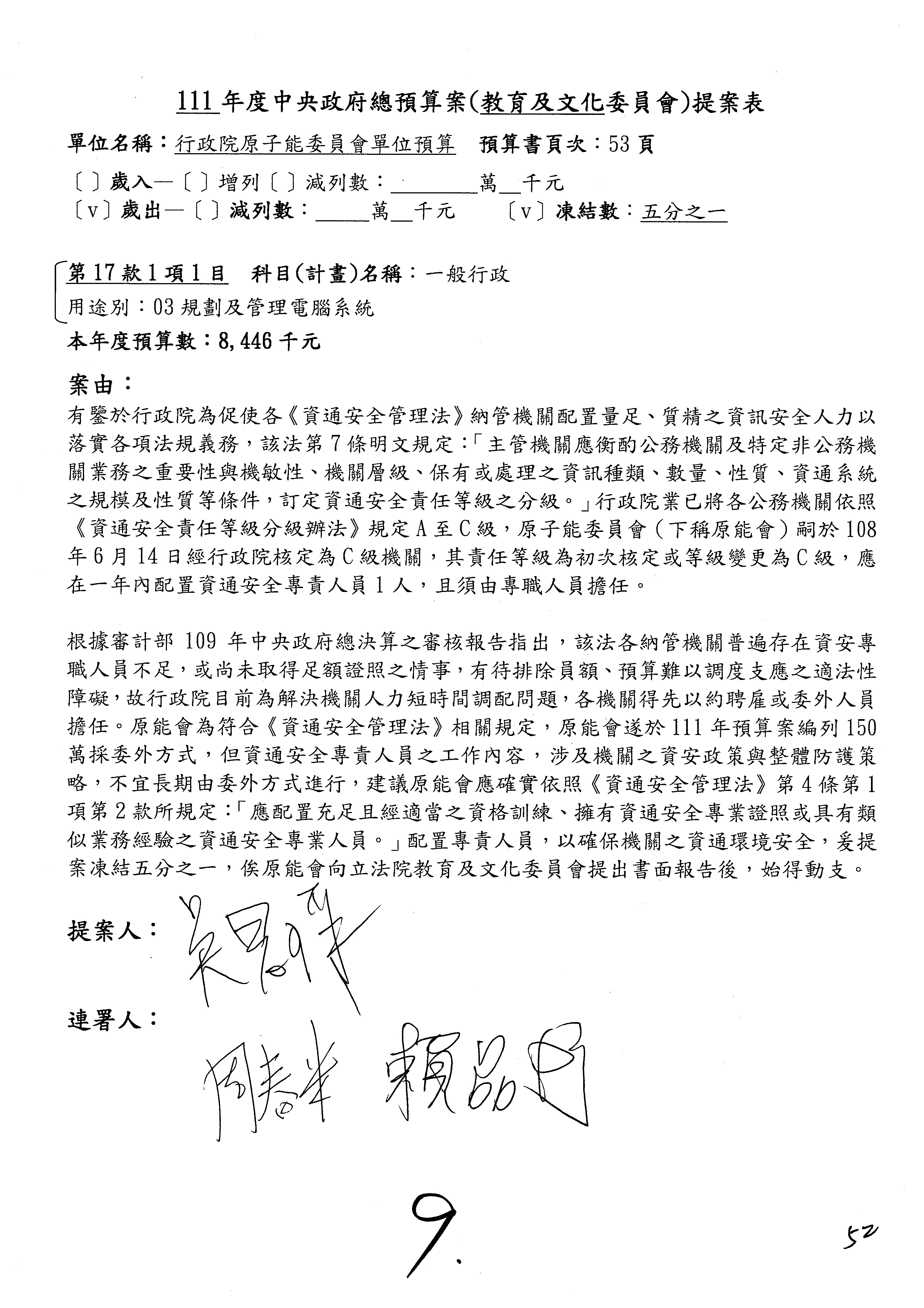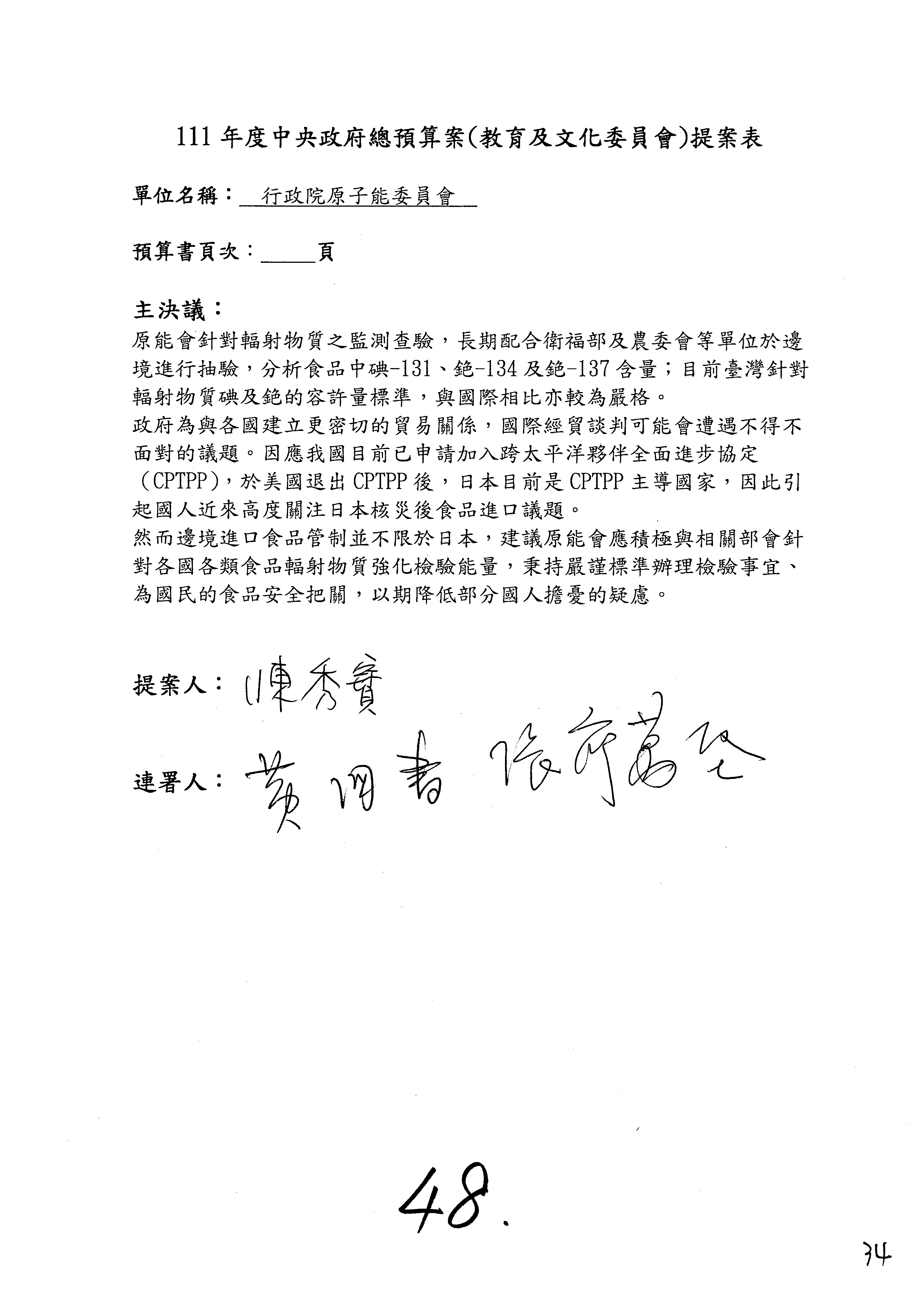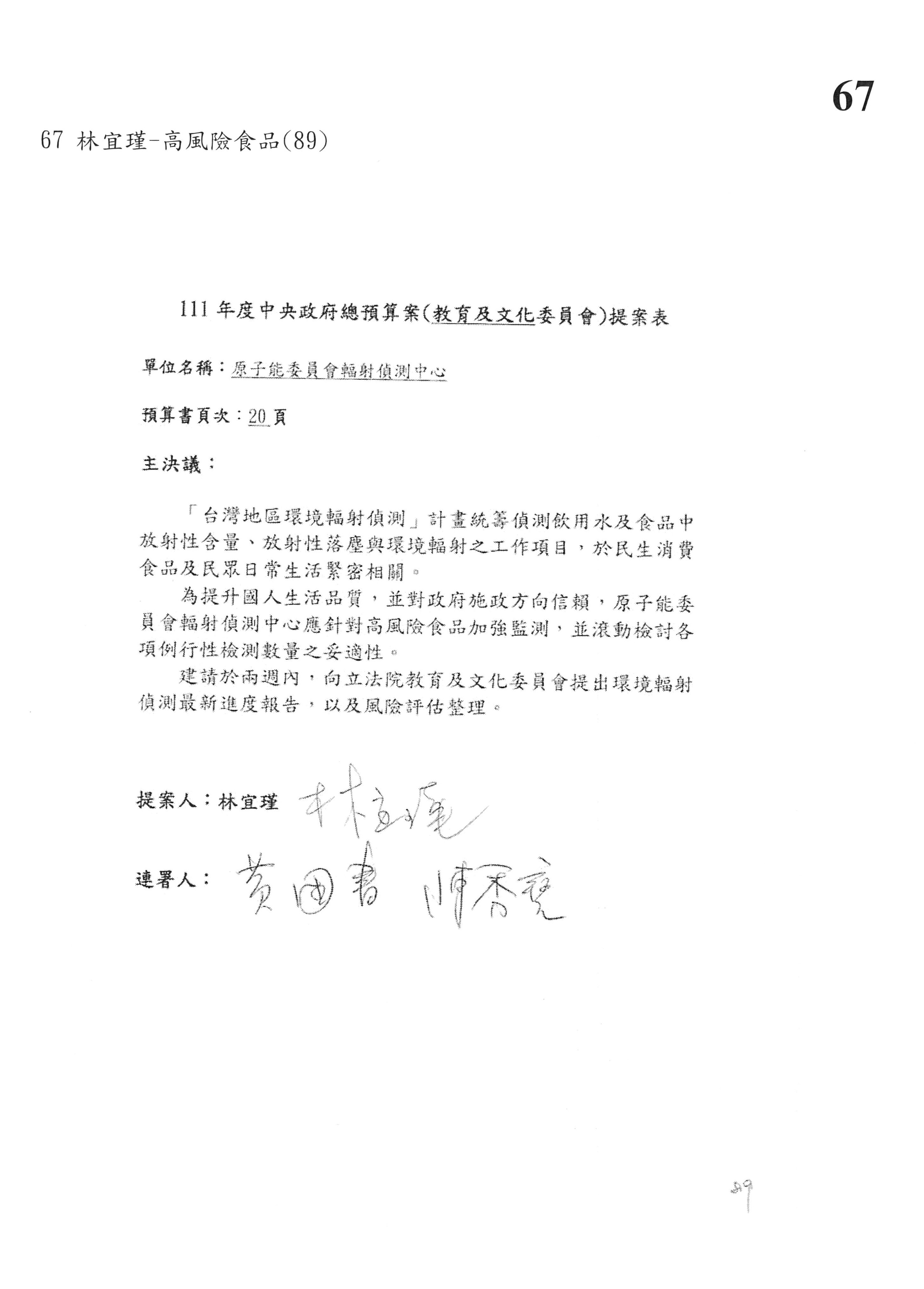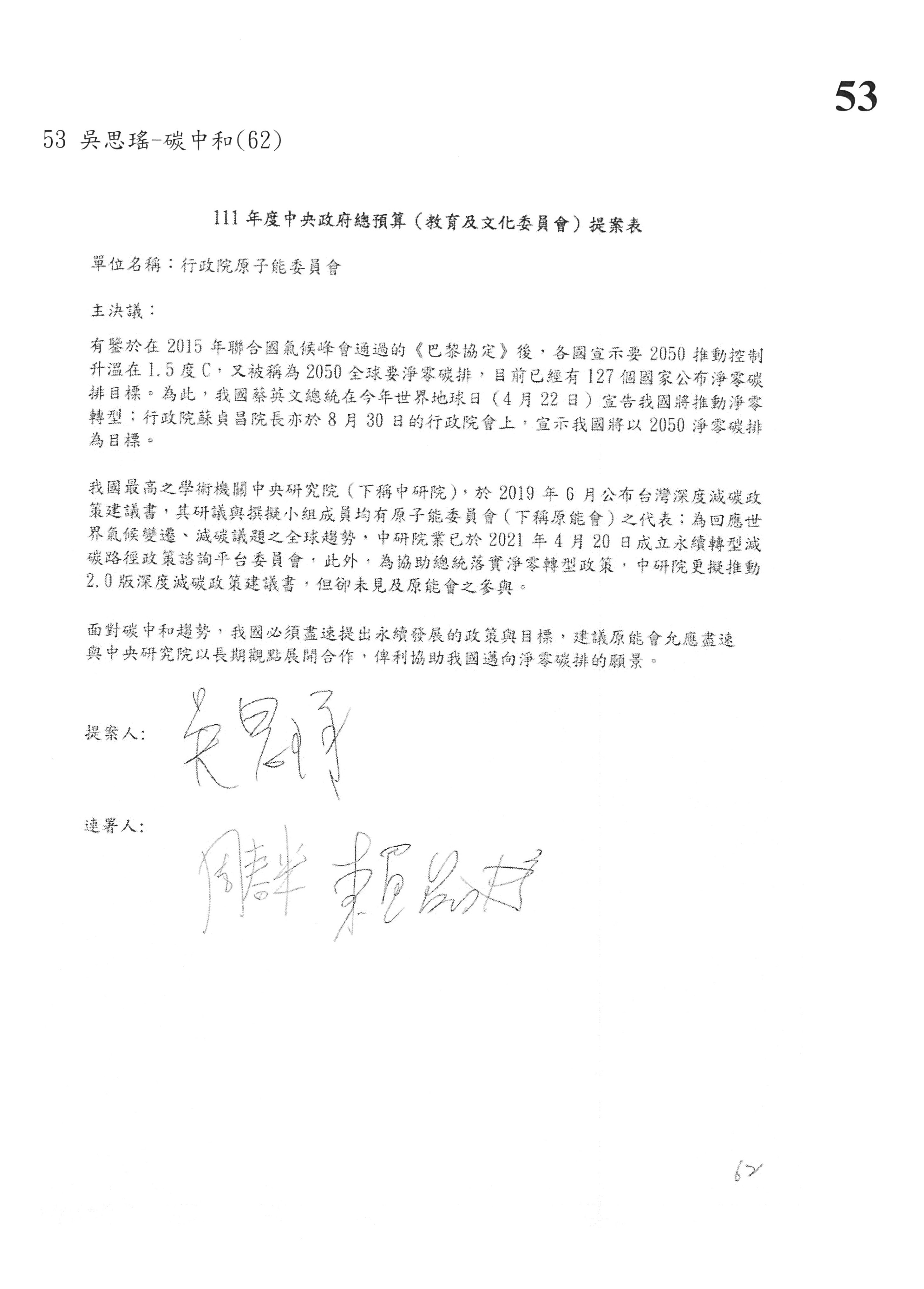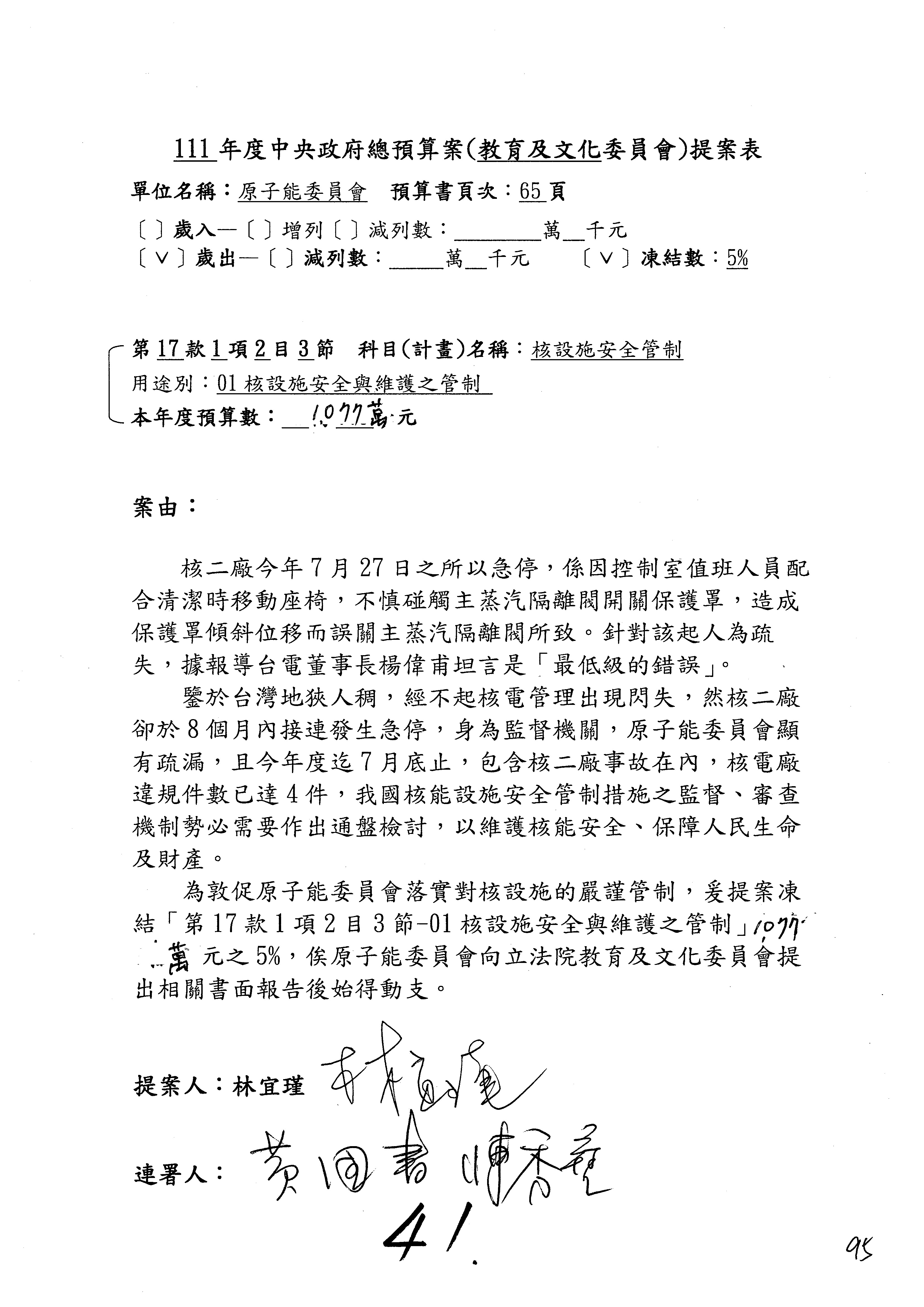 針對第92案,這部分是關於核設施除役作業、放射性廢棄物處理貯存及核種鑑定分析設施安全強化改善等工作,原能會核研所自102年度到110年度已經辦理兩期管制區的安全強化改善計畫,但第二期進度有落後的狀況,雖然你們表示針對落後的部分,在明年上半年度可以趕上來,但基於我們監督行政機關執行預算的職責,還是希望你們能夠確實掌握相關計畫的執行進度。原來本席的提凍金額是1,000萬元,但我也沒有堅持一定要凍結,這部分也可以與其他委員的提案併案處理,但是有關書面報告的部分,我希望你們能夠自行檢討,然後在書面報告裡面說明,謝謝。
