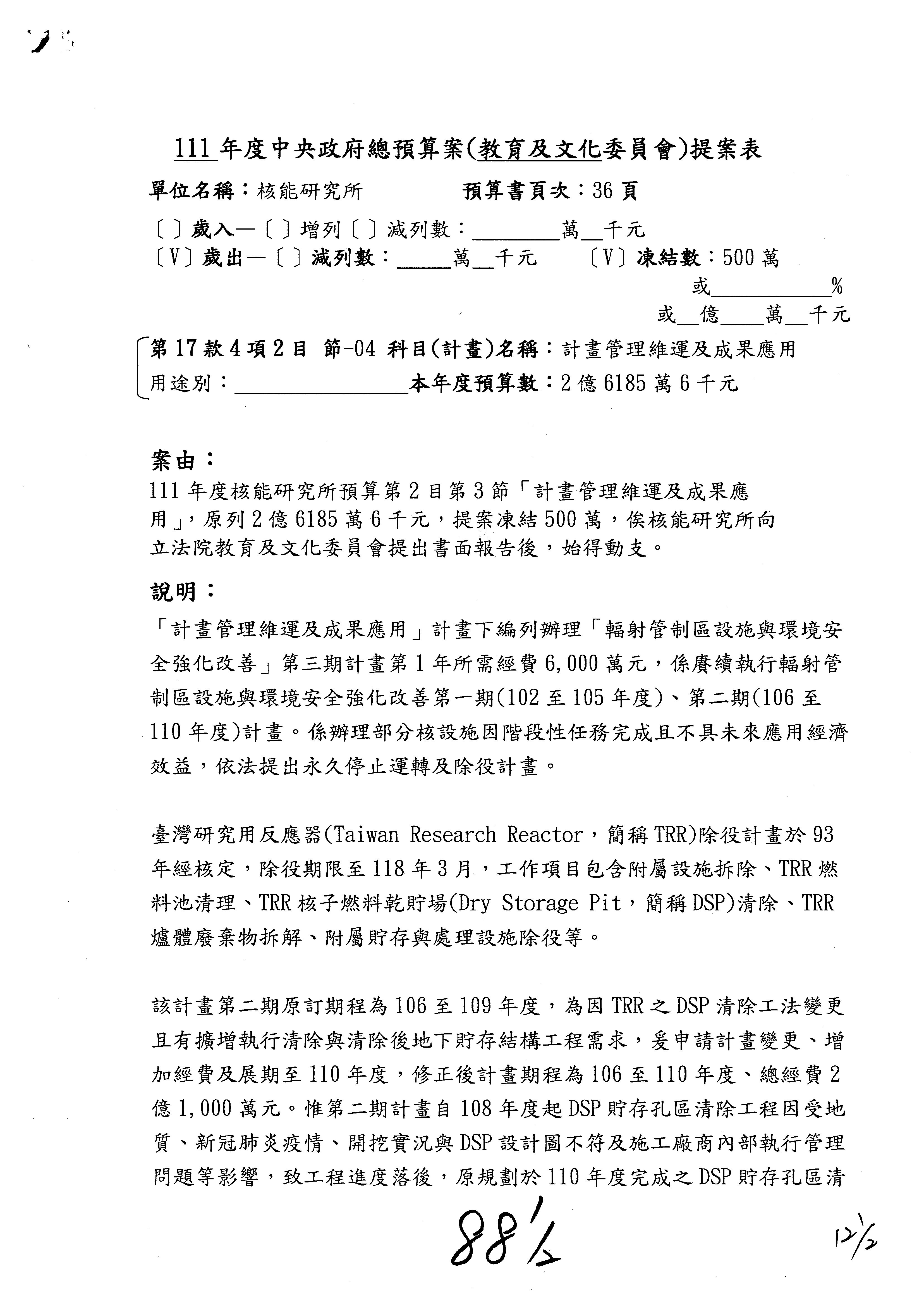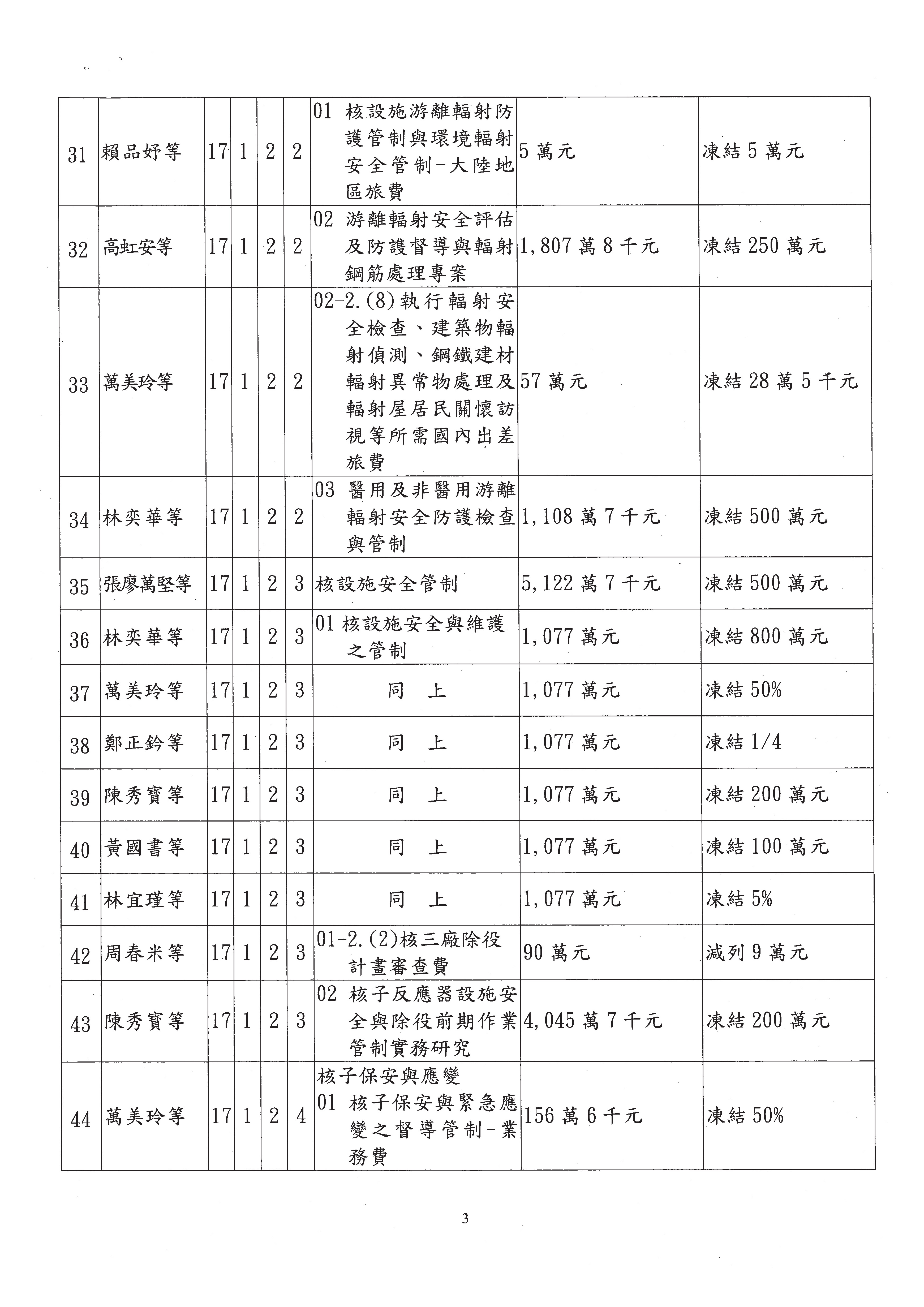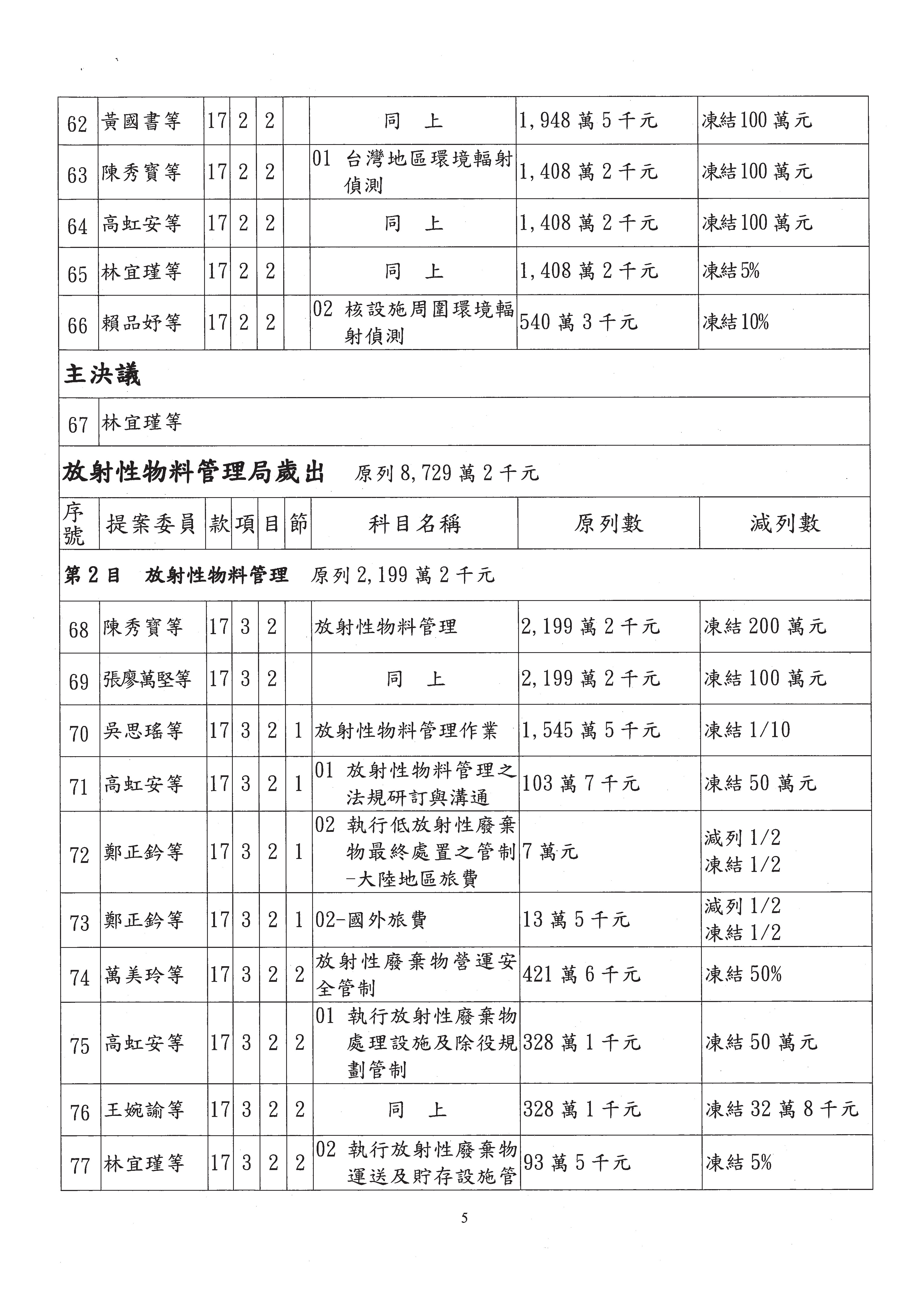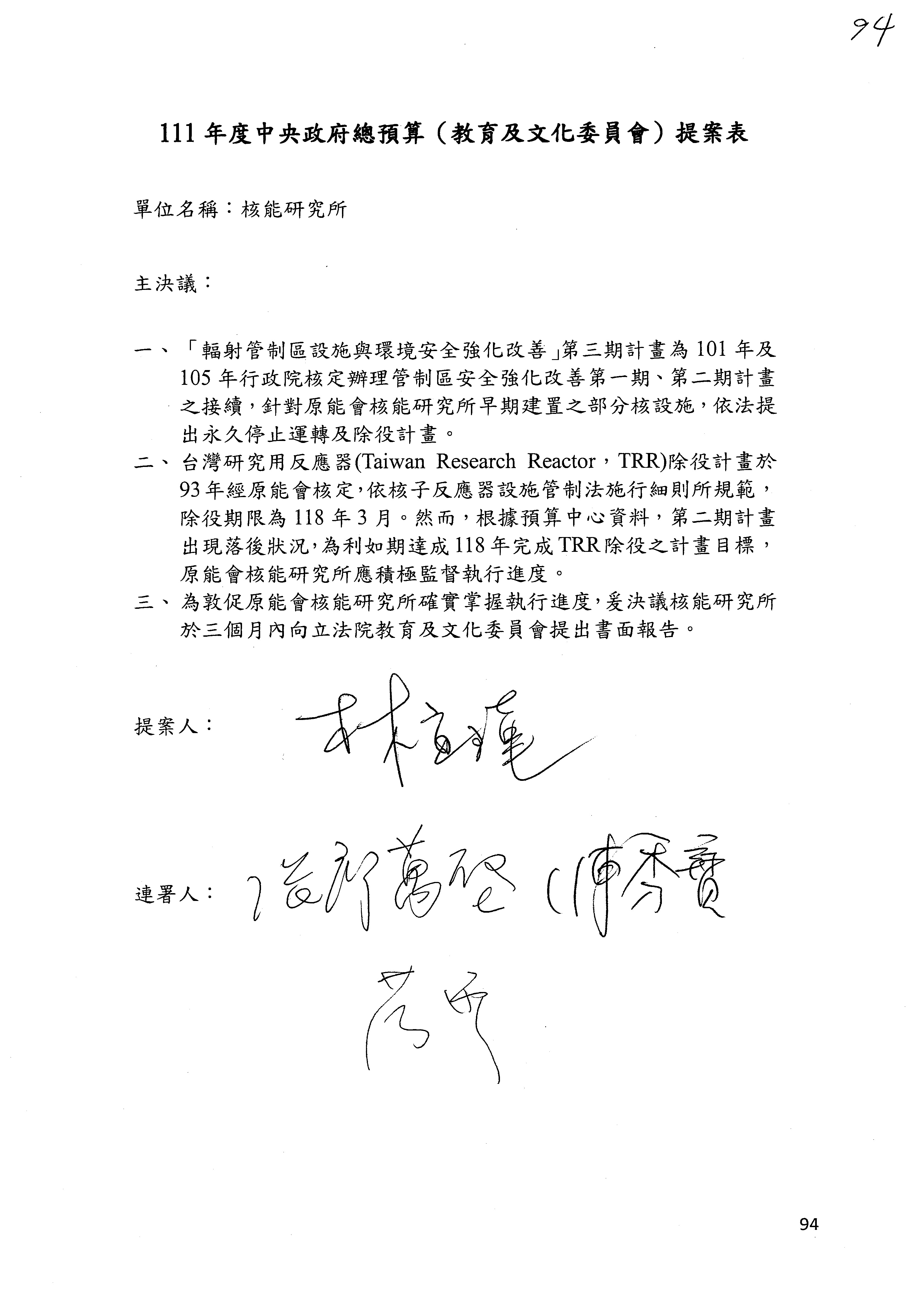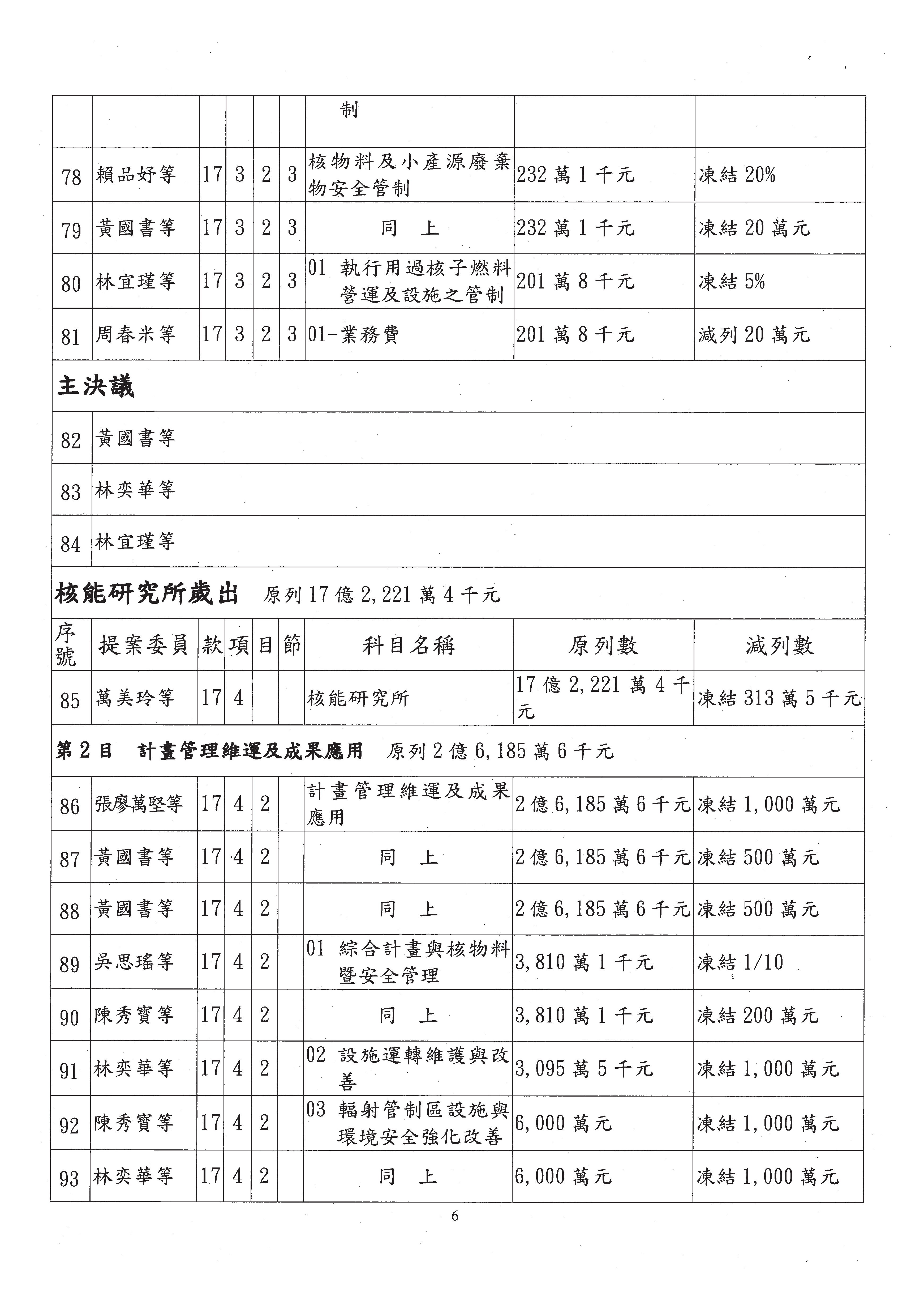 主席:針對本目本席也有一項提案,本席的提案是第94案,我的提案精神和陳秀寳委員的提案一樣,其實TRR除役計畫在93年就已經核定除役期限是118年3月,可是按照預算中心的資料,第二期計畫出現落後的狀況,為了能夠如期達成在118年完成TRR除役計畫目標,當然就要期待並積極監督你們的執行進度,其實這都是為了達到敦促的目的,所以才會用凍結的方式要求你們提出書面報告,藉此來看你們要如何確實掌握執行進度。針對這一目,我看大部分的想法都是這樣,所以是不是大家來討論一下要如何凍結?