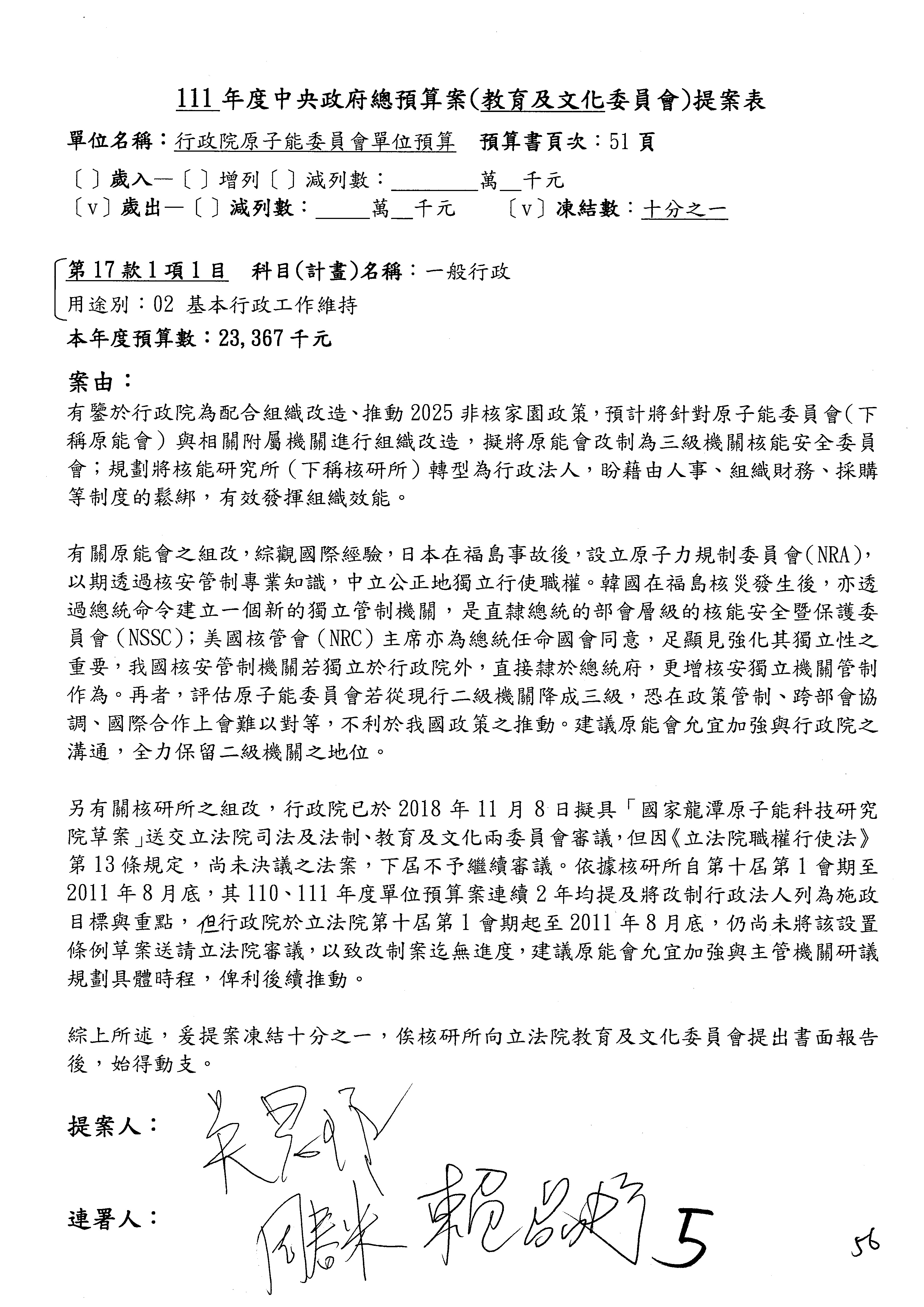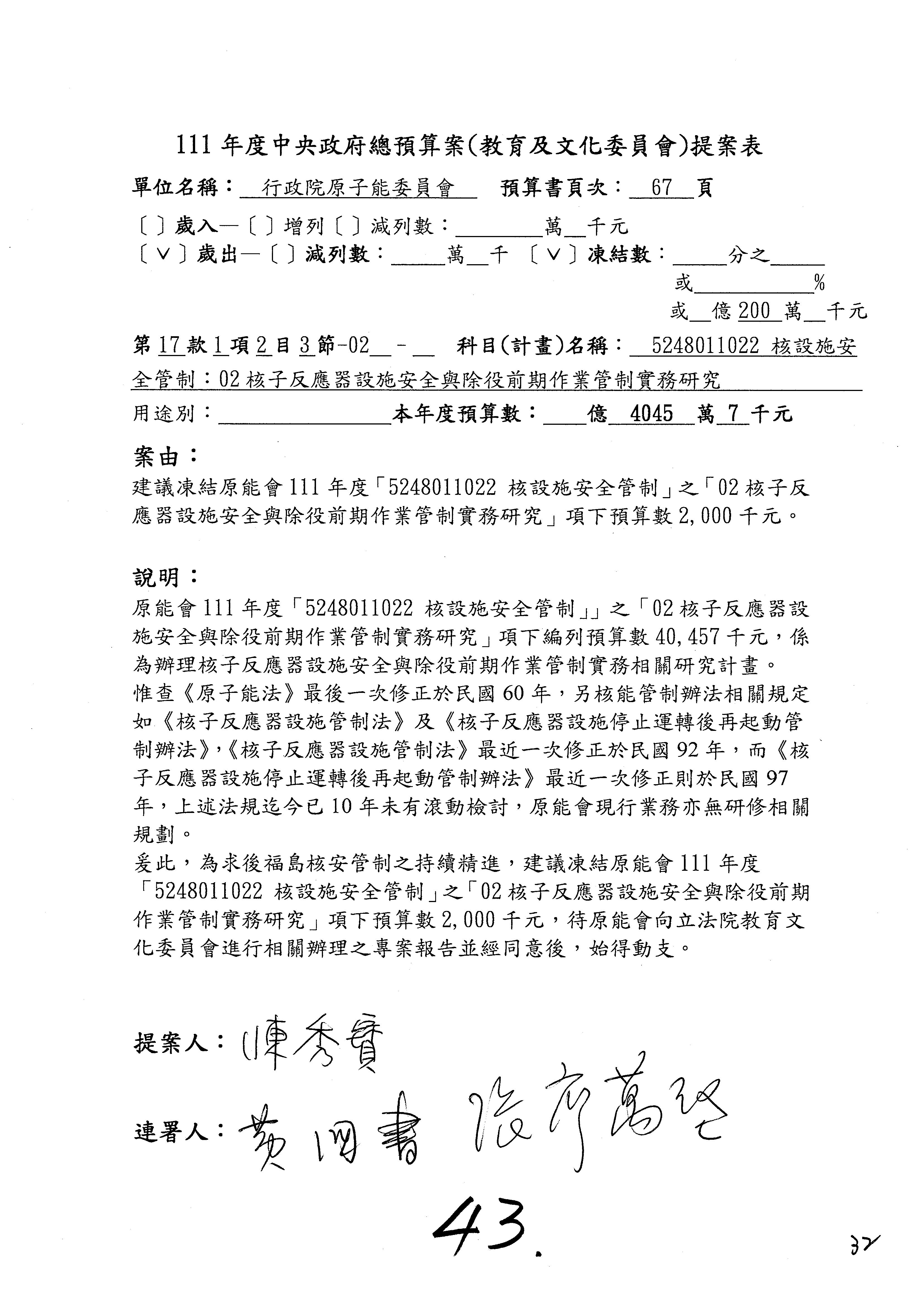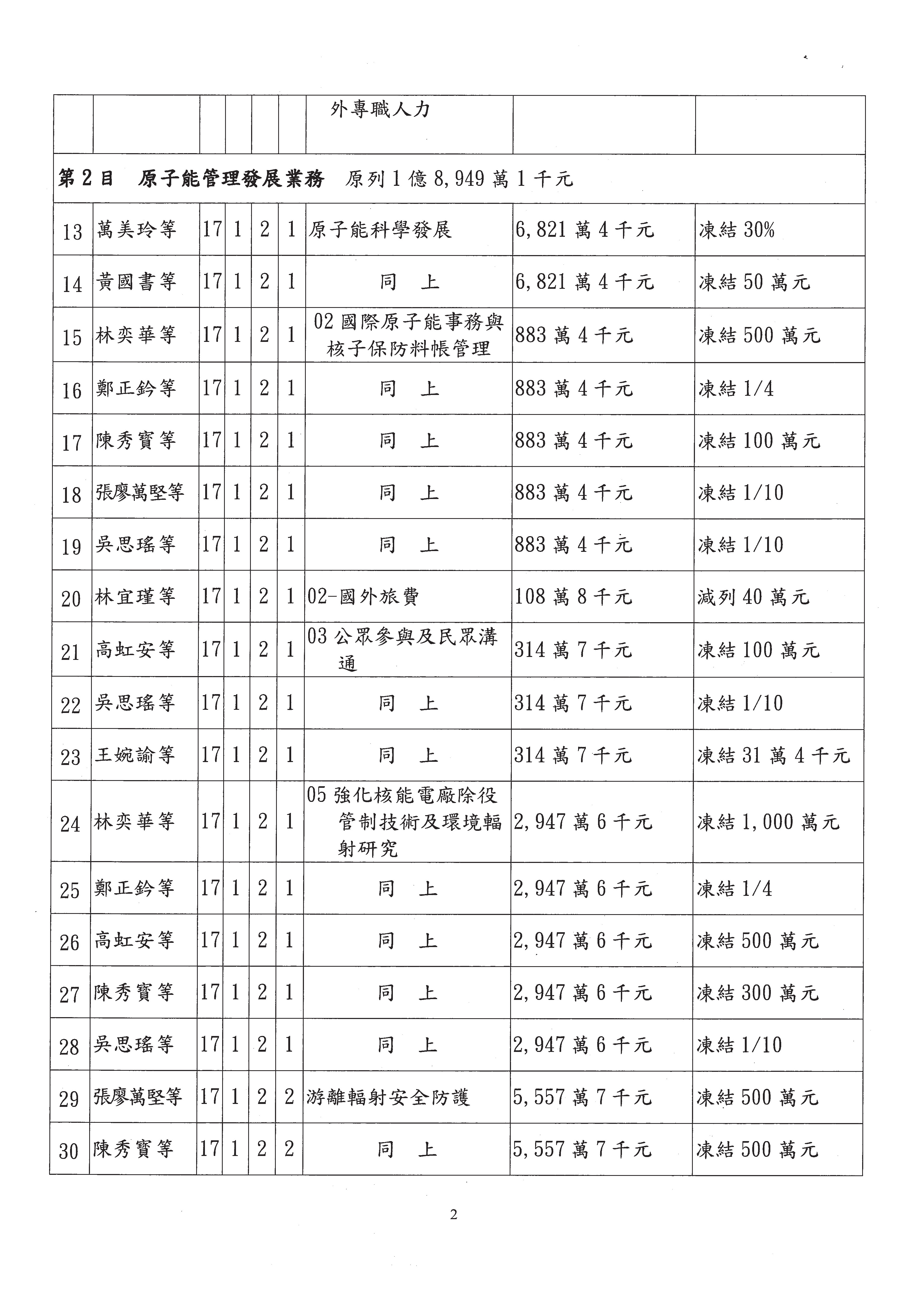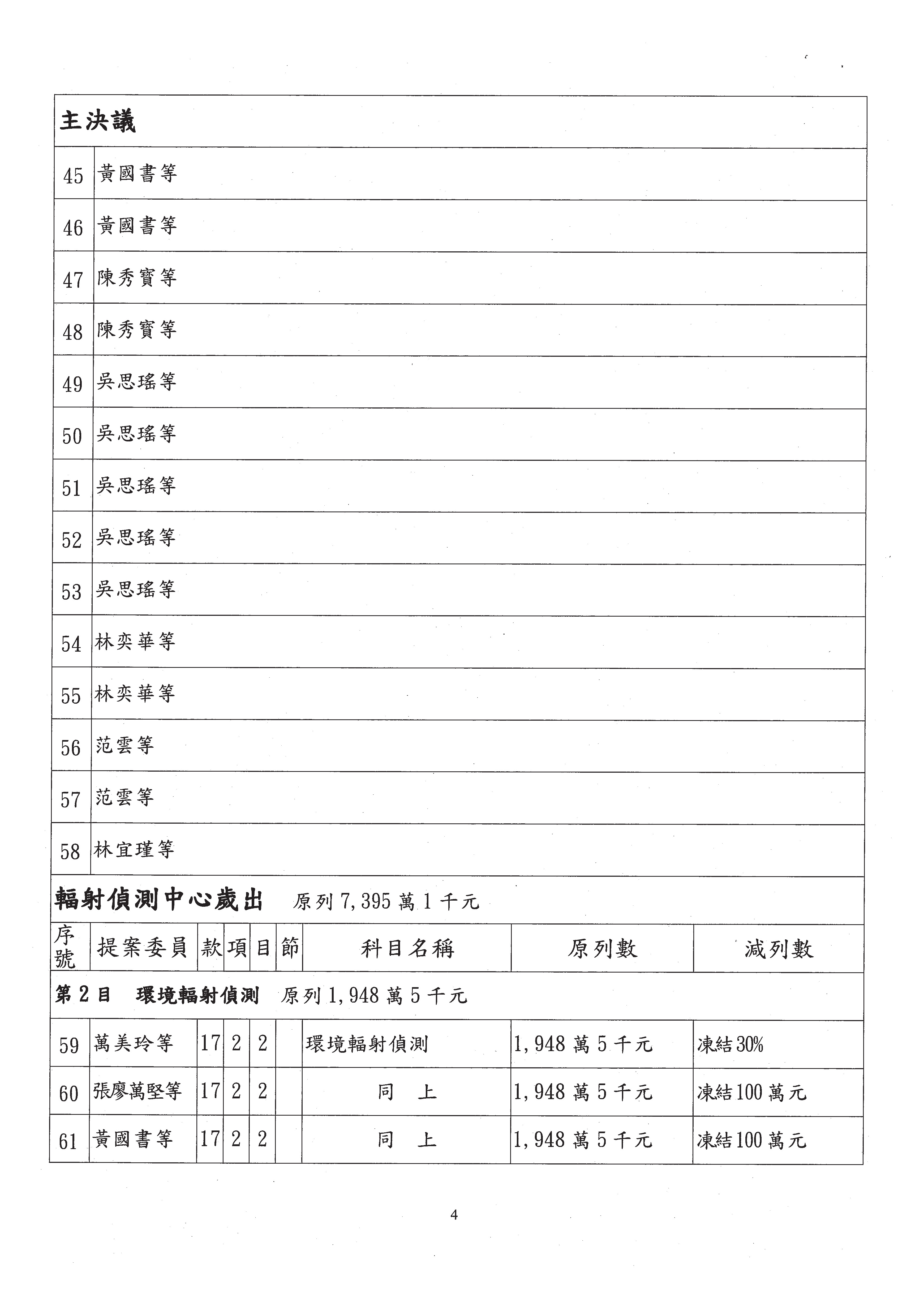 主席:針對本目本席也有一項提案,本席的提案是第94案,我的提案精神和陳秀寳委員的提案一樣,其實TRR除役計畫在93年就已經核定除役期限是118年3月,可是按照預算中心的資料,第二期計畫出現落後的狀況,為了能夠如期達成在118年完成TRR除役計畫目標,當然就要期待並積極監督你們的執行進度,其實這都是為了達到敦促的目的,所以才會用凍結的方式要求你們提出書面報告,藉此來看你們要如何確實掌握執行進度。針對這一目,我看大部分的想法都是這樣,所以是不是大家來討論一下要如何凍結?
