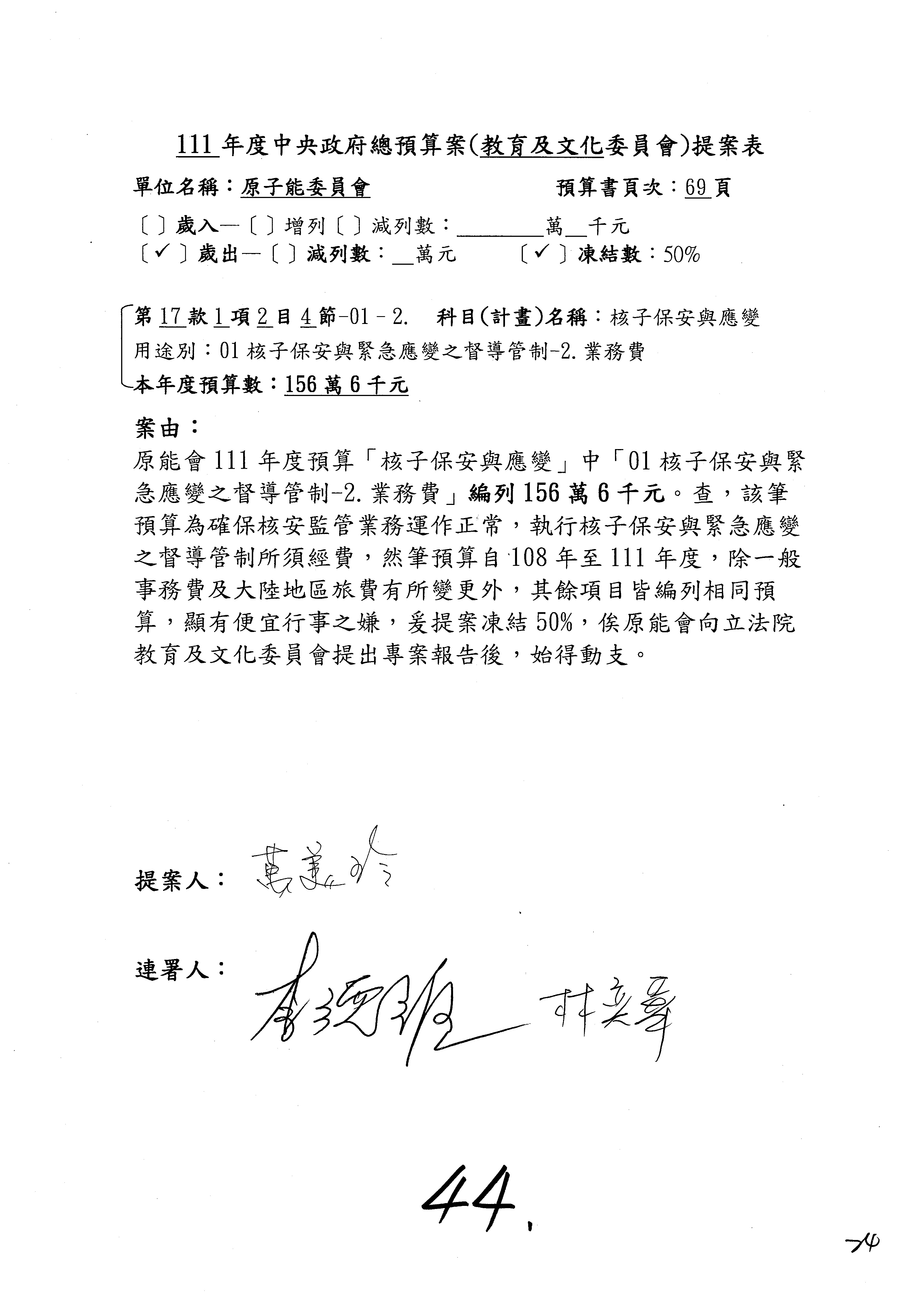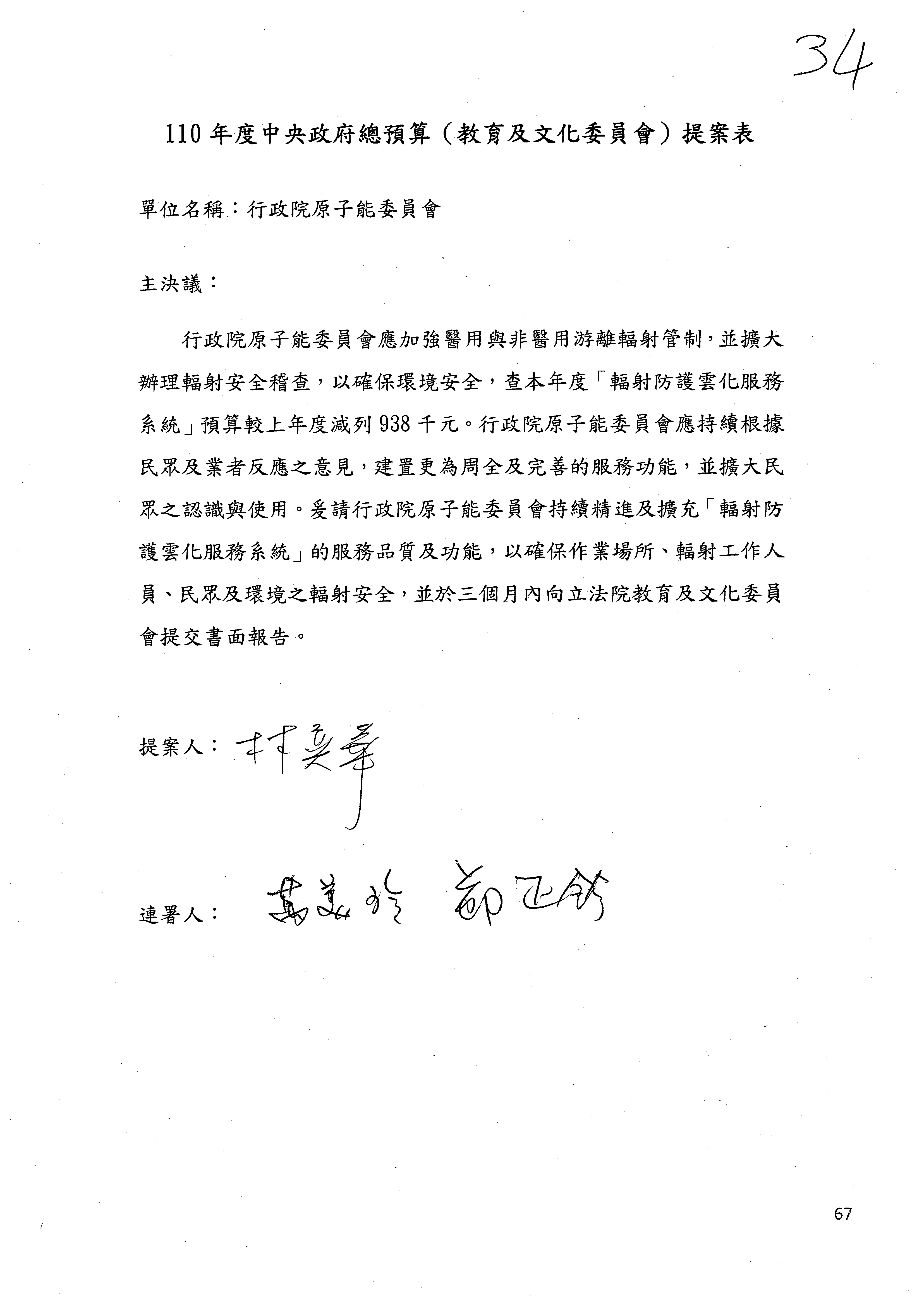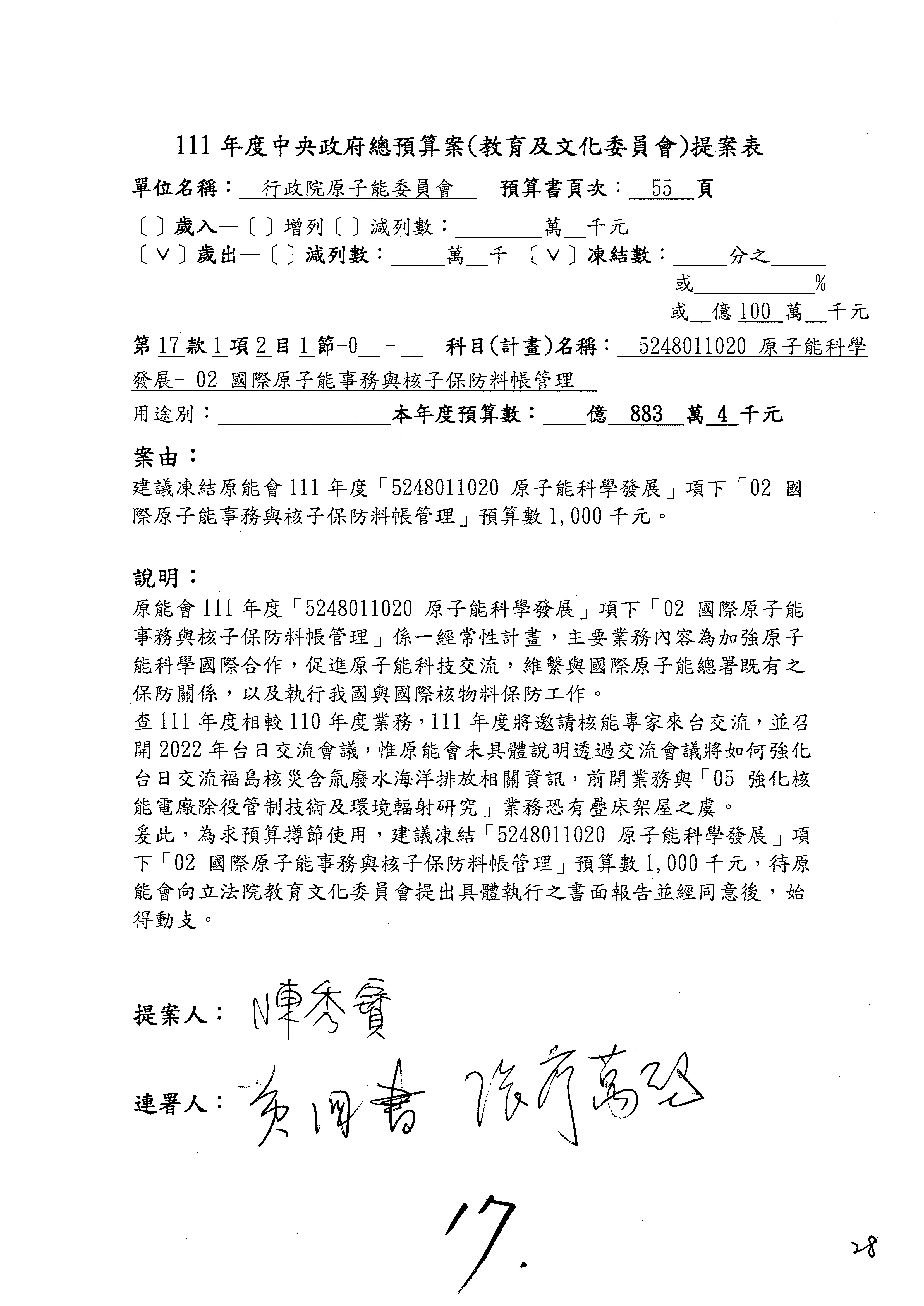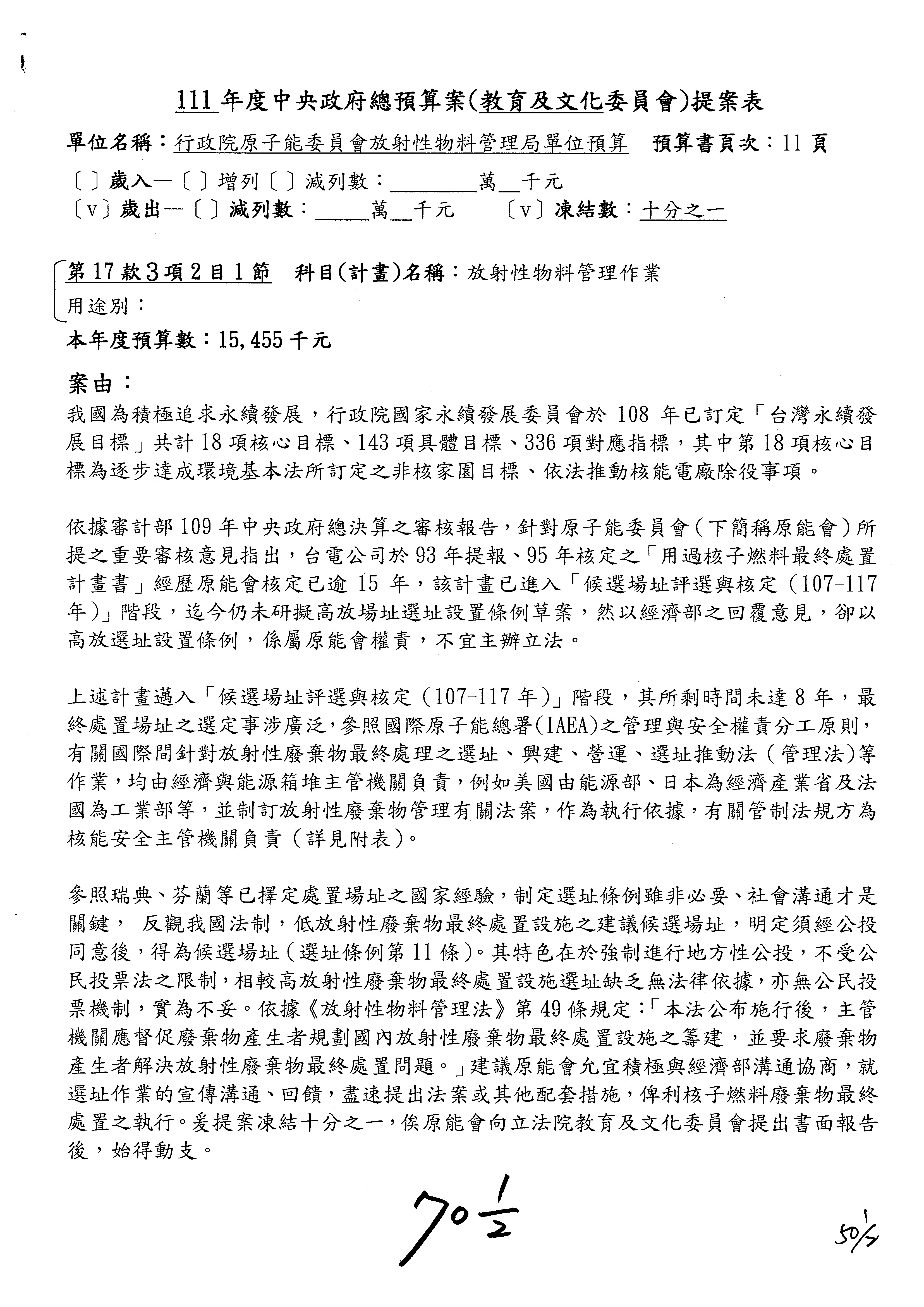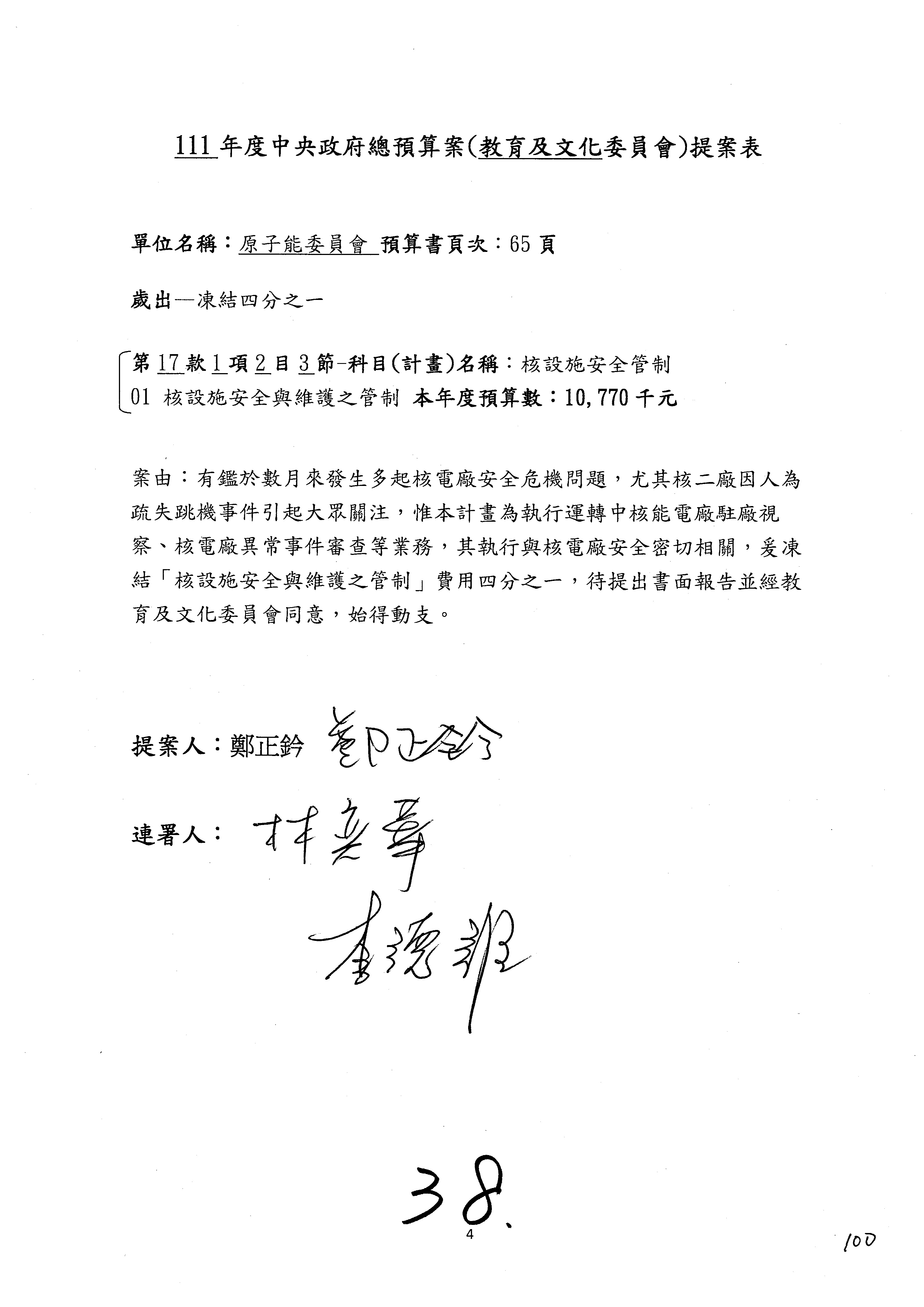 主席:針對本目本席也有一項提案,本席的提案是第94案,我的提案精神和陳秀寳委員的提案一樣,其實TRR除役計畫在93年就已經核定除役期限是118年3月,可是按照預算中心的資料,第二期計畫出現落後的狀況,為了能夠如期達成在118年完成TRR除役計畫目標,當然就要期待並積極監督你們的執行進度,其實這都是為了達到敦促的目的,所以才會用凍結的方式要求你們提出書面報告,藉此來看你們要如何確實掌握執行進度。針對這一目,我看大部分的想法都是這樣,所以是不是大家來討論一下要如何凍結?