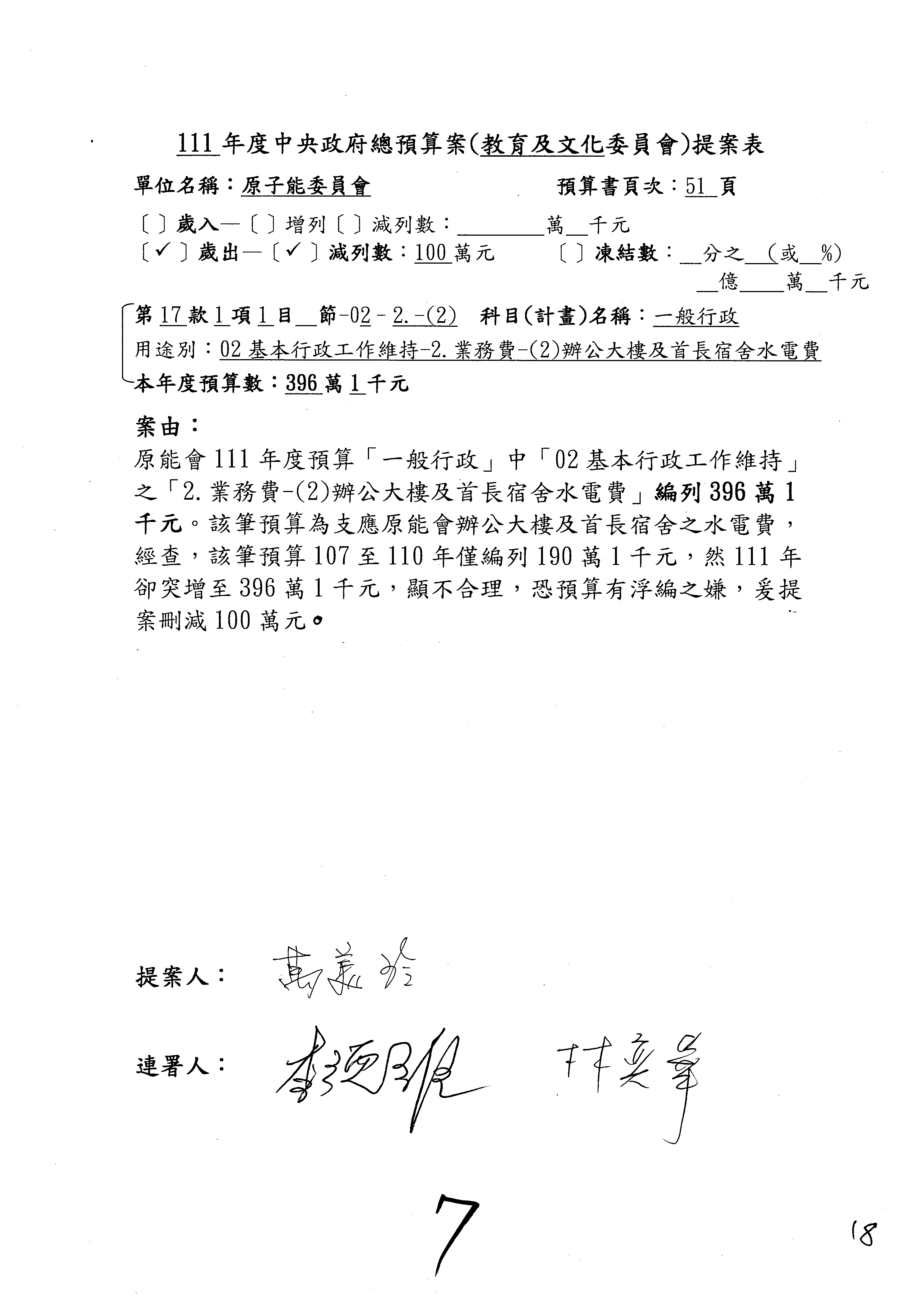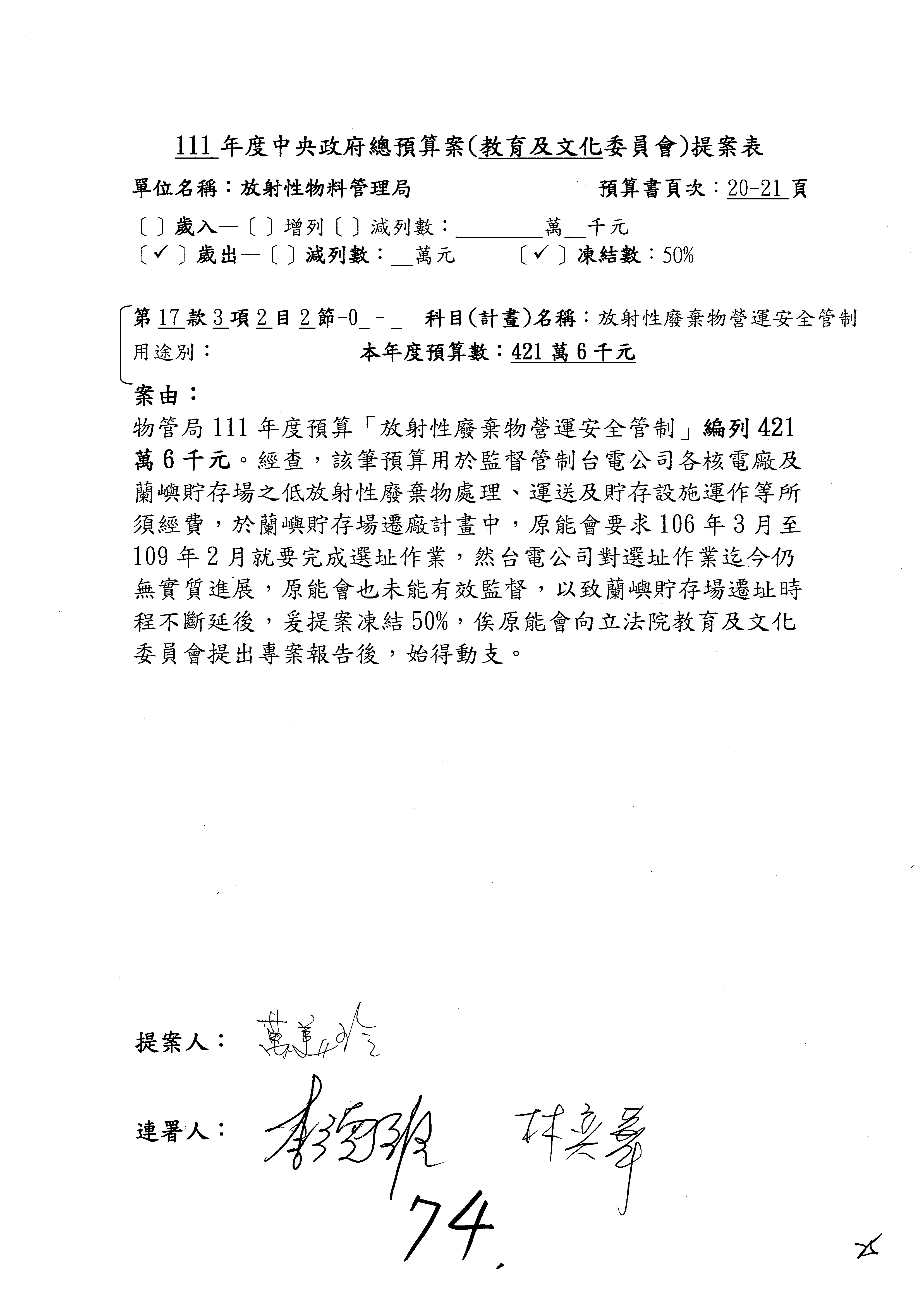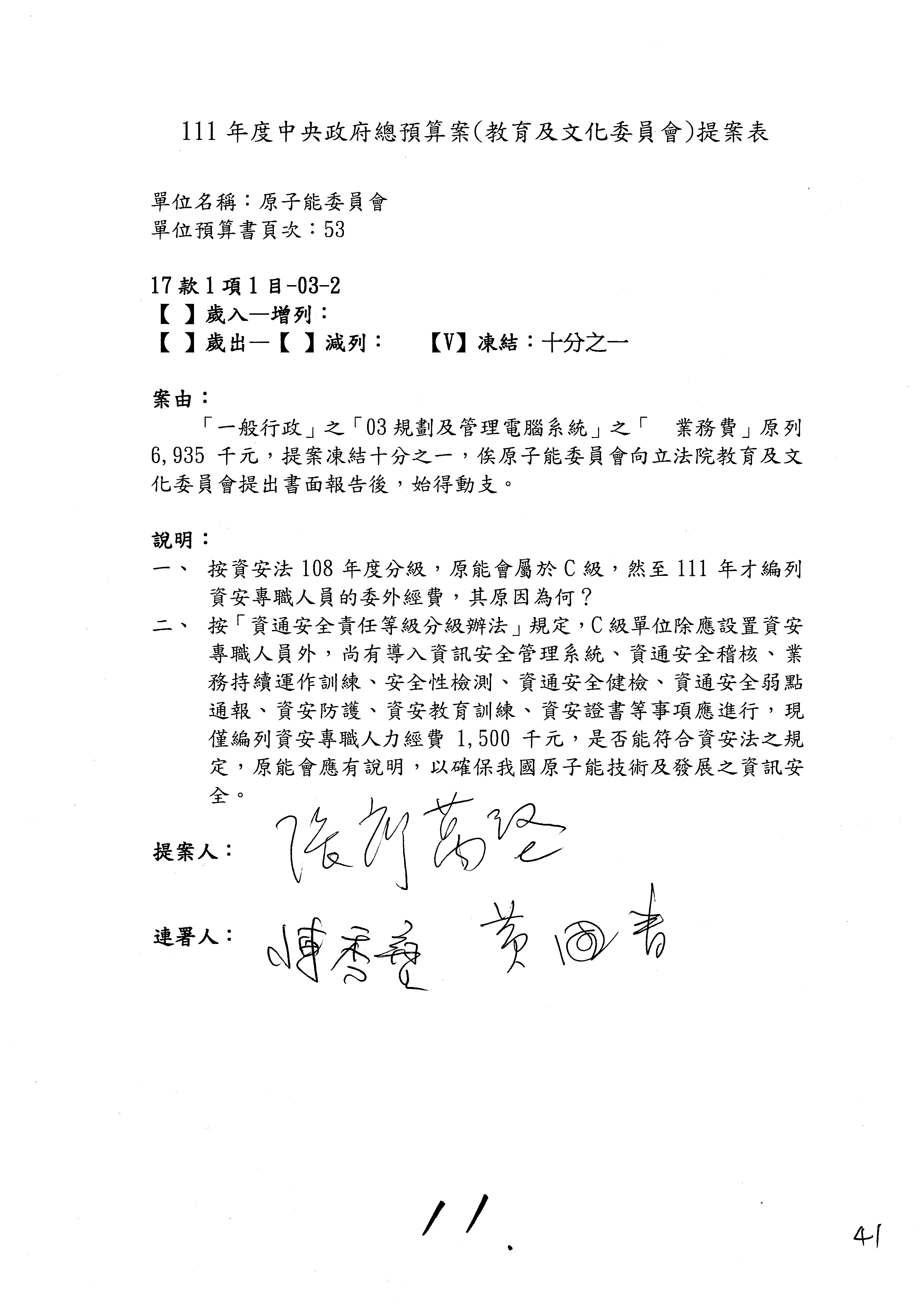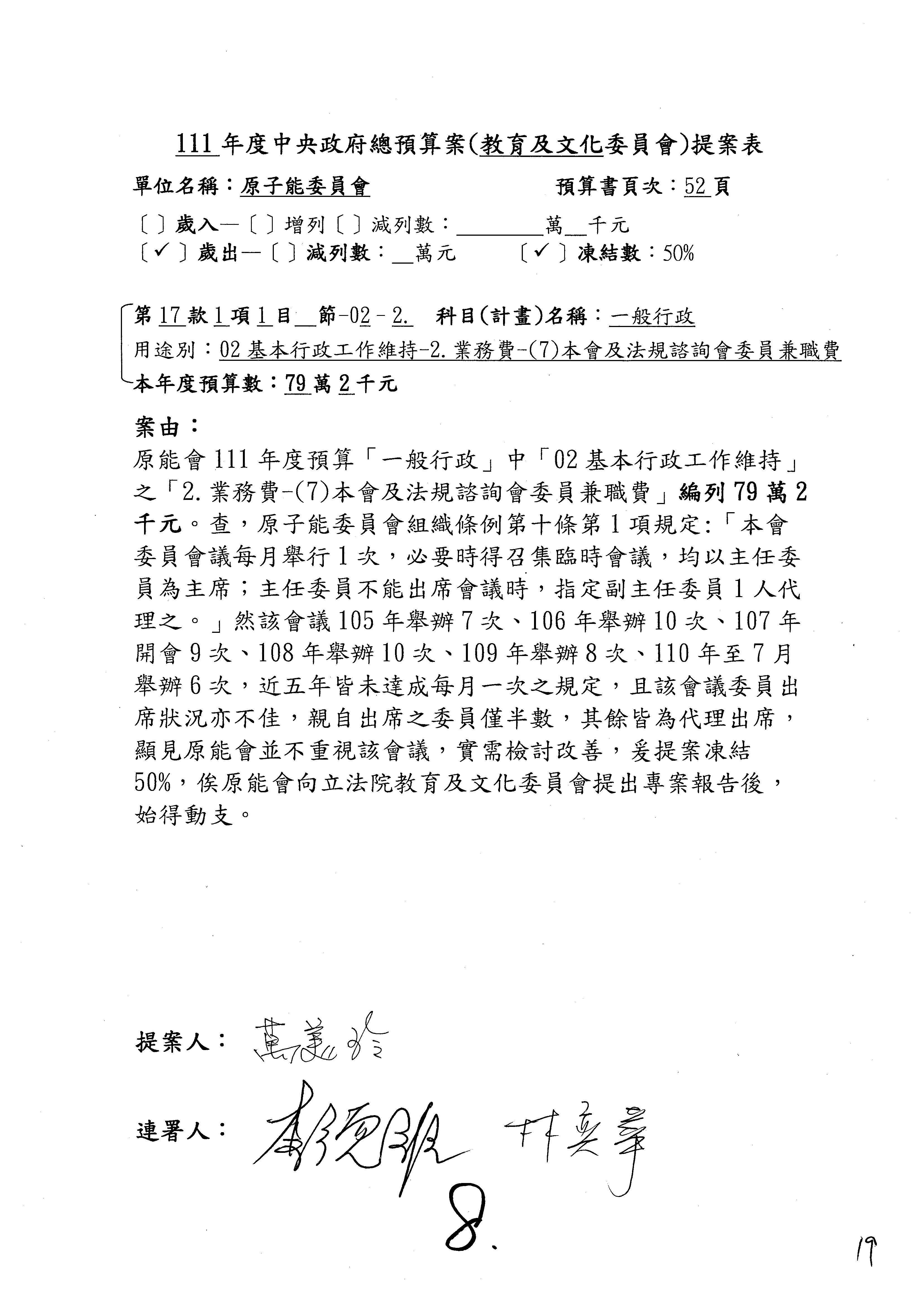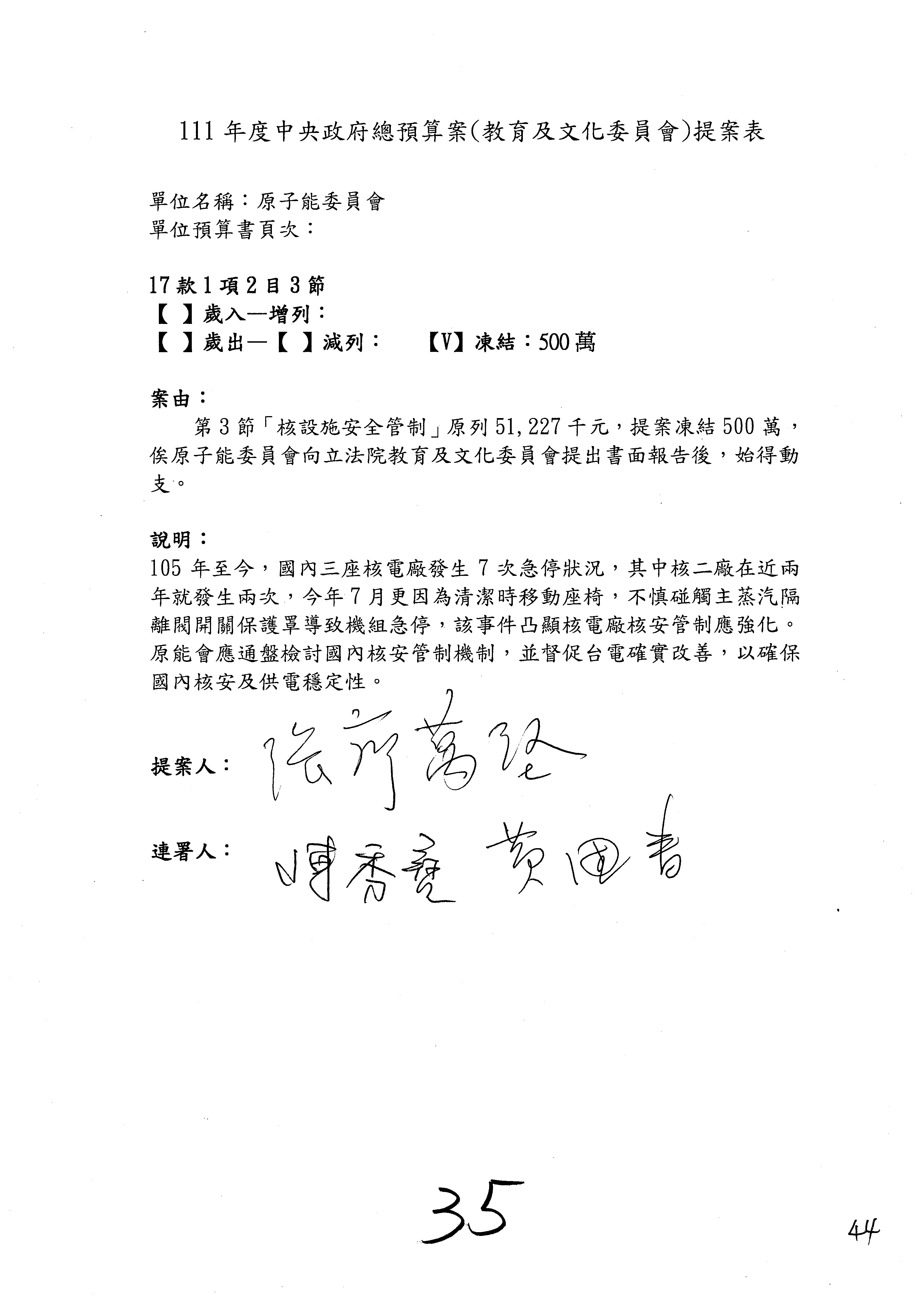 主席:針對本目本席也有一項提案,本席的提案是第94案,我的提案精神和陳秀寳委員的提案一樣,其實TRR除役計畫在93年就已經核定除役期限是118年3月,可是按照預算中心的資料,第二期計畫出現落後的狀況,為了能夠如期達成在118年完成TRR除役計畫目標,當然就要期待並積極監督你們的執行進度,其實這都是為了達到敦促的目的,所以才會用凍結的方式要求你們提出書面報告,藉此來看你們要如何確實掌握執行進度。針對這一目,我看大部分的想法都是這樣,所以是不是大家來討論一下要如何凍結?
