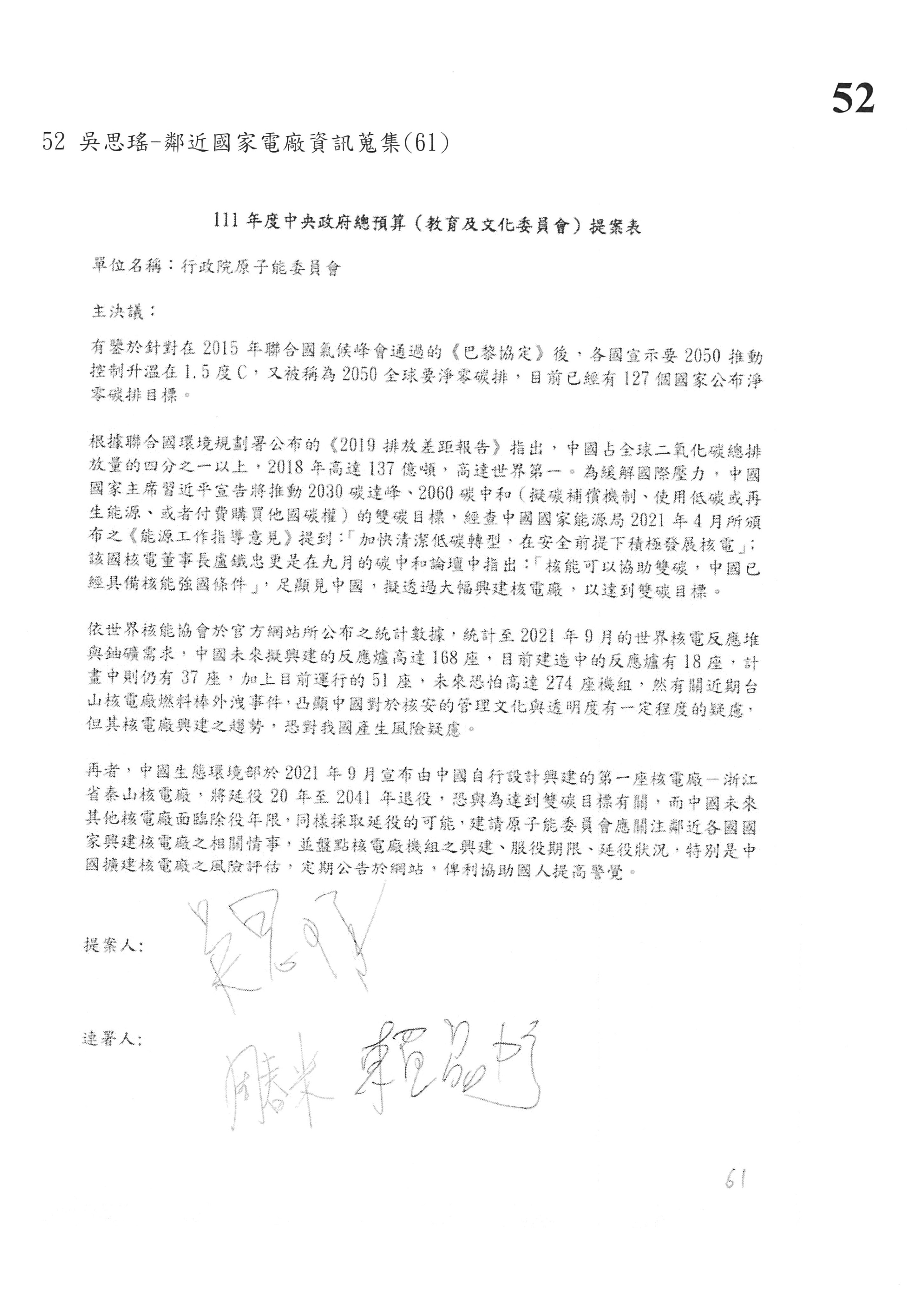 吳委員思瑤:本席有兩項提案,在溝通之後,我比較清楚第89案必須要有主委的說明,針對福島核廢水,不分黨派的委員都非常關心,對於那麼遠的福島核廢水都關心成這樣,每次都一直在質詢,我想對於鄰近在我們身旁的中國大陸的核電廠相關核安,應該也要有非常清楚的資訊透明機制及相當程度的資訊掌握。2021年6月廣東台山核電廠事件是被媒體揭露的,在揭露之後,我們才知道原來台山核電廠有這些輻射外洩的情事,只是臺灣沒有相關資訊,因為我們並不是IAEA的成員,任何資訊又隔一層紗。針對中國大陸的部分,不只是目前運行中的51座機組,加上興建中的,總共有274座機組就在我們的隔壁,所以我希望能夠有一個很清楚的預警或是資訊透明機制。