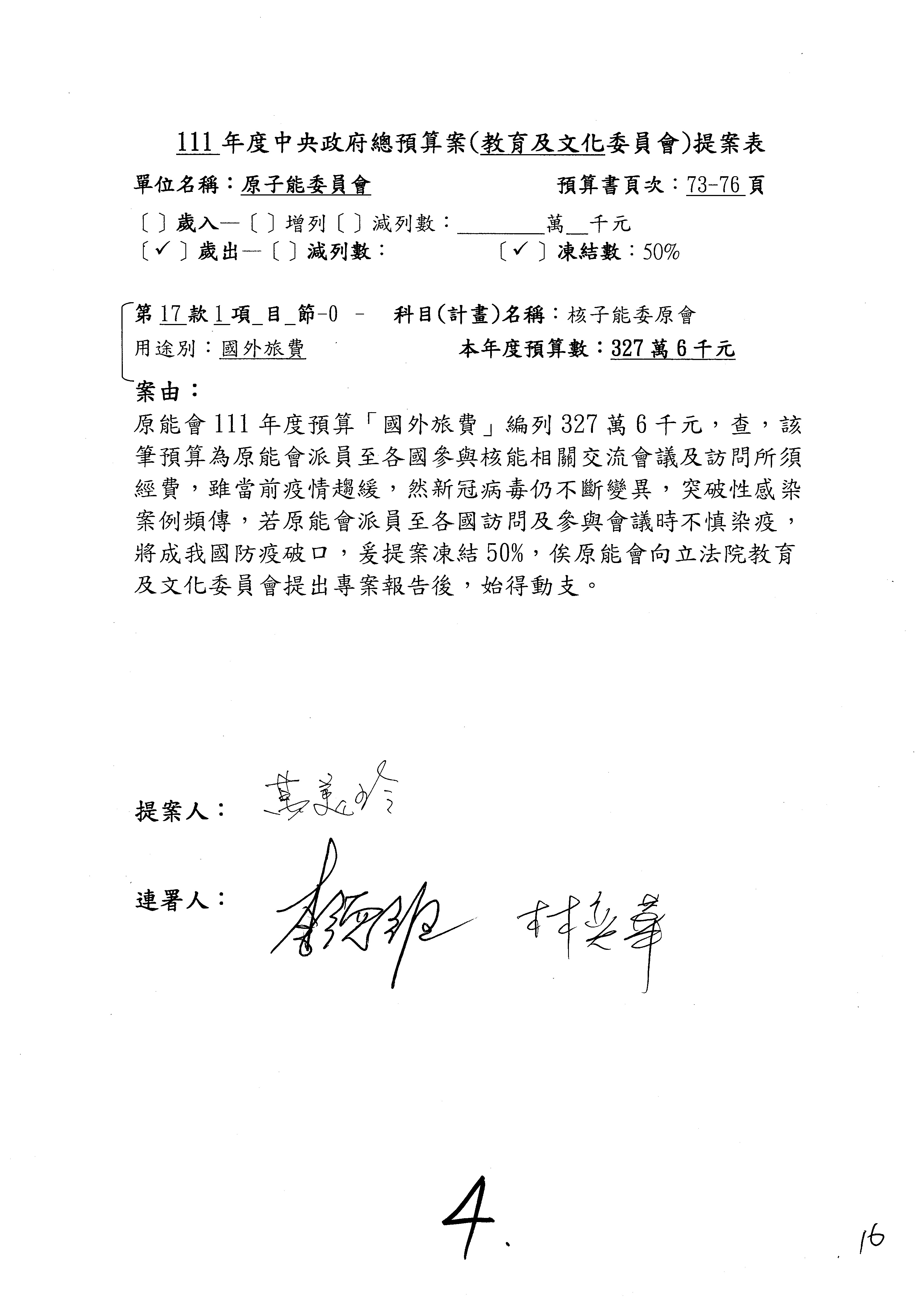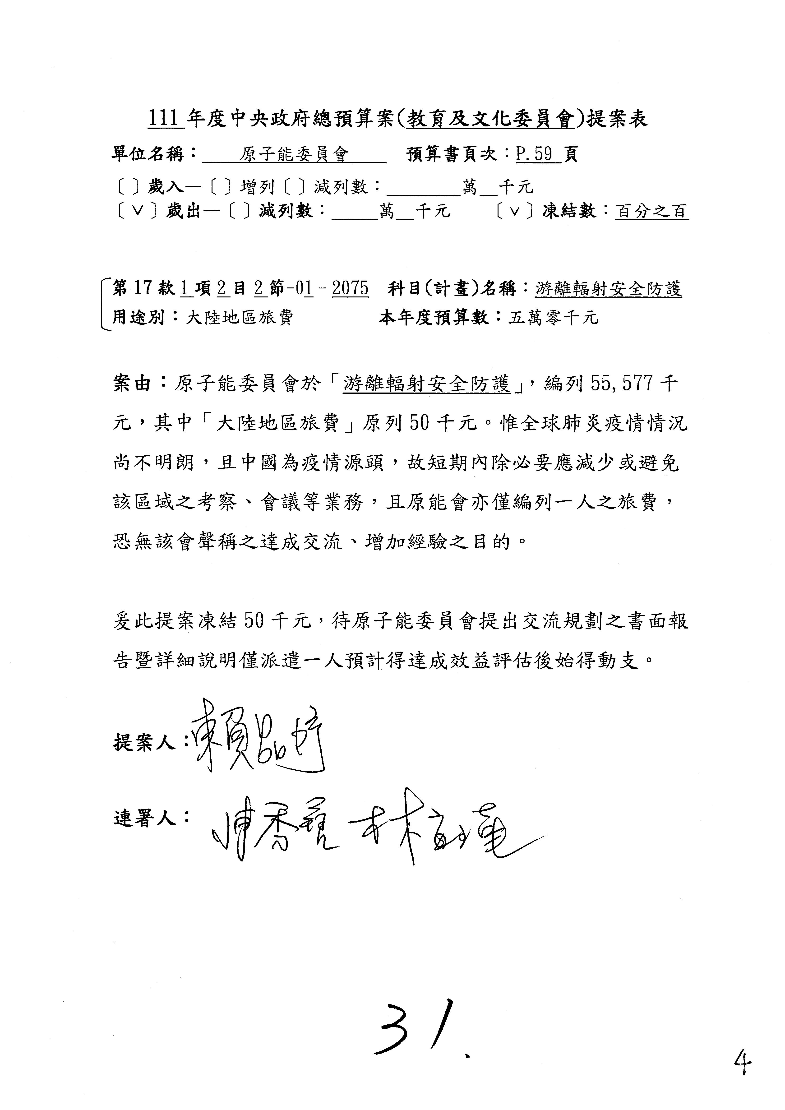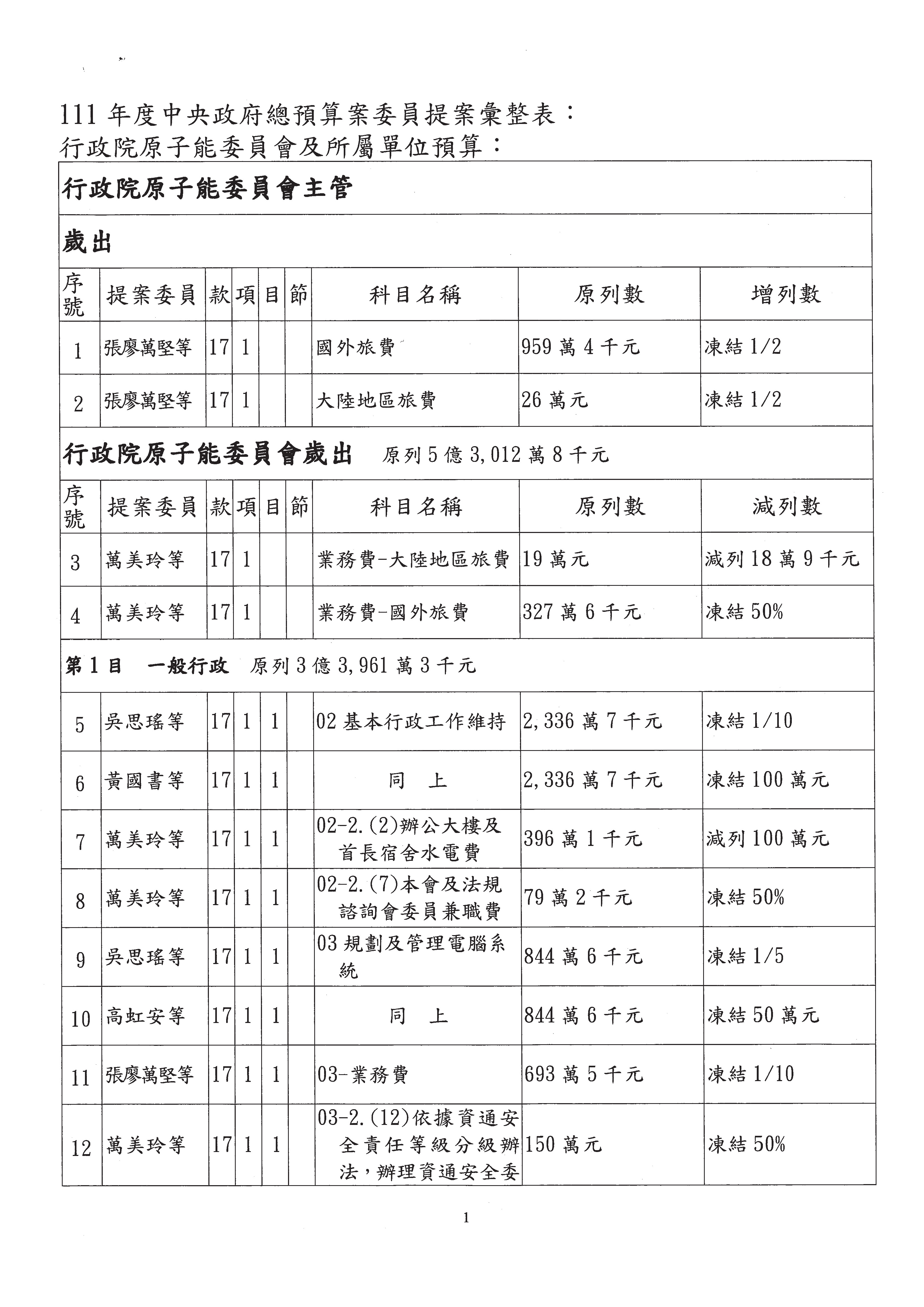 針對這一目,賴品妤委員提案凍結國外旅費,原能會要不要做一些說明?