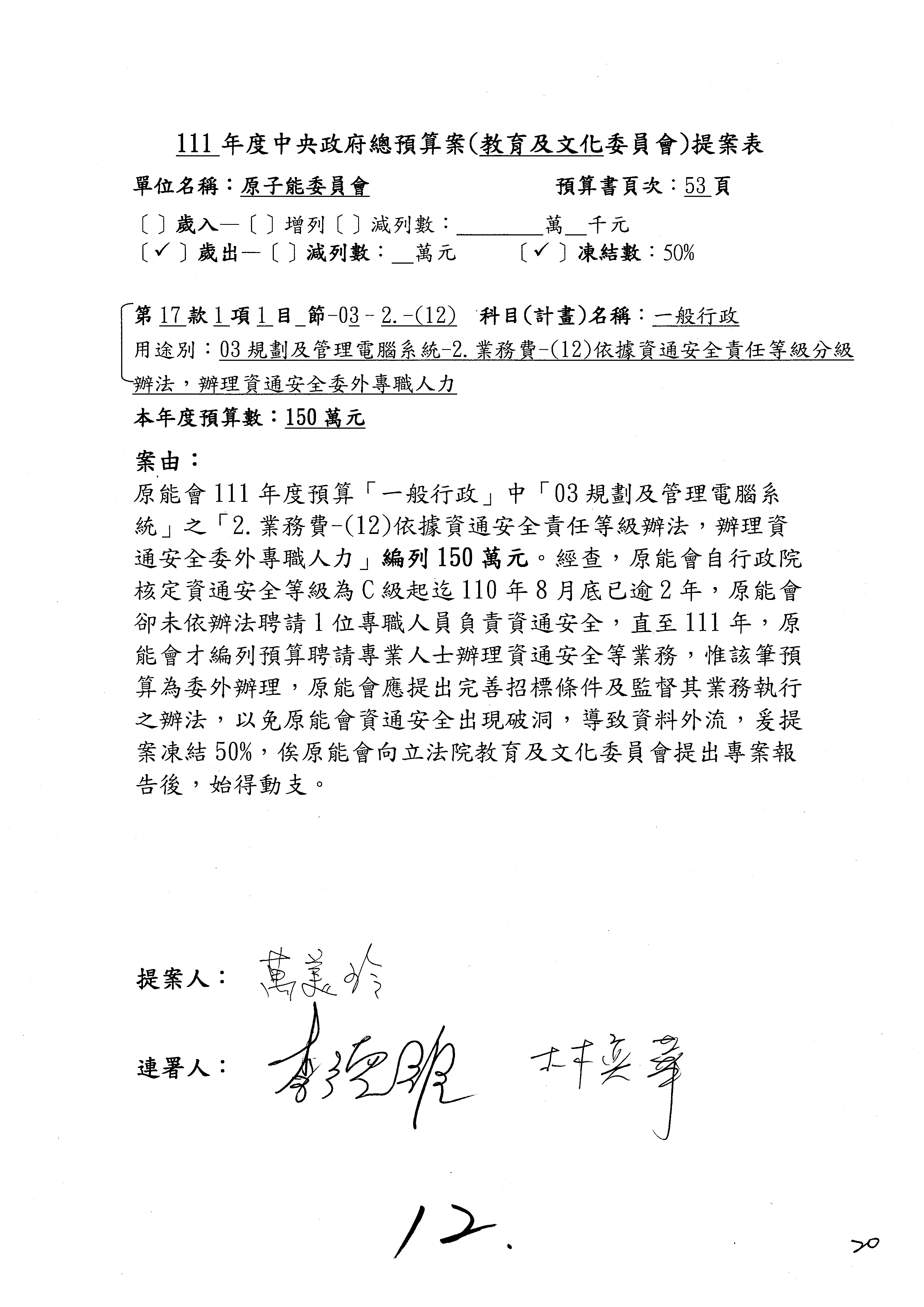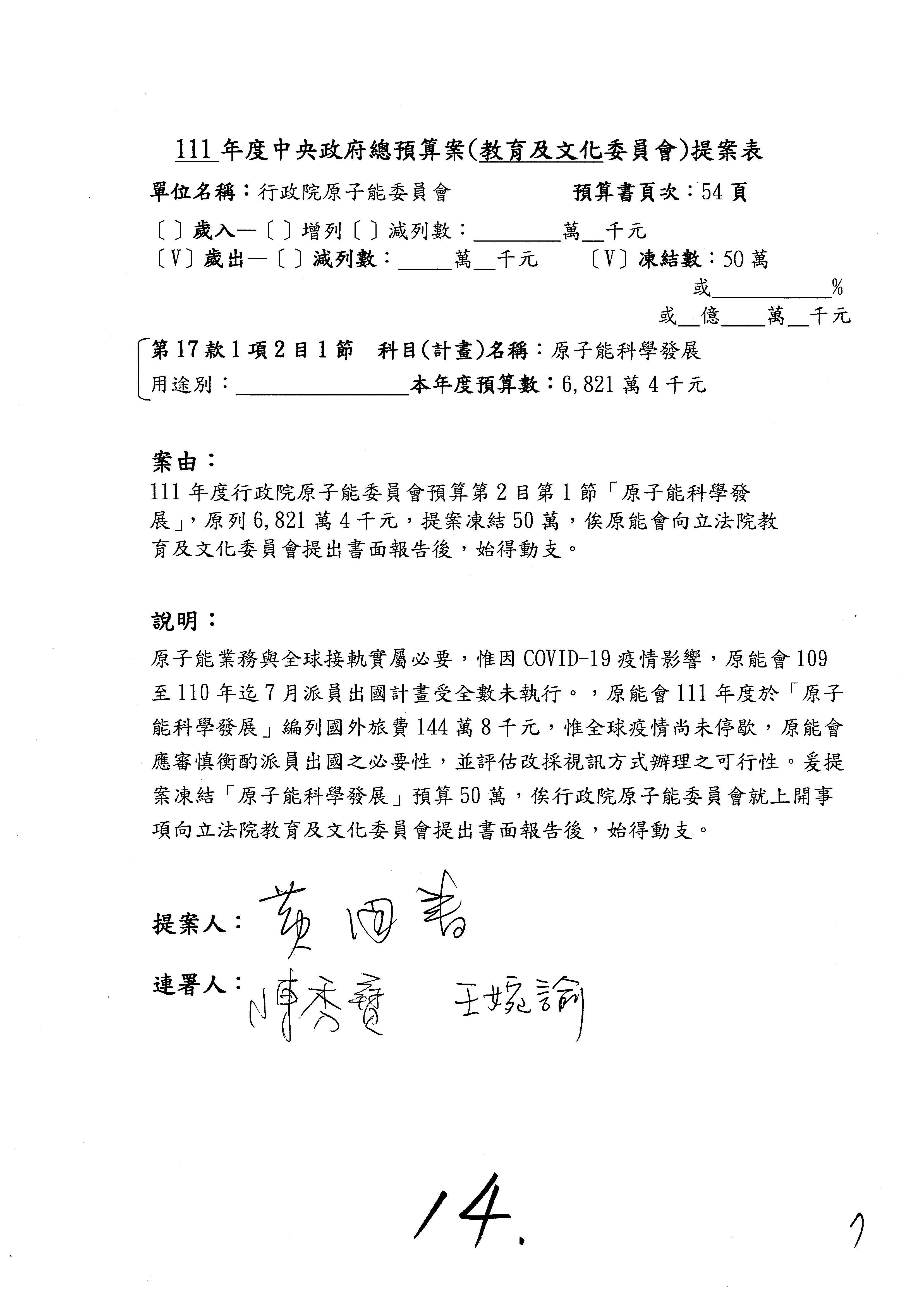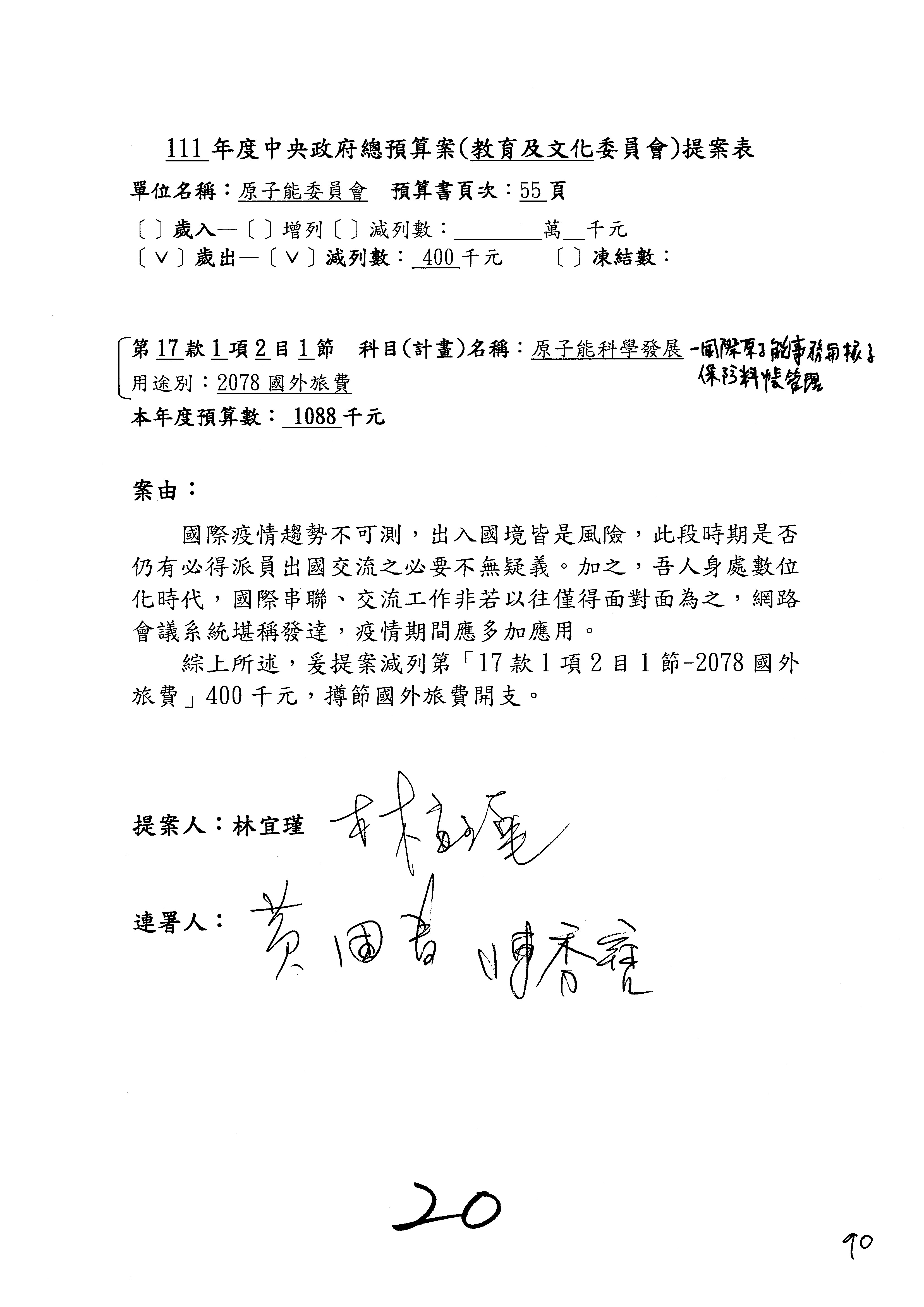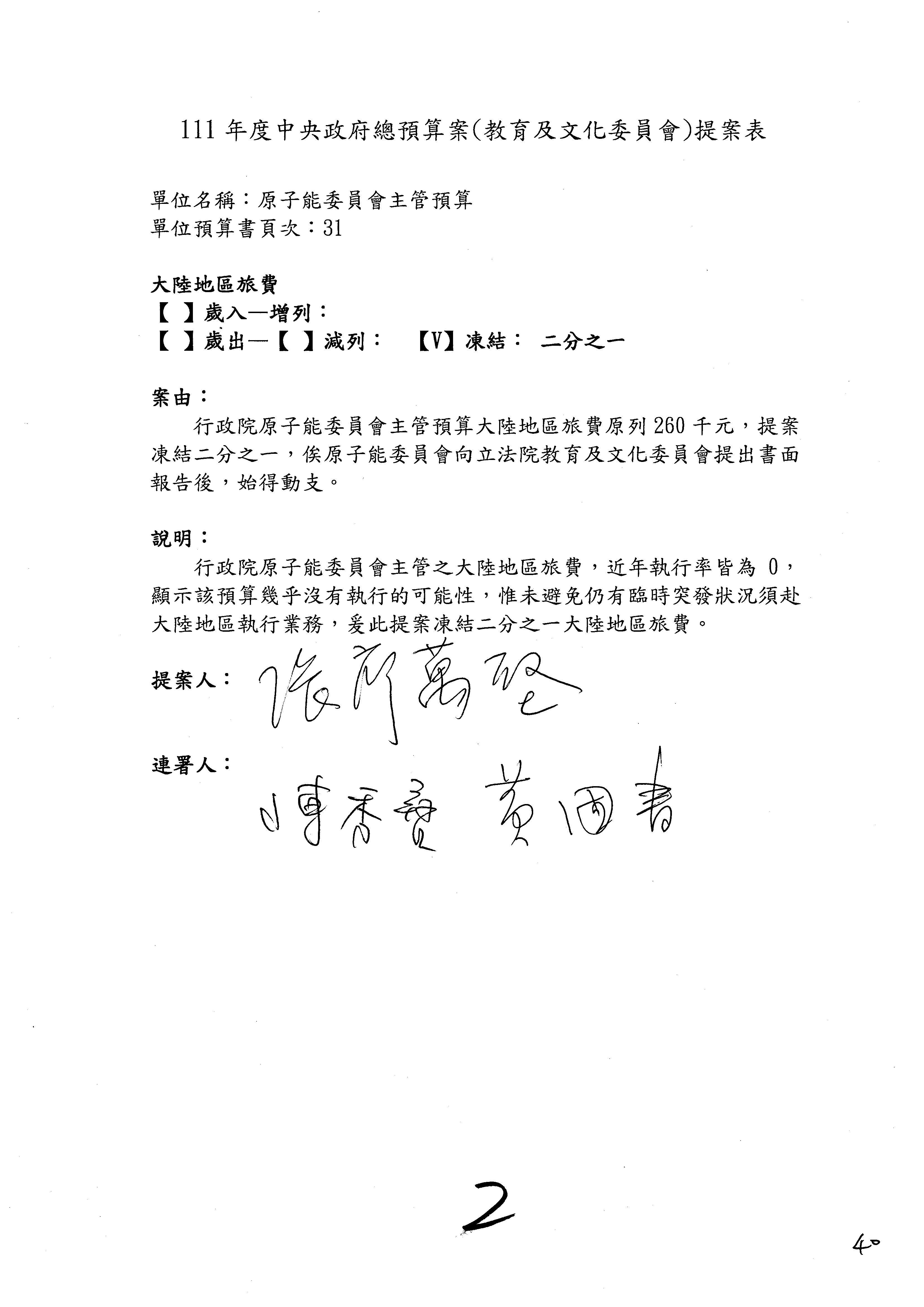 針對這一目,賴品妤委員提案凍結國外旅費,原能會要不要做一些說明?
