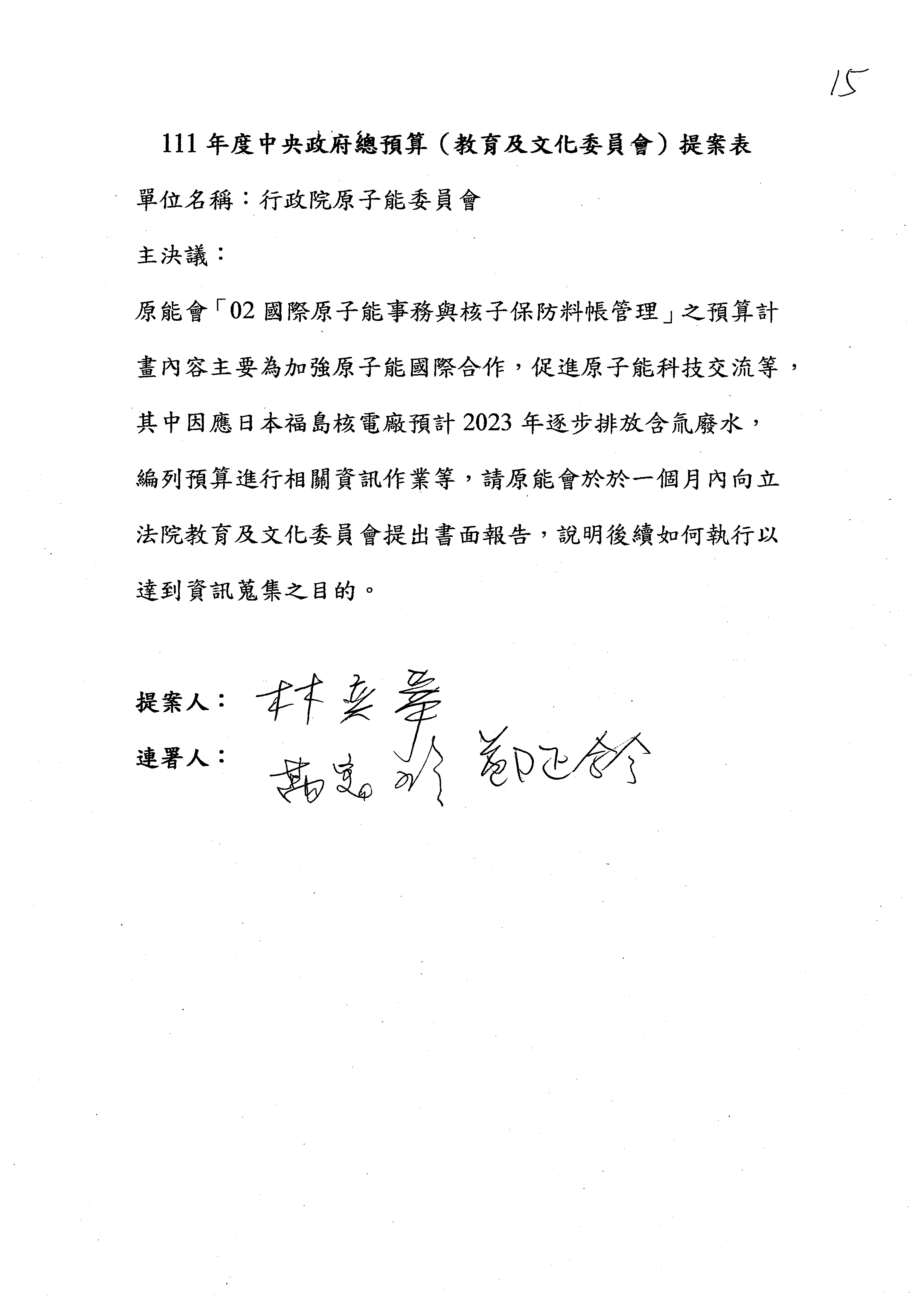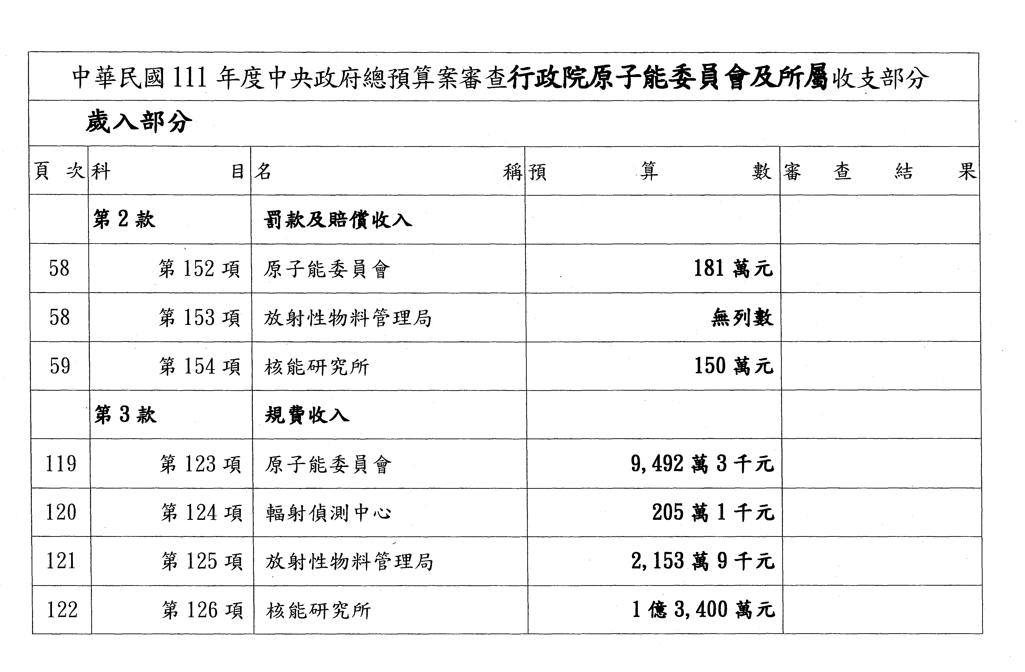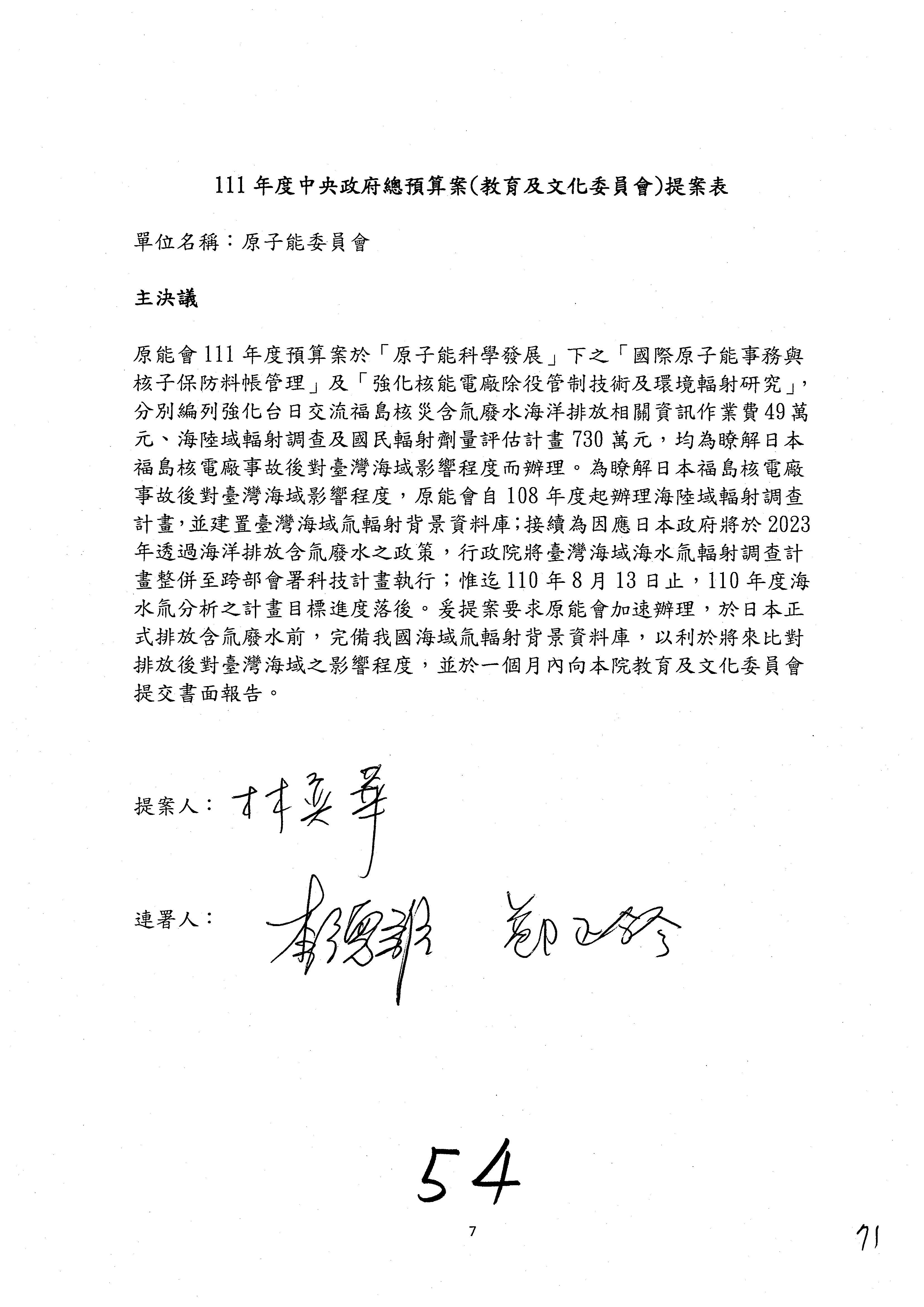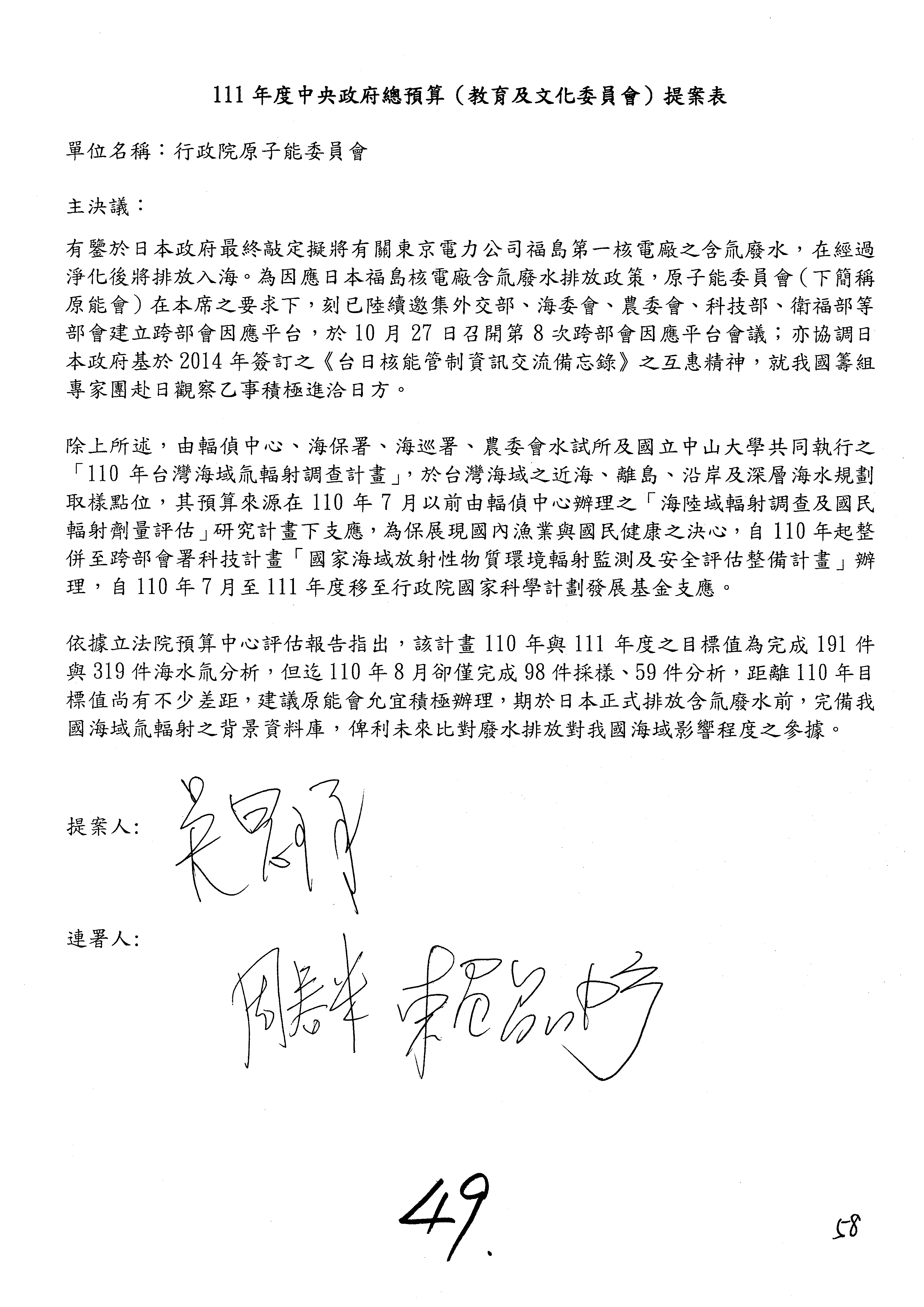 另外,剛才我們解釋時曾提及海域的部分,針對這1.09億元的預算,我們不會只看待日本的部分,其實我們也會注意大陸的部分,112年我們會開始建立海洋方面的資料,之後等海洋的資料建立成熟,大陸大氣的部分也成熟了,我們的長期規劃就是把兩者結合在一起,變成一個真正for大陸核電廠的部分。