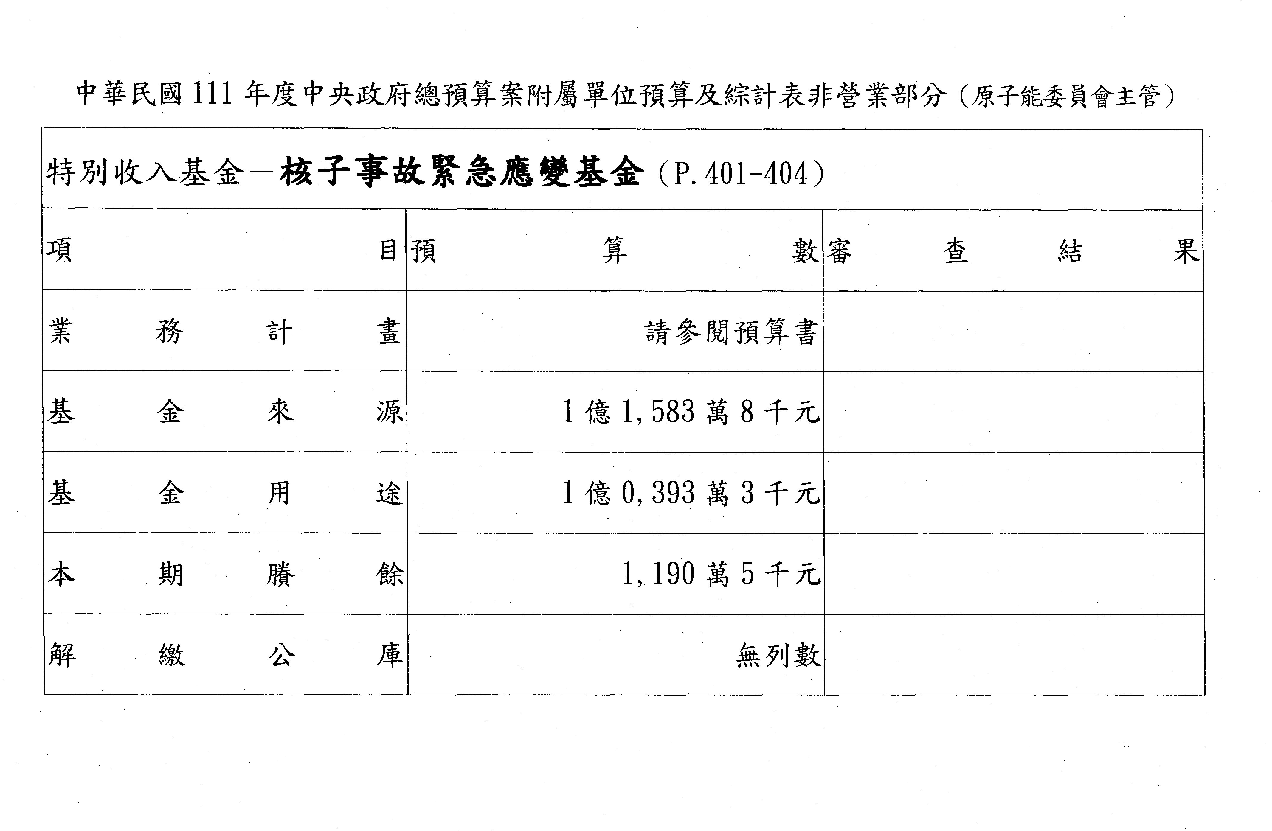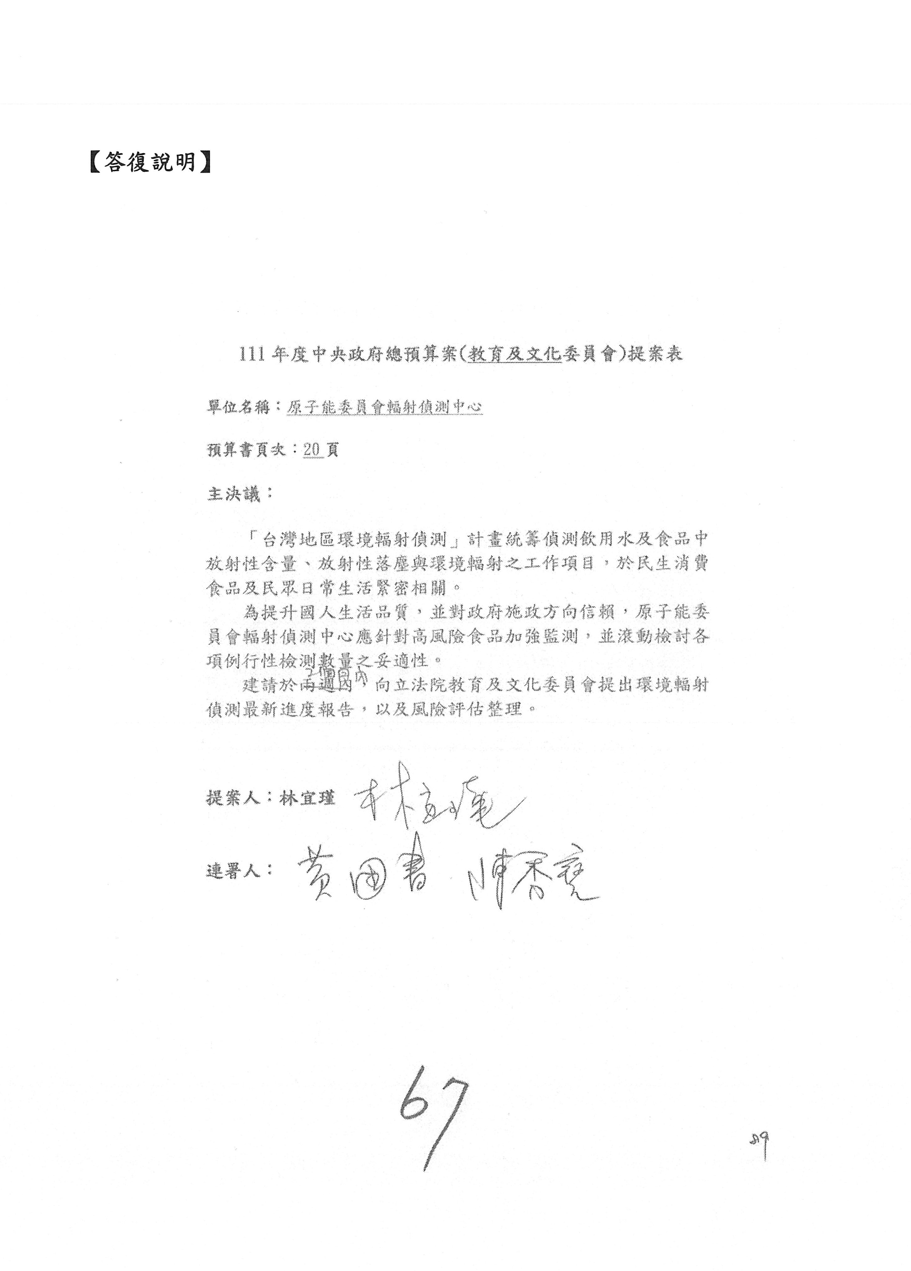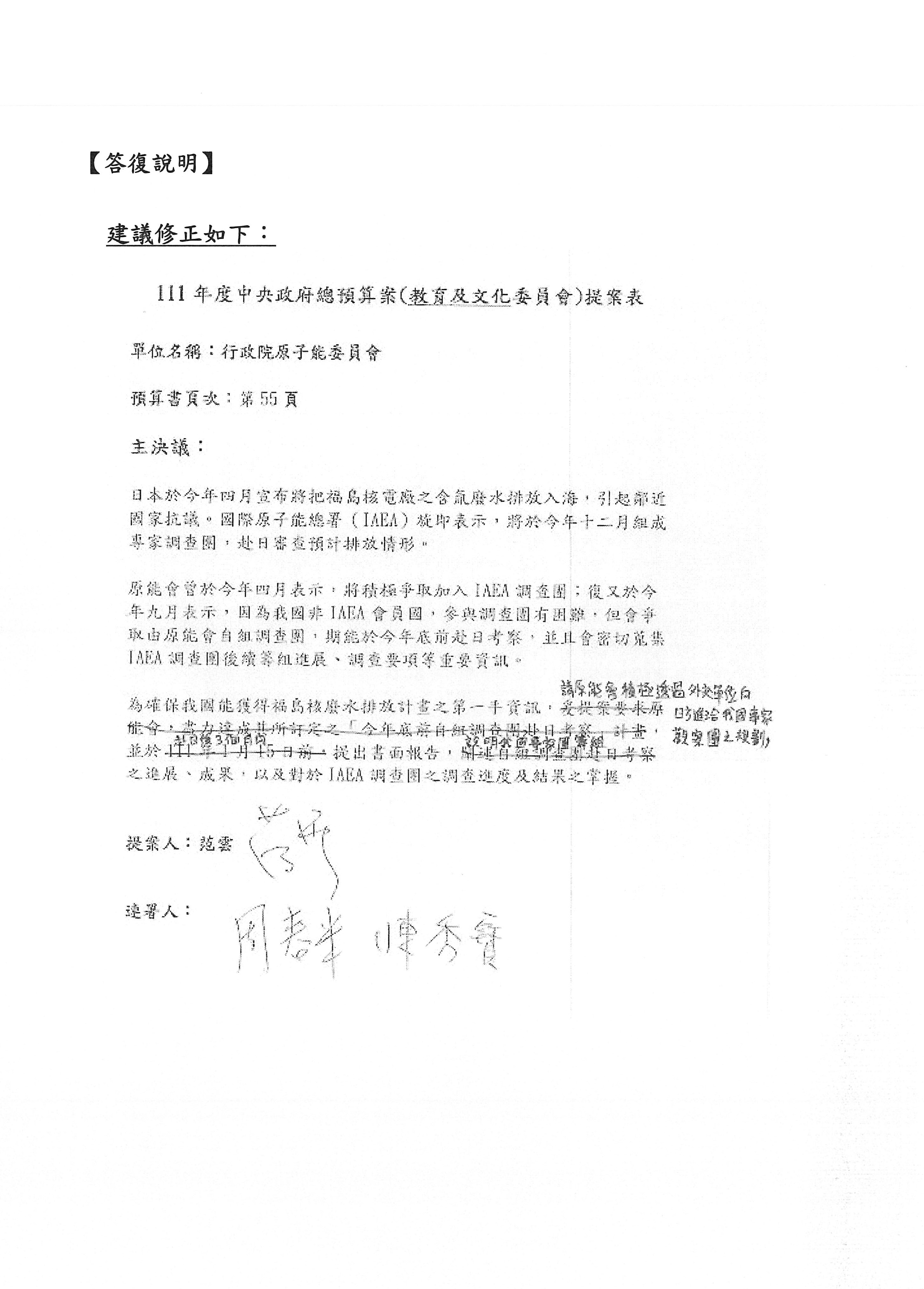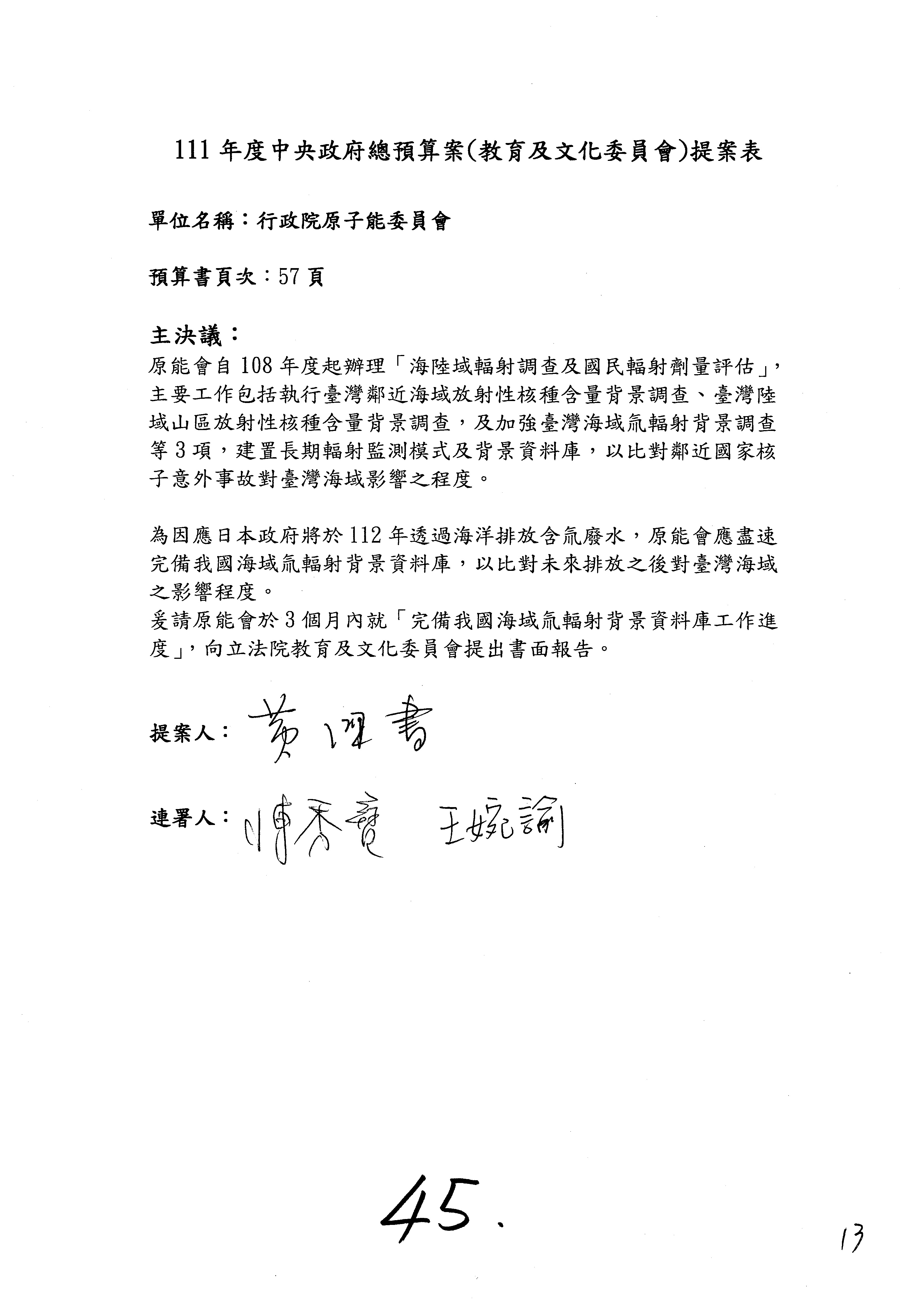 另外,剛才我們解釋時曾提及海域的部分,針對這1.09億元的預算,我們不會只看待日本的部分,其實我們也會注意大陸的部分,112年我們會開始建立海洋方面的資料,之後等海洋的資料建立成熟,大陸大氣的部分也成熟了,我們的長期規劃就是把兩者結合在一起,變成一個真正for大陸核電廠的部分。