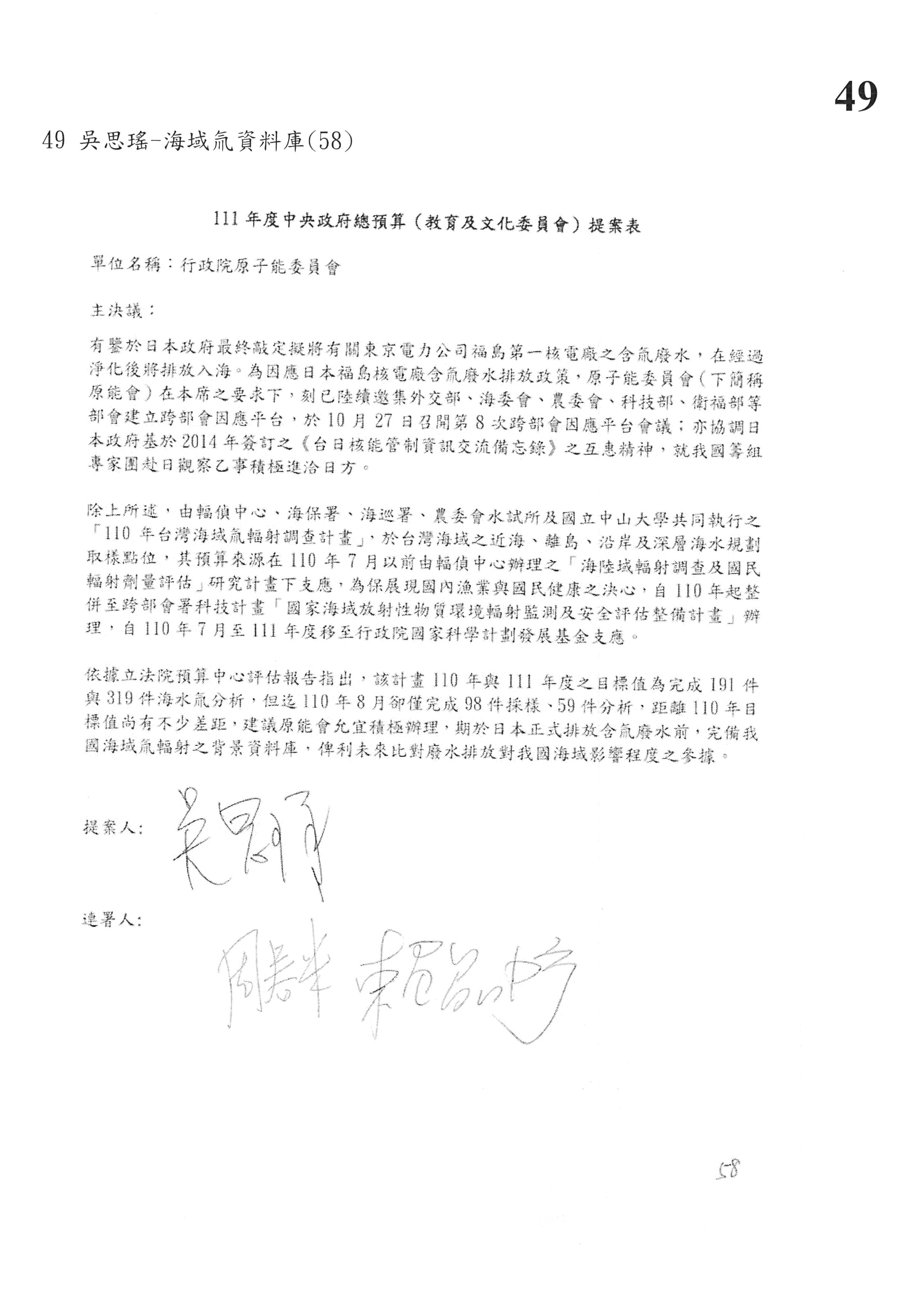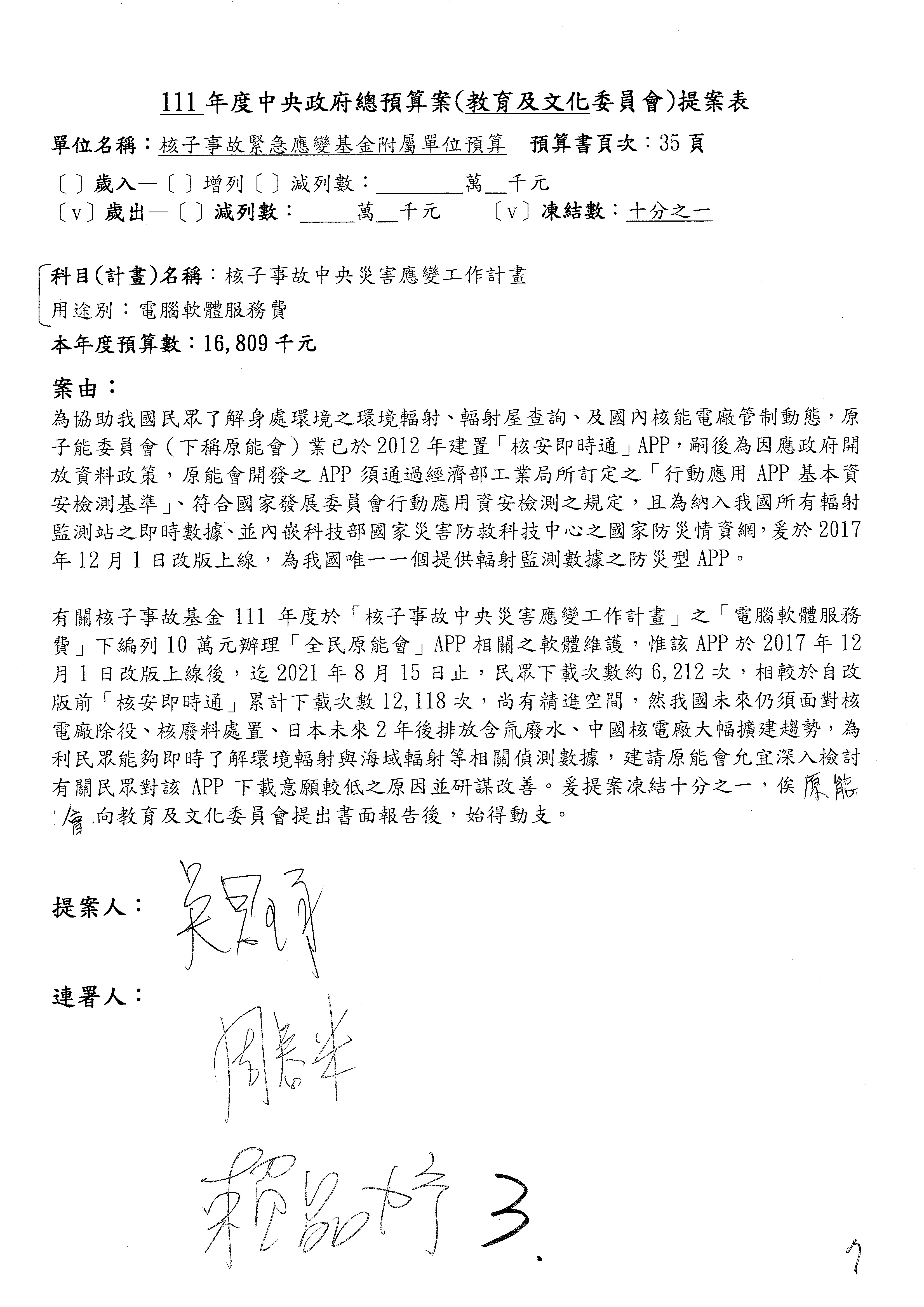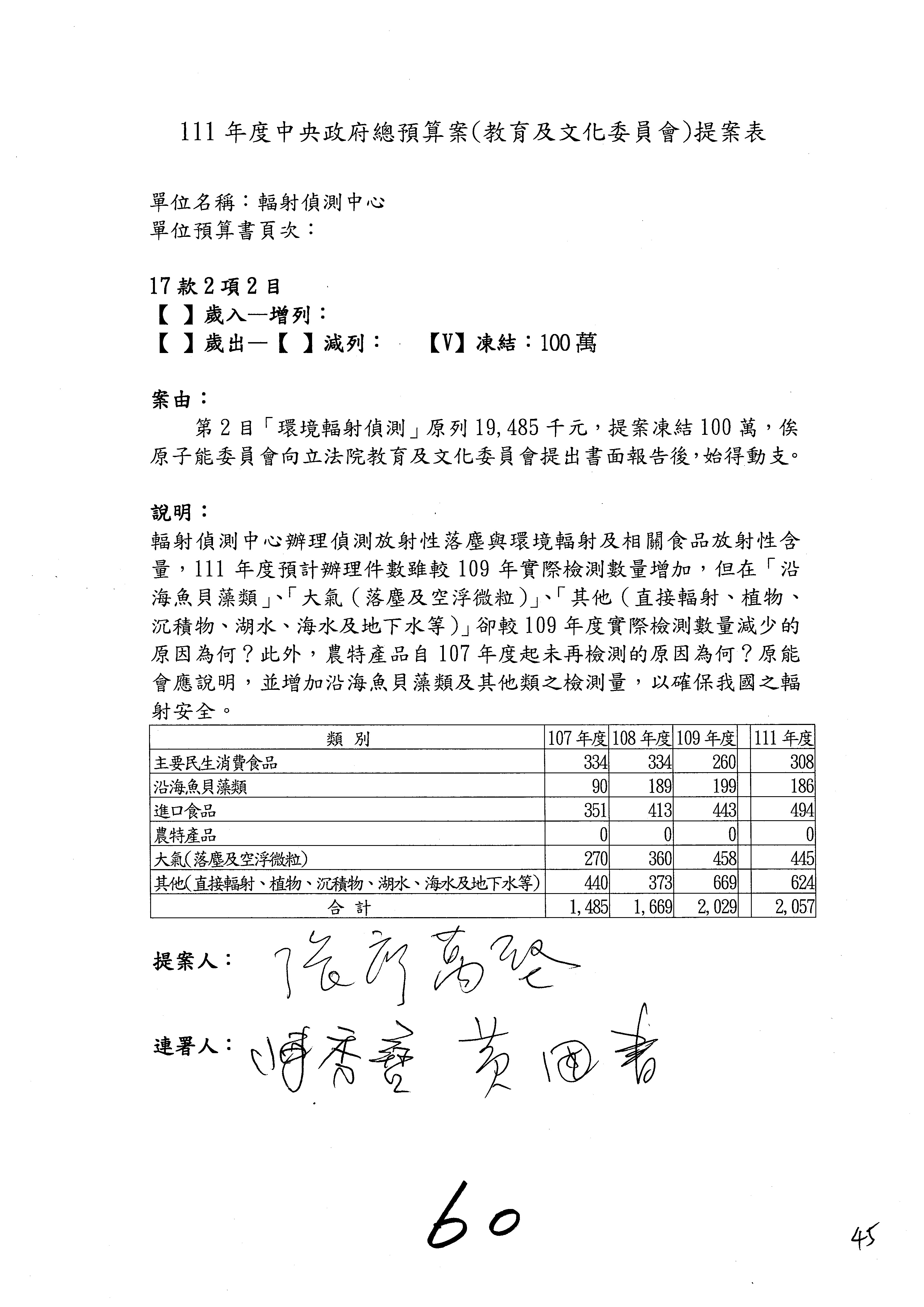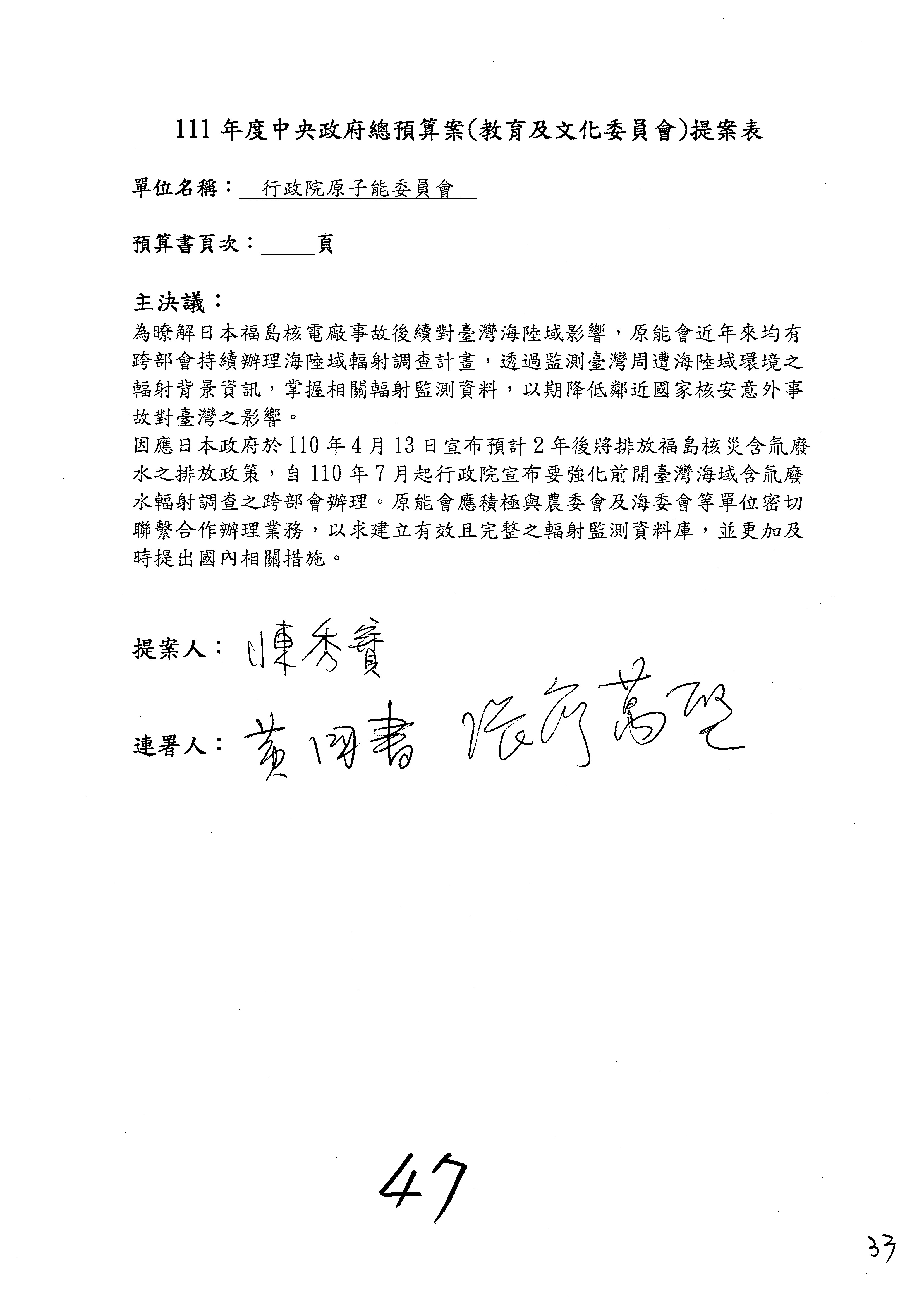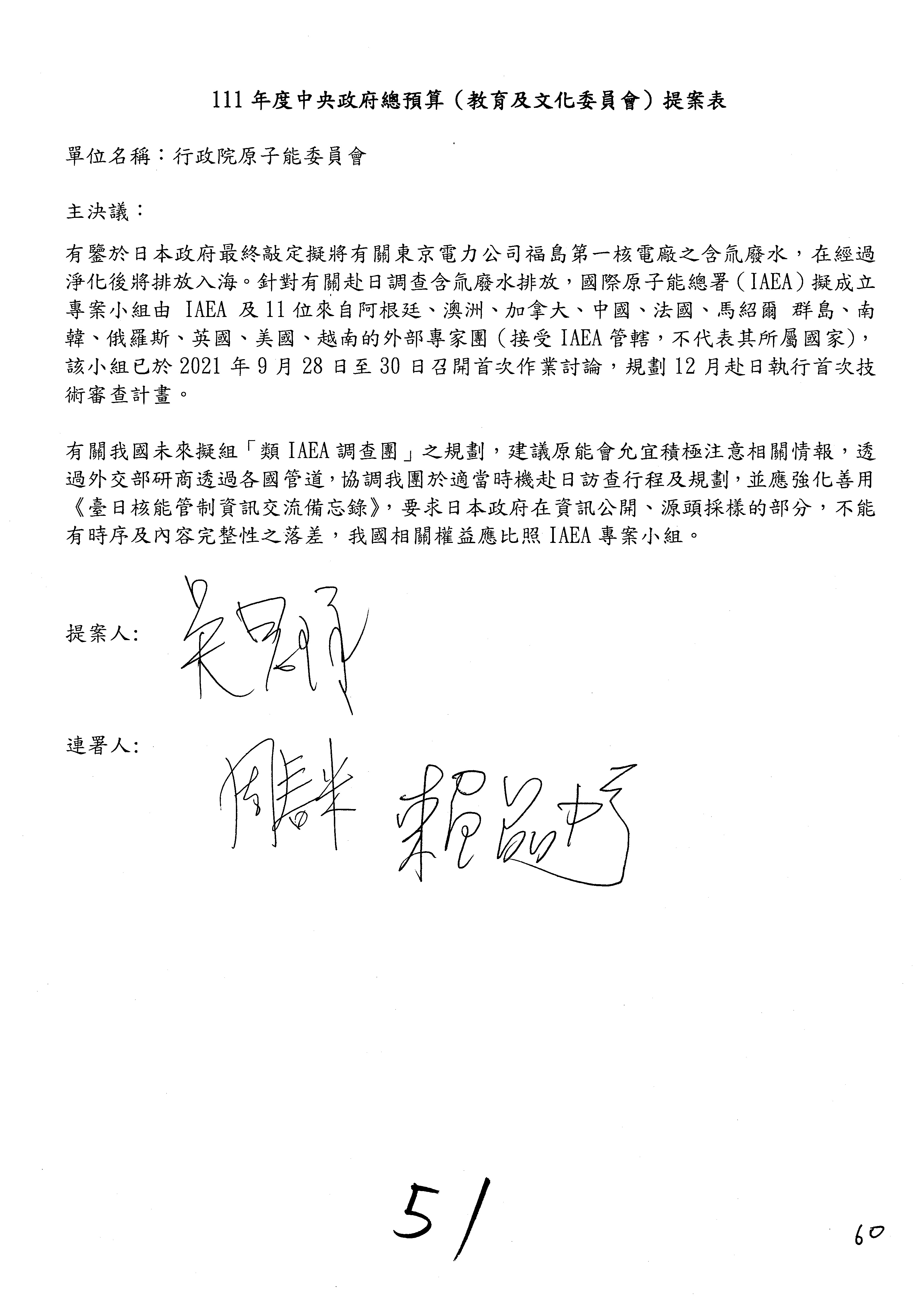 另外,剛才我們解釋時曾提及海域的部分,針對這1.09億元的預算,我們不會只看待日本的部分,其實我們也會注意大陸的部分,112年我們會開始建立海洋方面的資料,之後等海洋的資料建立成熟,大陸大氣的部分也成熟了,我們的長期規劃就是把兩者結合在一起,變成一個真正for大陸核電廠的部分。
