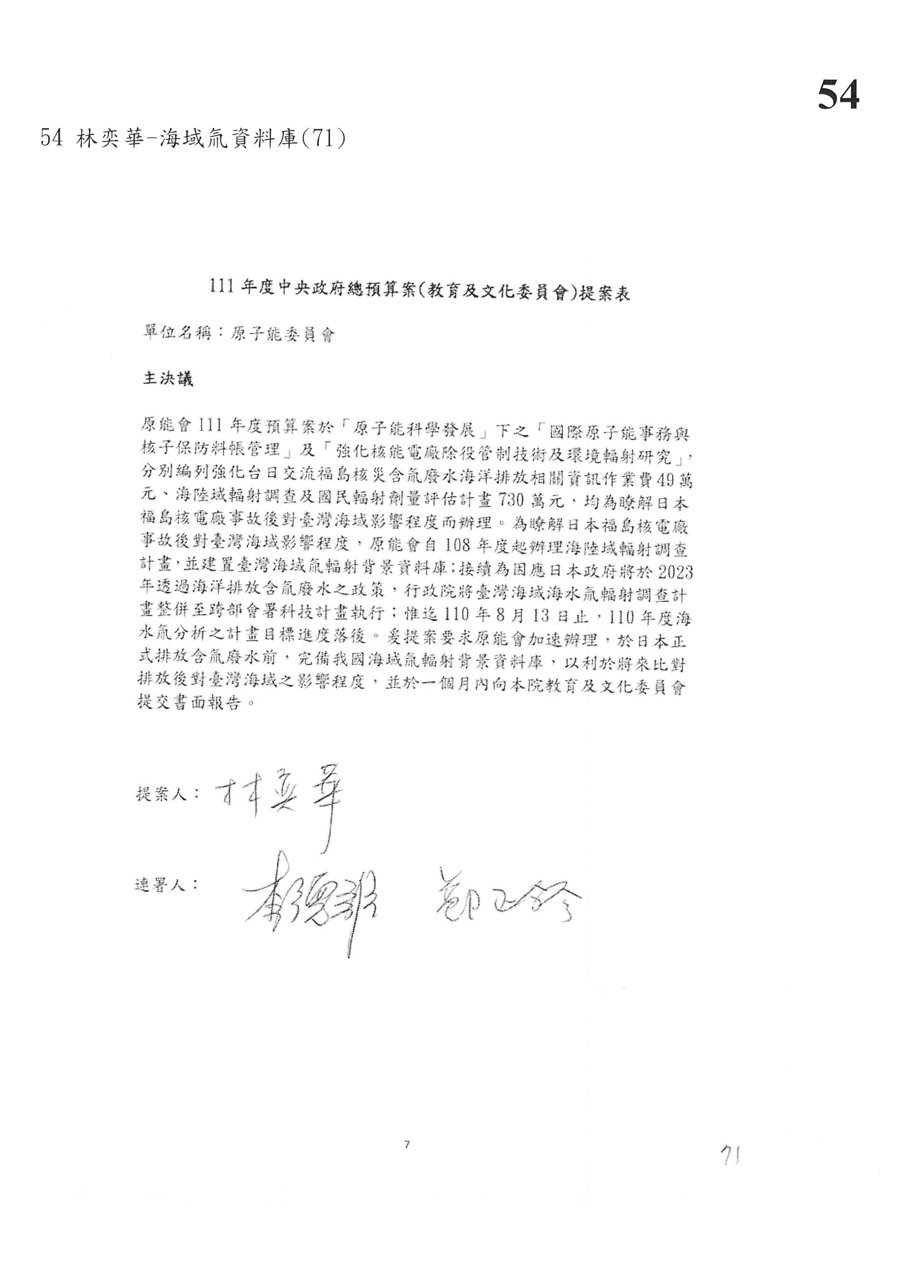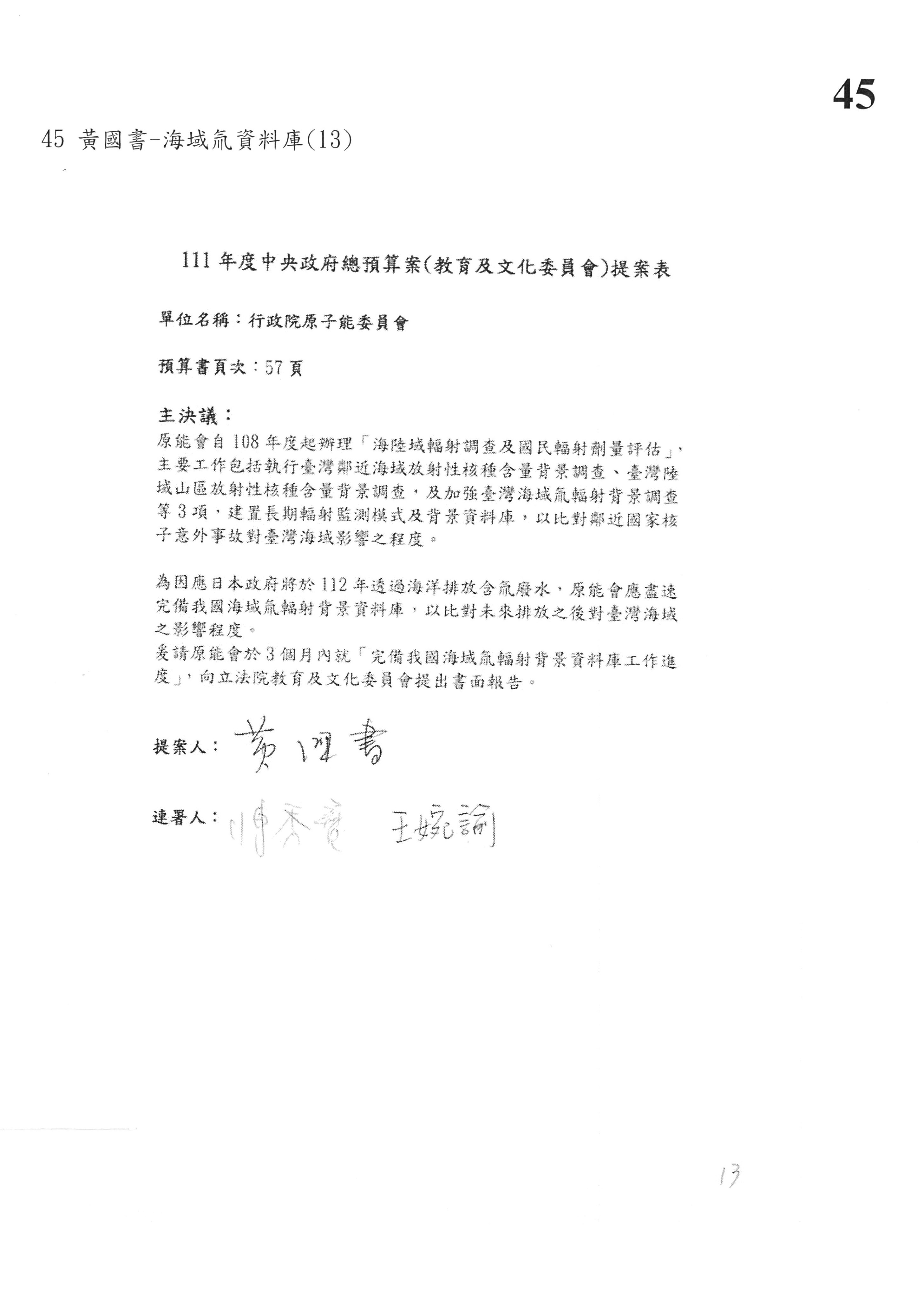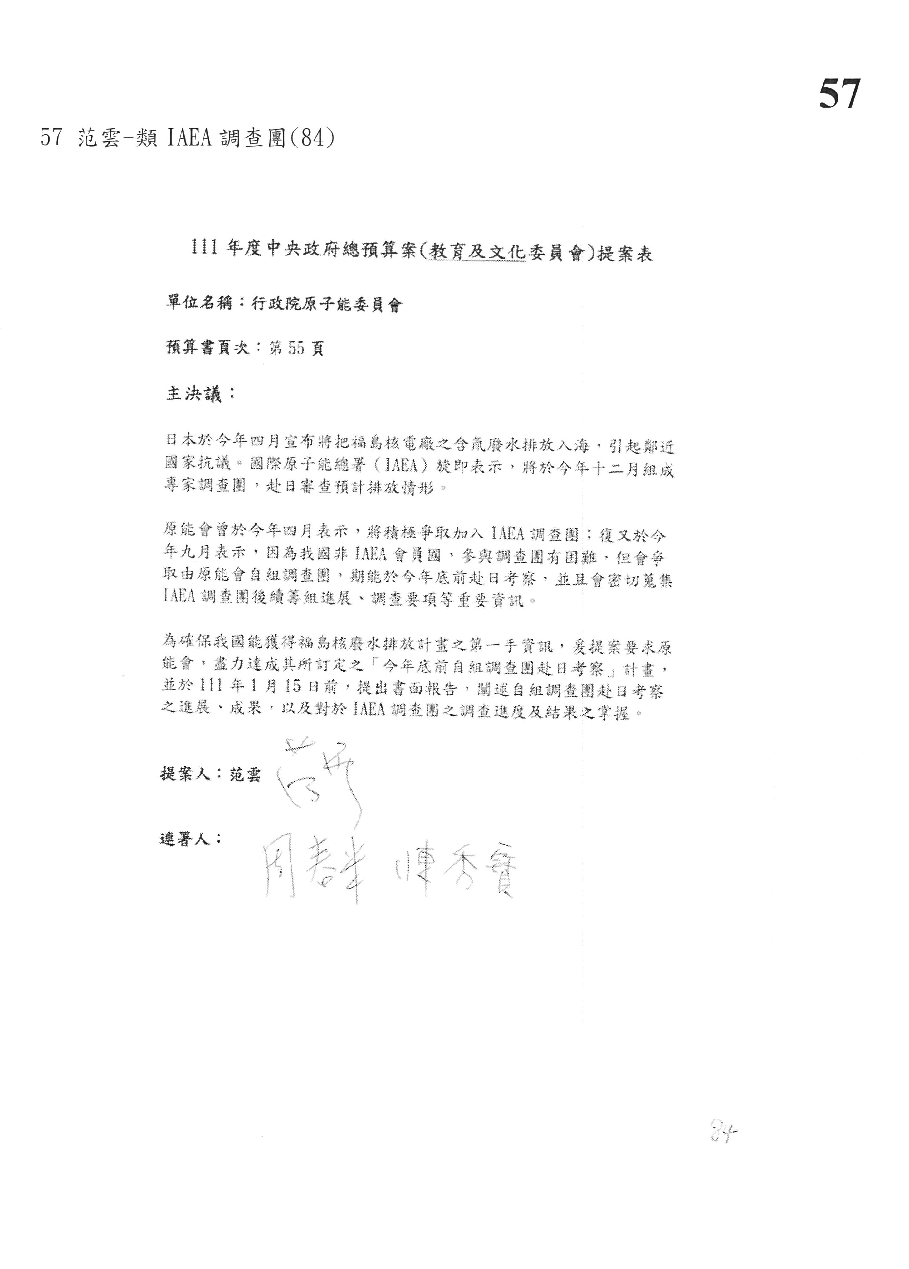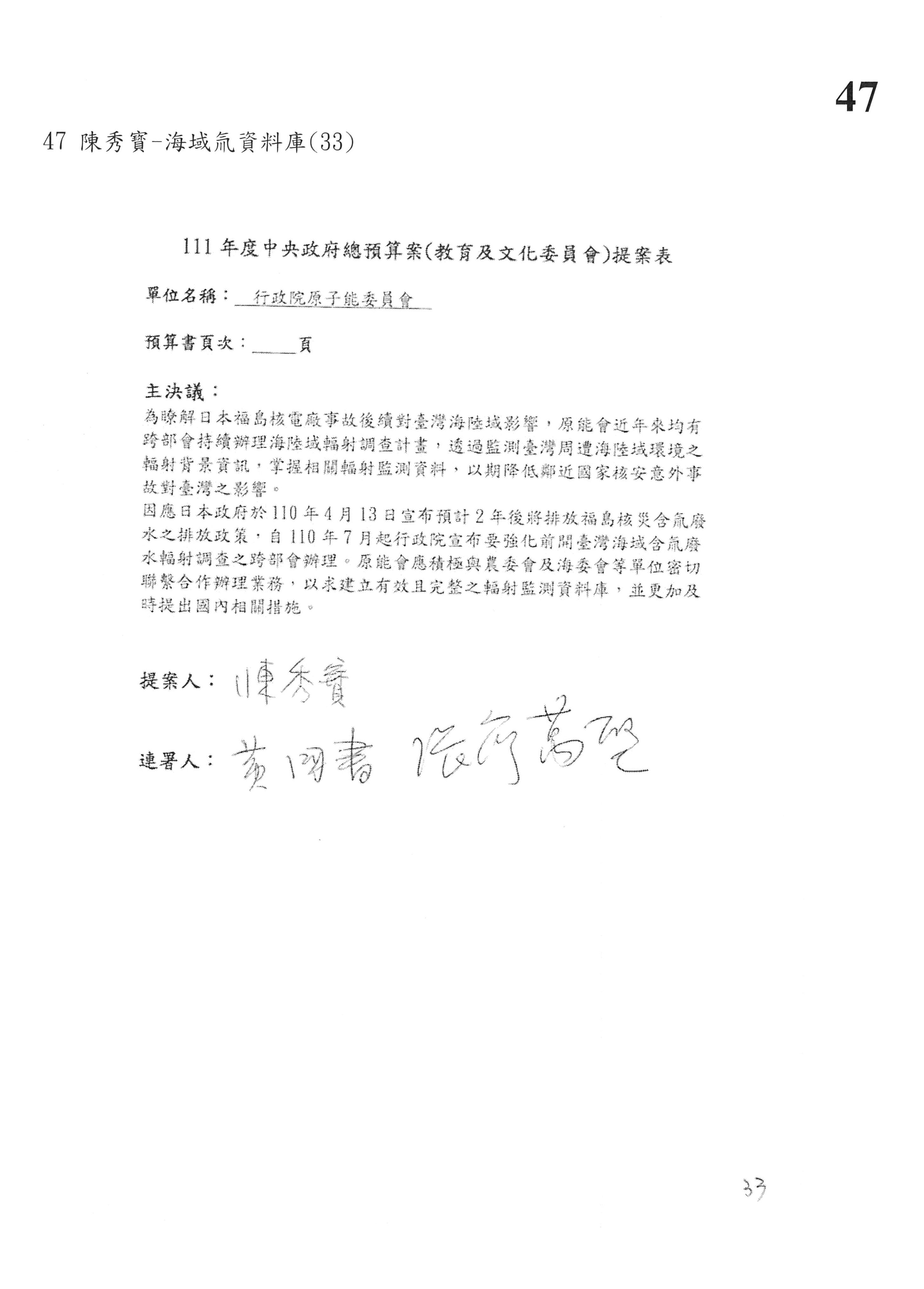 另外,剛才我們解釋時曾提及海域的部分,針對這1.09億元的預算,我們不會只看待日本的部分,其實我們也會注意大陸的部分,112年我們會開始建立海洋方面的資料,之後等海洋的資料建立成熟,大陸大氣的部分也成熟了,我們的長期規劃就是把兩者結合在一起,變成一個真正for大陸核電廠的部分。
