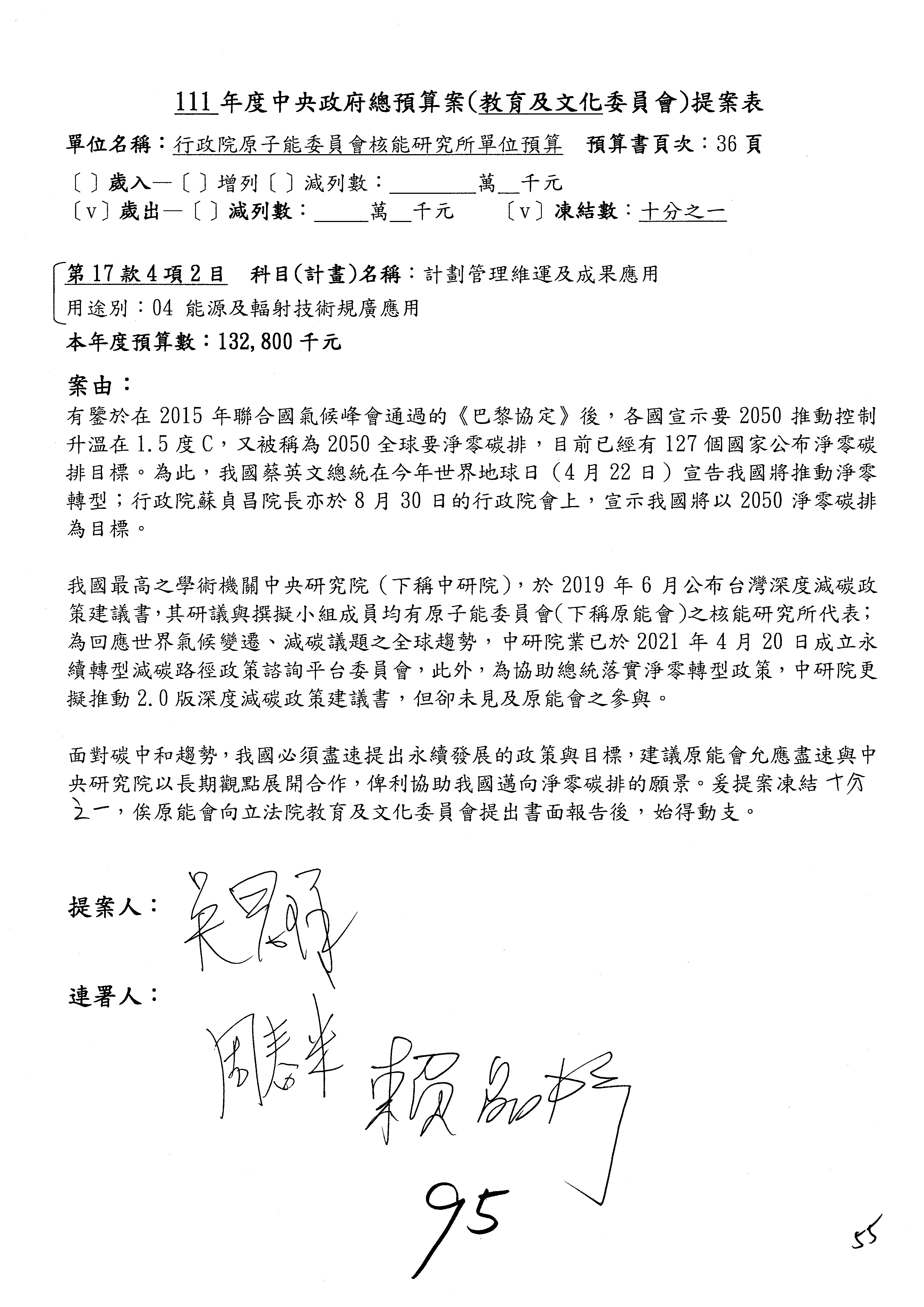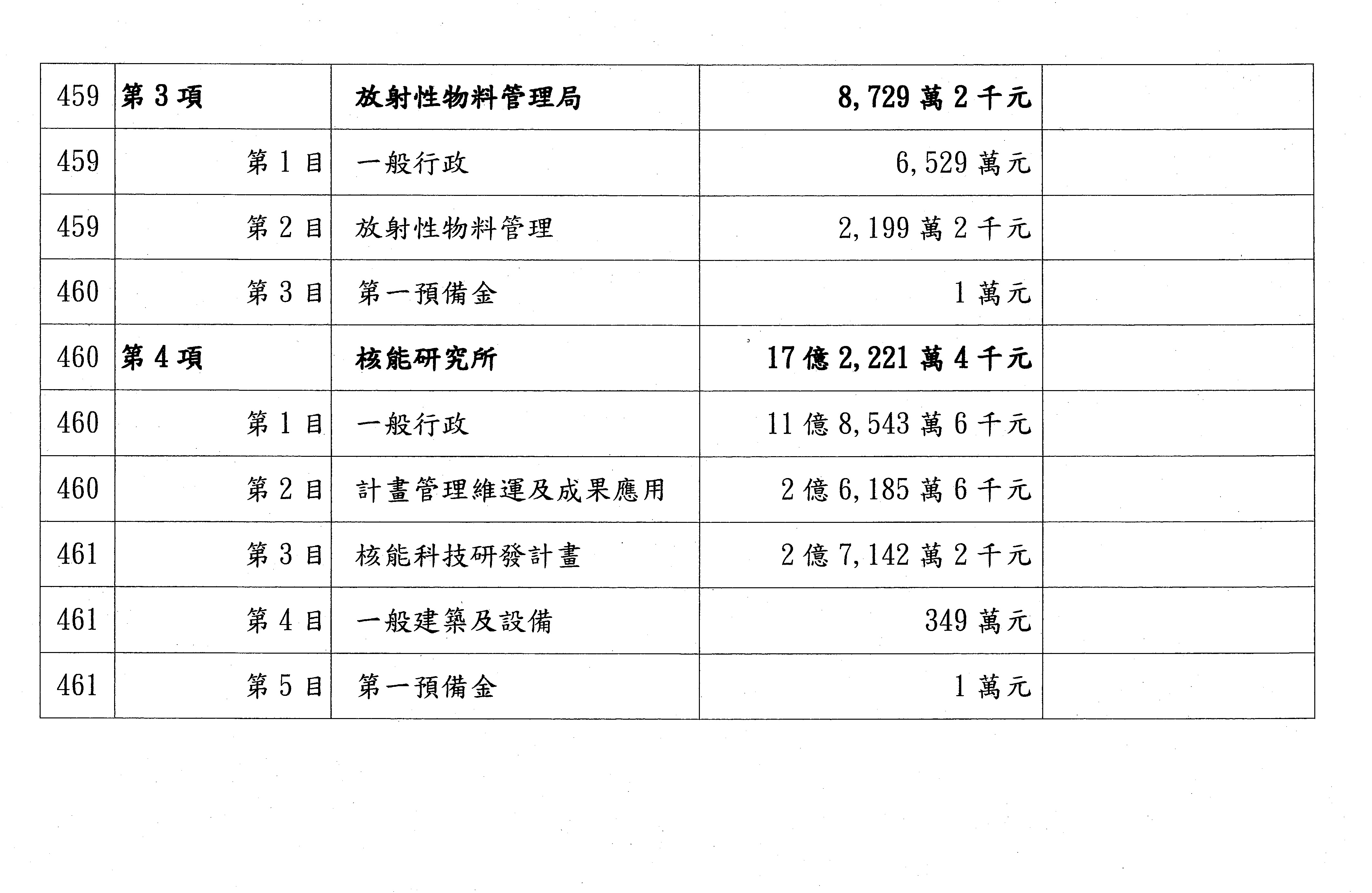 張廖委員萬堅:關於我提的第97案,其實我對核能科技研發計畫的2億7,000多萬元沒有特別的意見,當然,我們鼓勵核研所轉型、做更多的研究,那是好的事情,可是他們的人事費占一般行政的比例越占越高,真正能夠拿到計畫、編在本預算的部分比較少。你們給我的說明是後來有向前瞻計畫要了2億多元,還有其他的。但是我擔心像我們在審查體育署的預算也是這樣子,就是很多本預算不編,而是編在基金或特別預算,將來如果特別預算沒有了,你們的本預算挪得出來嗎?會不會排擠原來的預算?所以我希望你們在這方面還是要溝通。我們看到行政院同意編列112年到115年的15億元預算給你們,這是專案爭取,都很辛苦。以後本預算裡面的研發計畫要特別去努力,因為前瞻計畫總是會結束,我們不曉得以後還有沒有什麼特別預算,你們做的科研計畫可能還是要有一些你們自己的規劃,不然本預算沒有的話,即使你們規劃一堆,大概也爭取不到。你可不可以說明一下?