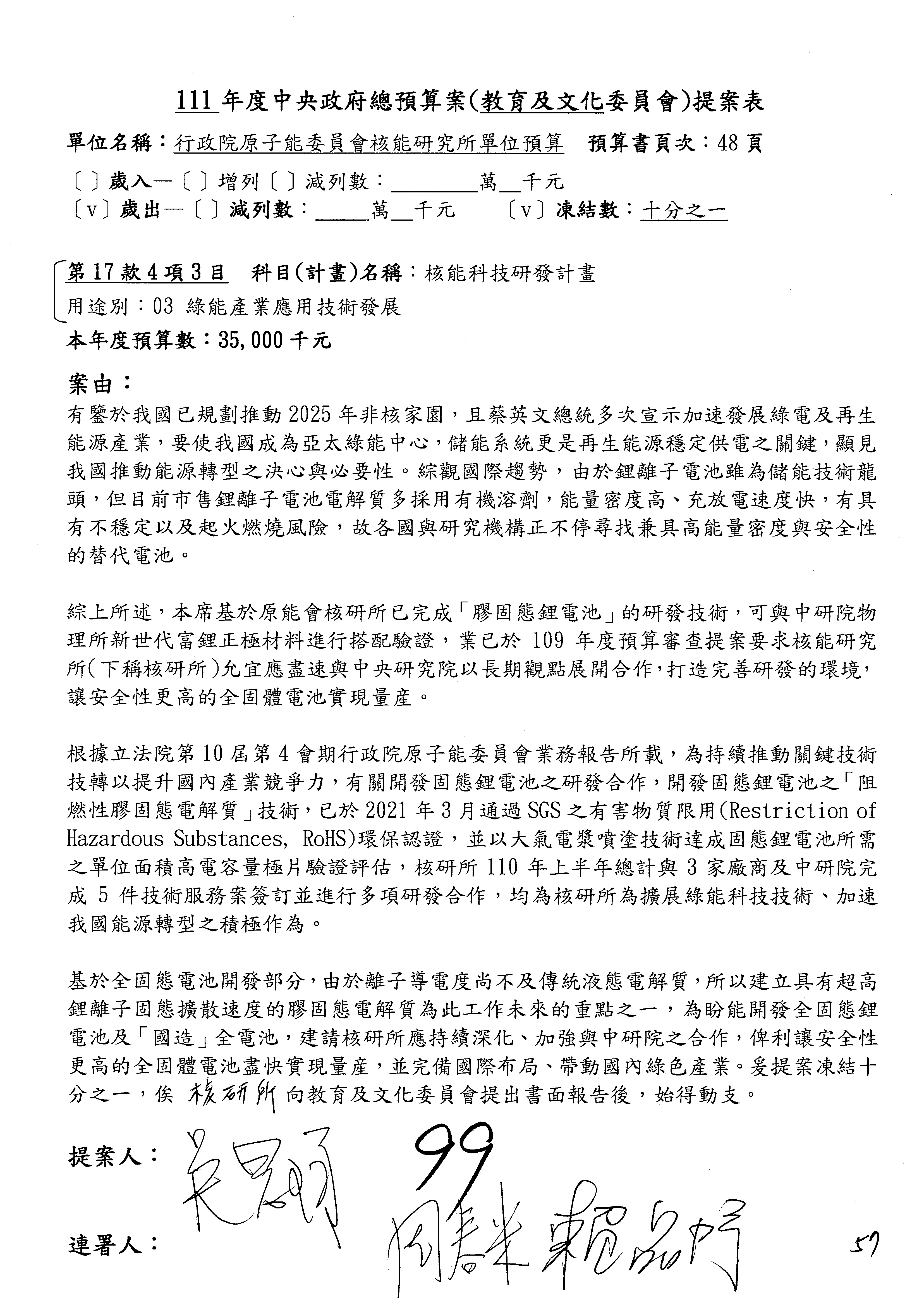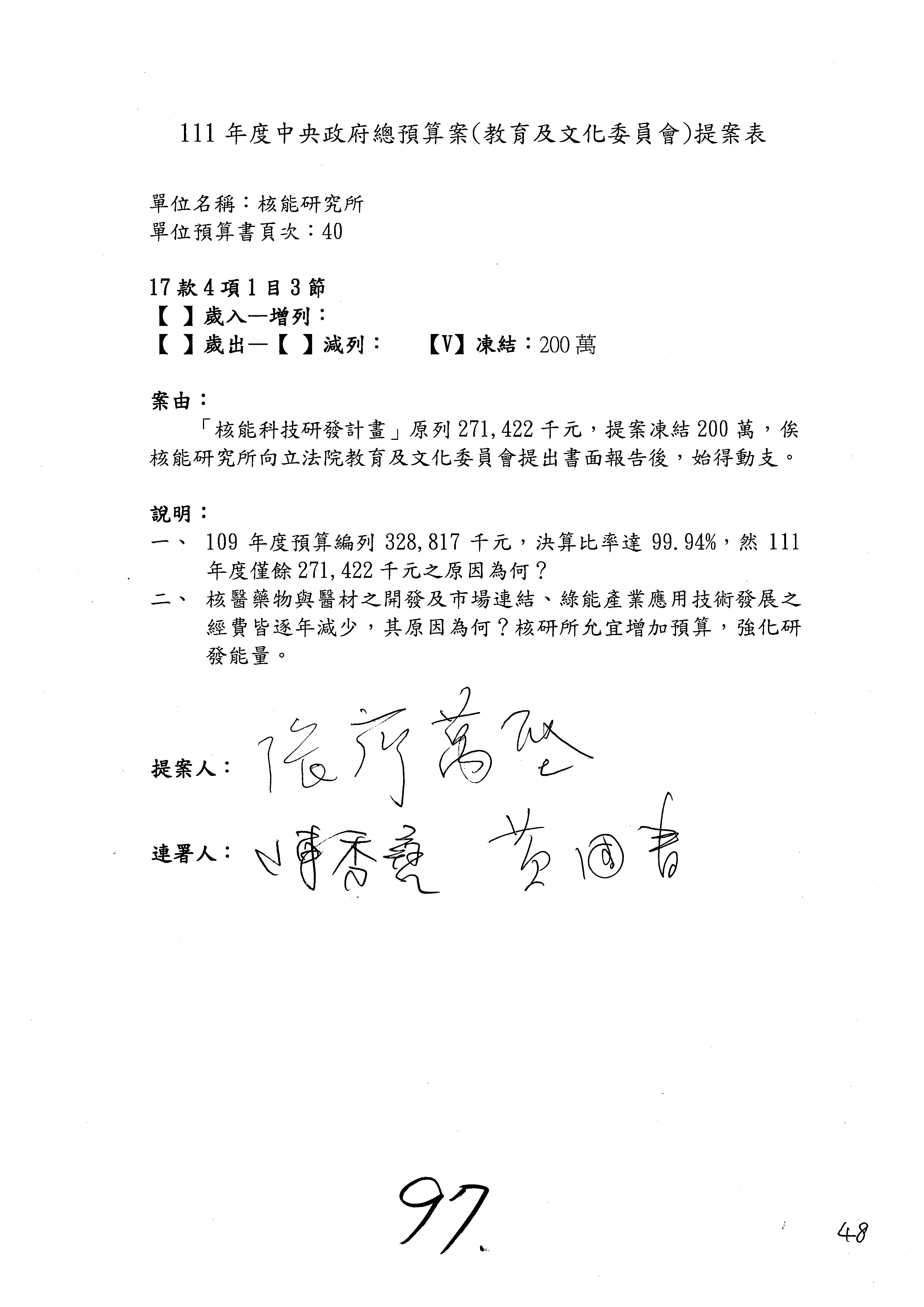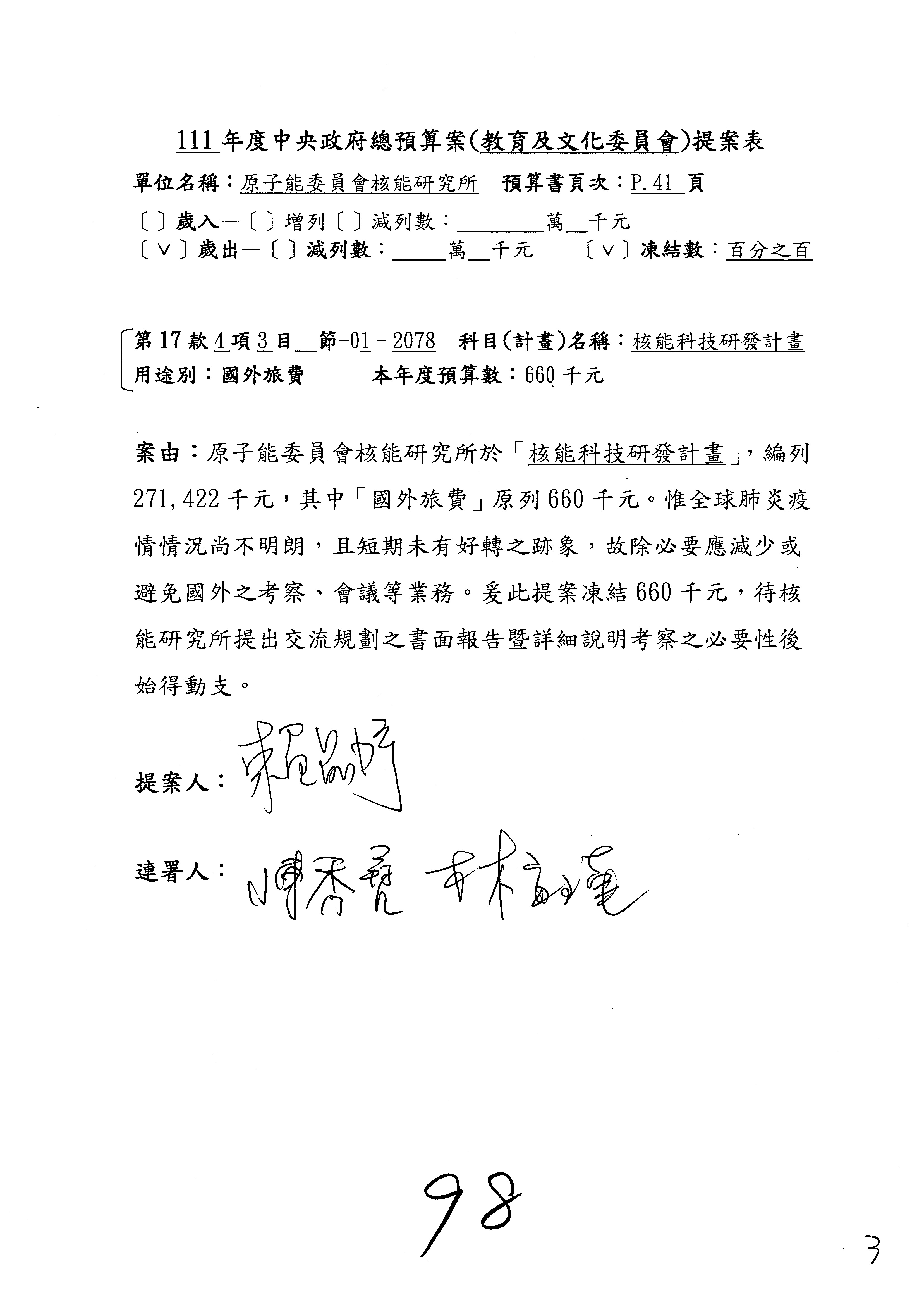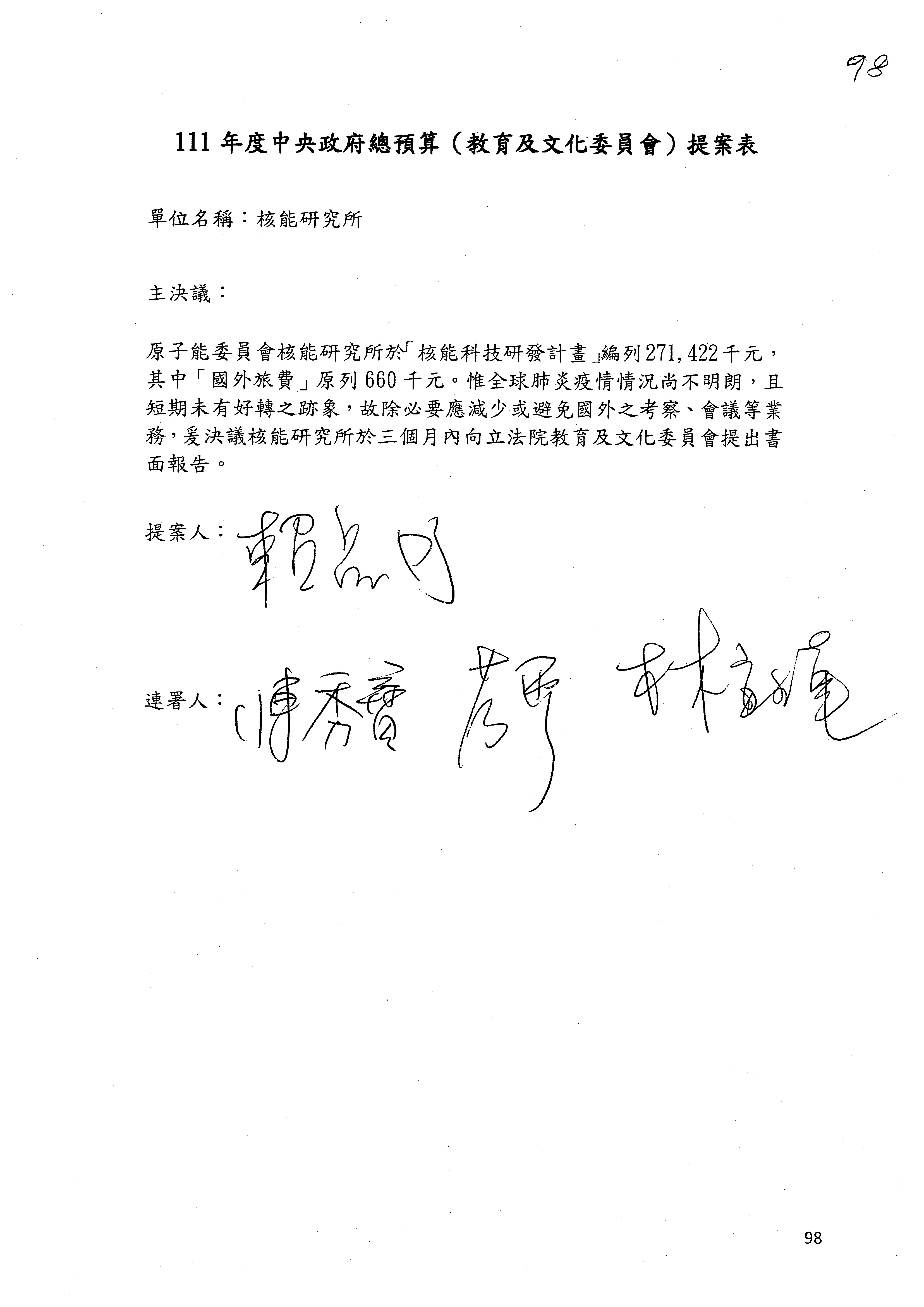 賴委員品妤:本席提的第98案是針對原能會核能研究所核能科技研發計畫之下國外旅費的部分,等一下大家可以討論一下。目前全球的疫情仍處於未明的狀況,全世界的疫情確實持續地存在著,但是不可否認其實一些國際間的交流也開始慢慢地展開,而且是視訊之外的。所以我希望等一下原能會能夠初步針對明年的交流計畫、預計的交流計畫做一個簡單的說明,我也希望之後一定要有一個詳細的書面報告給我。至於凍結的部分,我覺得等一下我們可以再來討論。